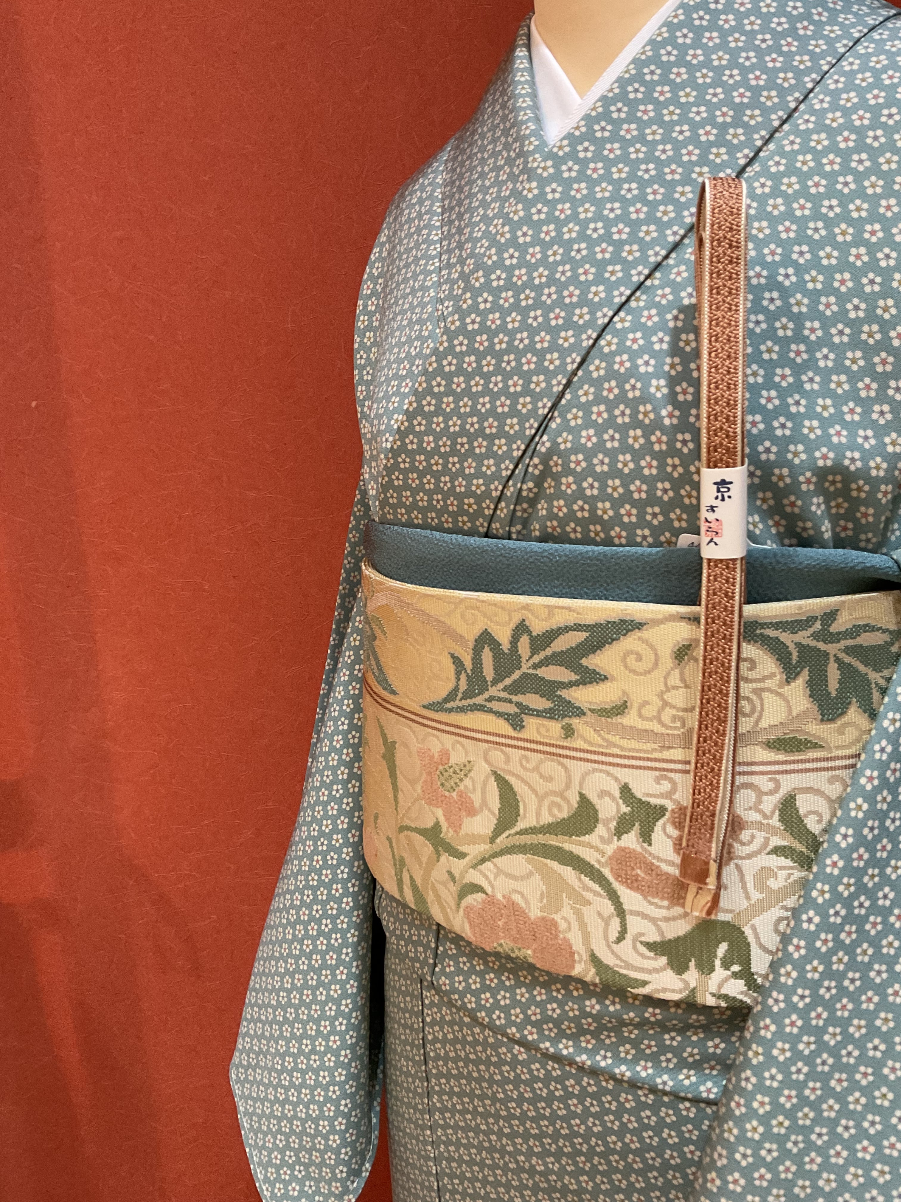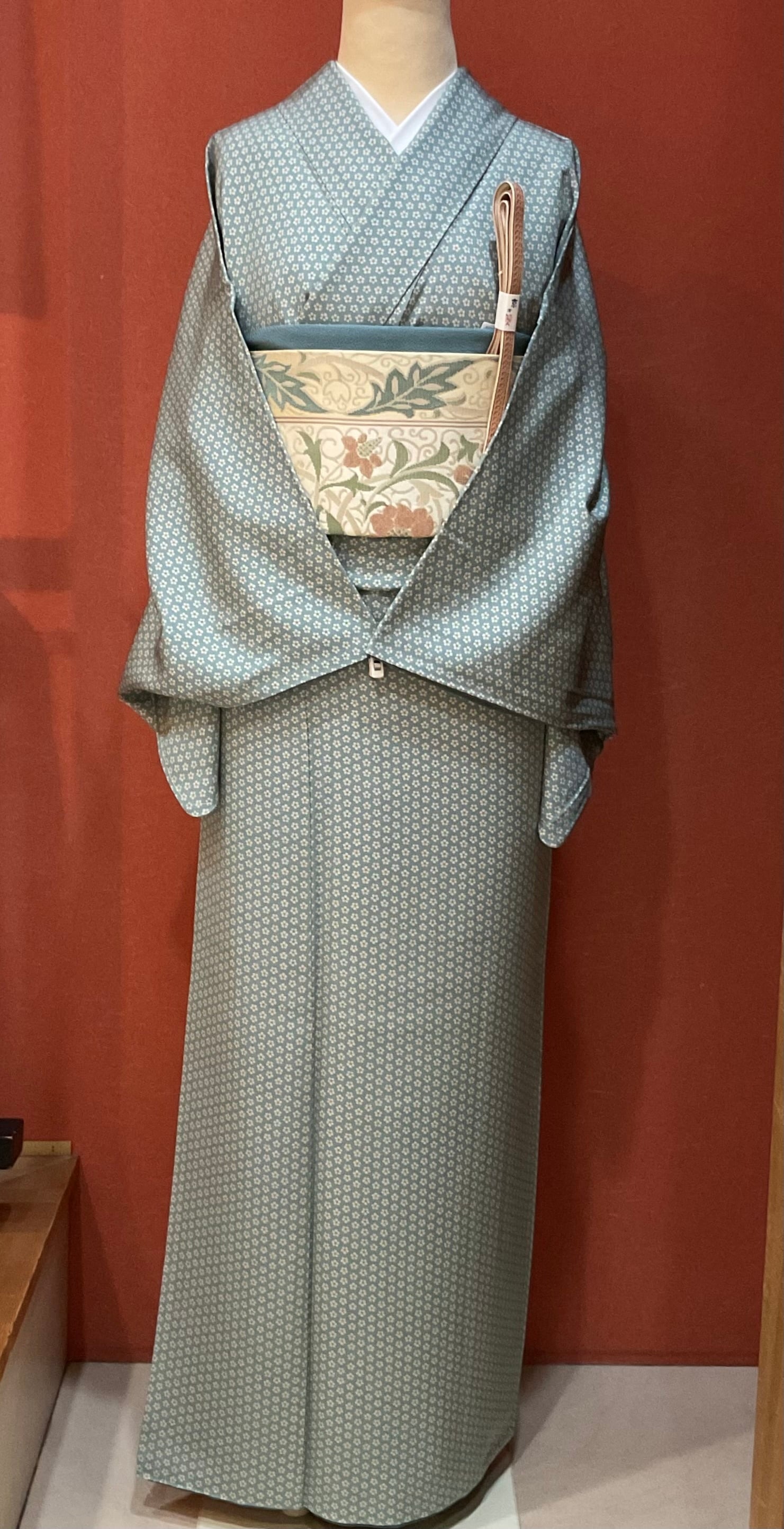 さらりと軽い小紋きものです。カラフルな花芯の小花文様、気取らない街着として活躍する一枚です。