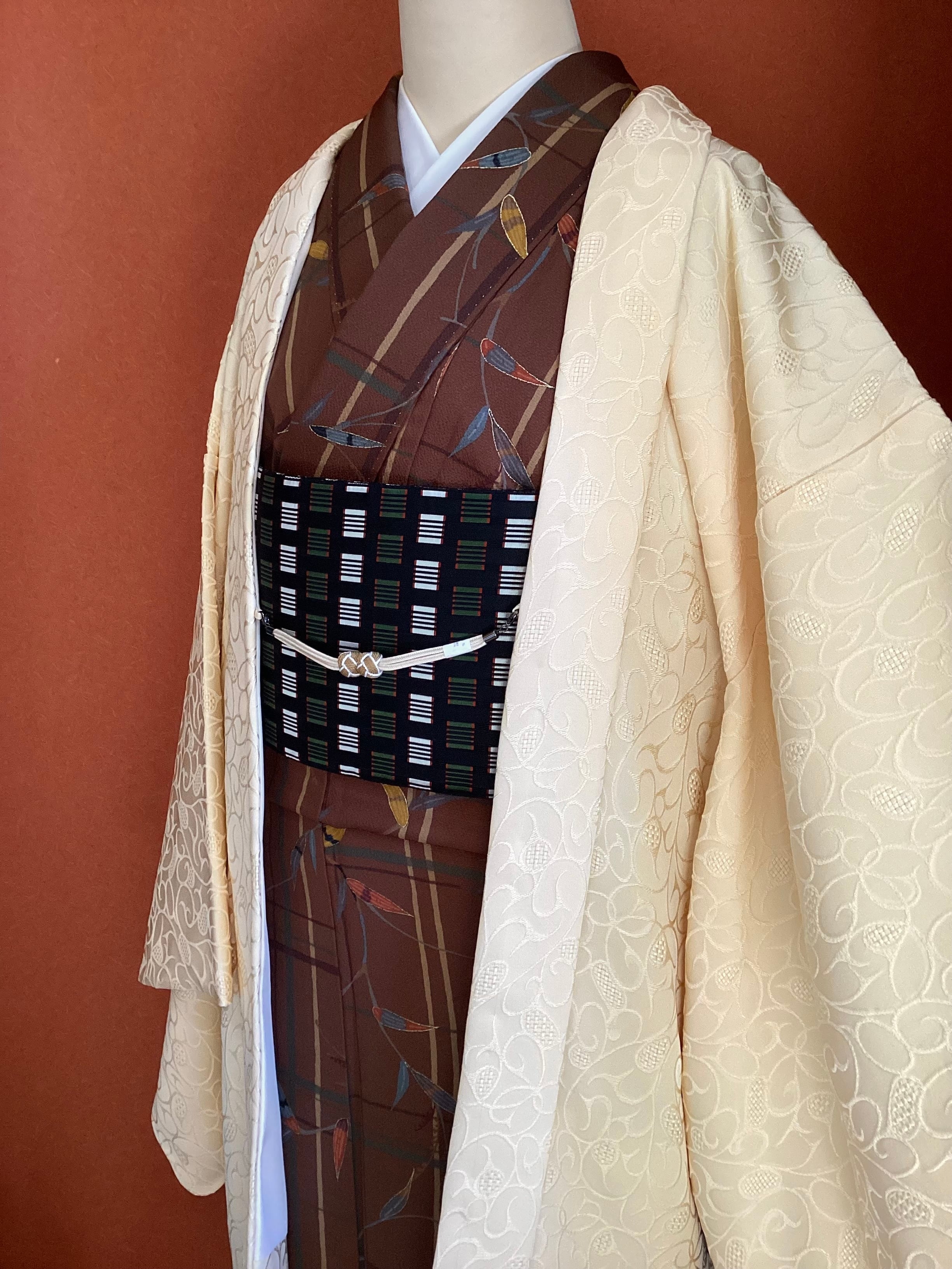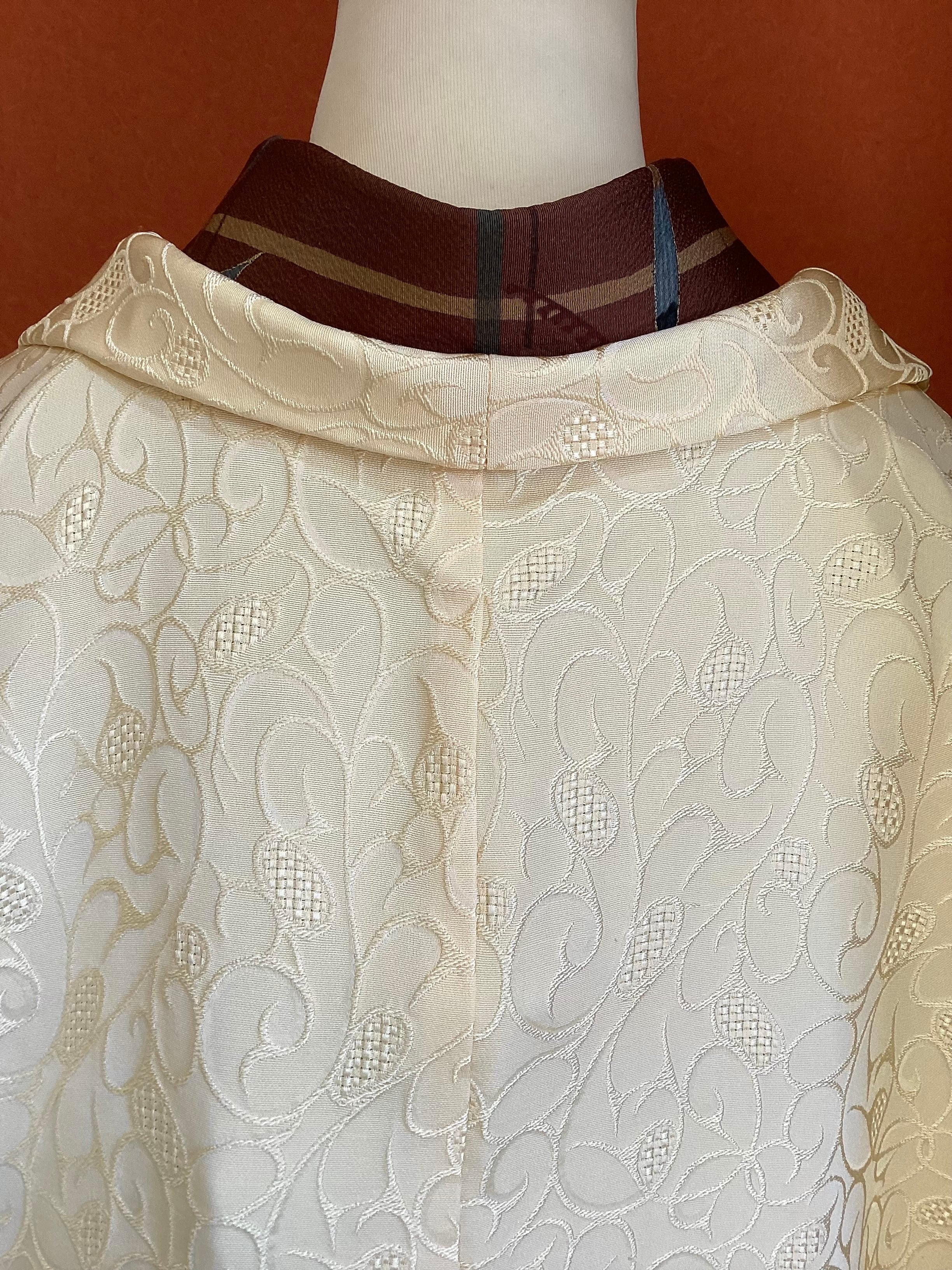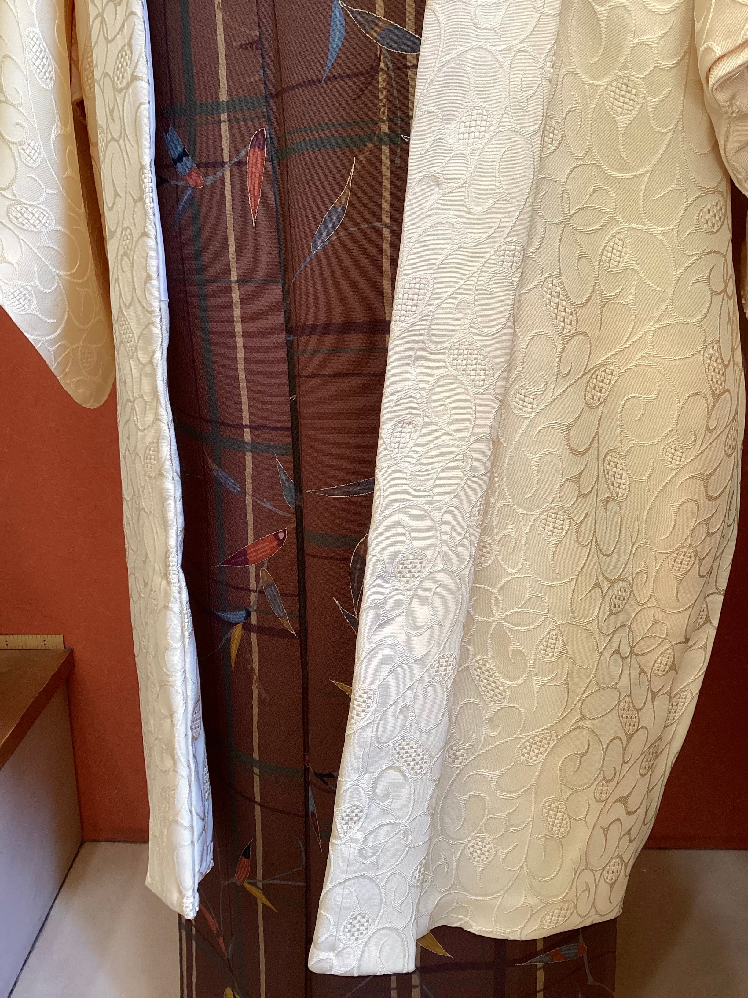 カスタードクリームのような黄みを帯びたクリーム色で、曲線の美しい蔓草文様の地紋が織り込まれた柔らかな生地の羽織です。大きめの地紋が動くと艶やかな陰影が生まれて華やかさがございます。虹のように暈しの入った羽裏が付いております。淡いお色目なので、春先、秋口どちらにでもコーディネートしていただけます。