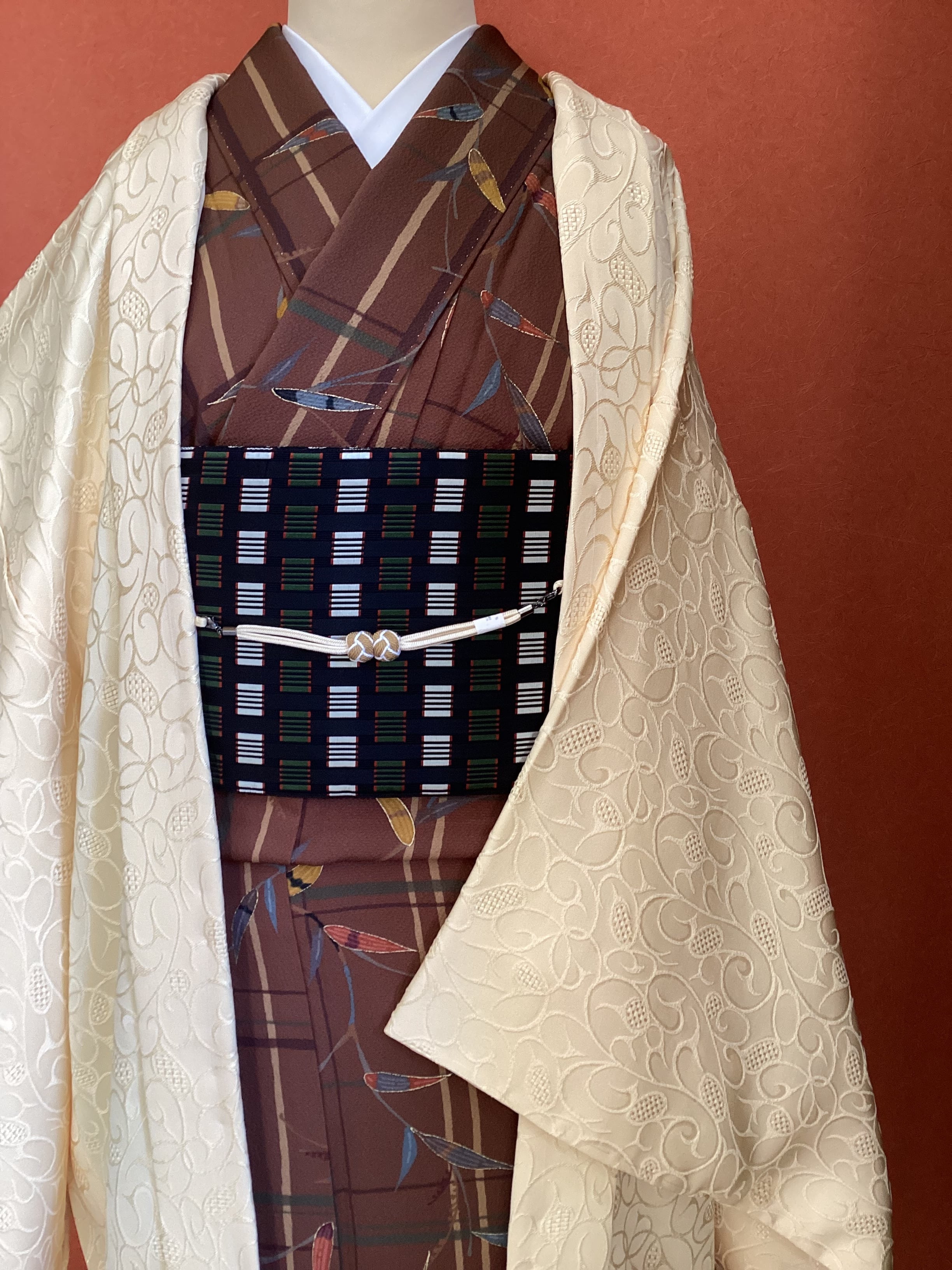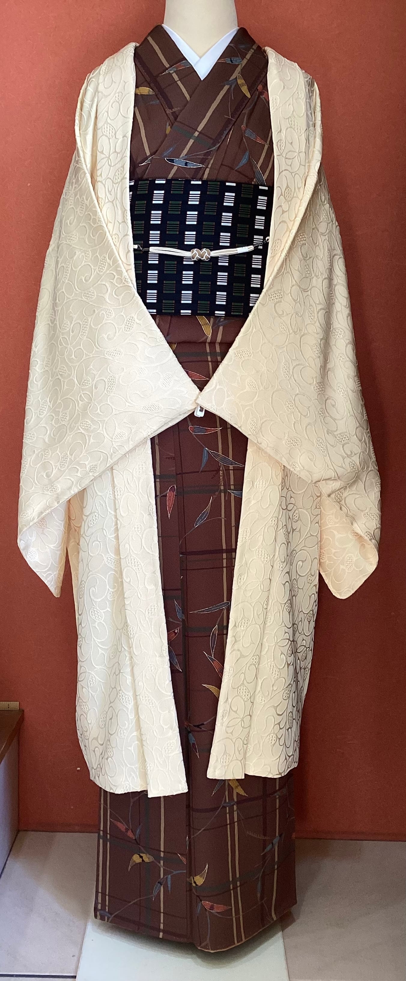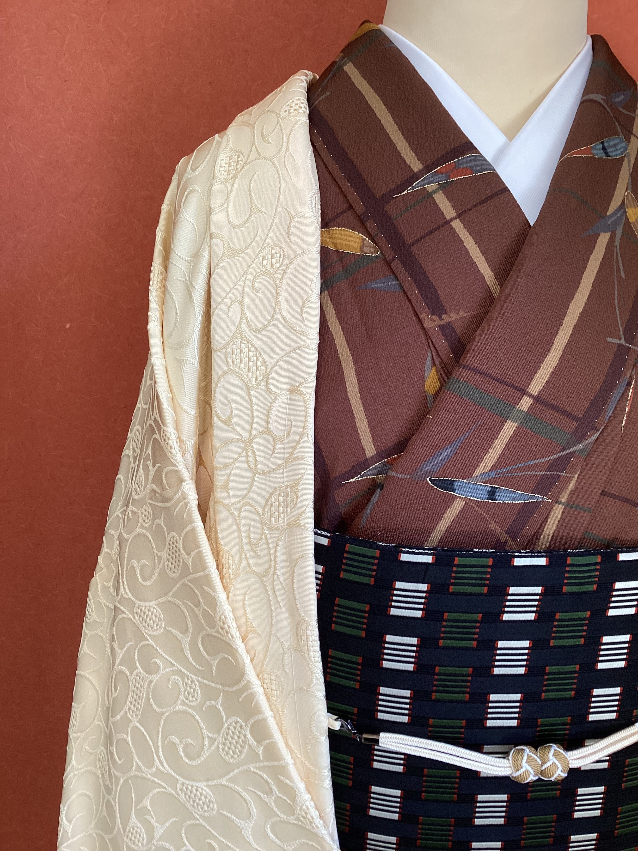 カスタードクリームのような黄みを帯びたクリーム色で、曲線の美しい蔓草文様の地紋が織り込まれた柔らかな生地の羽織です。大きめの地紋が動くと艶やかな陰影が生まれて華やかさがございます。虹のように暈しの入った羽裏が付いております。淡いお色目なので、春先、秋口どちらにでもコーディネートしていただけます。