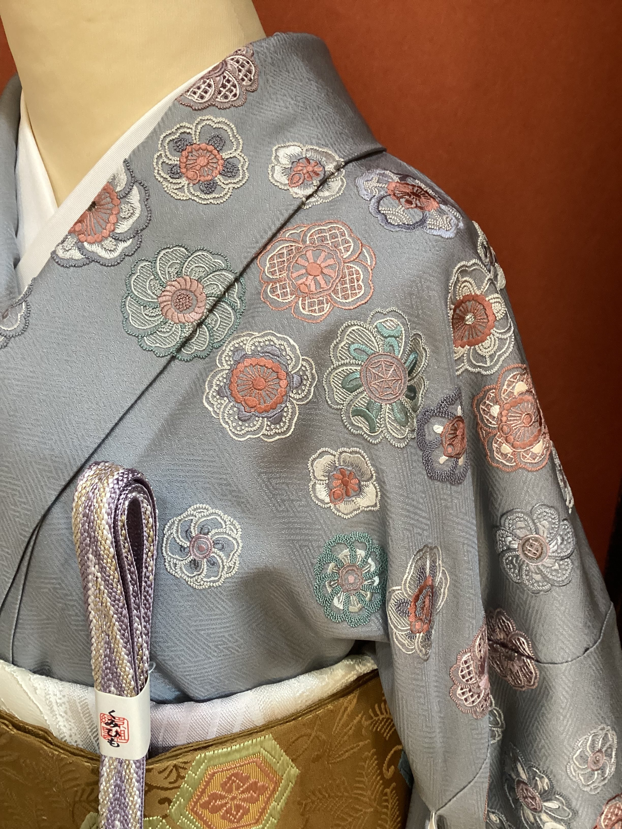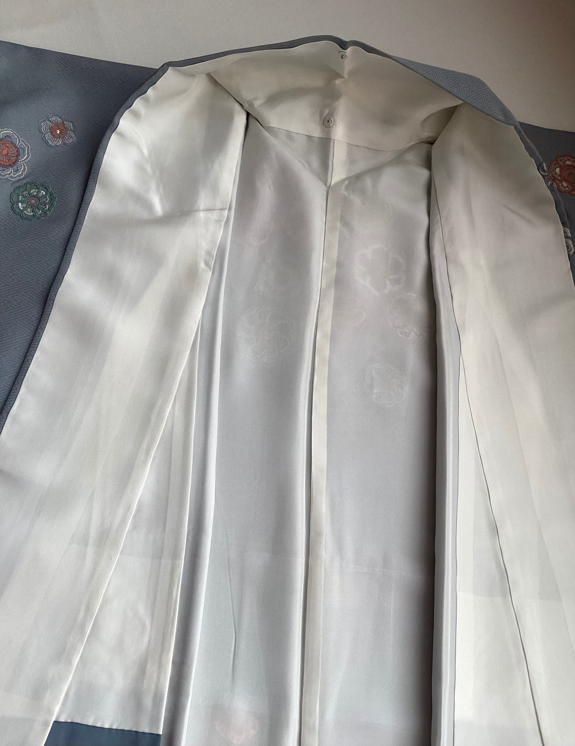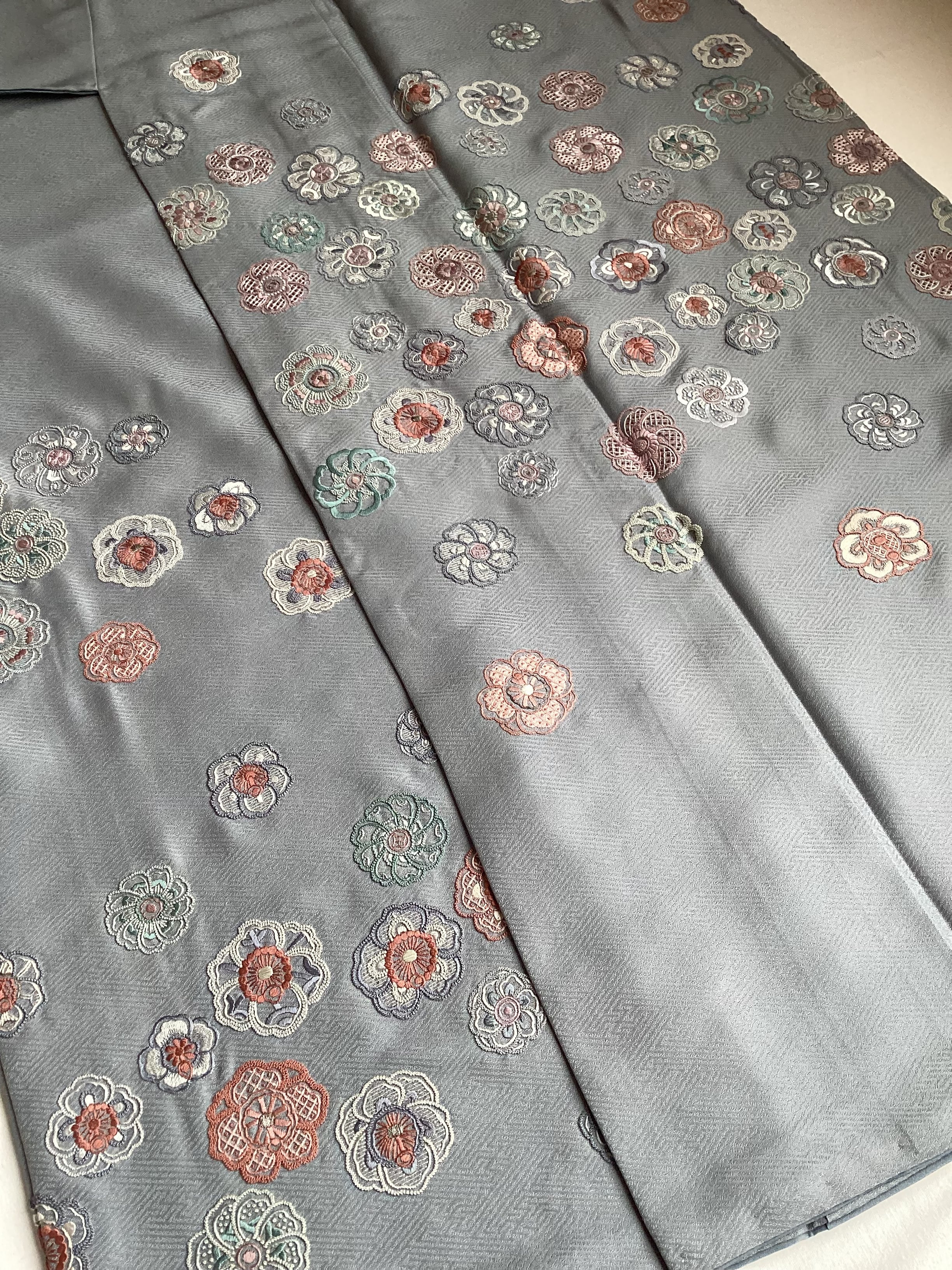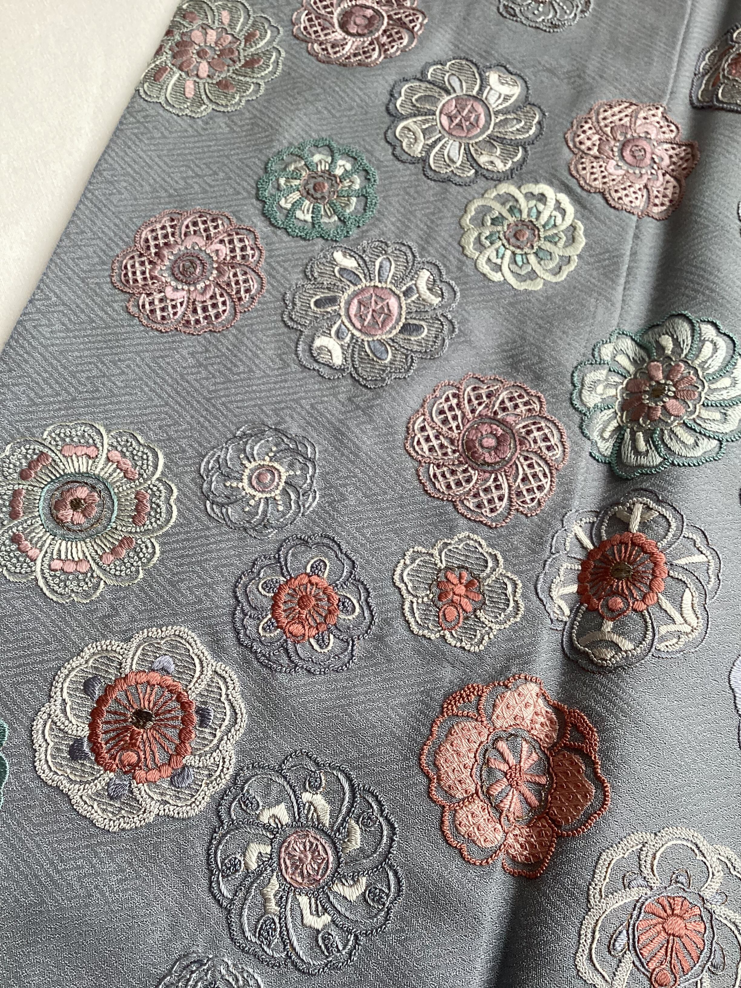 紗綾形の地紋が織り込まれた青みがかったグレーの絹地の上に、いったい何輪あるのでしょうか?たっぷりと花々が刺繍された美しい訪問着です。様々な技法のステッチを用いて一輪一輪が違った表情で丹念にたっぷりと刺されております。裾のお柄はもちろんのこと、背中から肩にかけての後ろ姿にもたくさんの花が舞っております。豪華な刺繍の柄付けが華やかですが、お色目がくすみカラーで抑えた色合いのため、派手にならず上品な訪問着でございます。