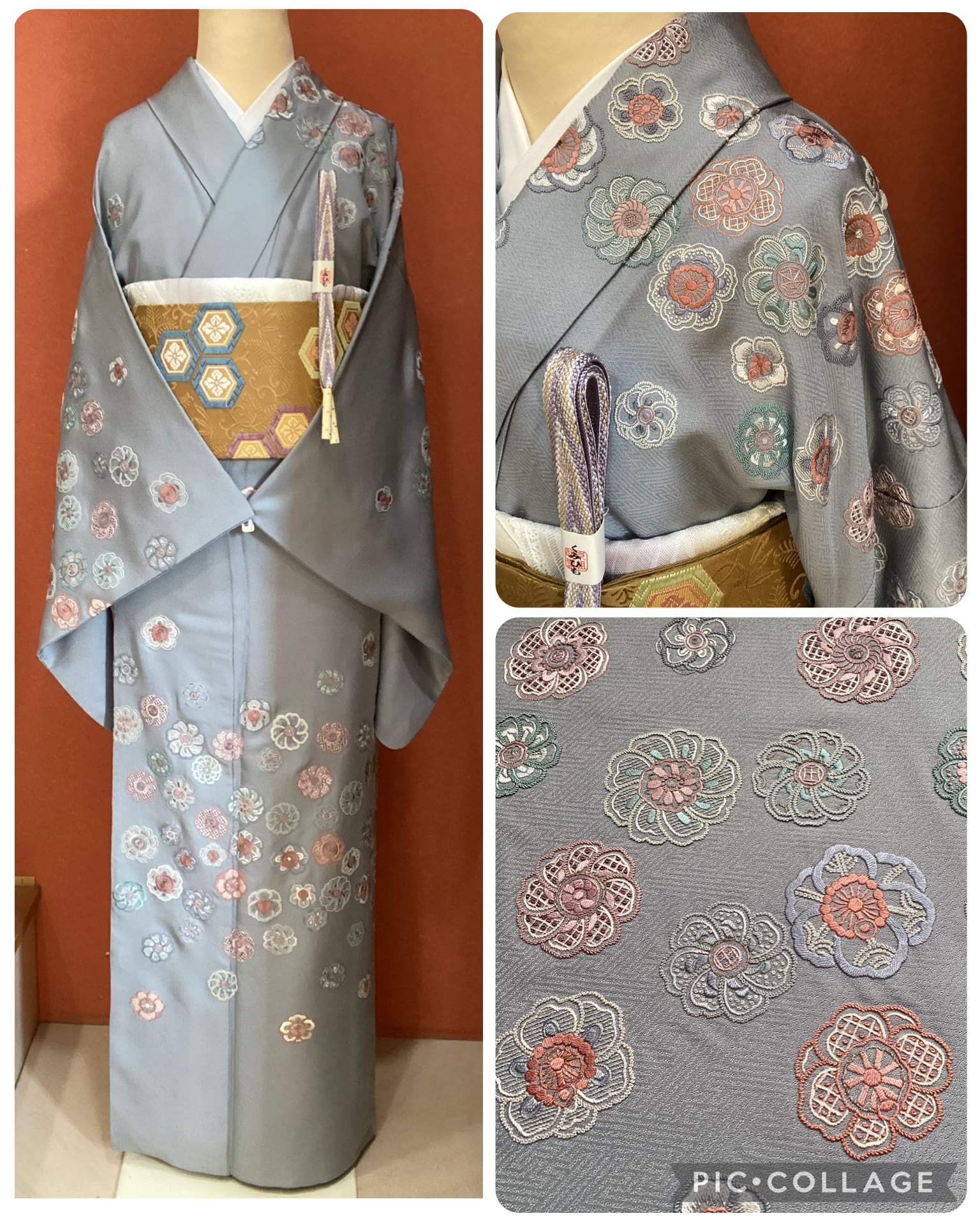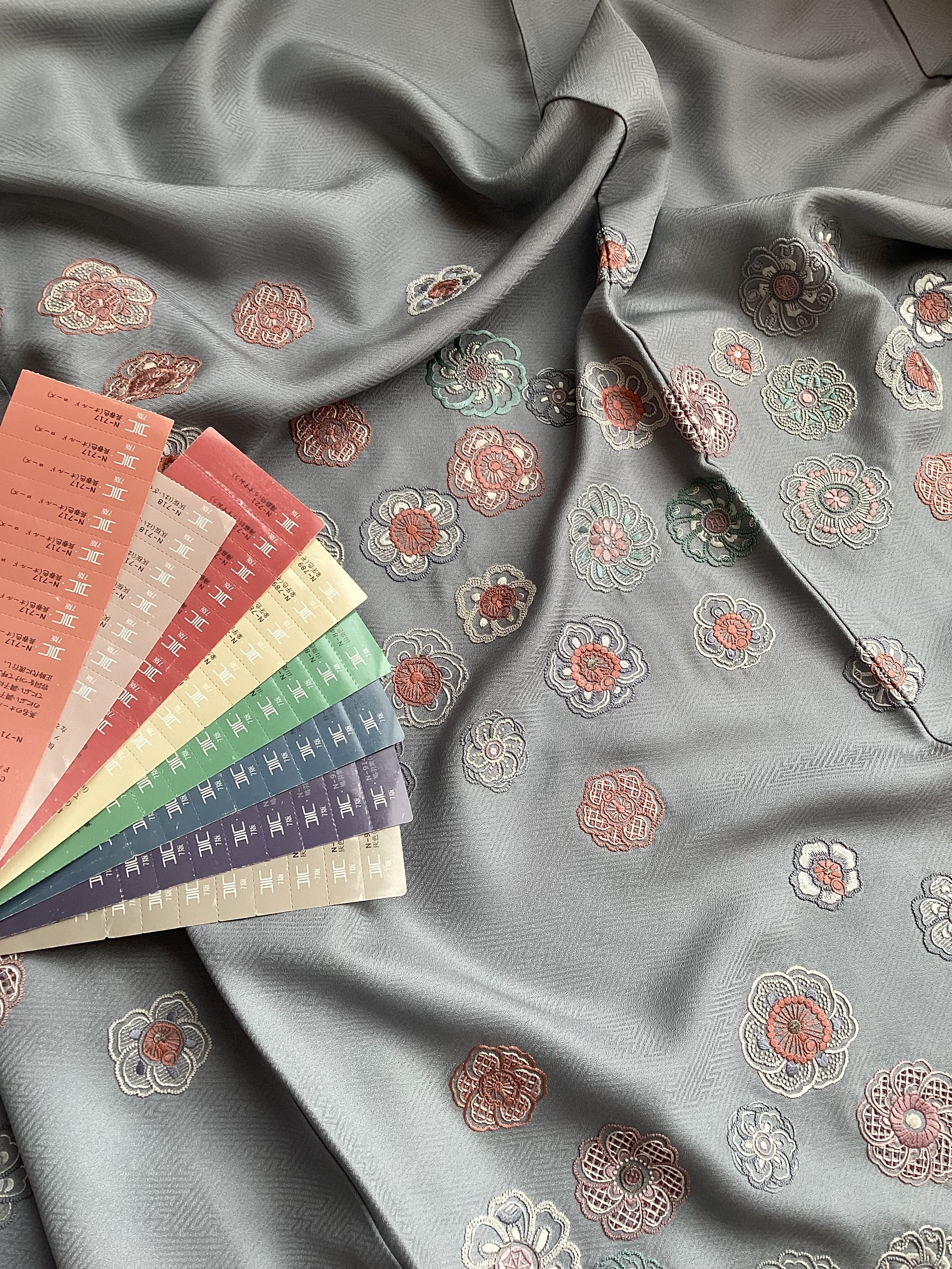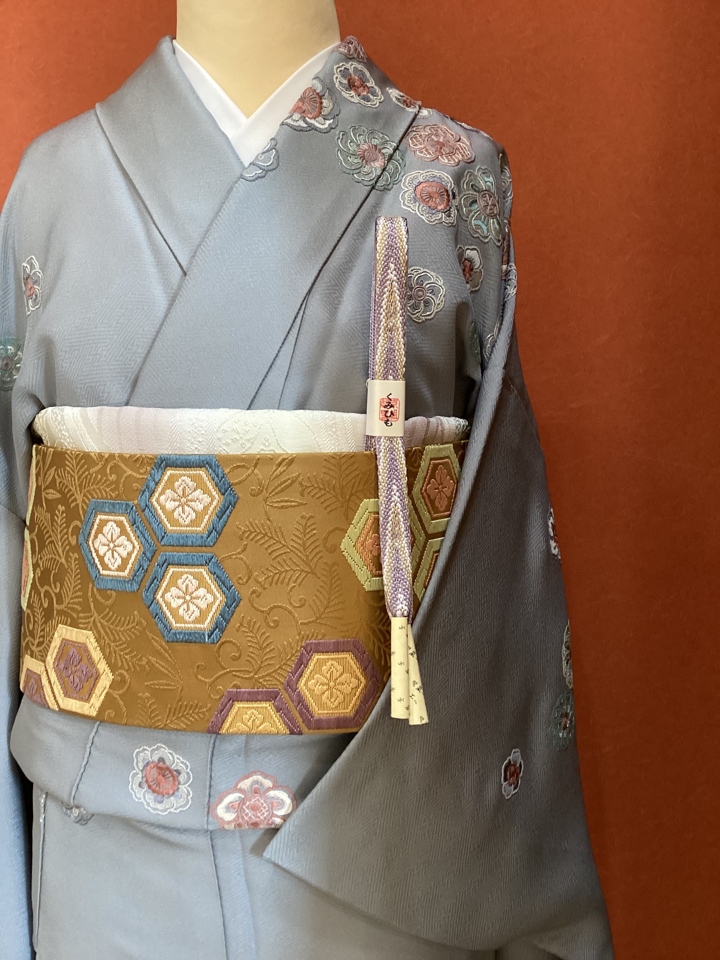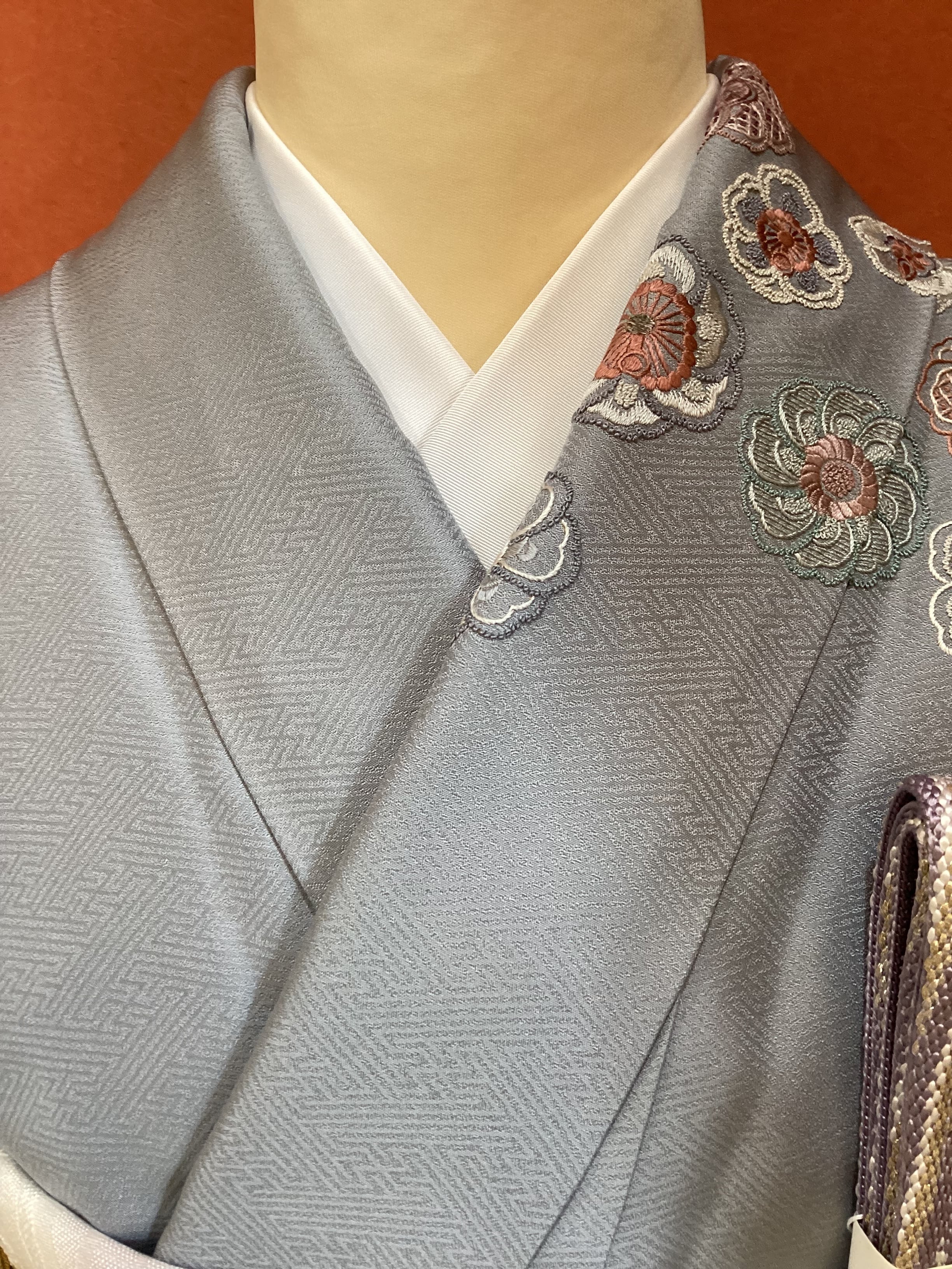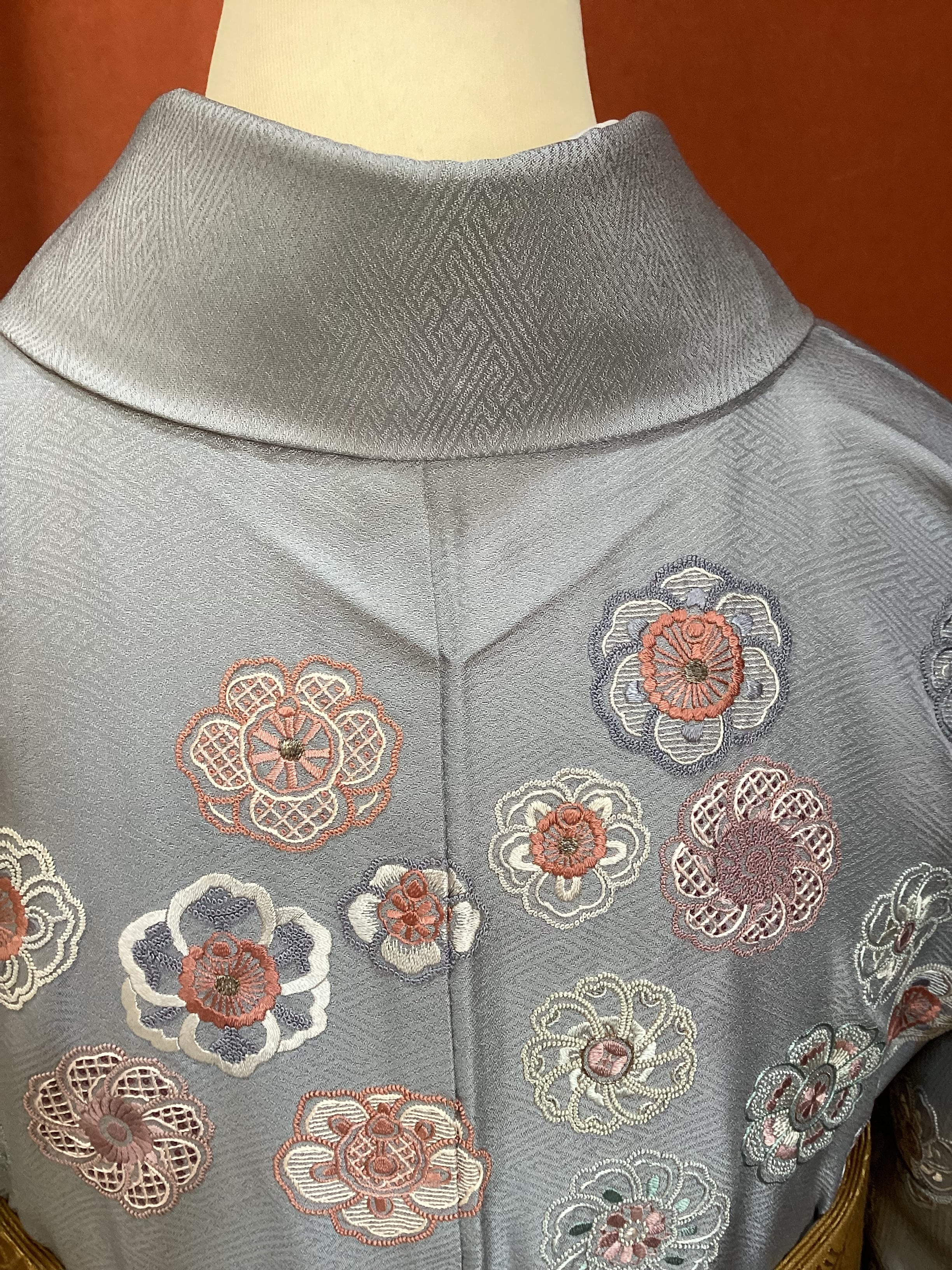 紗綾形の地紋が織り込まれた青みがかったグレーの絹地の上に、いったい何輪あるのでしょうか?たっぷりと花々が刺繍された美しい訪問着です。様々な技法のステッチを用いて一輪一輪が違った表情で丹念にたっぷりと刺されております。裾のお柄はもちろんのこと、背中から肩にかけての後ろ姿にもたくさんの花が舞っております。豪華な刺繍の柄付けが華やかですが、お色目がくすみカラーで抑えた色合いのため、派手にならず上品な訪問着でございます。