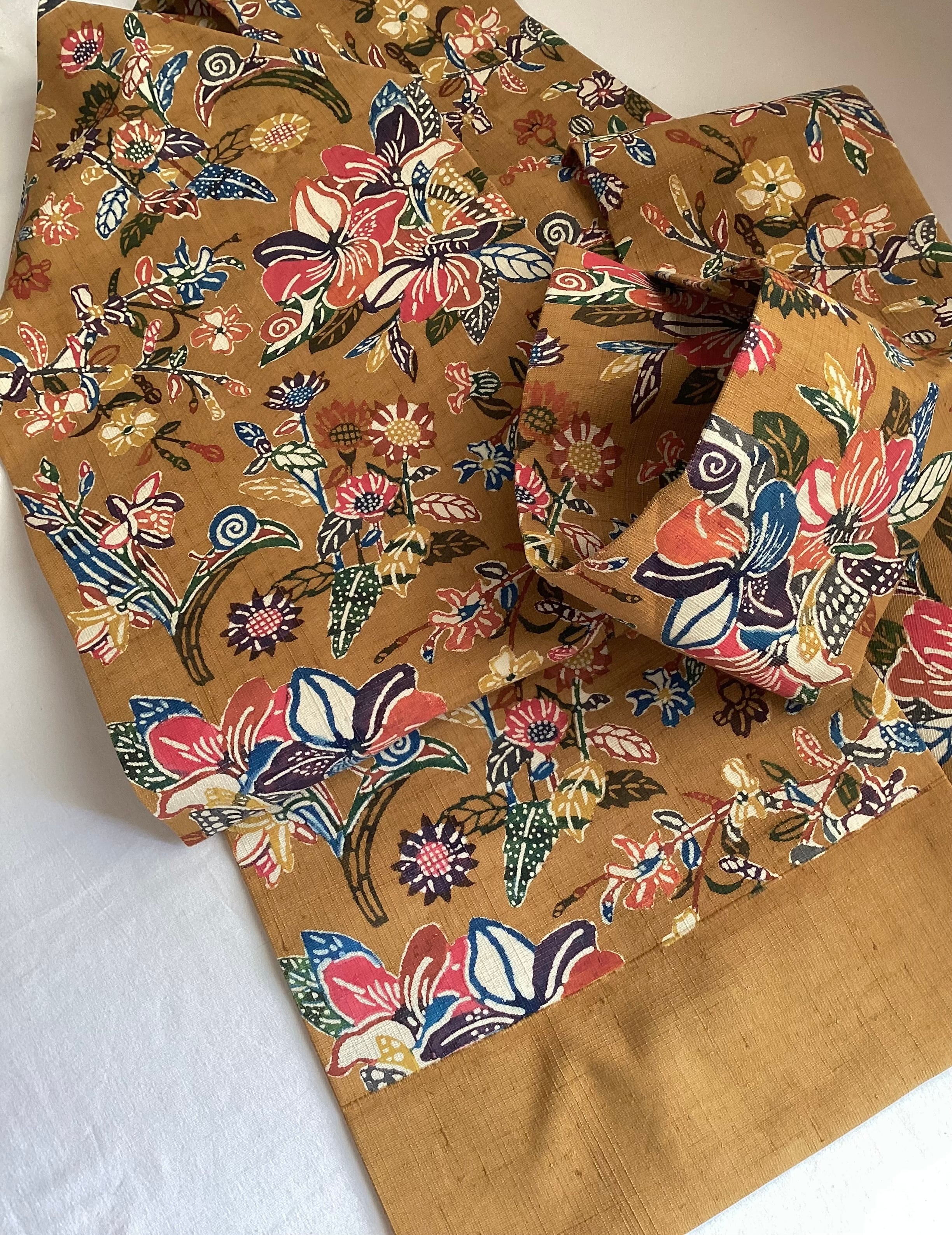 節の温かみがある黄土色のざっくりとした紬地にカラフルな彩色で四季の花々が型染めされたなんとも雰囲気のあるなごや帯です。柄をよく見ると、南国の雰囲気を持つハイビスカスと水仙といった日本の花が混雑しており、蝸牛の姿もあり、楽しい図案となっています。贅沢に全通柄で染められて、タレ無地でスッキリとした後ろ姿を演出する洒落味のあるカジュアル帯です。