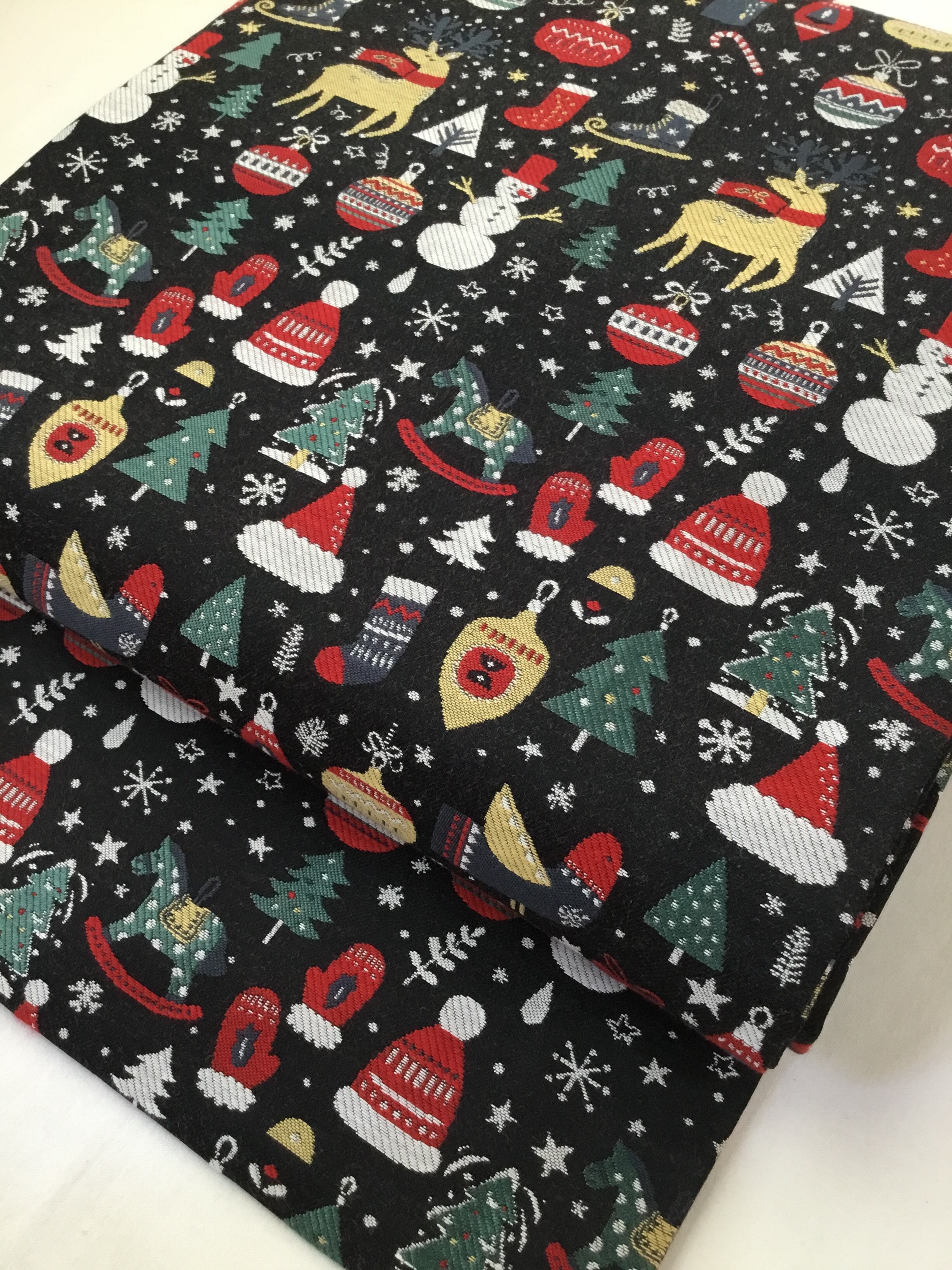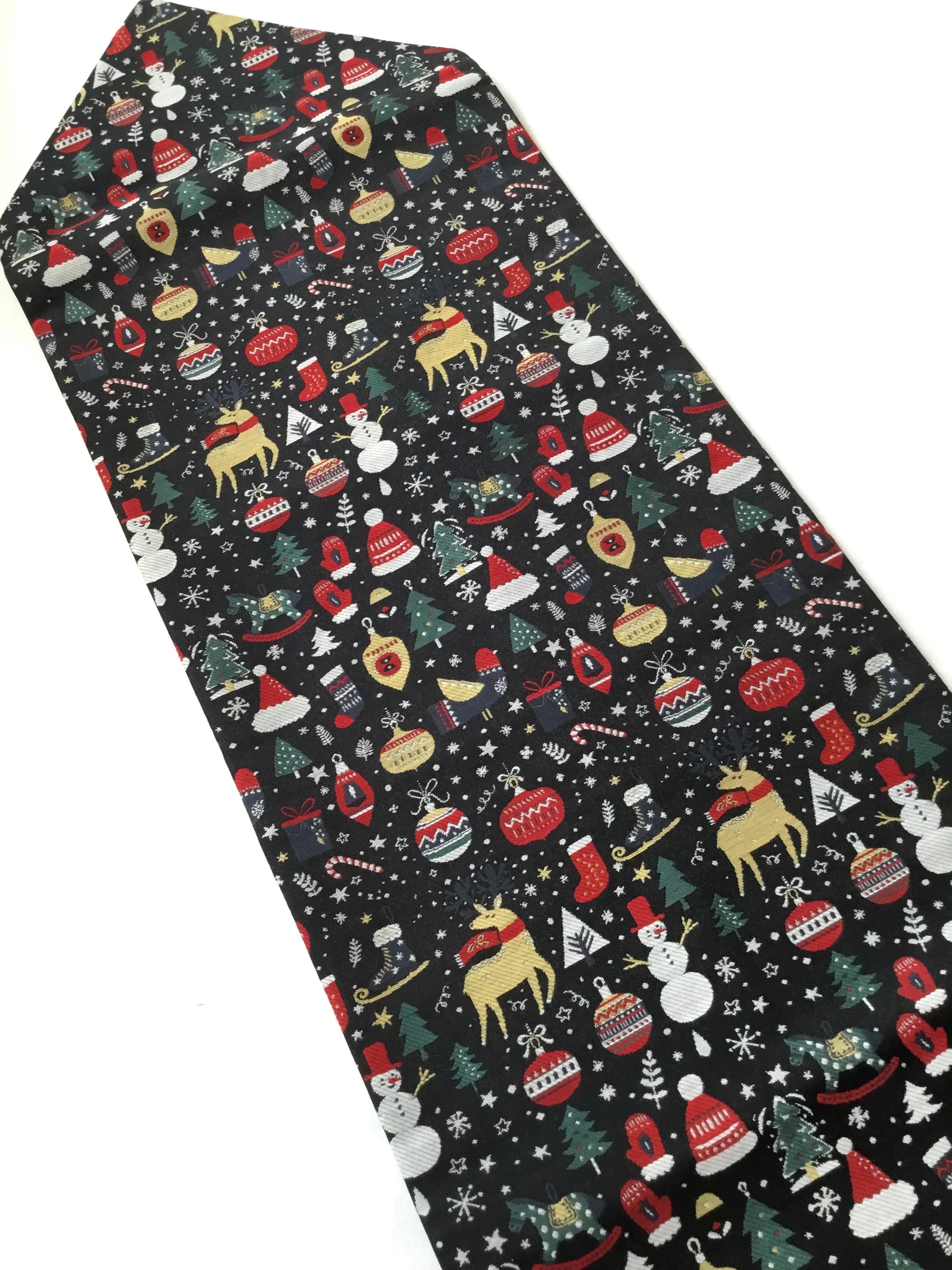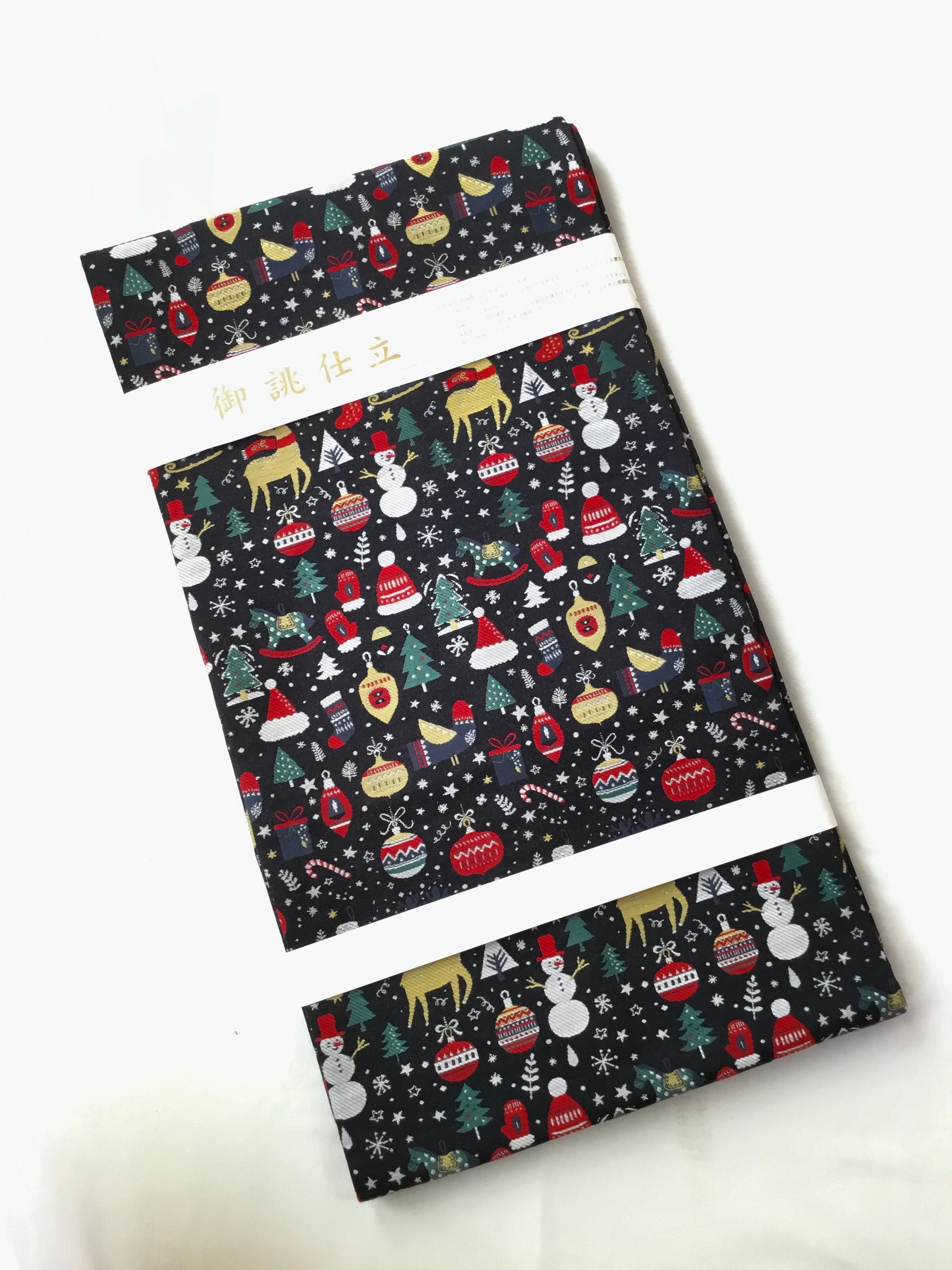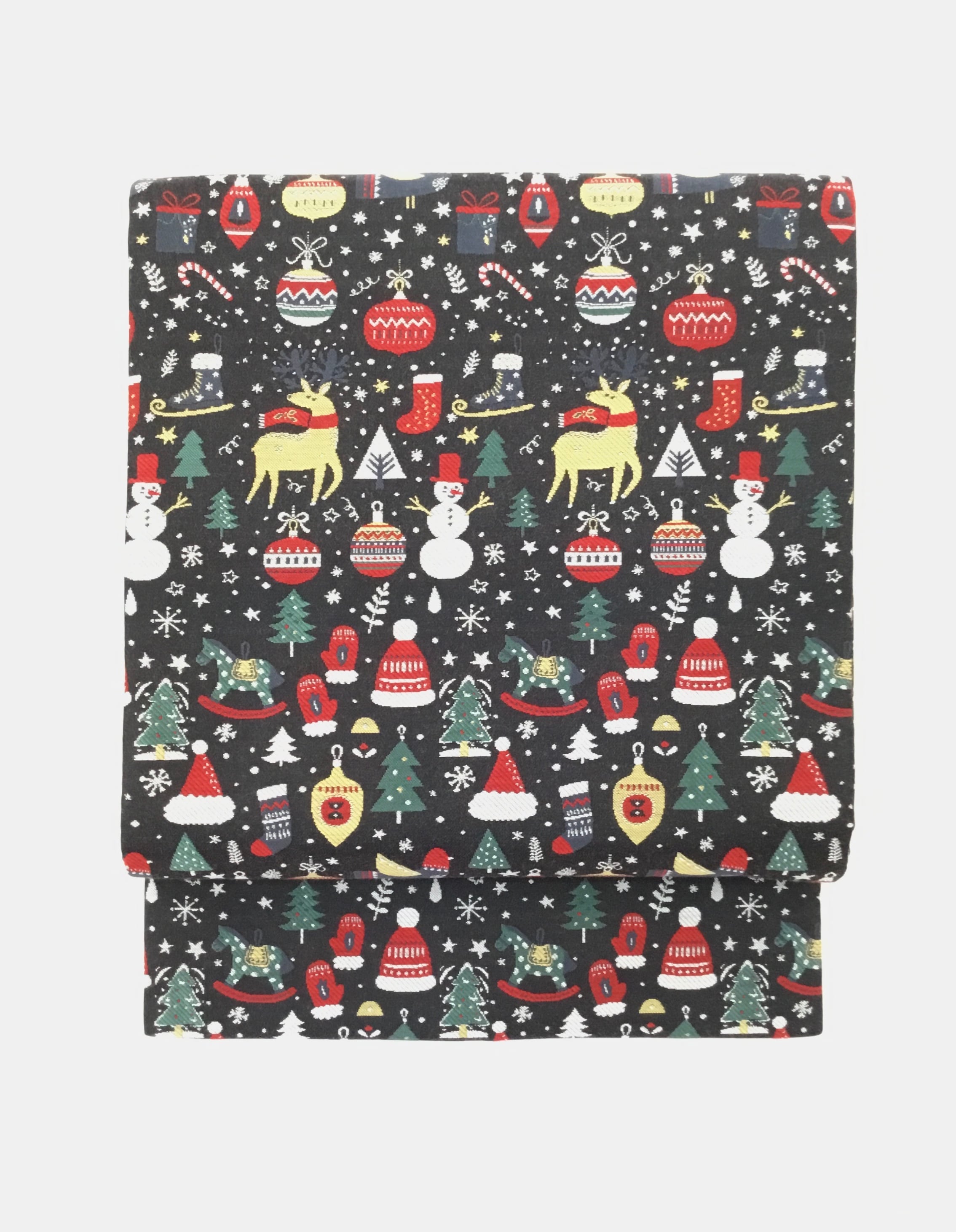 絹綿のふっくらとした少し起毛感のある織地です。黒地に隙間なくクリスマスモチーフが織り出された何とも可愛らしい意匠の九寸なごや帯です。全通柄で扱いやすい帯となっており、初心者さんにもオススメ致します。ぜひこの時季のコーディネートに取り入れて季節を感じる装いをお楽しみください。