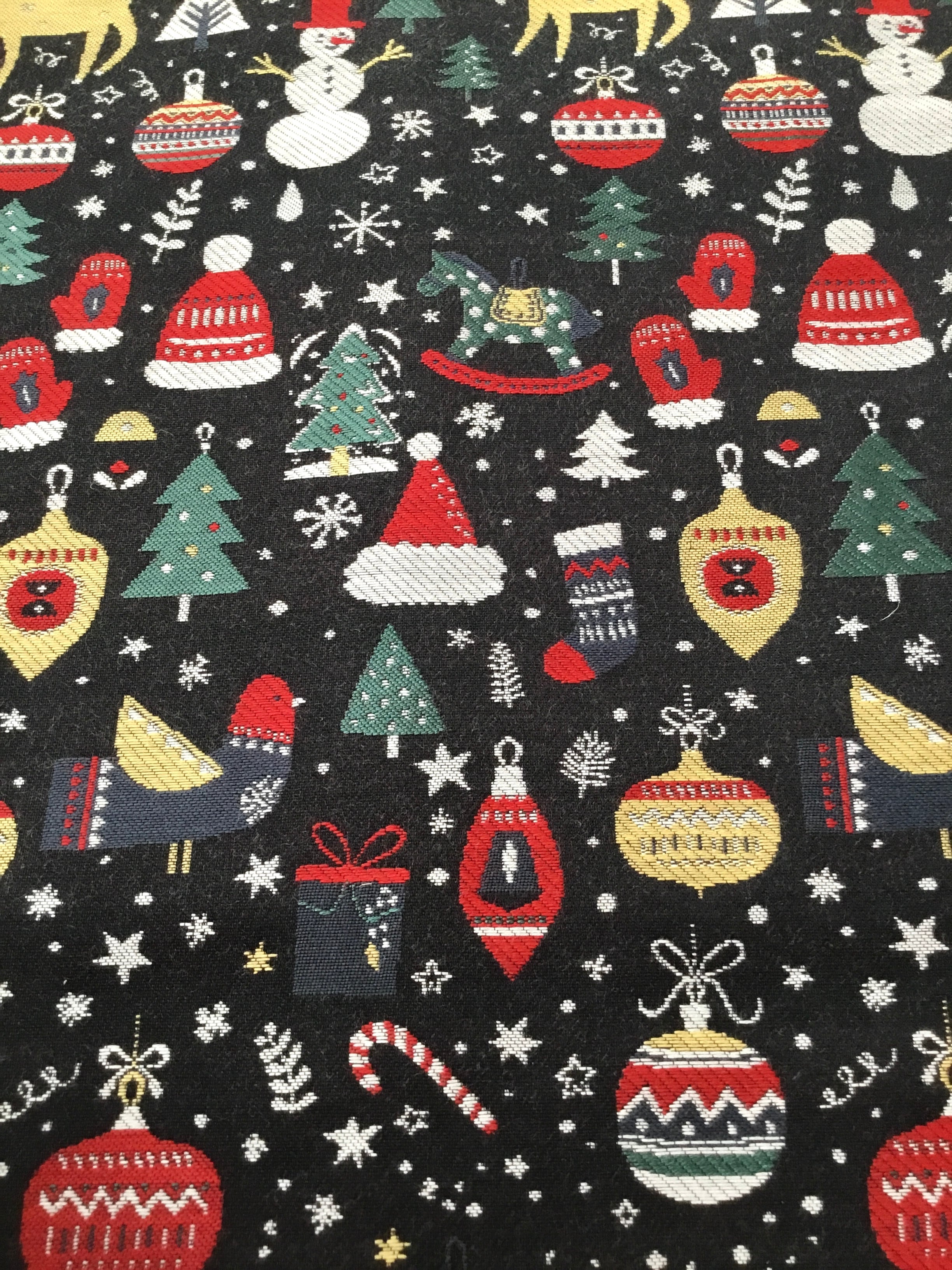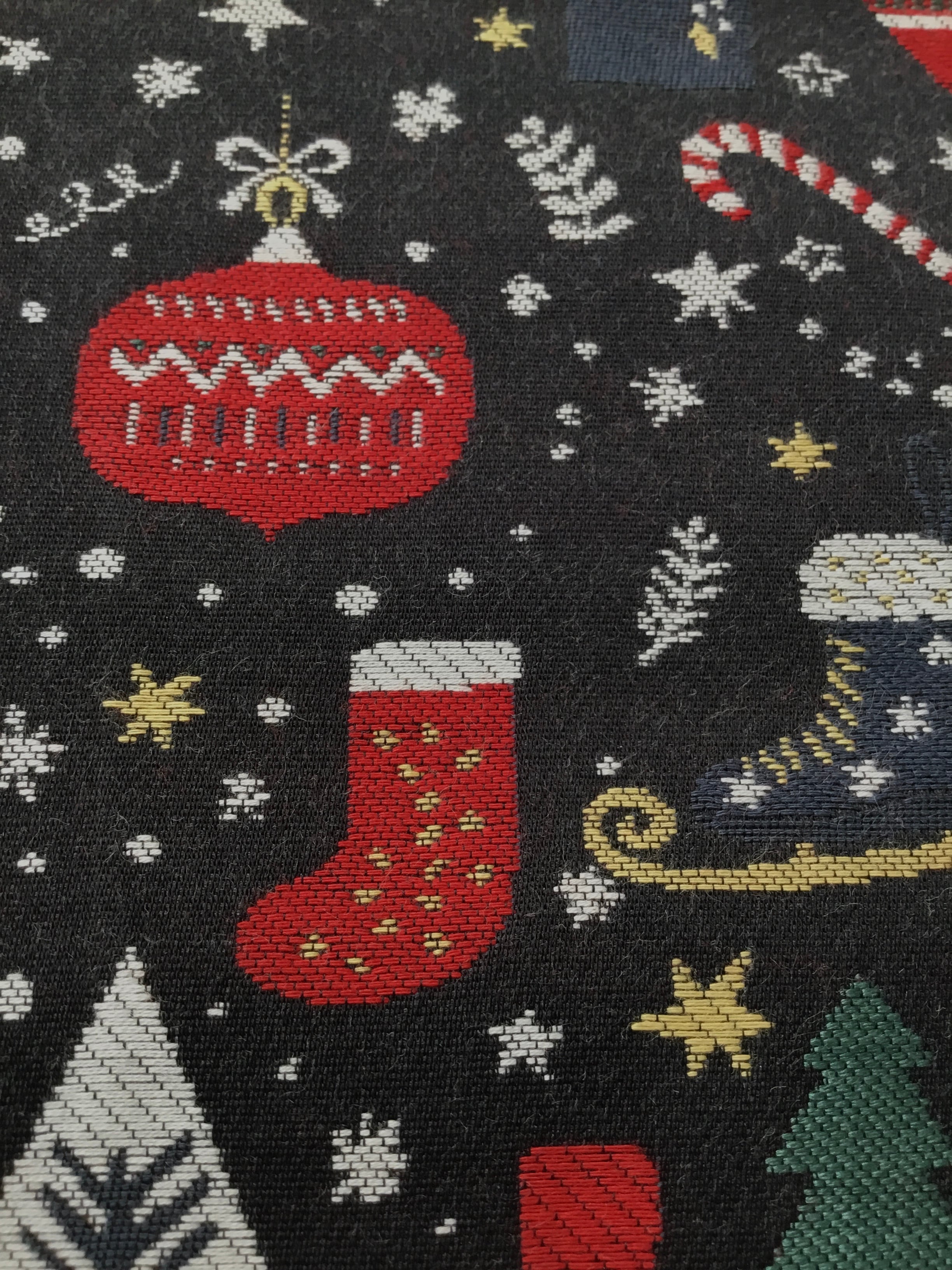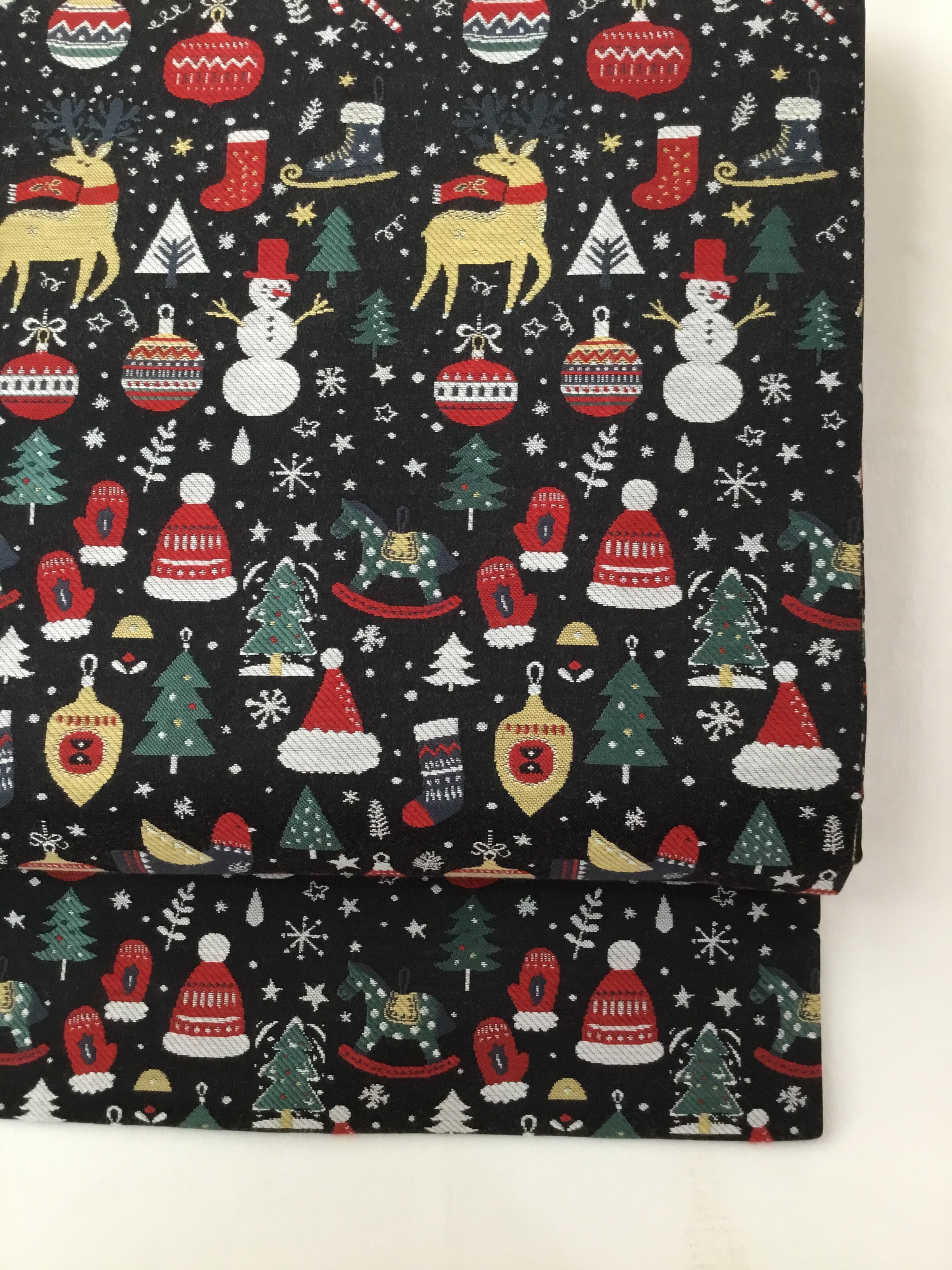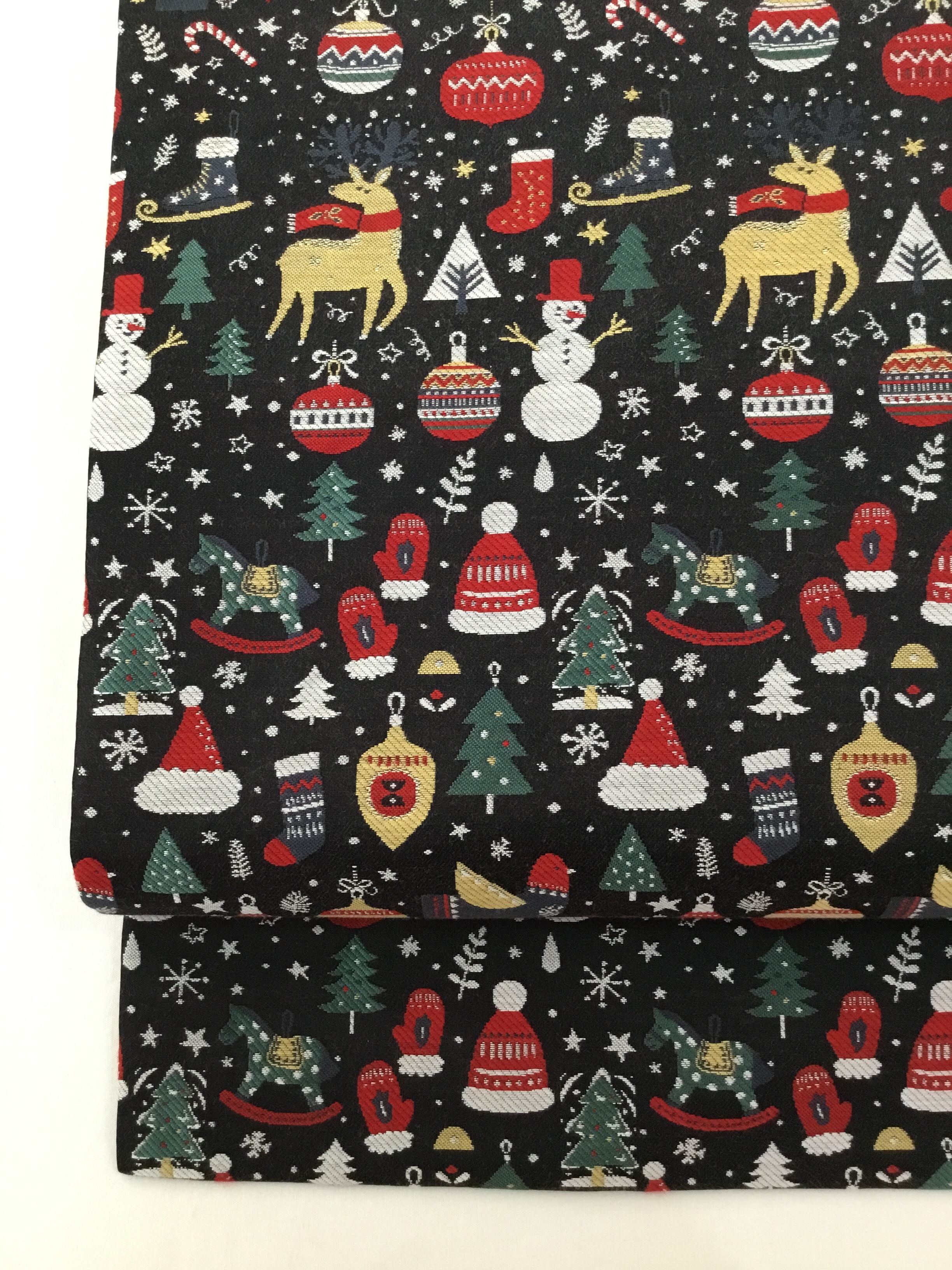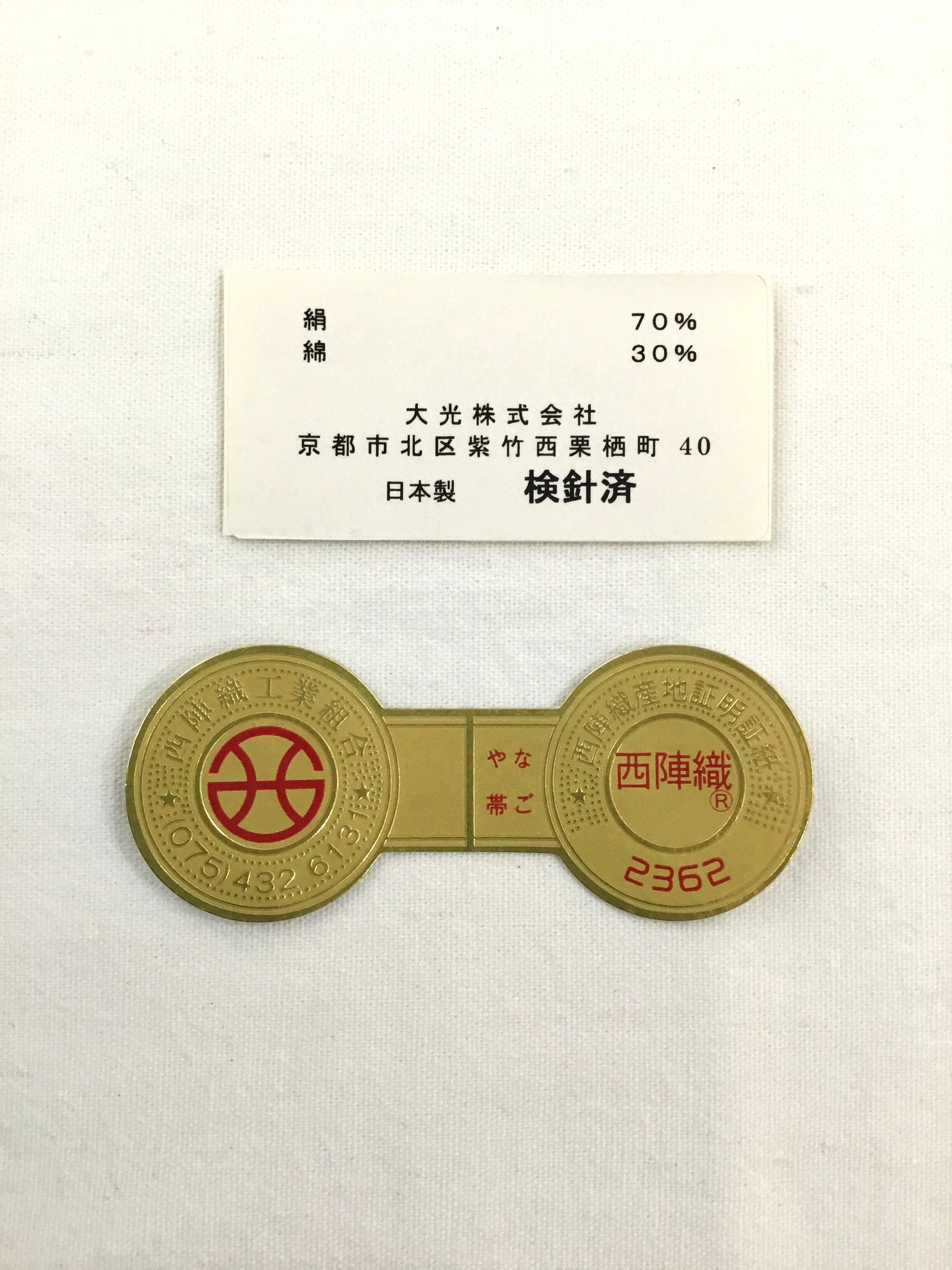 絹綿のふっくらとした少し起毛感のある織地です。黒地に隙間なくクリスマスモチーフが織り出された何とも可愛らしい意匠の九寸なごや帯です。全通柄で扱いやすい帯となっており、初心者さんにもオススメ致します。ぜひこの時季のコーディネートに取り入れて季節を感じる装いをお楽しみください。