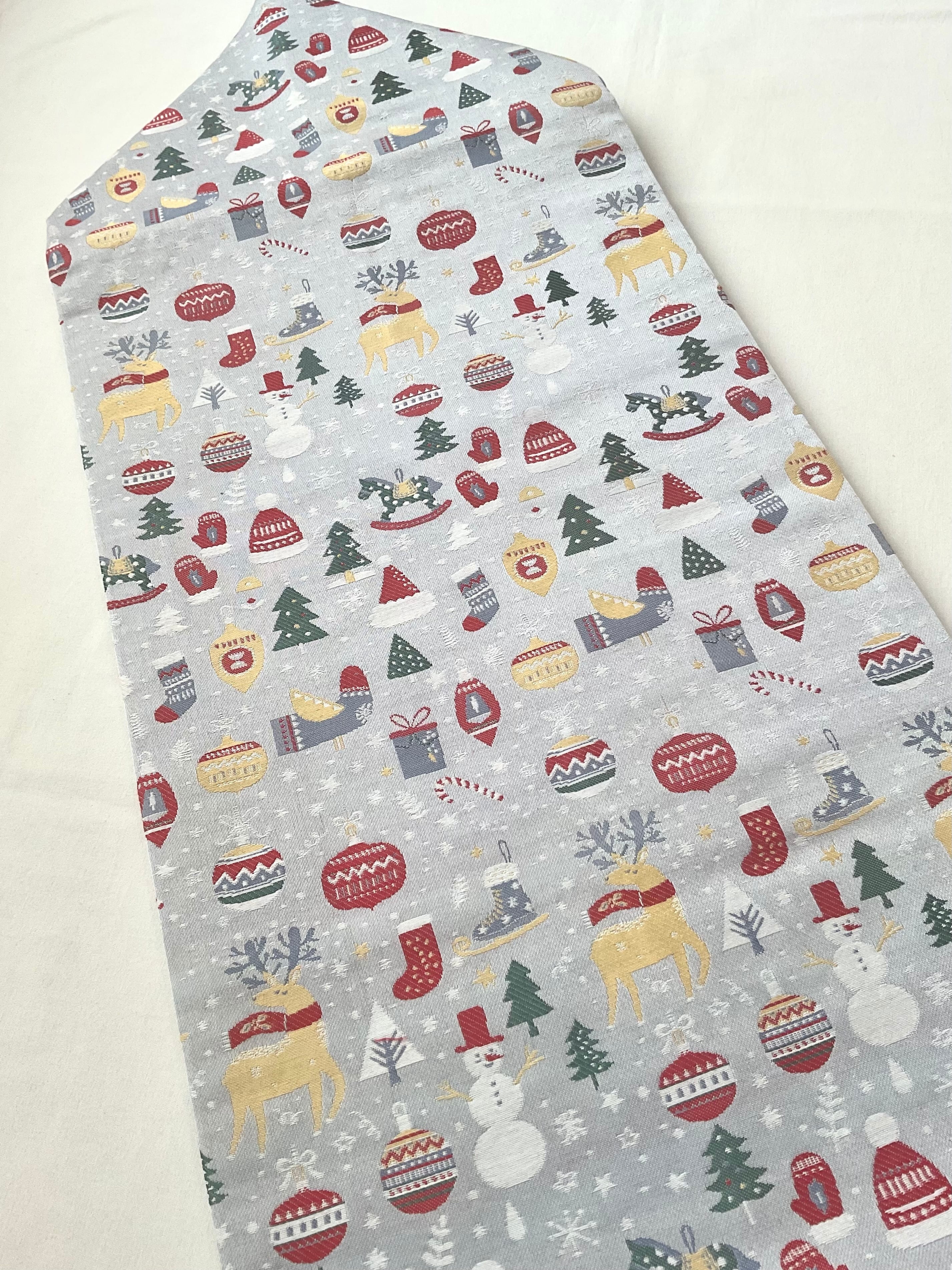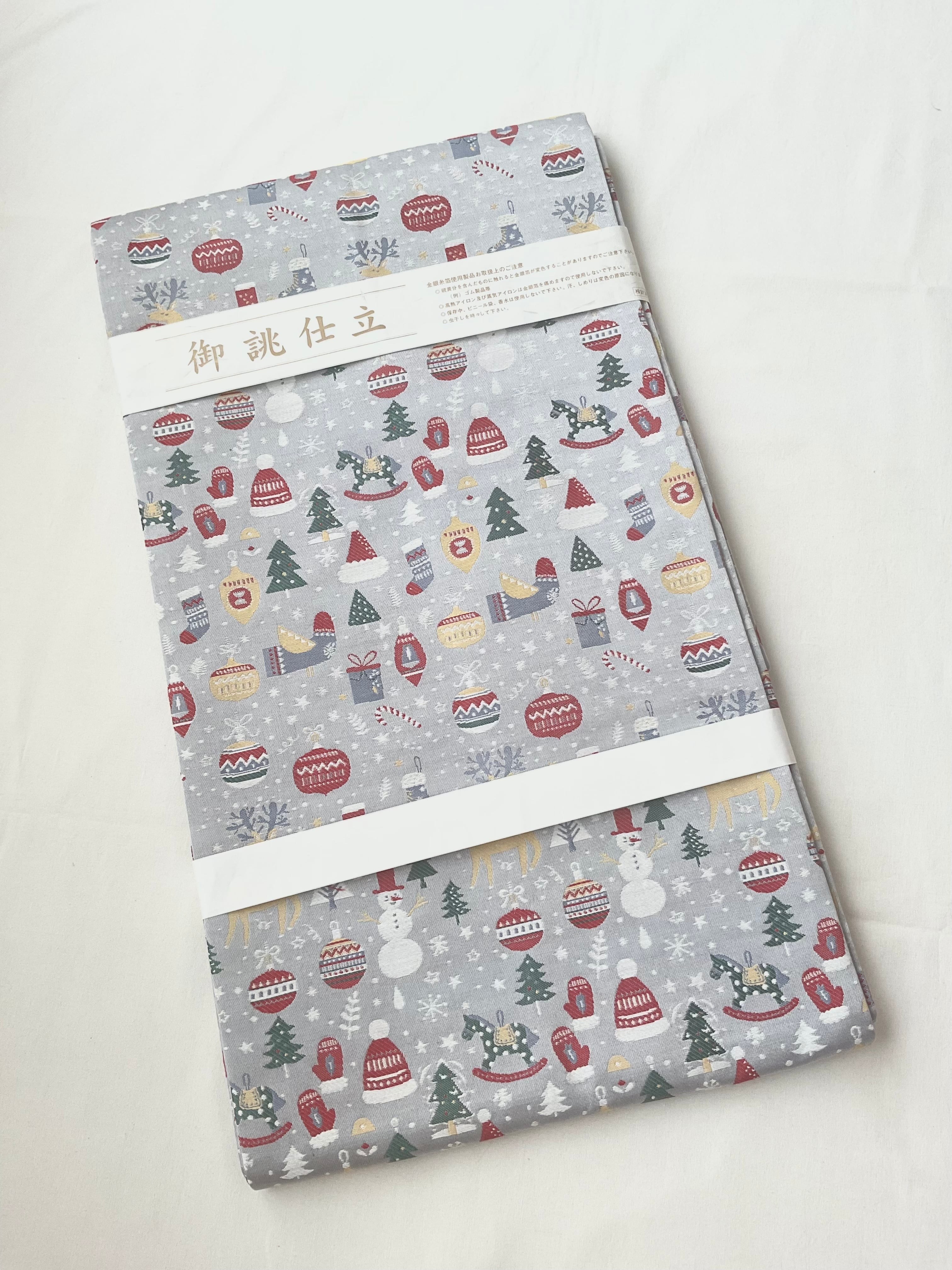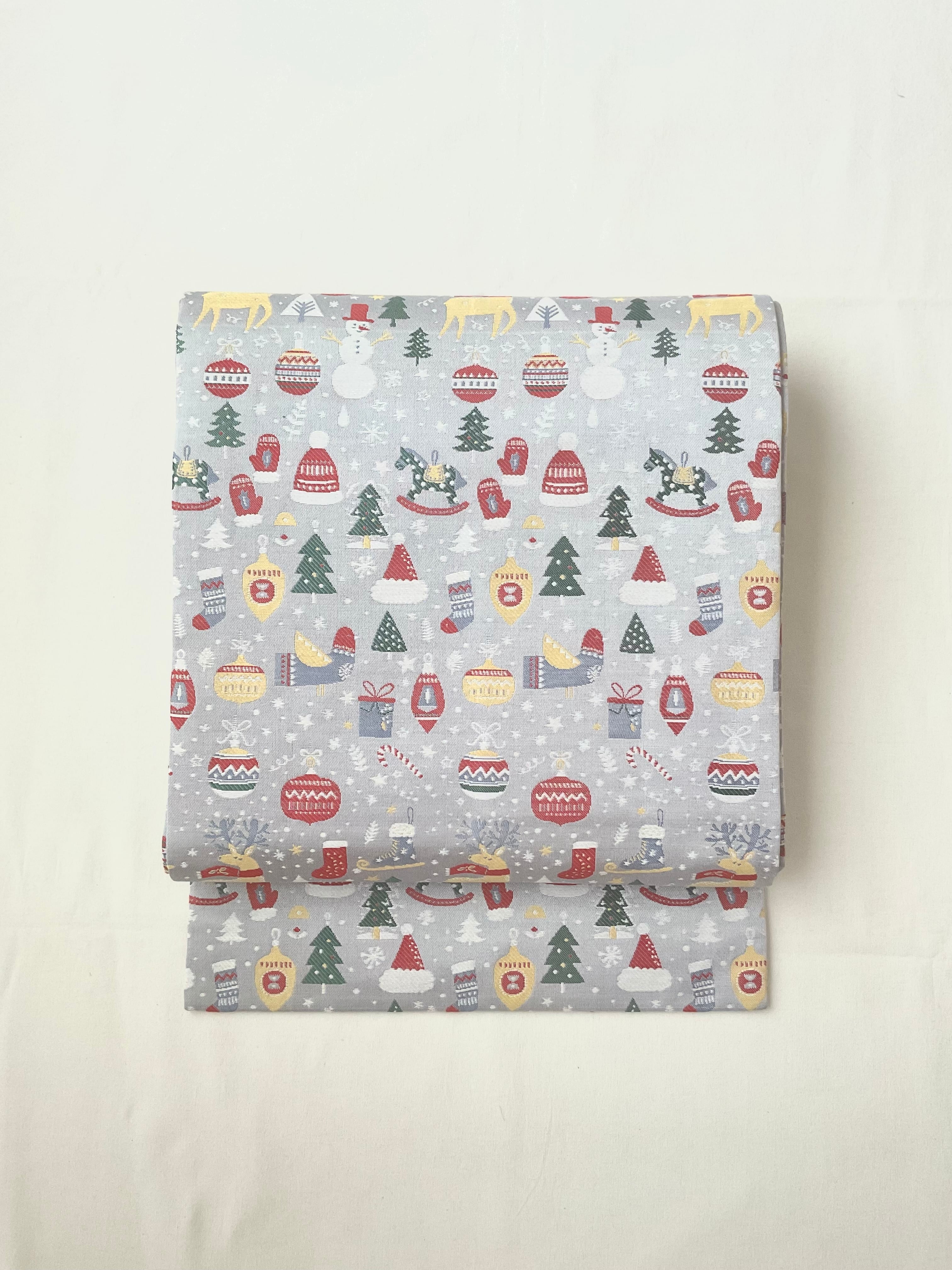 絹綿のふっくらとした少し起毛感のある織地です。グレー地に隙間なくクリスマスモチーフが織り出された何とも可愛らしい意匠の九寸なごや帯です。全通柄で扱いやすい帯となっており、初心者さんにもオススメ致します。ぜひクリスマスシーズンのコーディネートに取り入れて季節を感じる装いをお楽しみください。