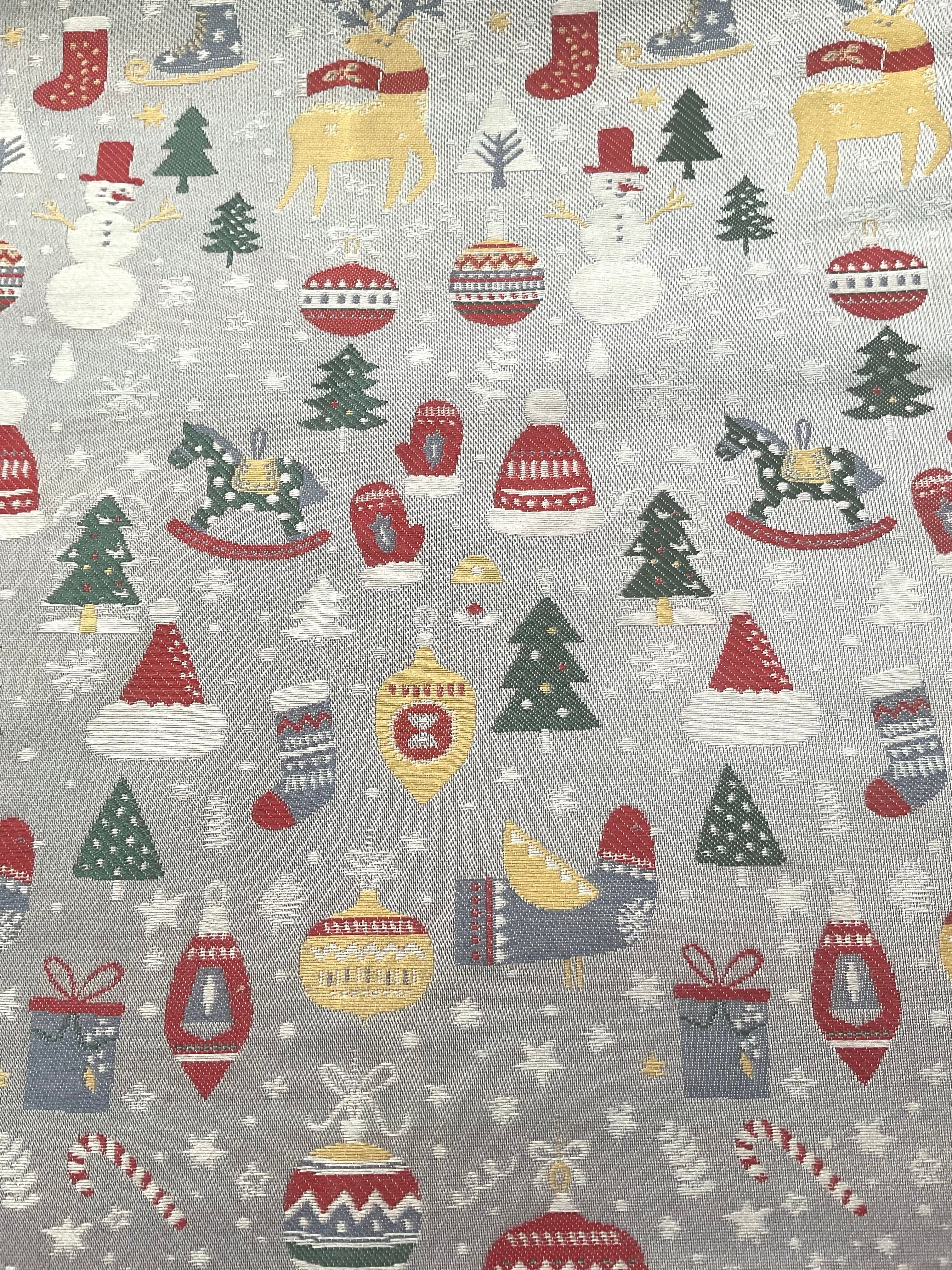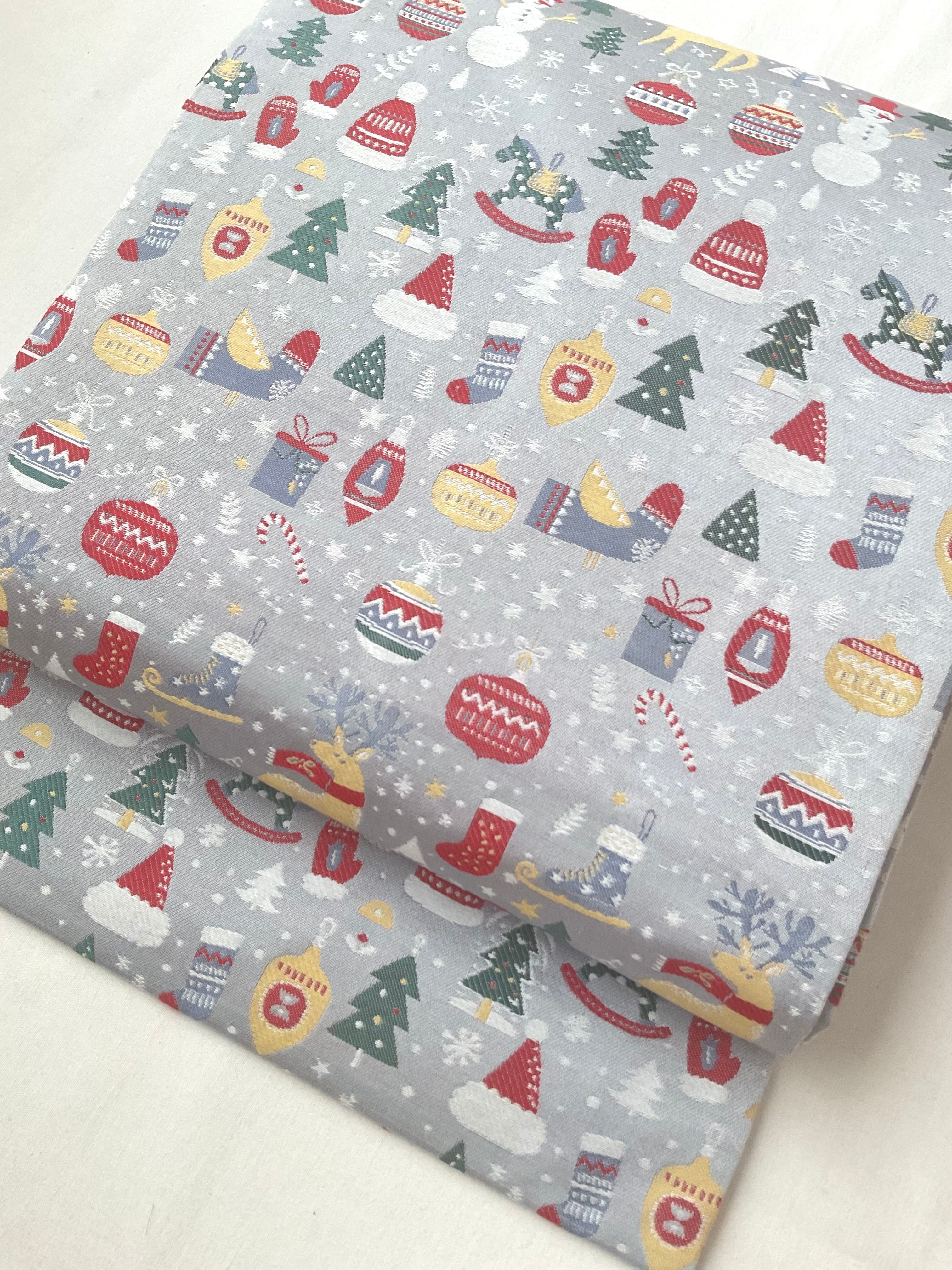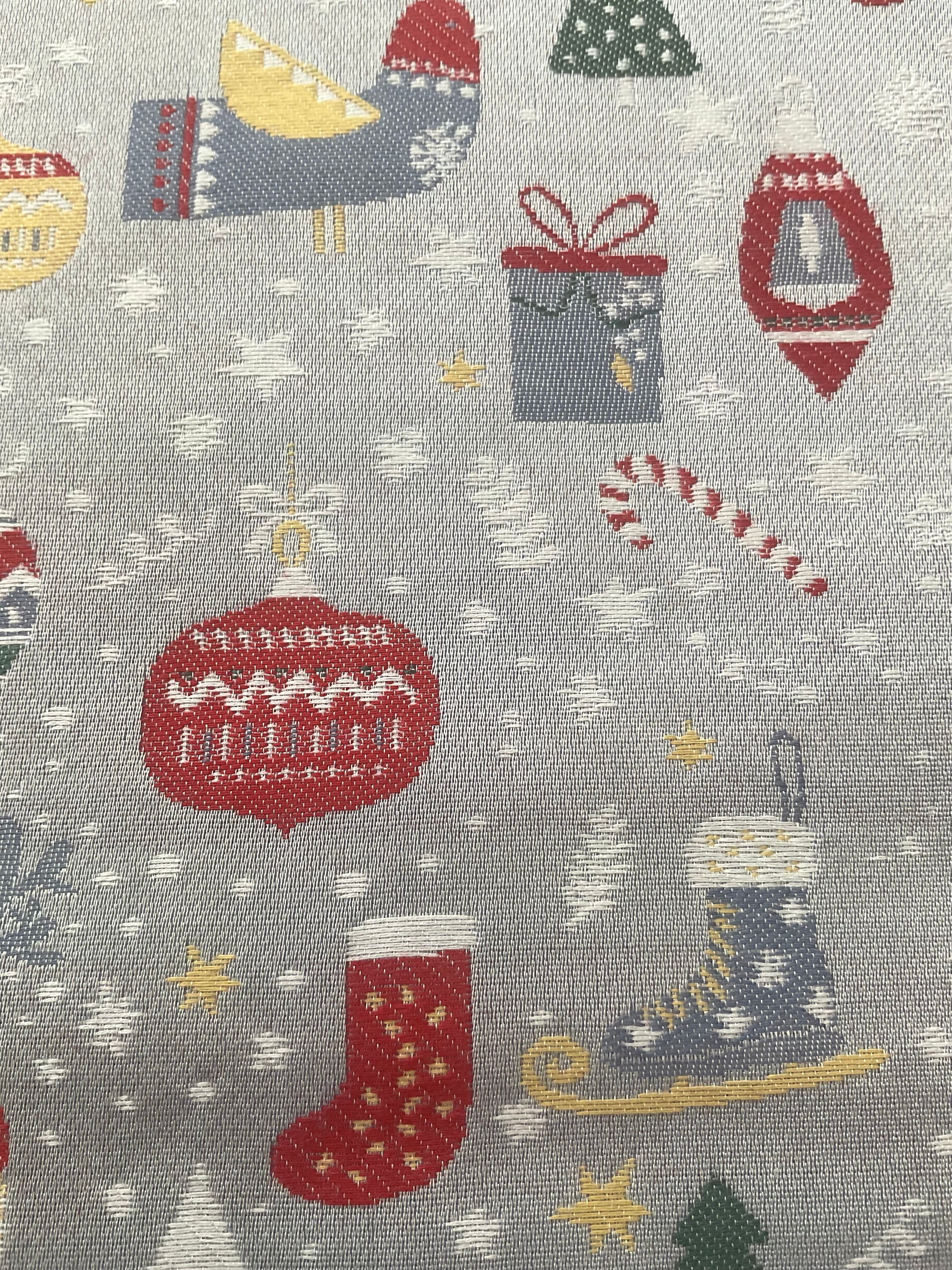 絹綿のふっくらとした少し起毛感のある織地です。グレー地に隙間なくクリスマスモチーフが織り出された何とも可愛らしい意匠の九寸なごや帯です。全通柄で扱いやすい帯となっており、初心者さんにもオススメ致します。ぜひクリスマスシーズンのコーディネートに取り入れて季節を感じる装いをお楽しみください。