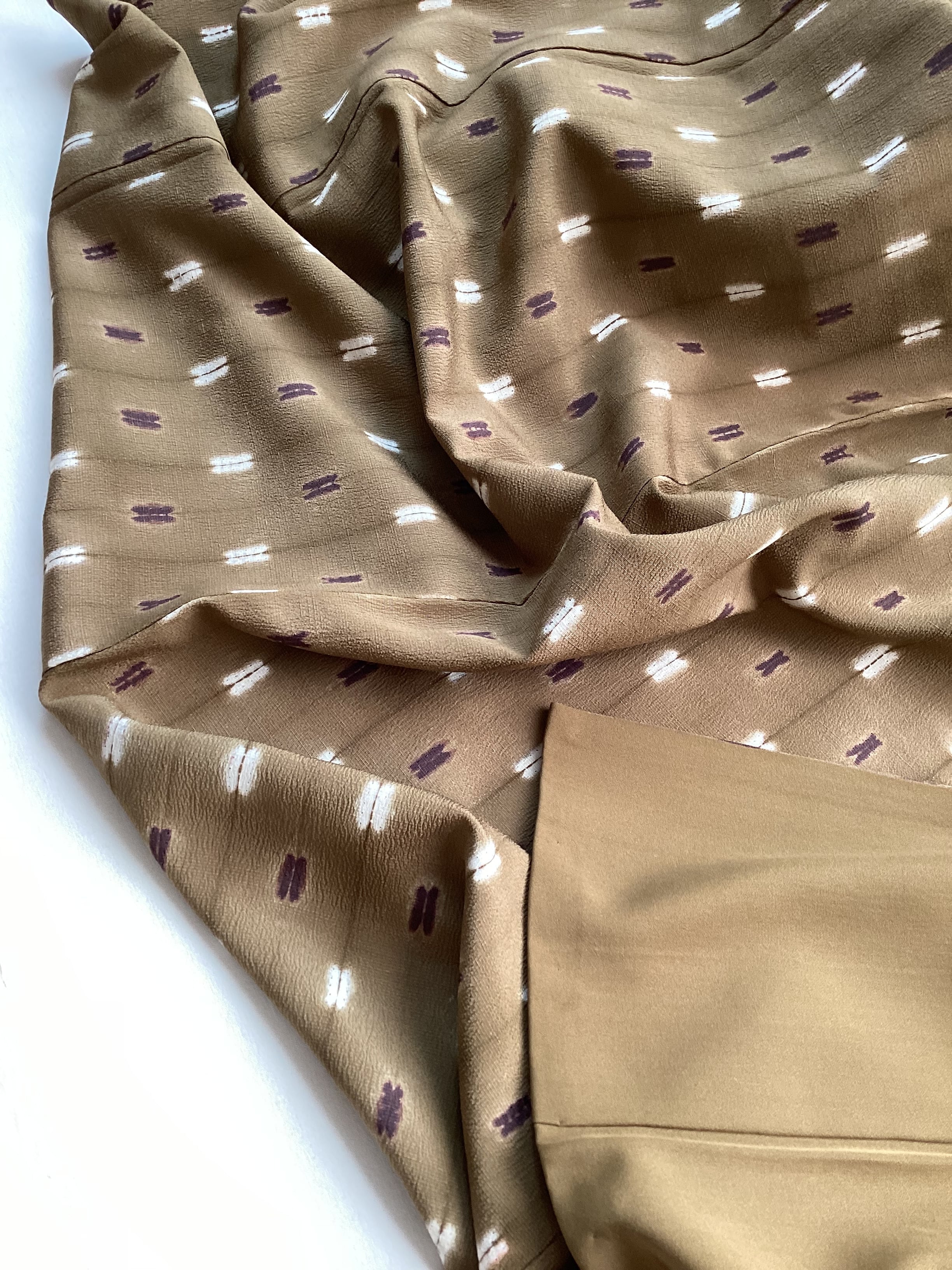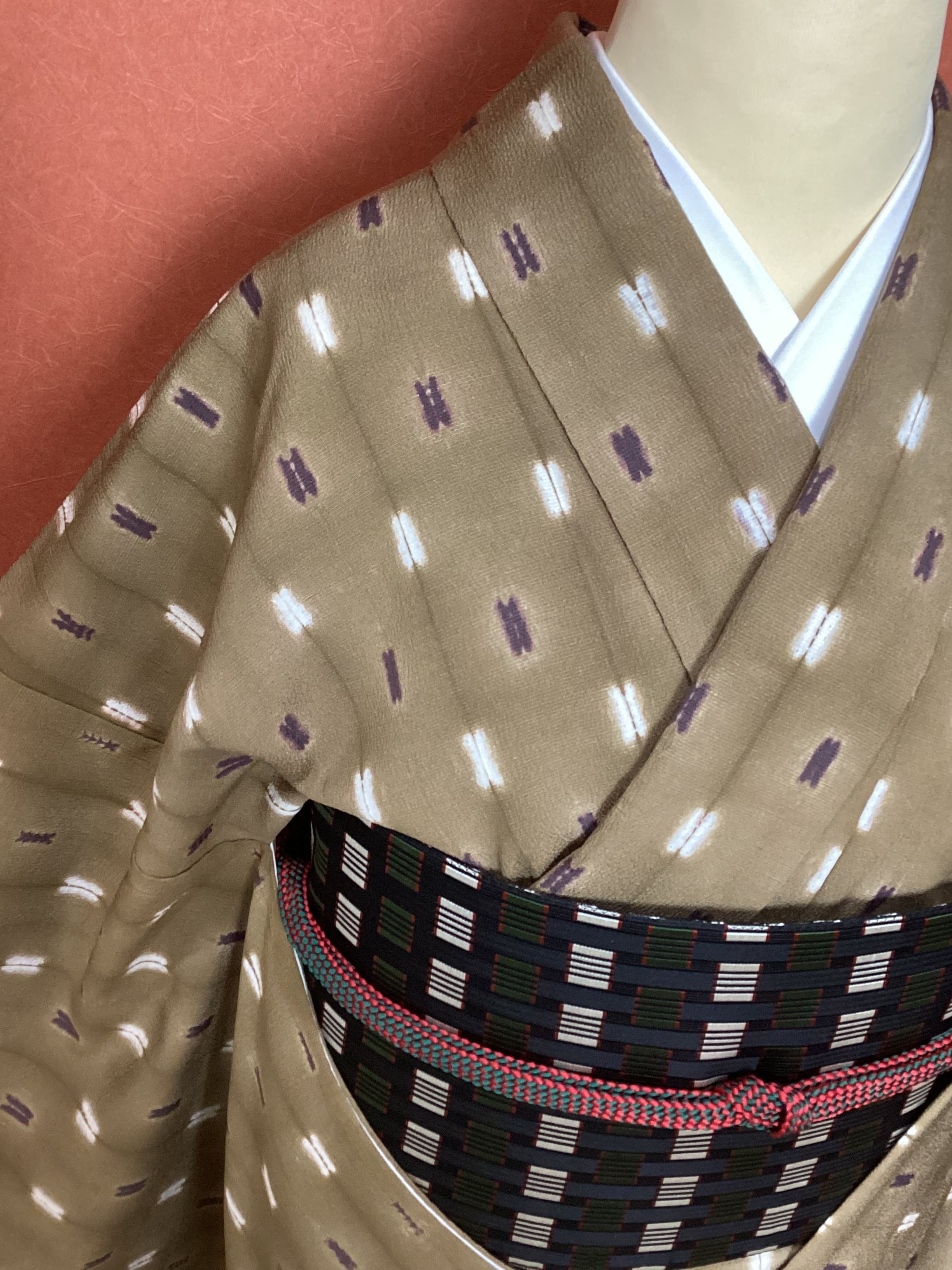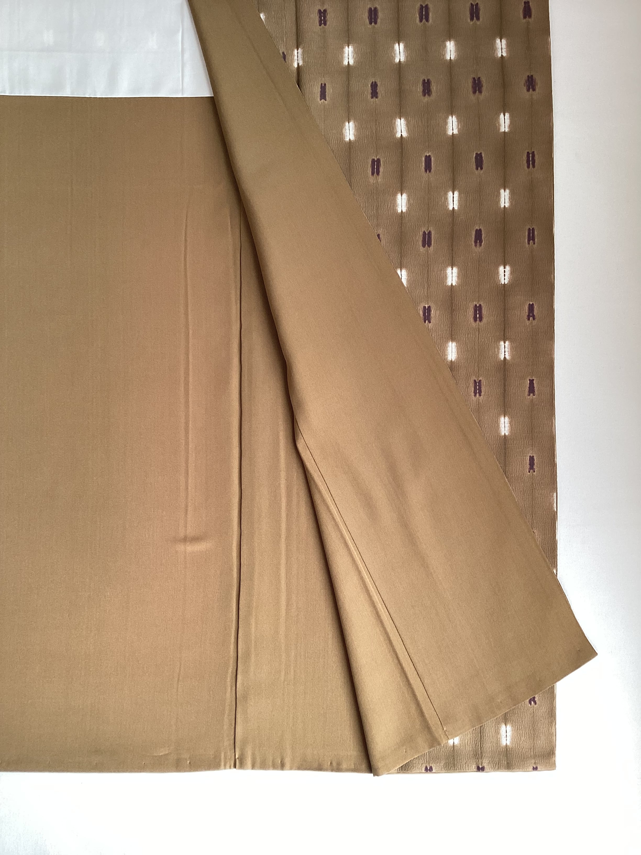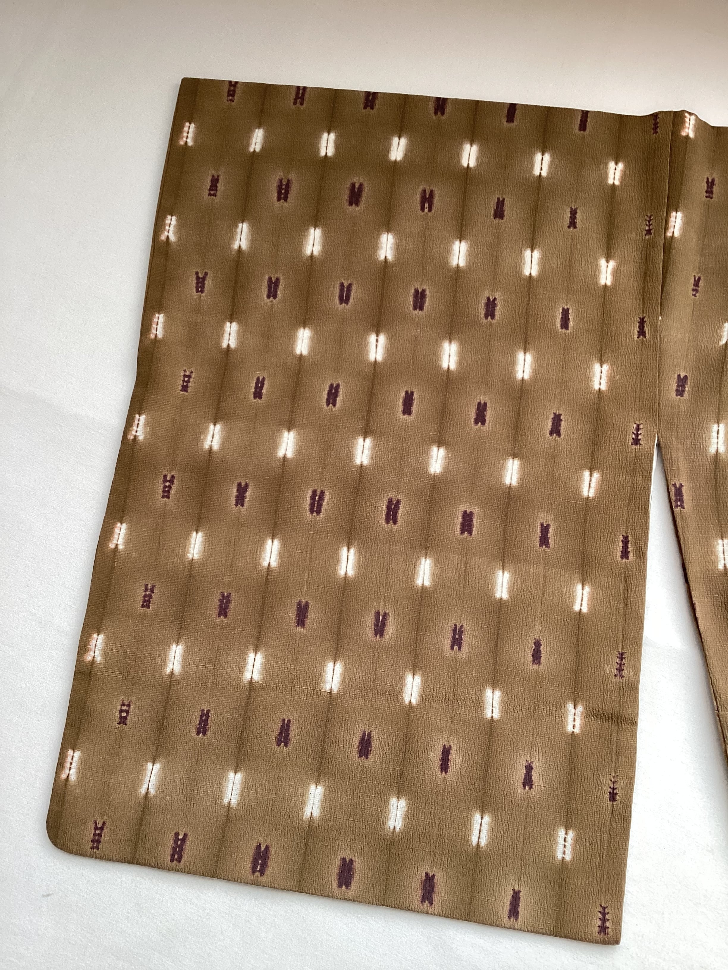 シボだったしっかりとした織地に均等に並んだ絞り文様の手仕事の温かみのある小紋きものです。ベースのお色目は黄土色に近い黄みがかった茶色で、紫と白の四角い文様が絞り特有の滲みで表現されております。身丈、裄丈、身巾が十分にございますので、トールサイズをお探しの方は、秋冬の気軽なお出掛けにいかがでしょうか。