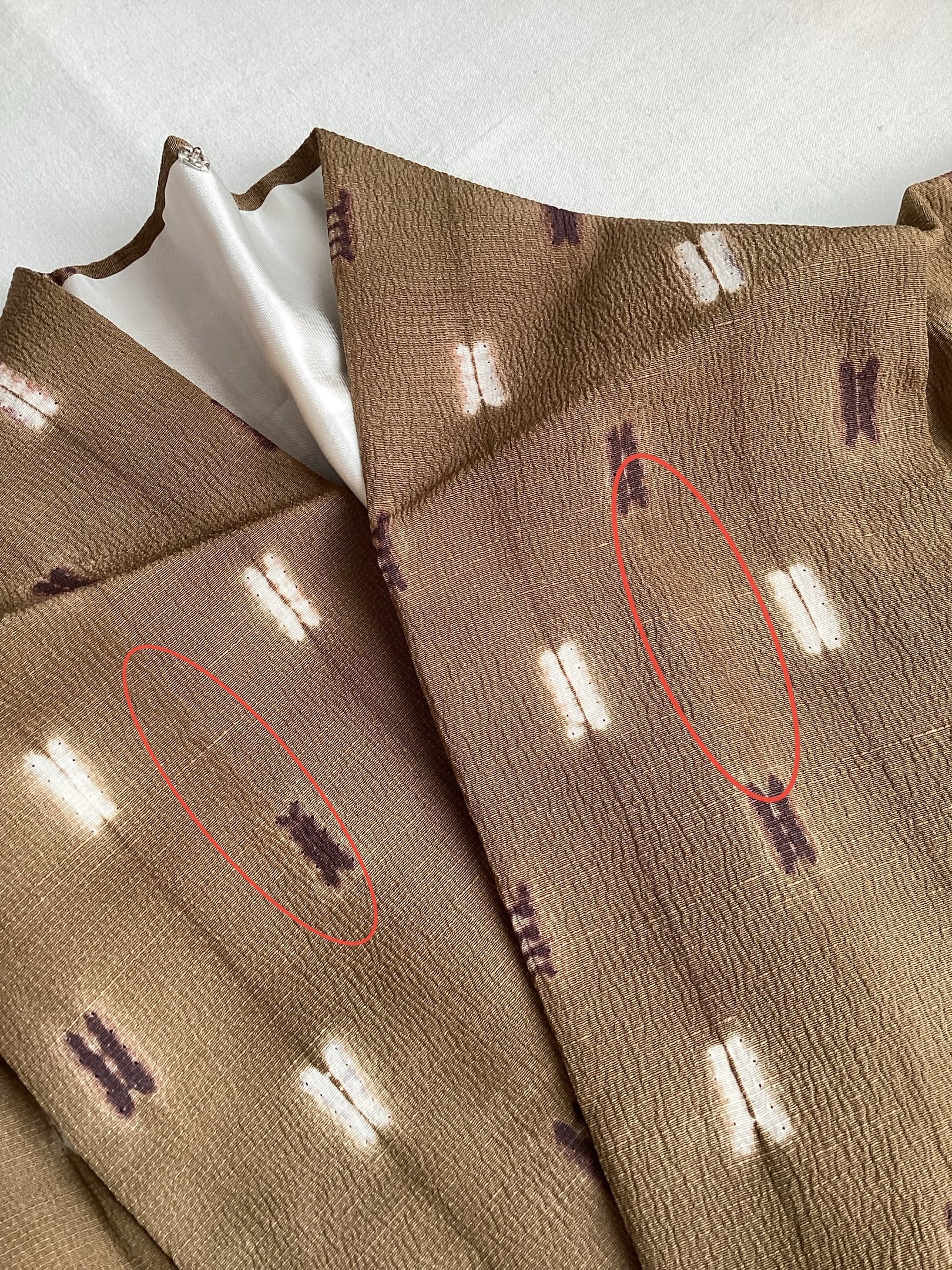 衿の折山に着用によるシミが薄っすらとございます(画像11)。気にされる方はご購入をお控え下さい。