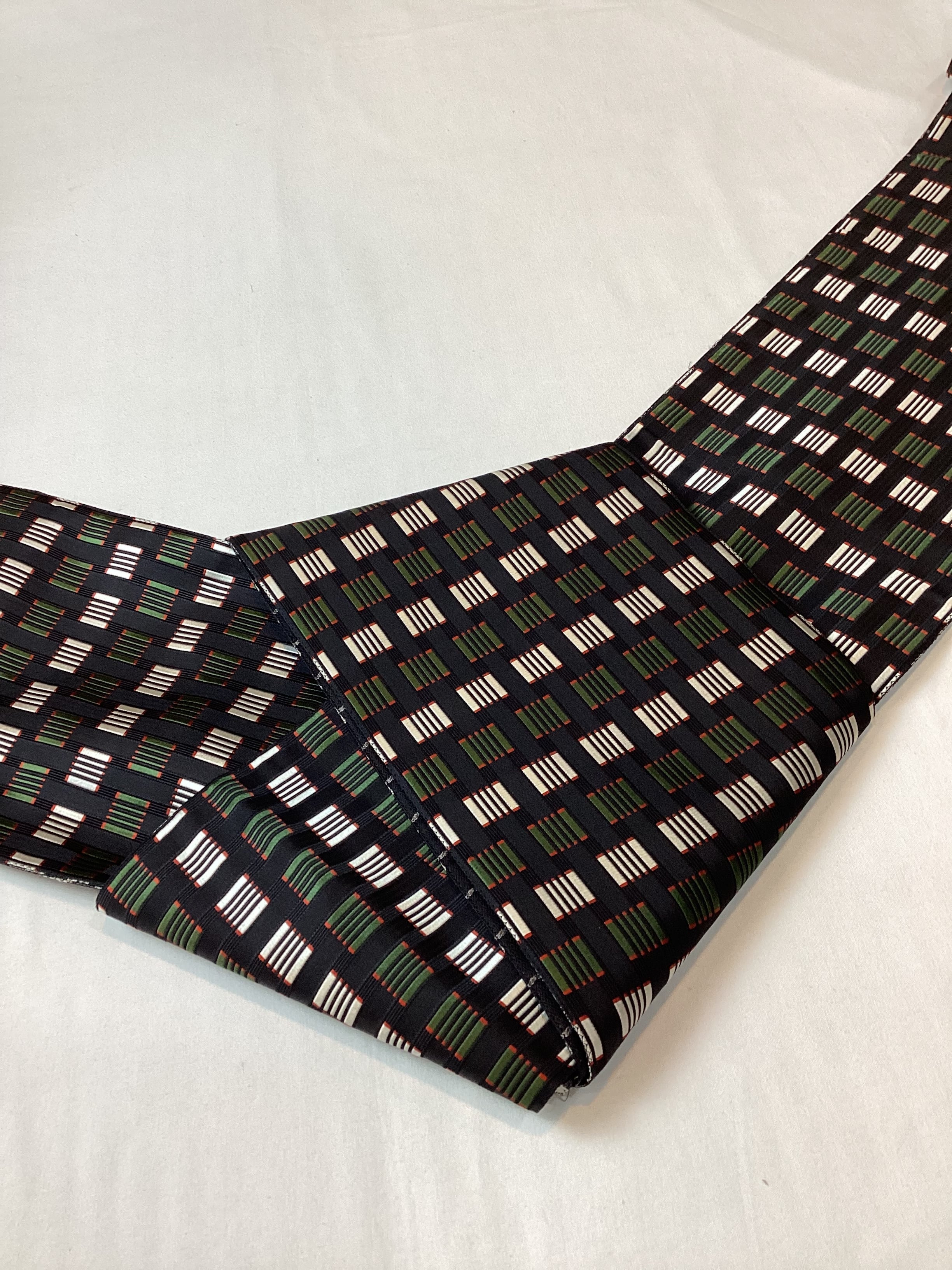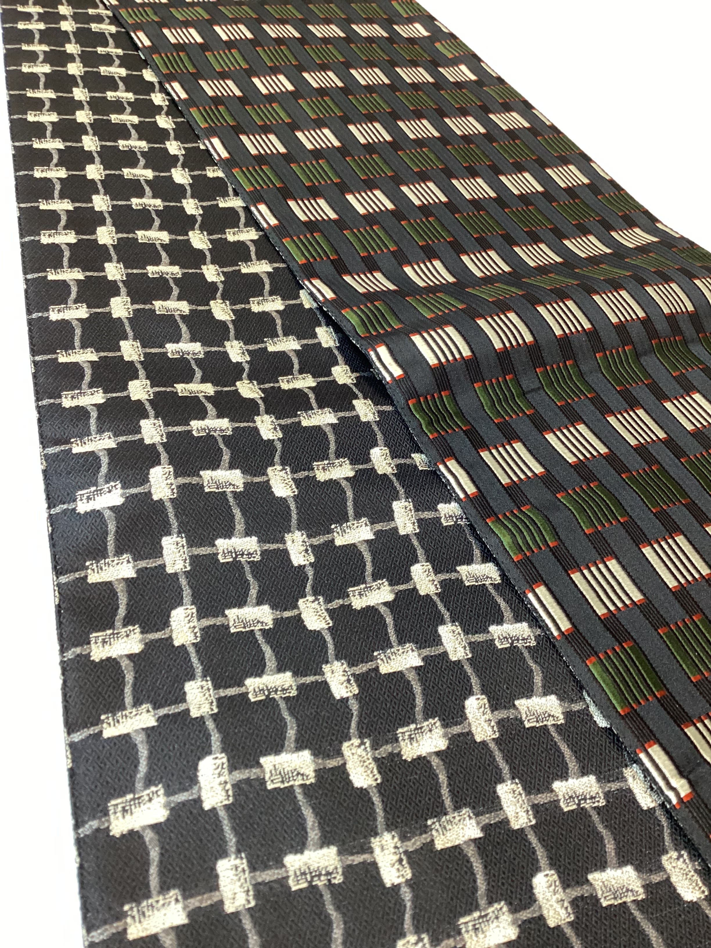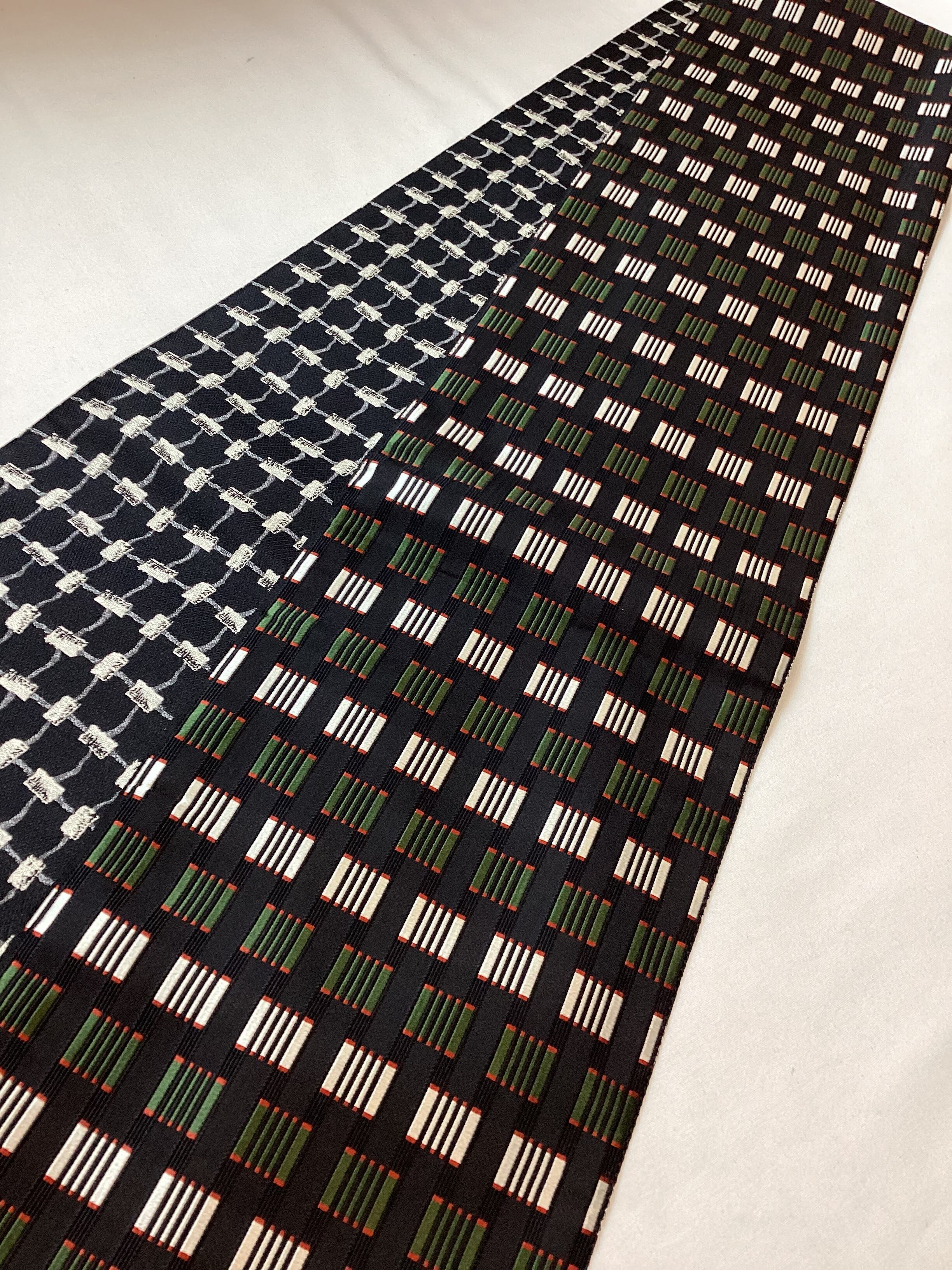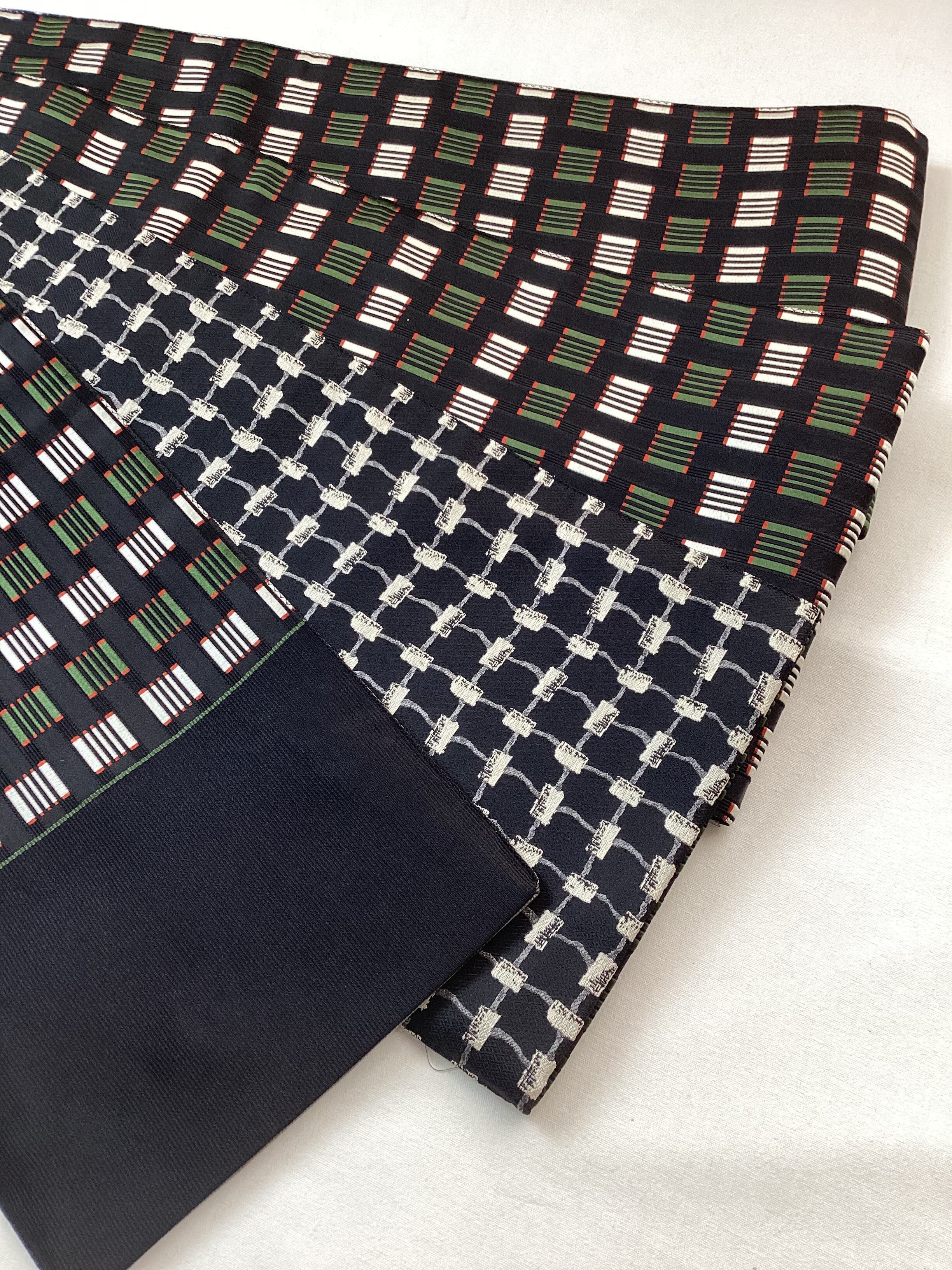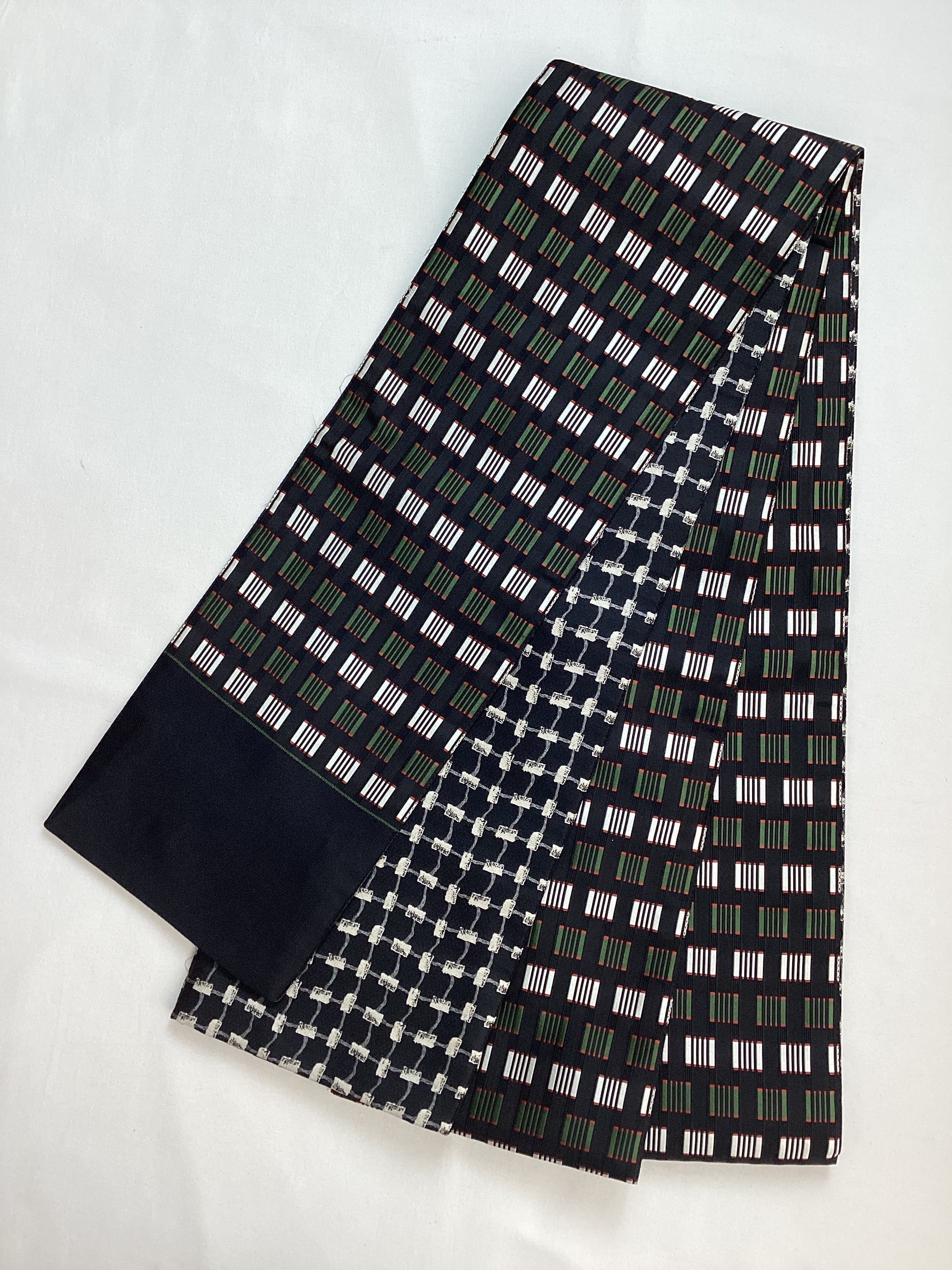 黒地の両面使い出来る使い勝手の良い半巾帯のご紹介です。しなやかで柔らかな上質な織地なので結びやすく、両面ともにベーシックな柄付けなので、コーディネートもしやすい半巾帯です。長さが十分にございますので、色んな飾り結びでアレンジをお楽しみ下さい。タレの無地場がアクセントとなって、後ろ姿をお洒落に粋に飾ってくれます。気軽に結べて、でもくだけ過ぎない質の良い半巾帯はいかがでしょうか。