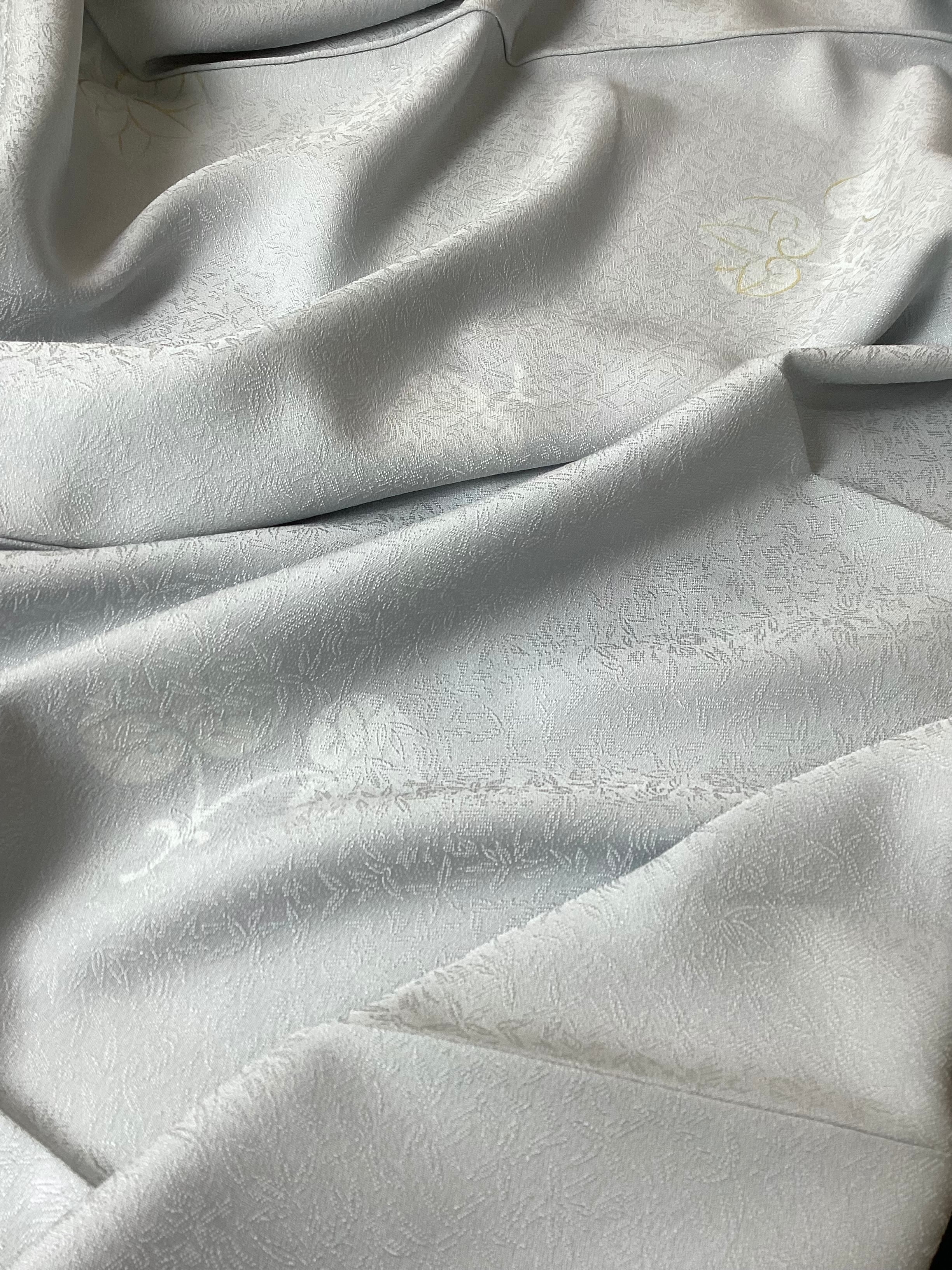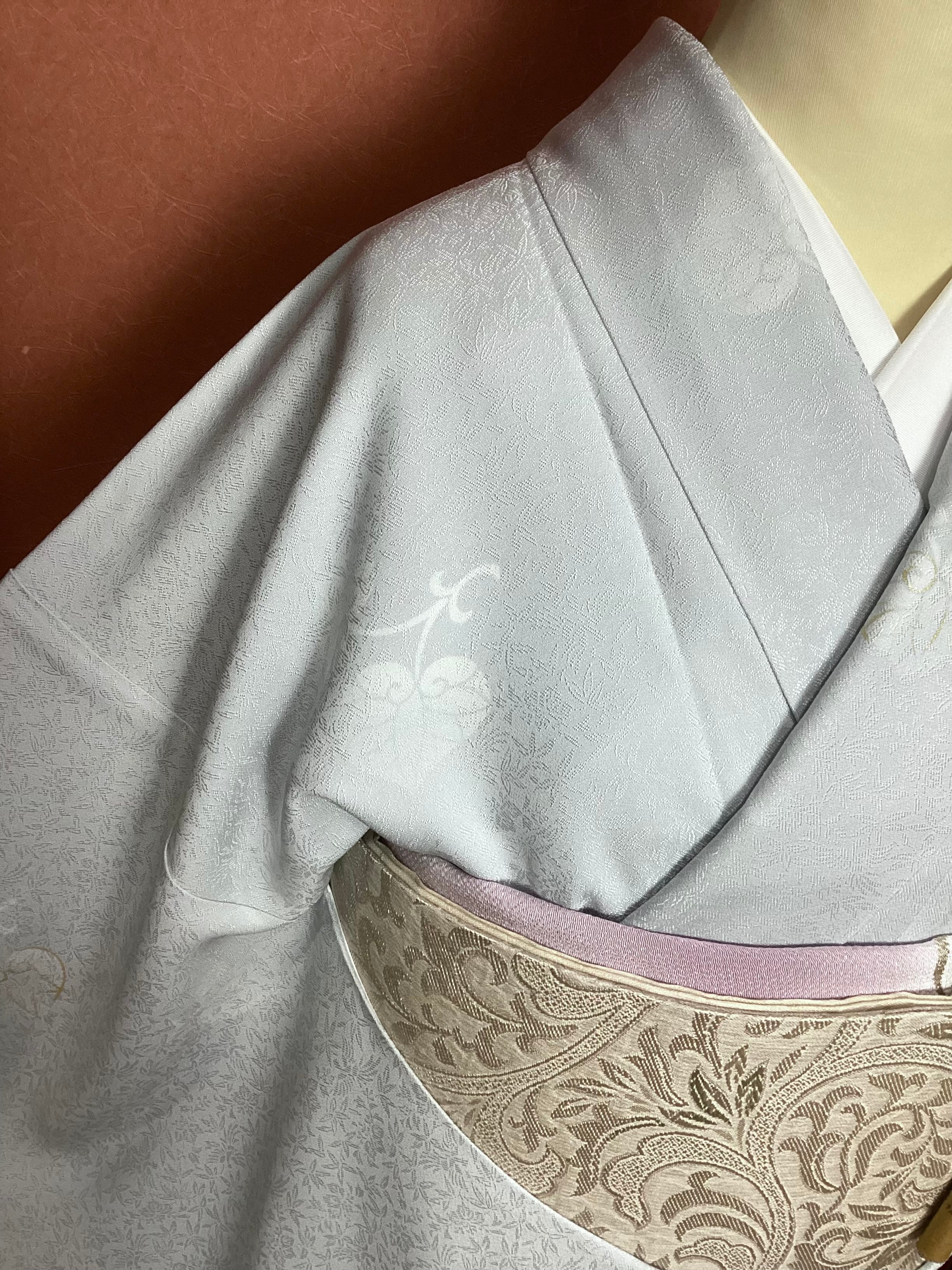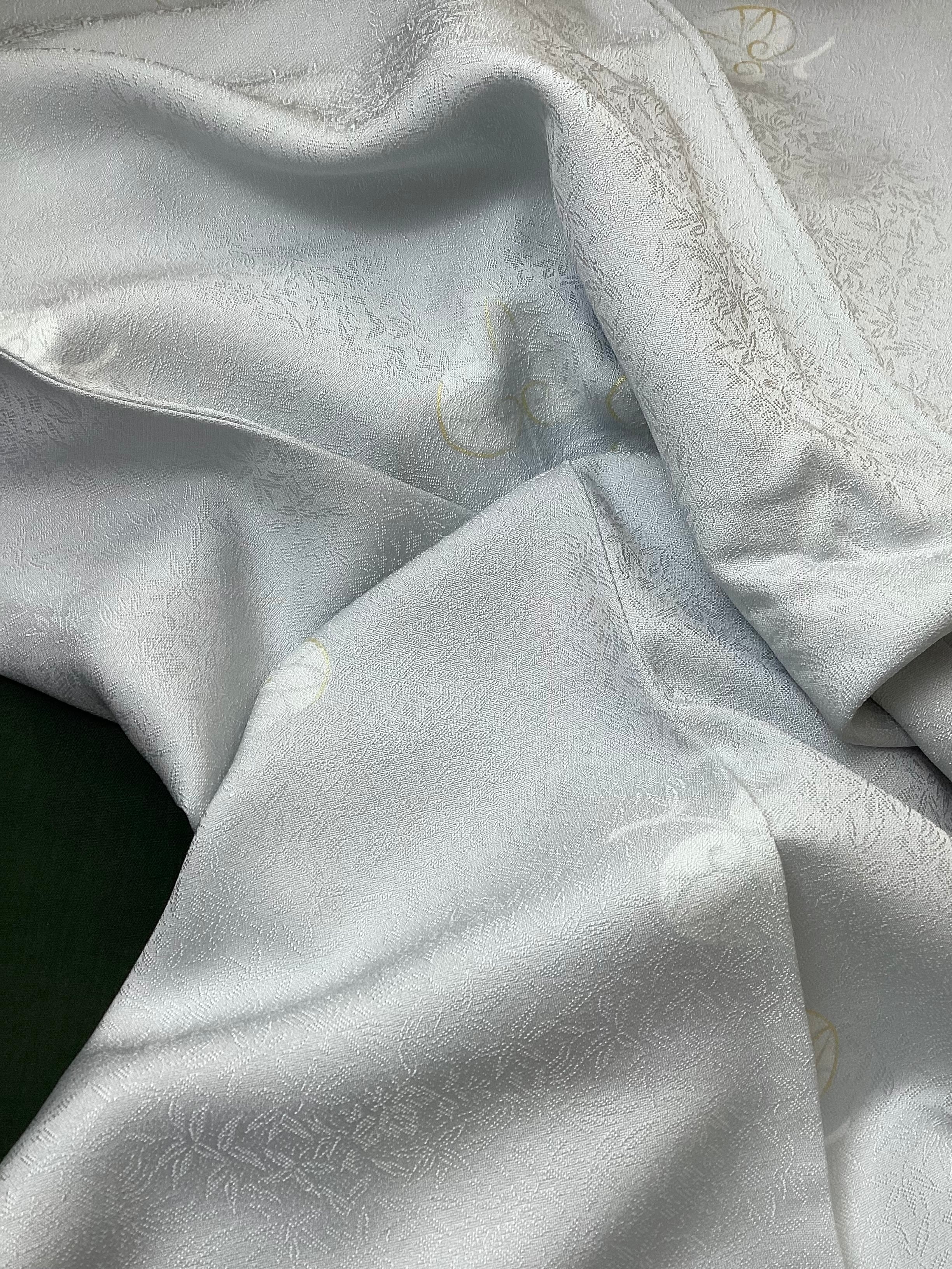 灰みがかった薄い水色に葵文様が飛び柄に配された小紋きものです。ベースの水色地には細かい笹の地紋が織られており、艶やかな光沢感がございます。古典的な葵の文様が白く、ところどころに金彩が施されて描かれており、控えめで上品な印象です。帯選び次第できちんとしたお席にもご着用いただける飛び柄小紋は、大変重宝する一枚です。