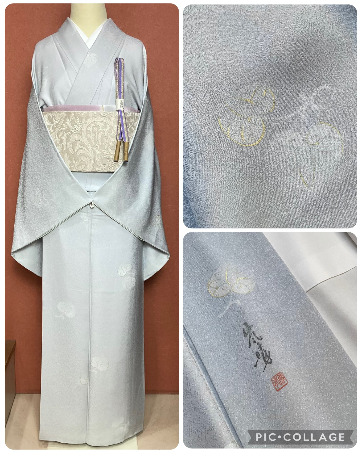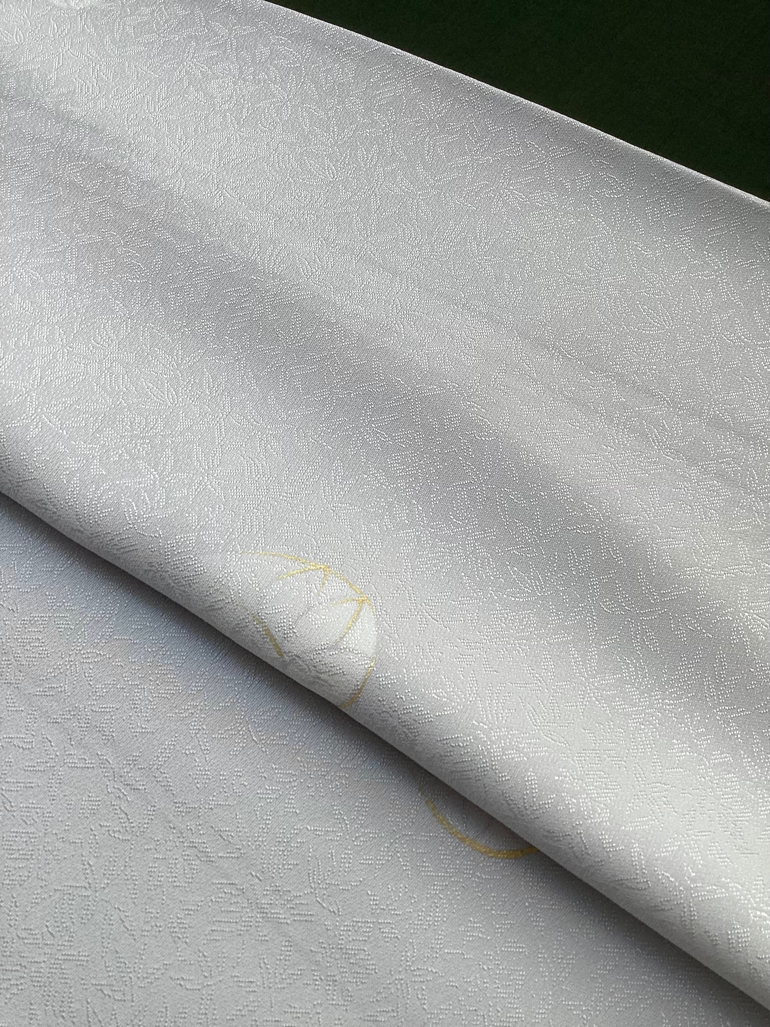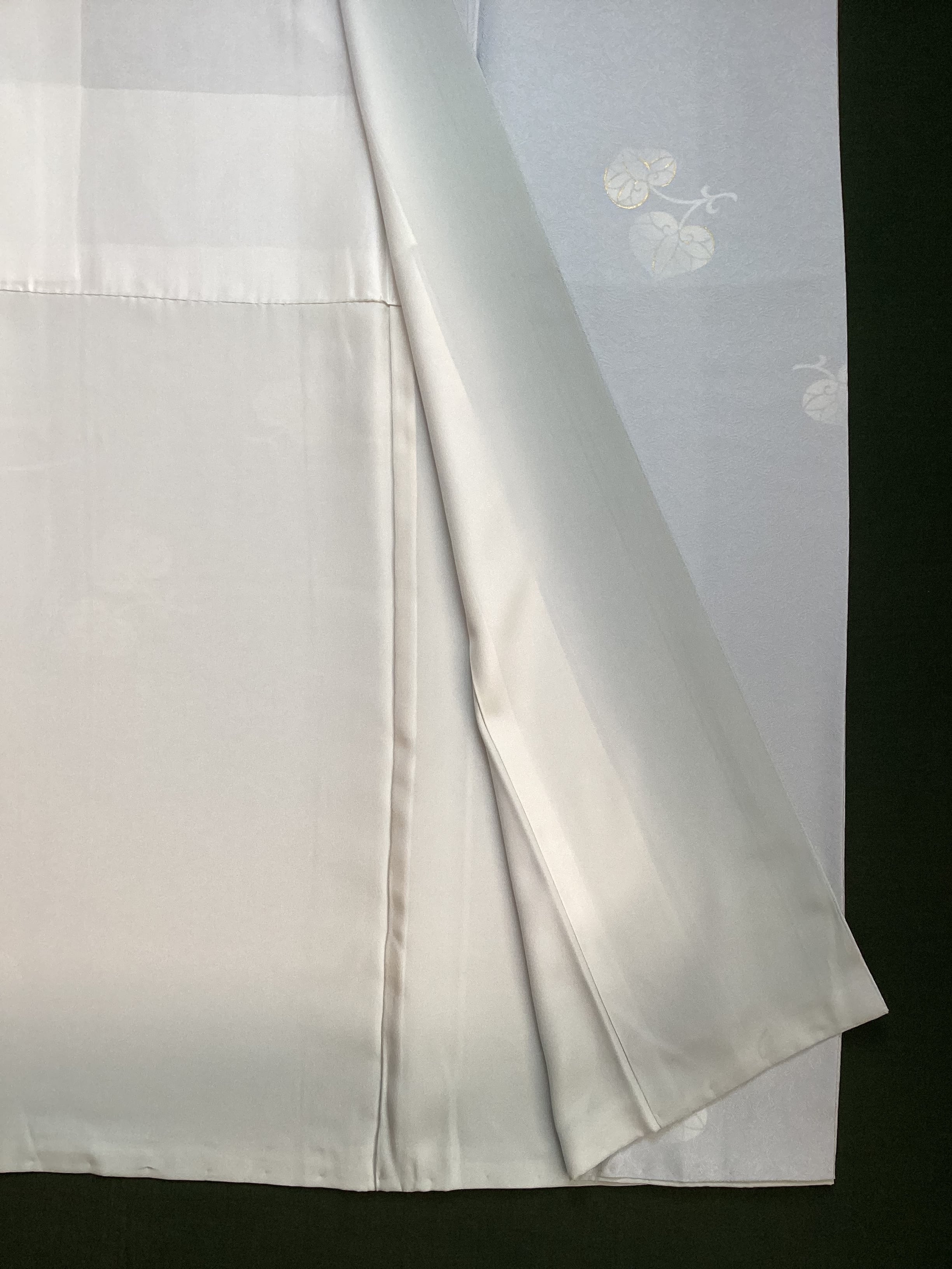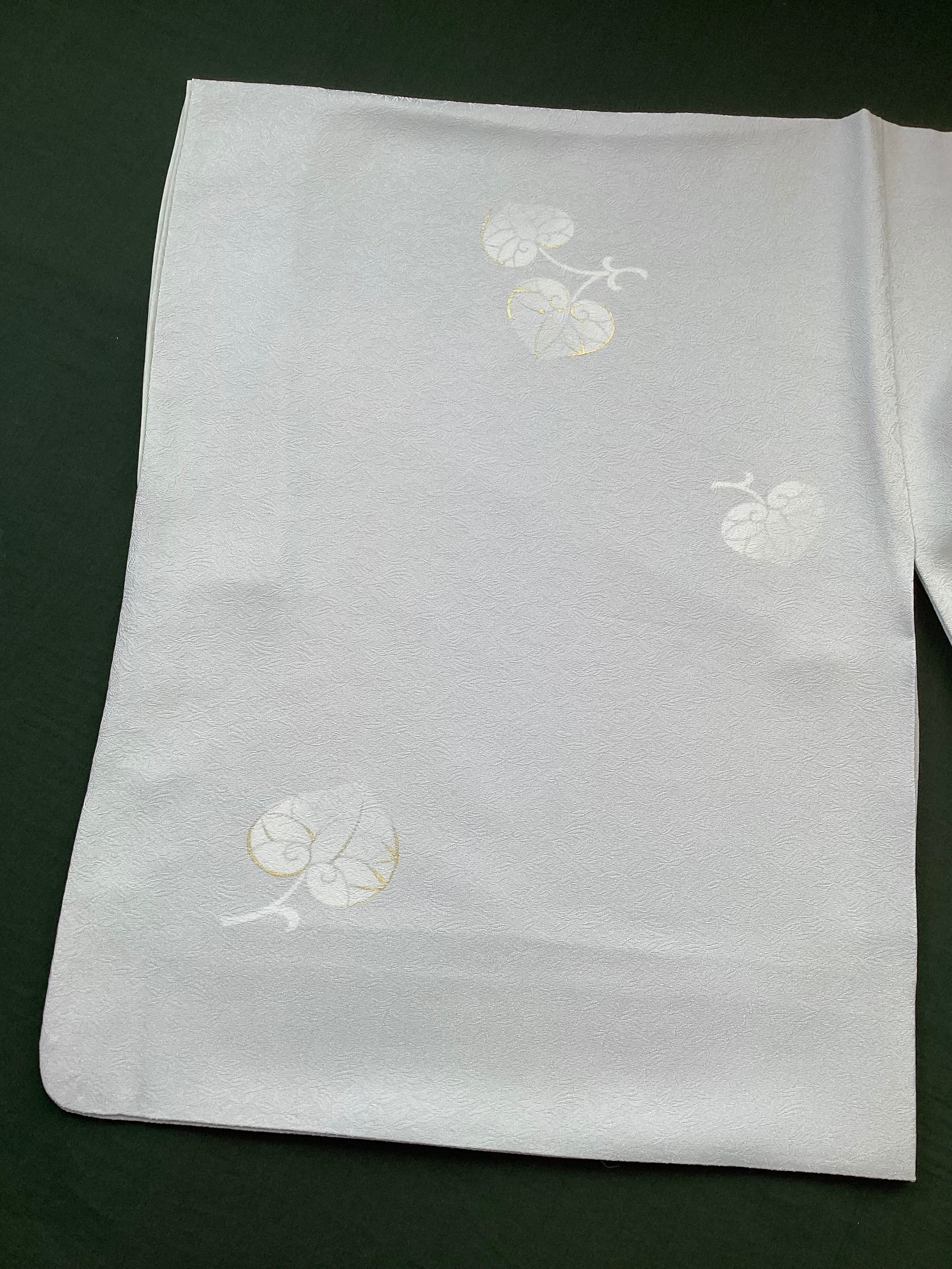 灰みがかった薄い水色に葵文様が飛び柄に配された小紋きものです。ベースの水色地には細かい笹の地紋が織られており、艶やかな光沢感がございます。古典的な葵の文様が白く、ところどころに金彩が施されて描かれており、控えめで上品な印象です。帯選び次第できちんとしたお席にもご着用いただける飛び柄小紋は、大変重宝する一枚です。