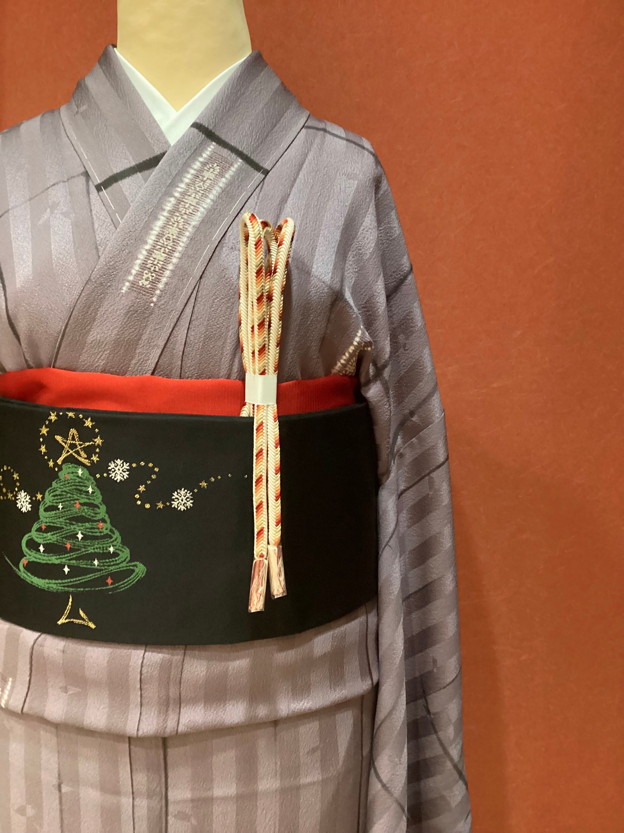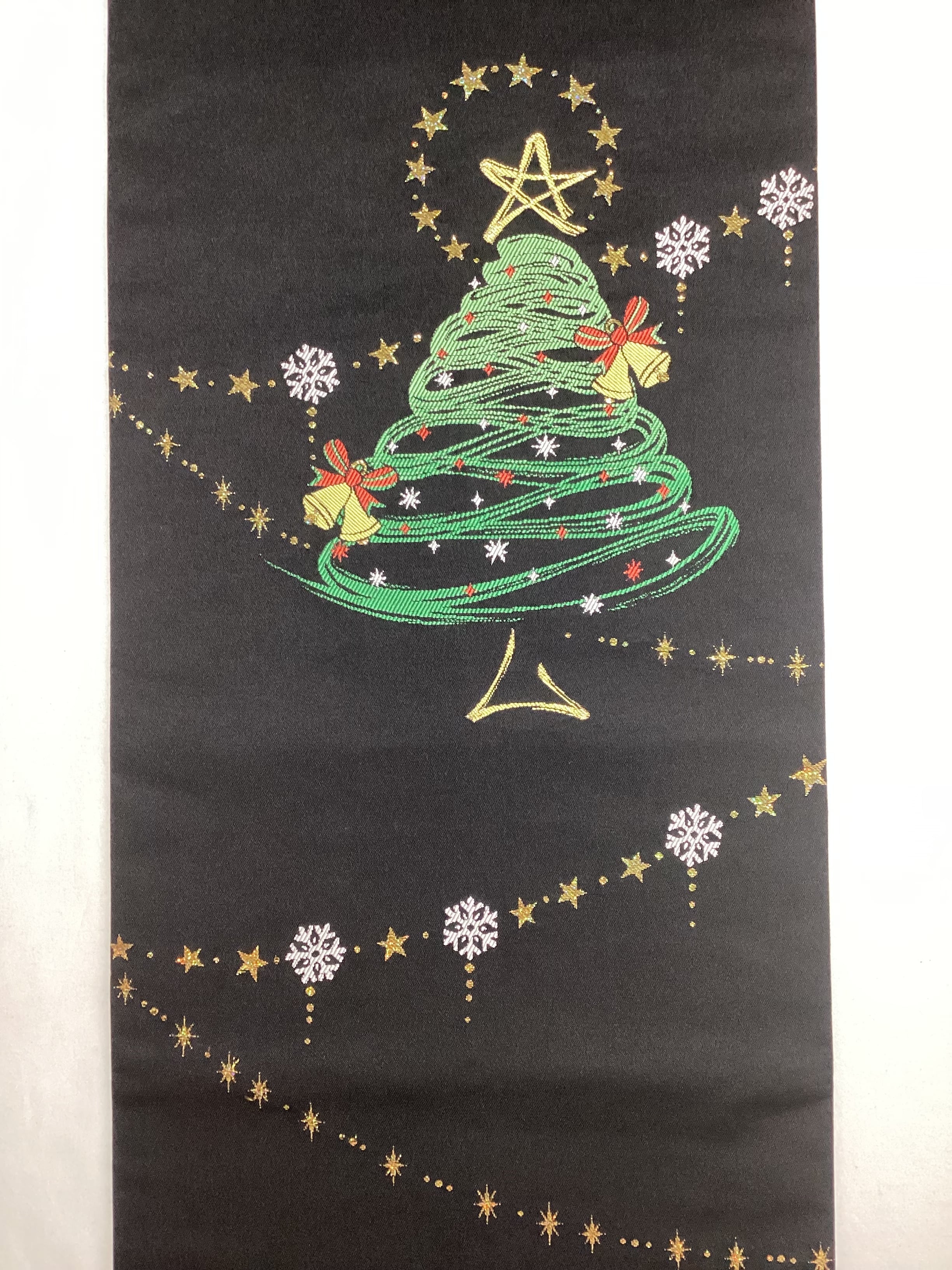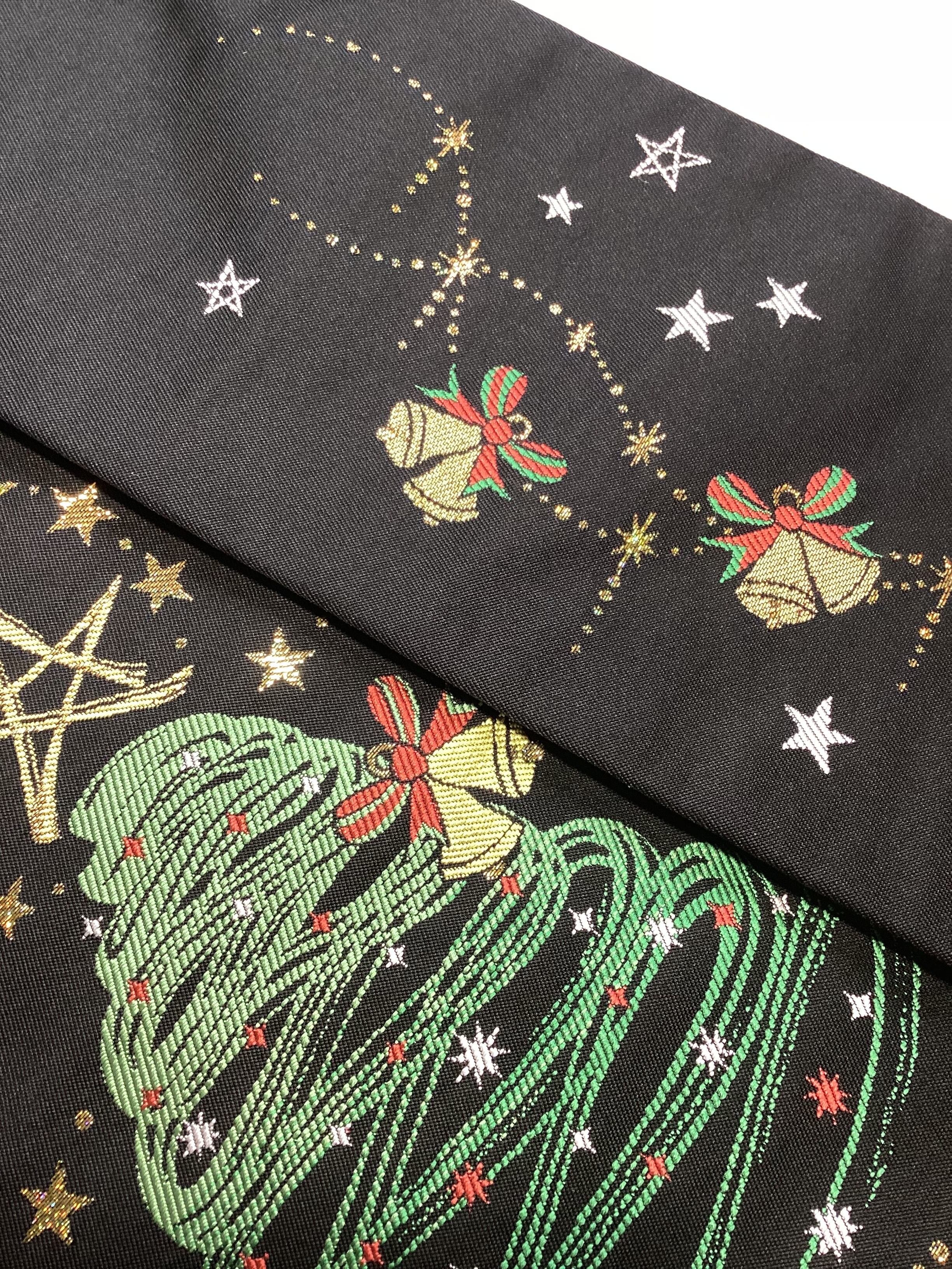 京都の【大光織物】の九寸なごや帯です。黒地にフリーハンドでくるくるっと描いたようなクリスマスツリーとベルの文様が楽しいクリスマスの雰囲気を醸し出しています。装う側も、見る側も思わずにっこりしてしまうような帯を締めて、季節のお洒落をお楽しみ下さいませ。クリスマスツリーとベルの2パターンの前柄をお楽しみいただけます。