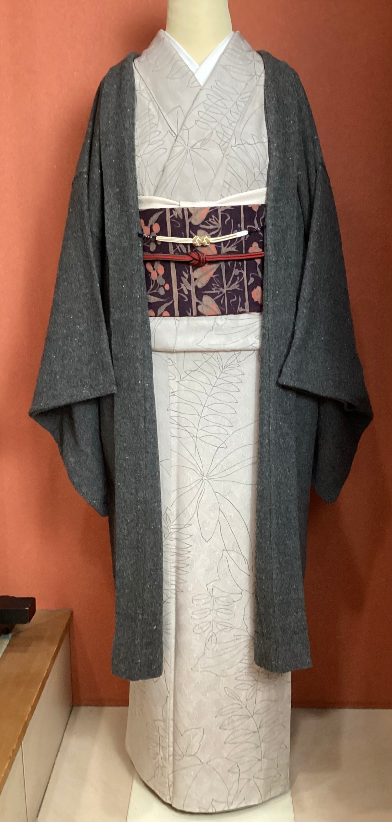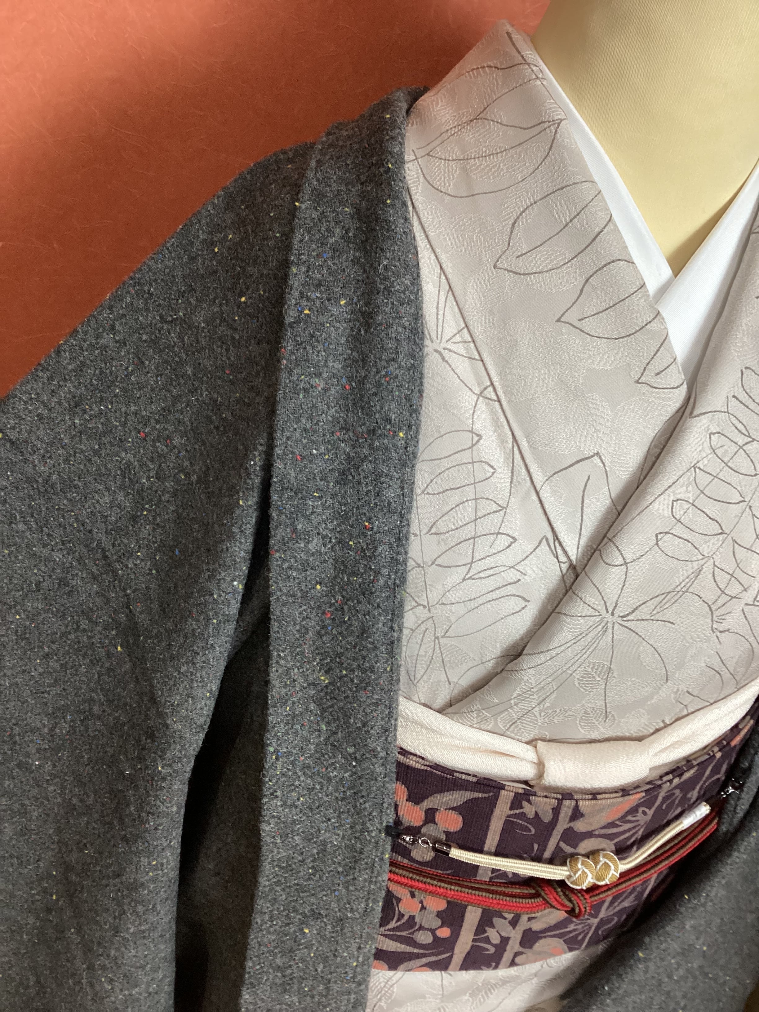 カラフルなネップの入ったポリエステルとウールの混ざったあたたかな生地を羽織に仕立てました。寒い冬の防寒用にコートを羽織る感覚で、着物の上に気軽に羽織っていただけ、冬の着物ライフを温かくお過ごしいただける便利な一枚でございます。