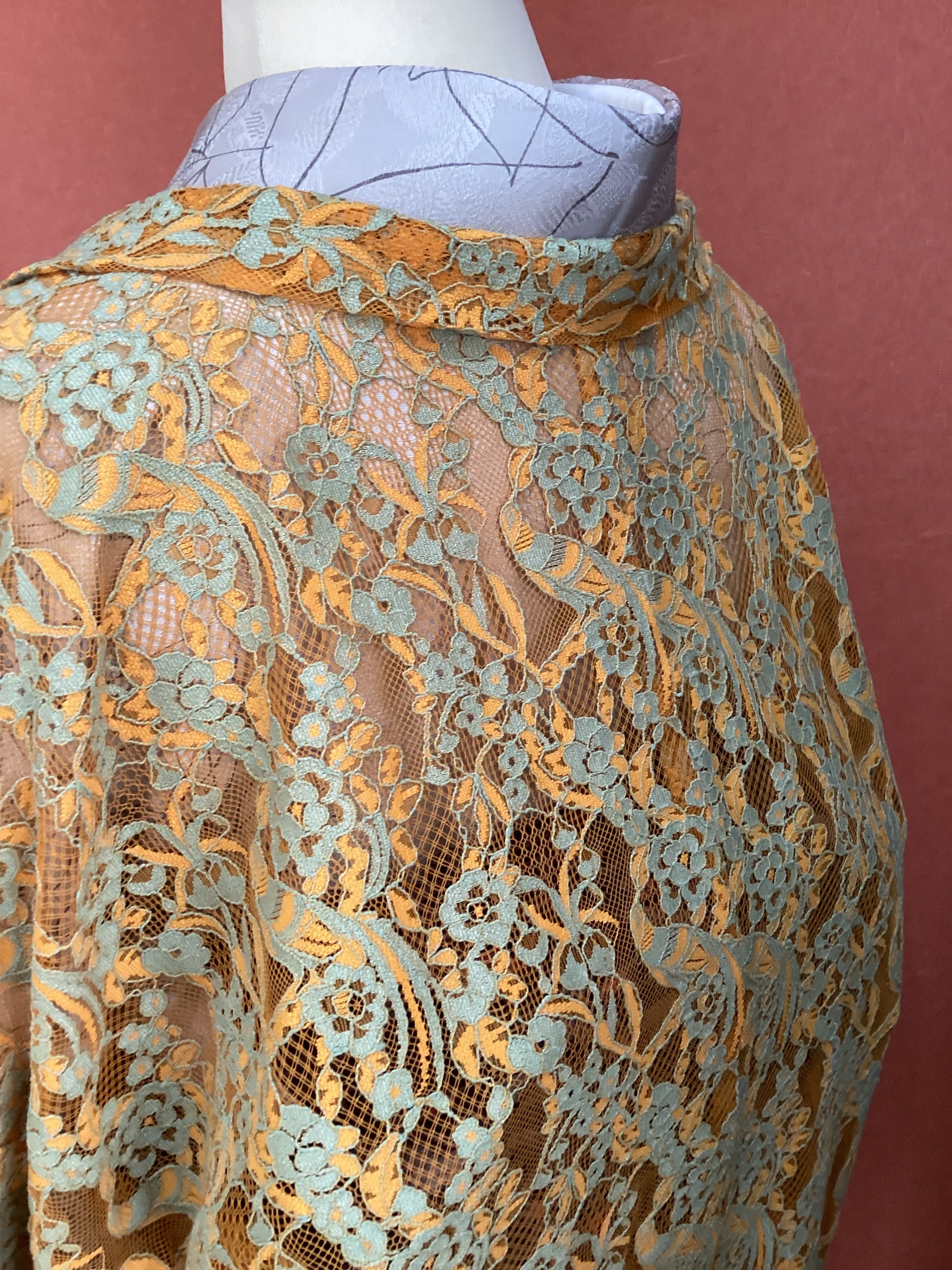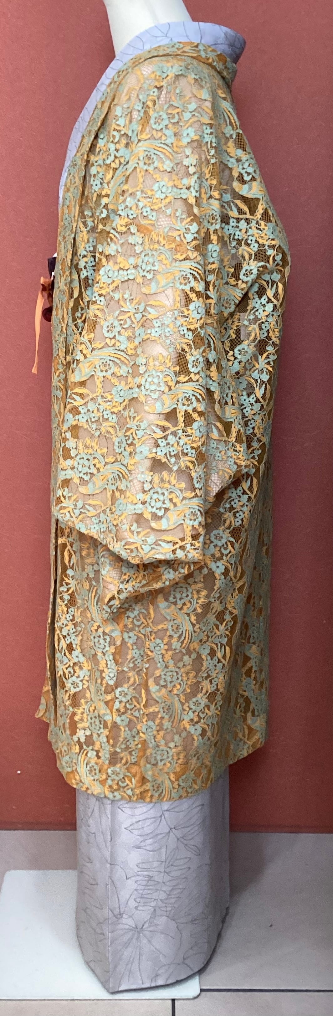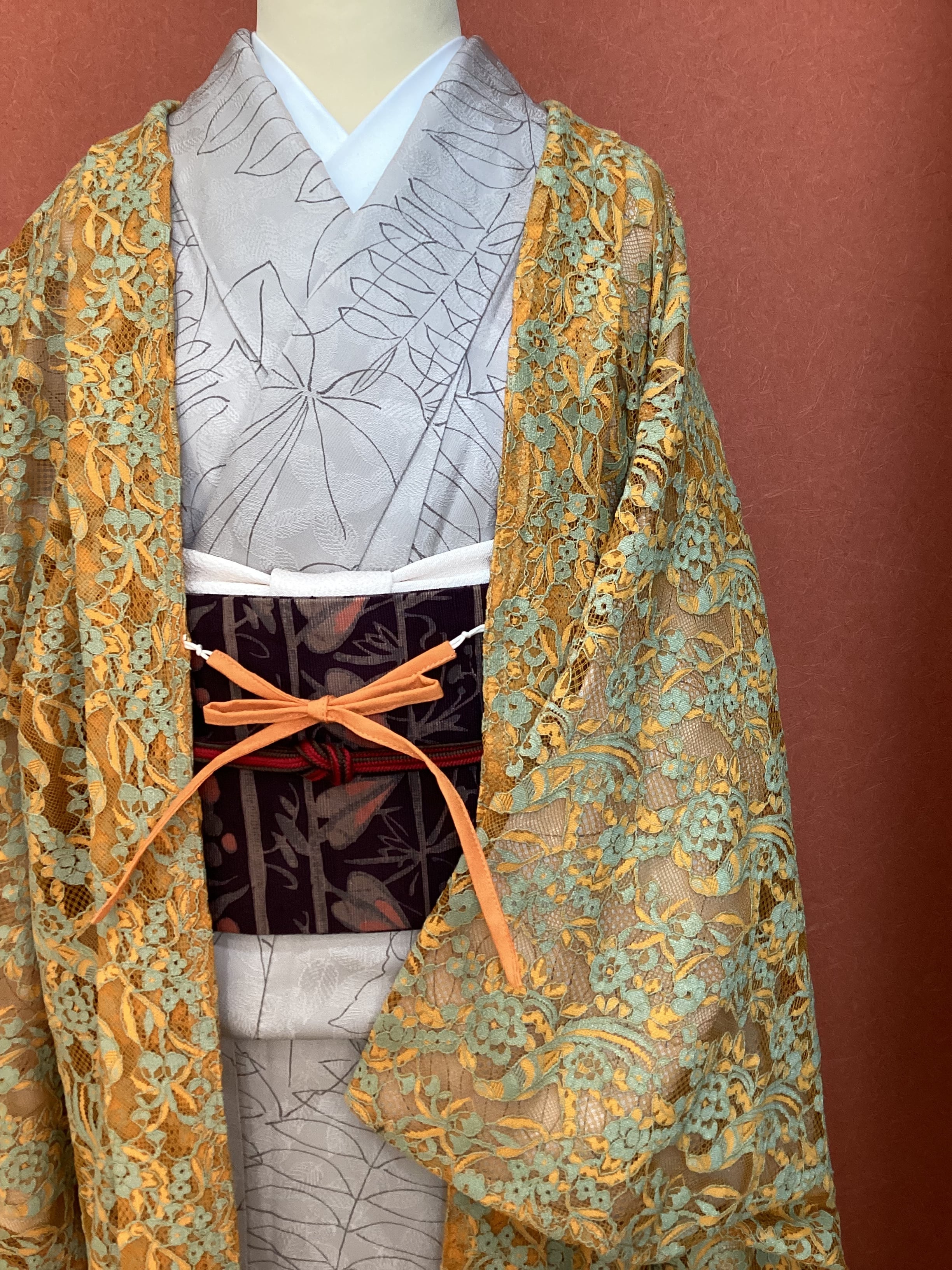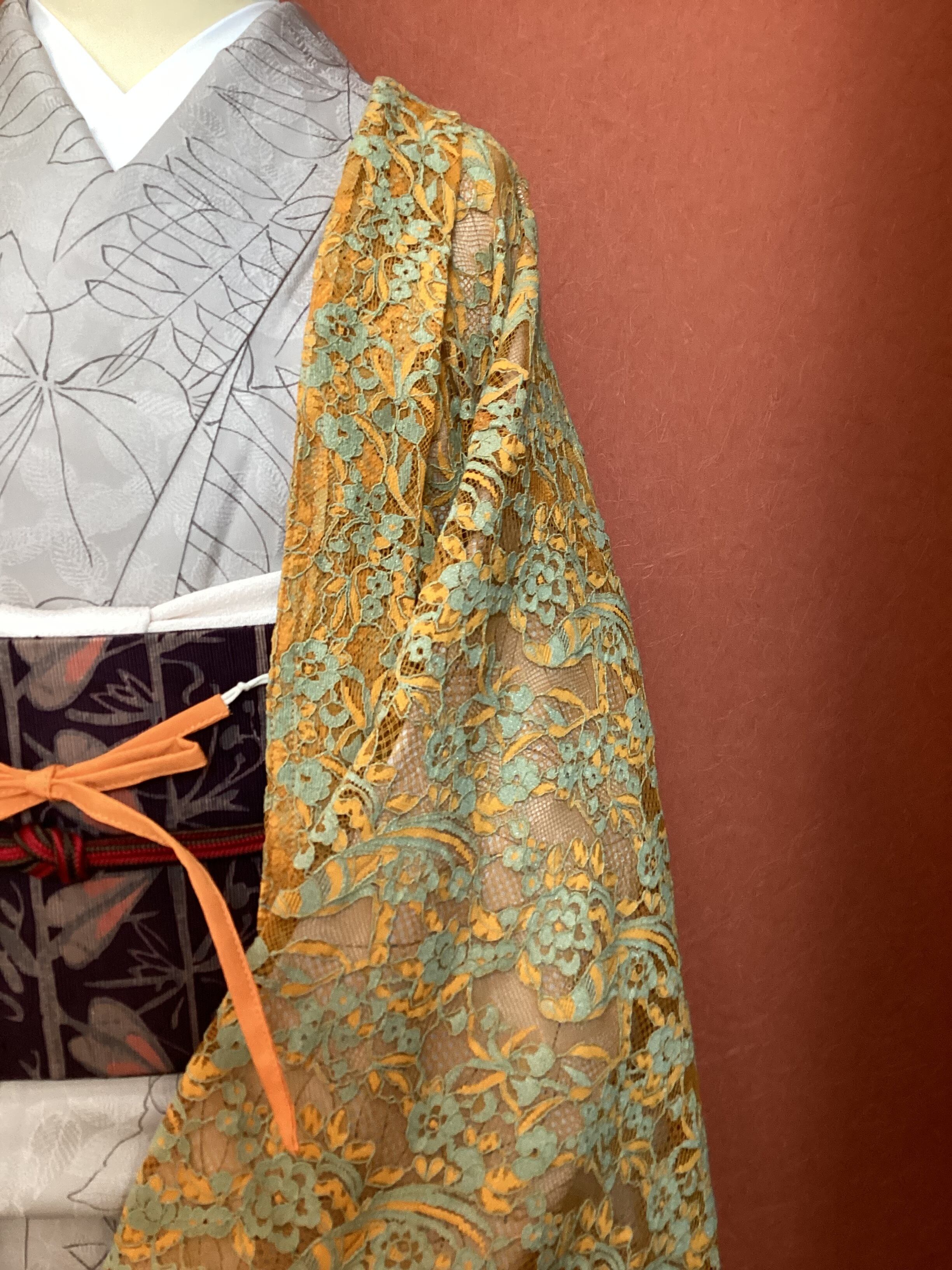 花モチーフのレース羽織です。軽くて皺にならず、気楽に羽織っていただけ、出先で不要になれば、簡単にまとめて鞄にしまえる大変重宝する一枚です。温暖化の昨今ではレース羽織の着用期間が長くなりました。お出掛けのお供にいかがでしょうか。