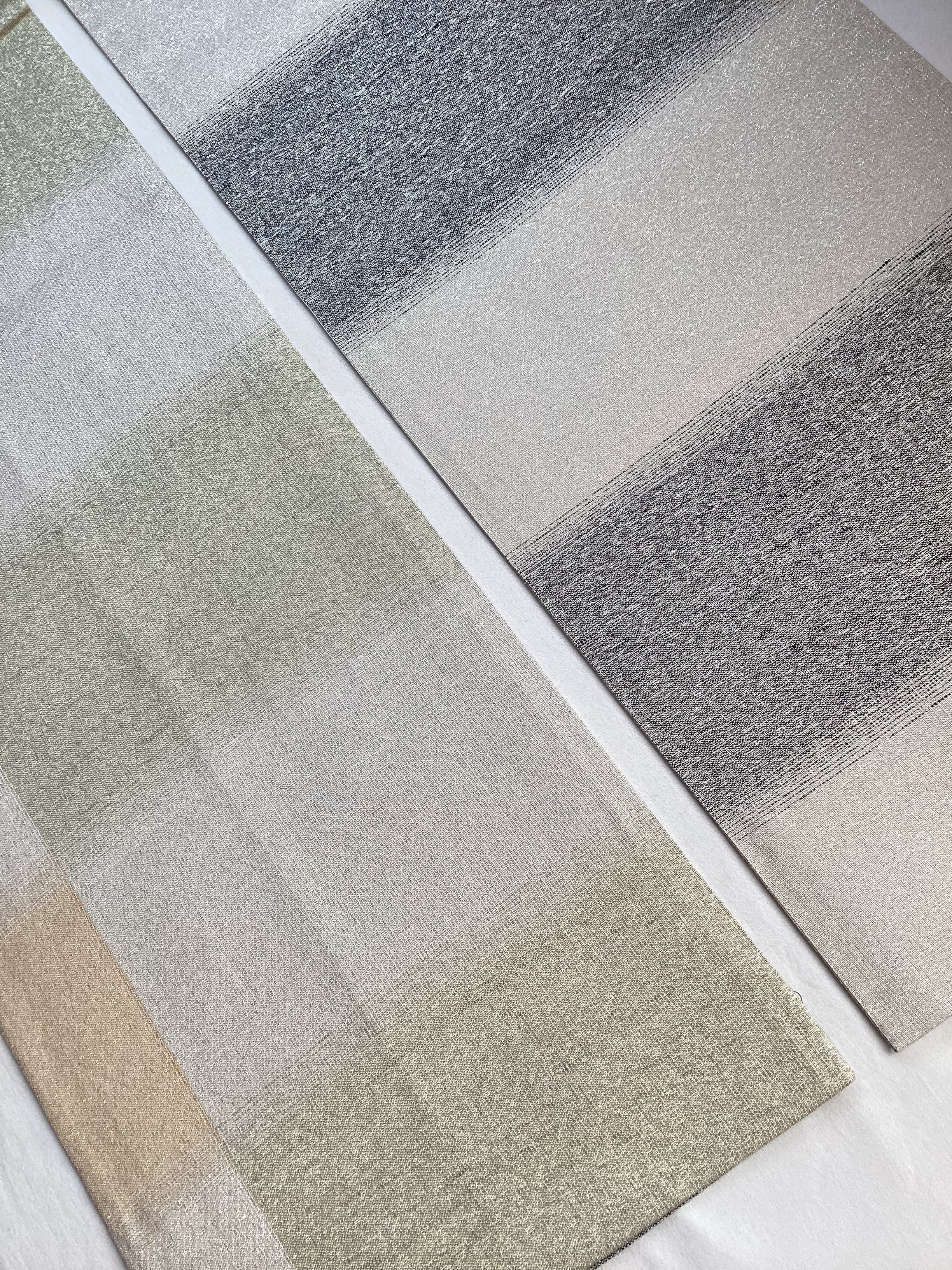 金銀糸が織り込まれた横段文用の全通の袋帯です。銘に【月光のしらべ】と名付けられているように、柔らかで幻想的なお月さまの光がさしたように、キラキラと静かに光ります。両面使い出来るので、コーディネートの巾が広く、派手になり過ぎず、きものにさりげなく馴染んで、控えめな華やかさを添えてくれる袋帯です。軽くて柔らかな生地感です。