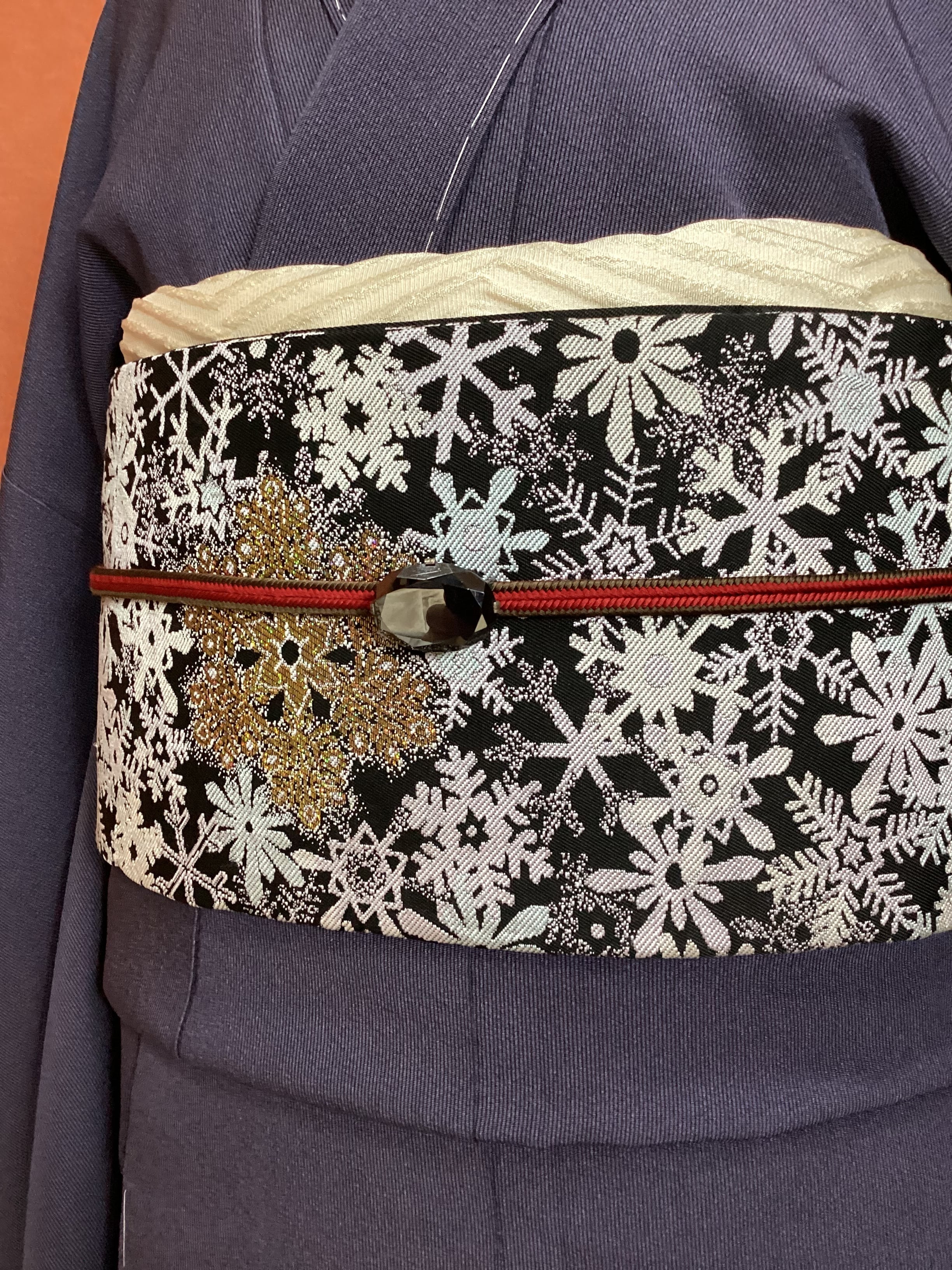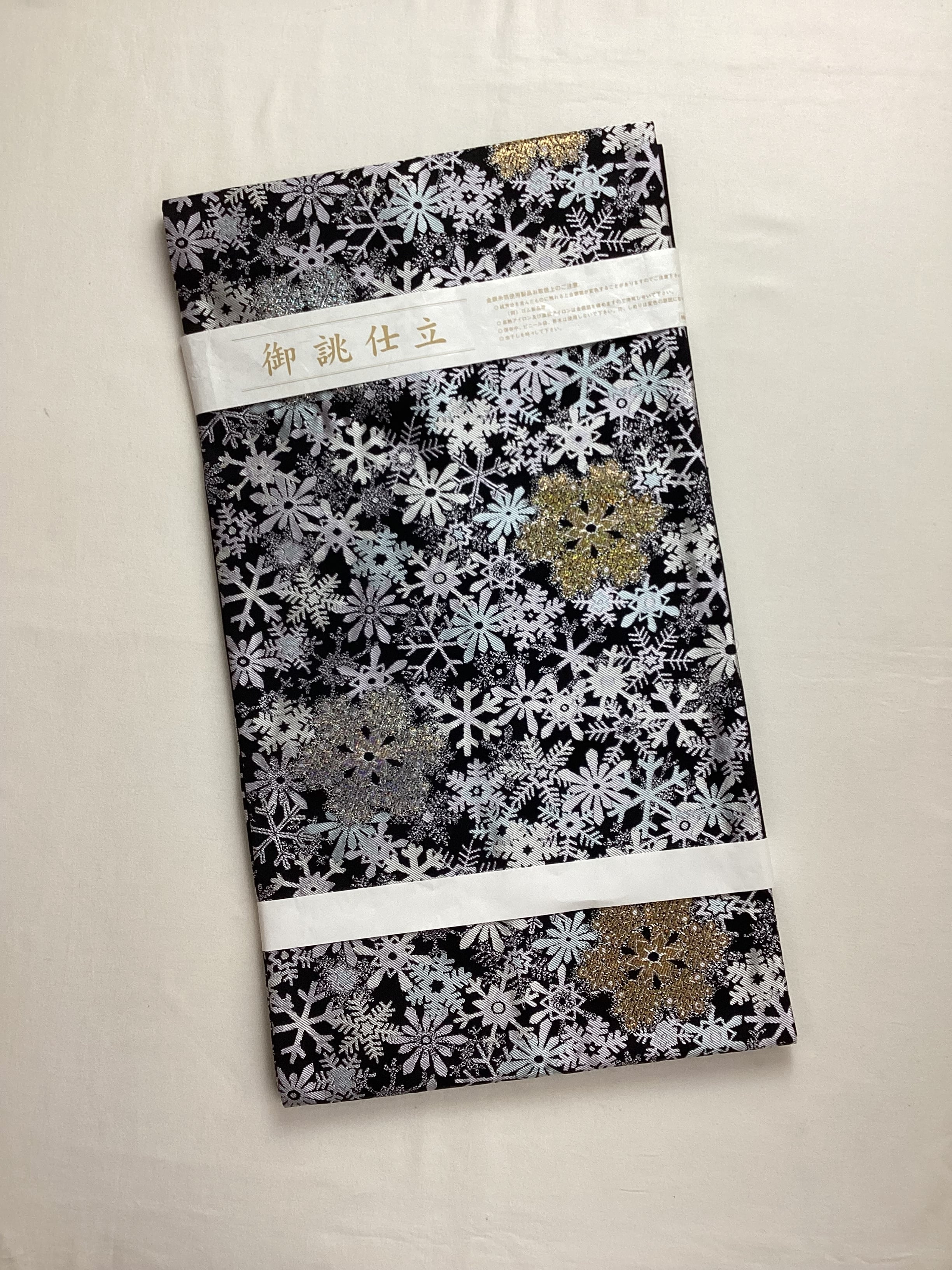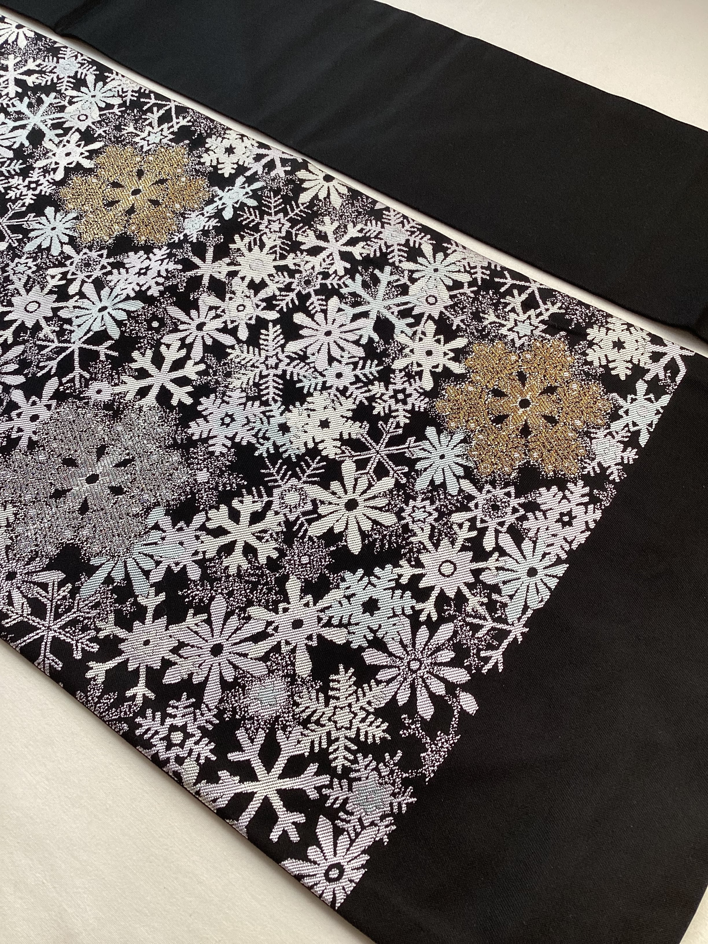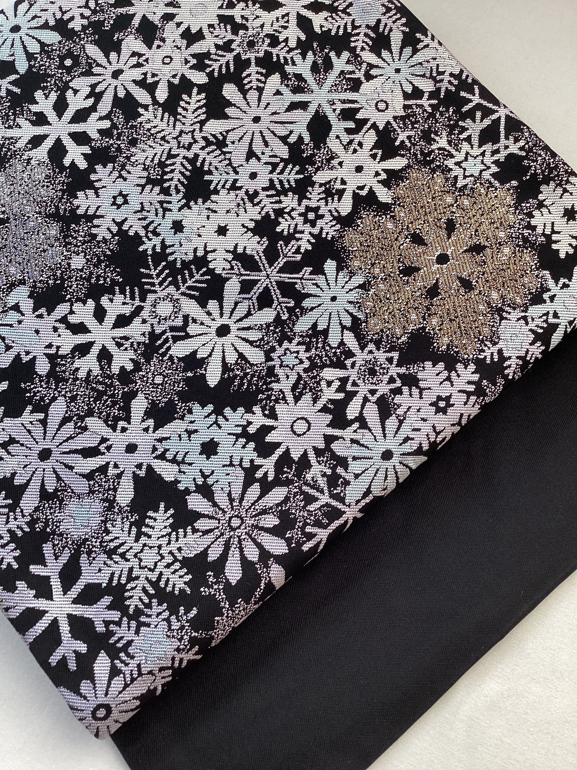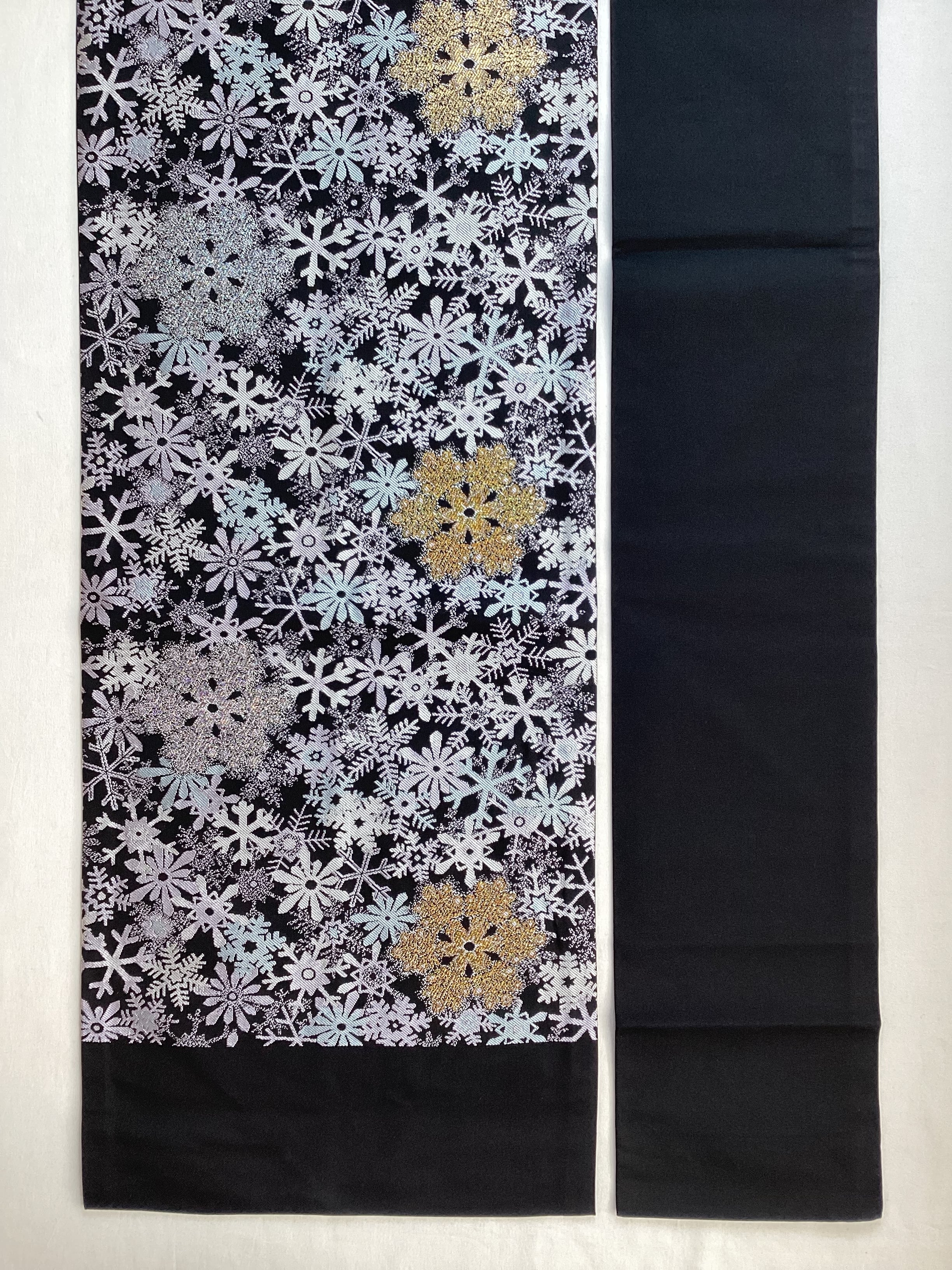 ハラハラと夜に舞う雪の結晶文様の西陣【大光織物】のなごや帯です。金や銀のキラキラした雪の結晶が重なり合い宝石のように輝いています。冬のモチーフをコーディネートに取り入れて楽しみませんか?巻き方を関東巻き(反時計回り)に巻くと金色、関西巻き(時計回り)に巻くと銀色の雪の結晶が前柄に現れます。また、タレが無地なので、スッキリとした印象です。