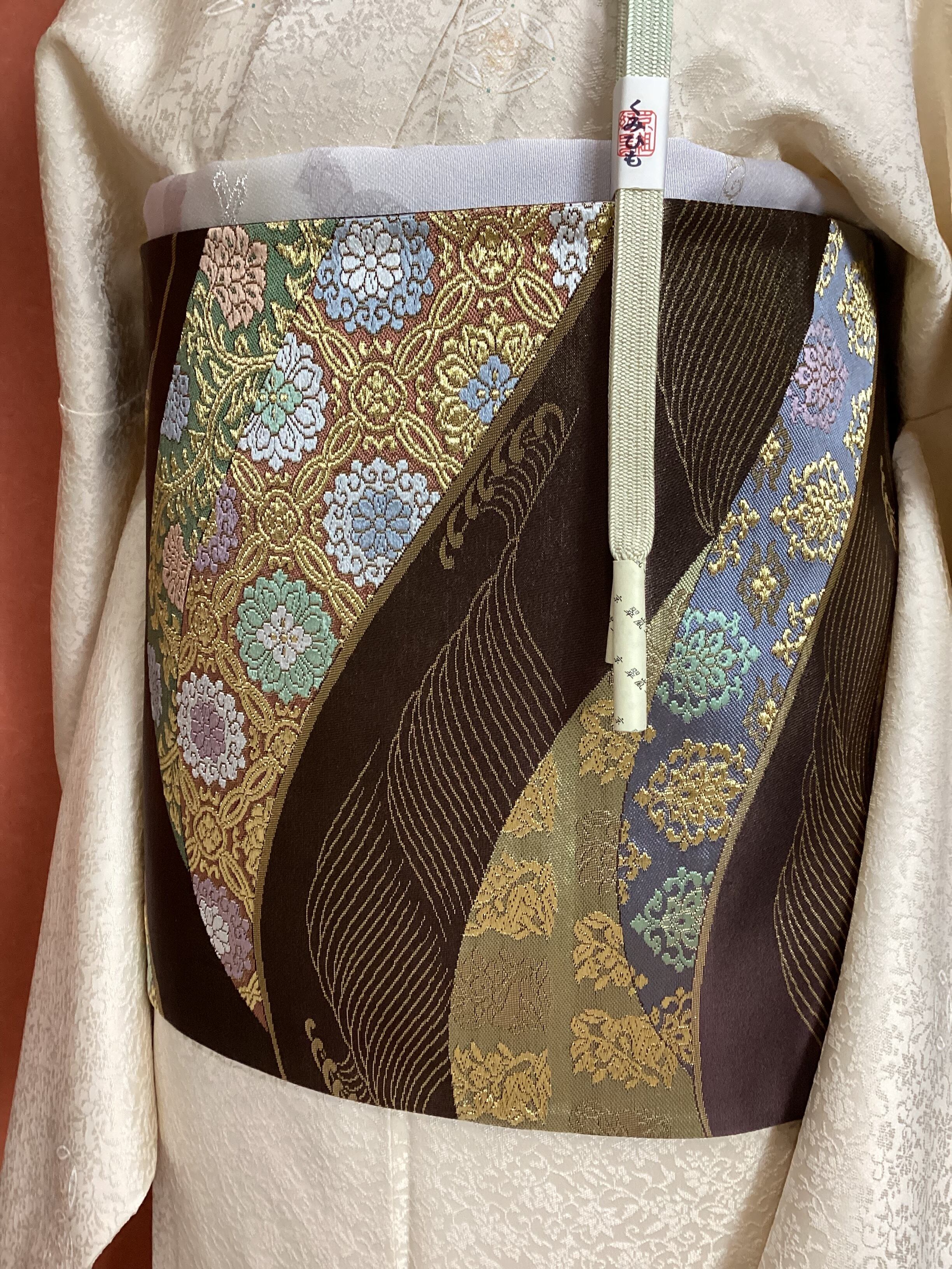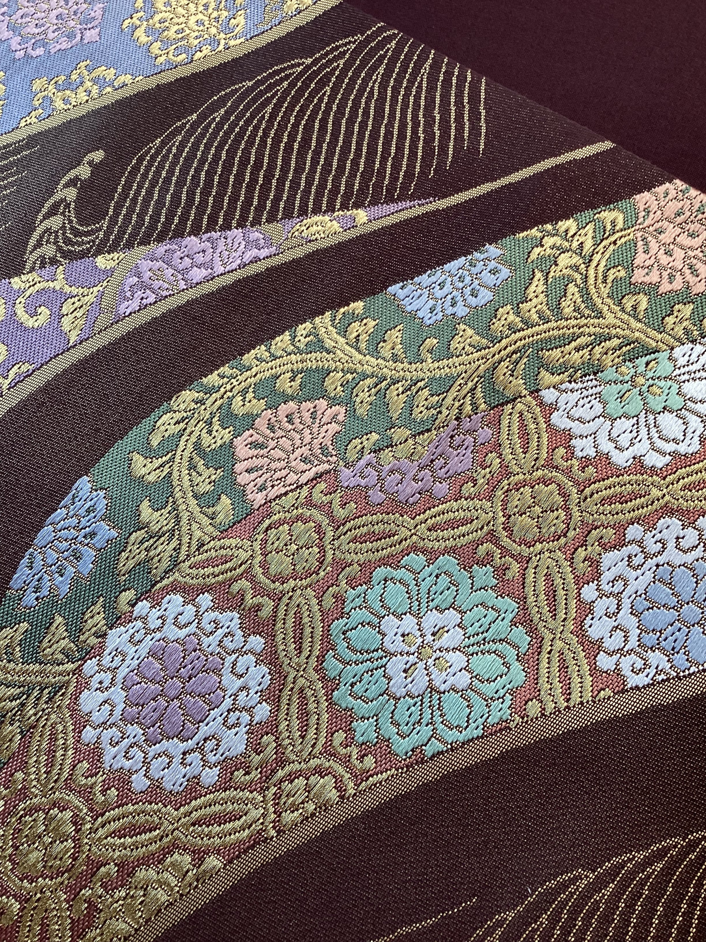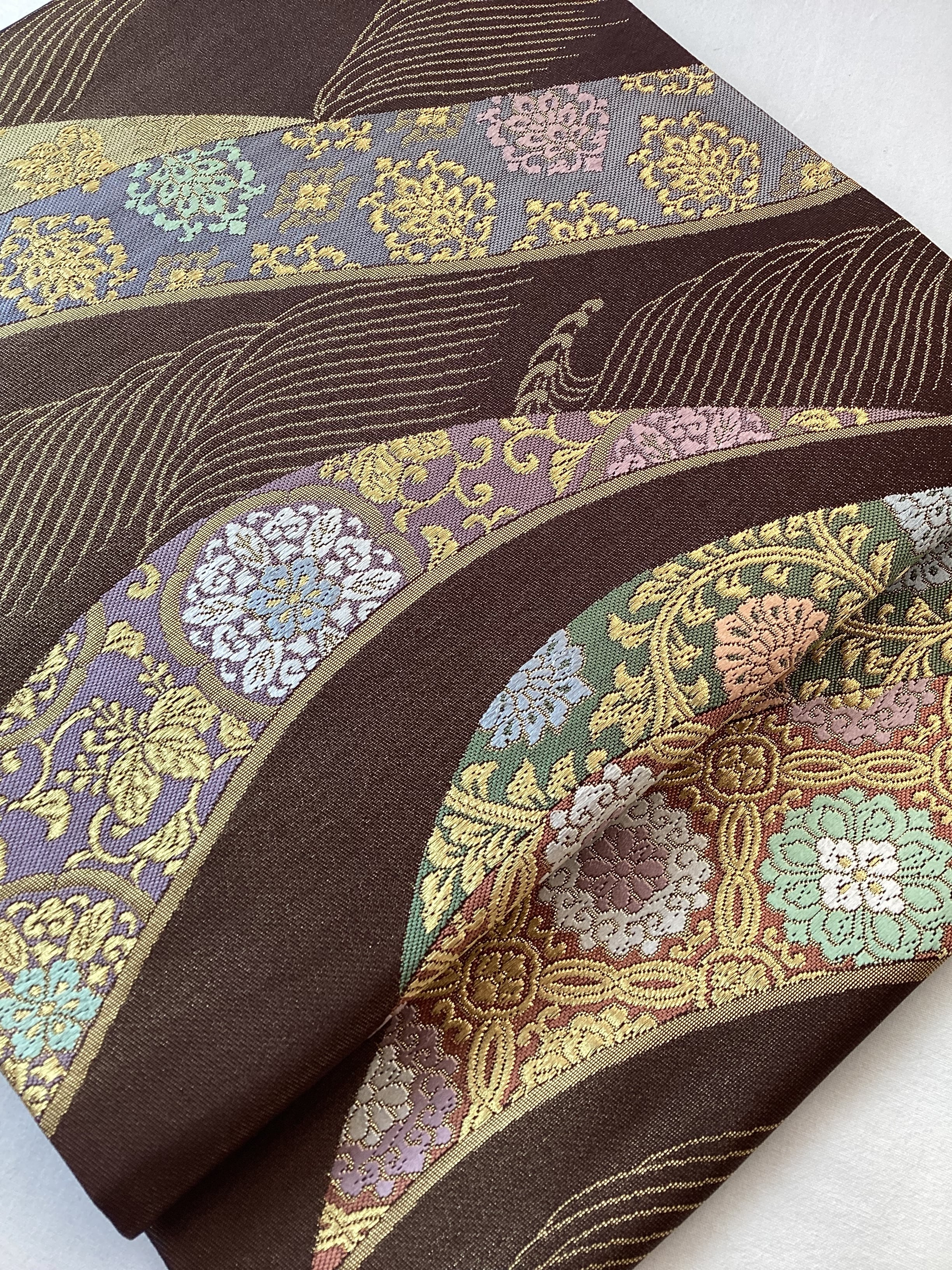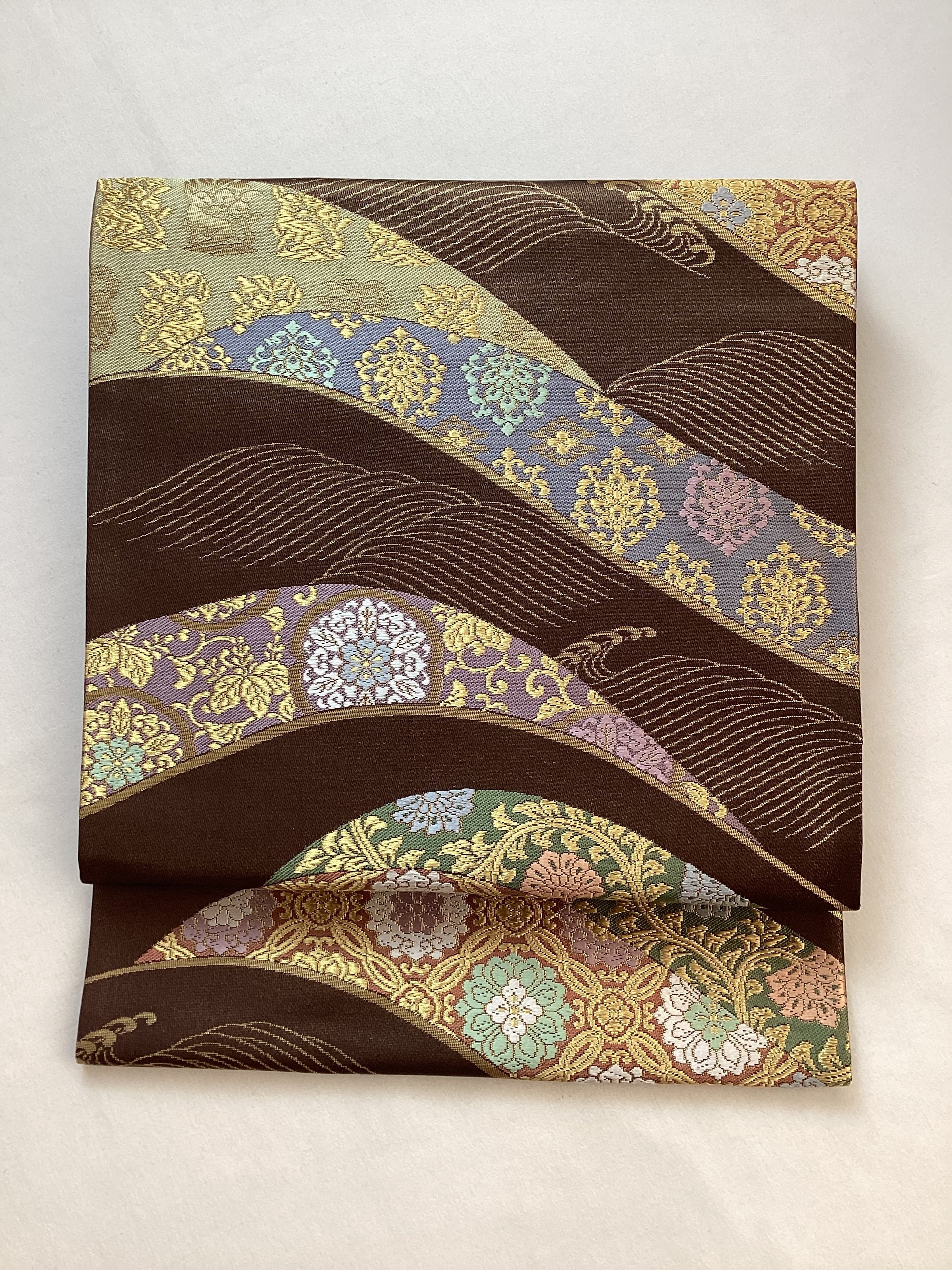 濃色(ダークパープル)地に金糸使いで山並の緩やかな曲線と波文様が繊細なラインで織り込まれております。優しいお色目の色糸を用いて蜀江や華、花兎などの格調高い織文様で埋め尽くされており、落ち着いた上品さのある袋帯です。お茶席やフォーマルシーンにいかがでしょうか。