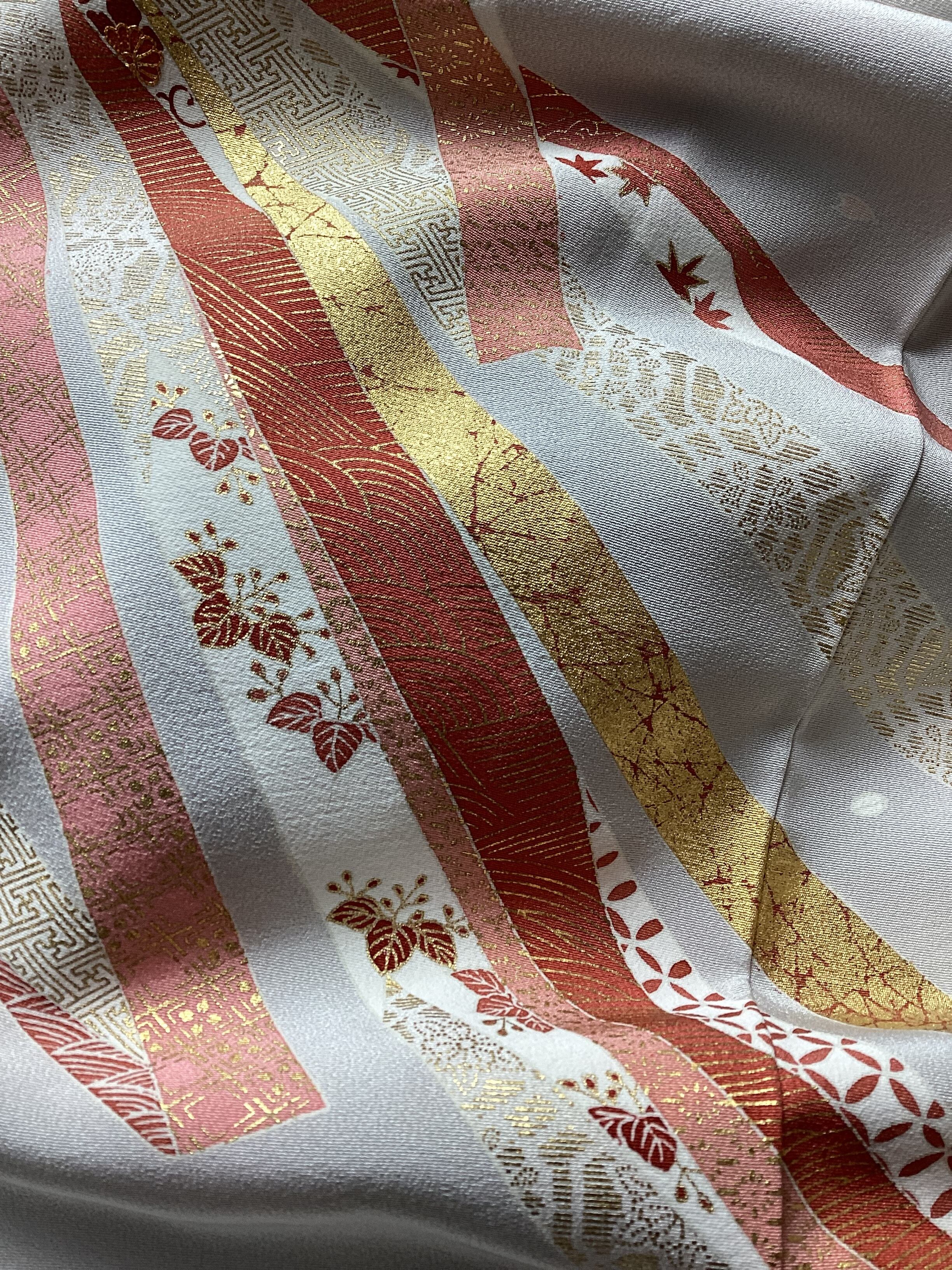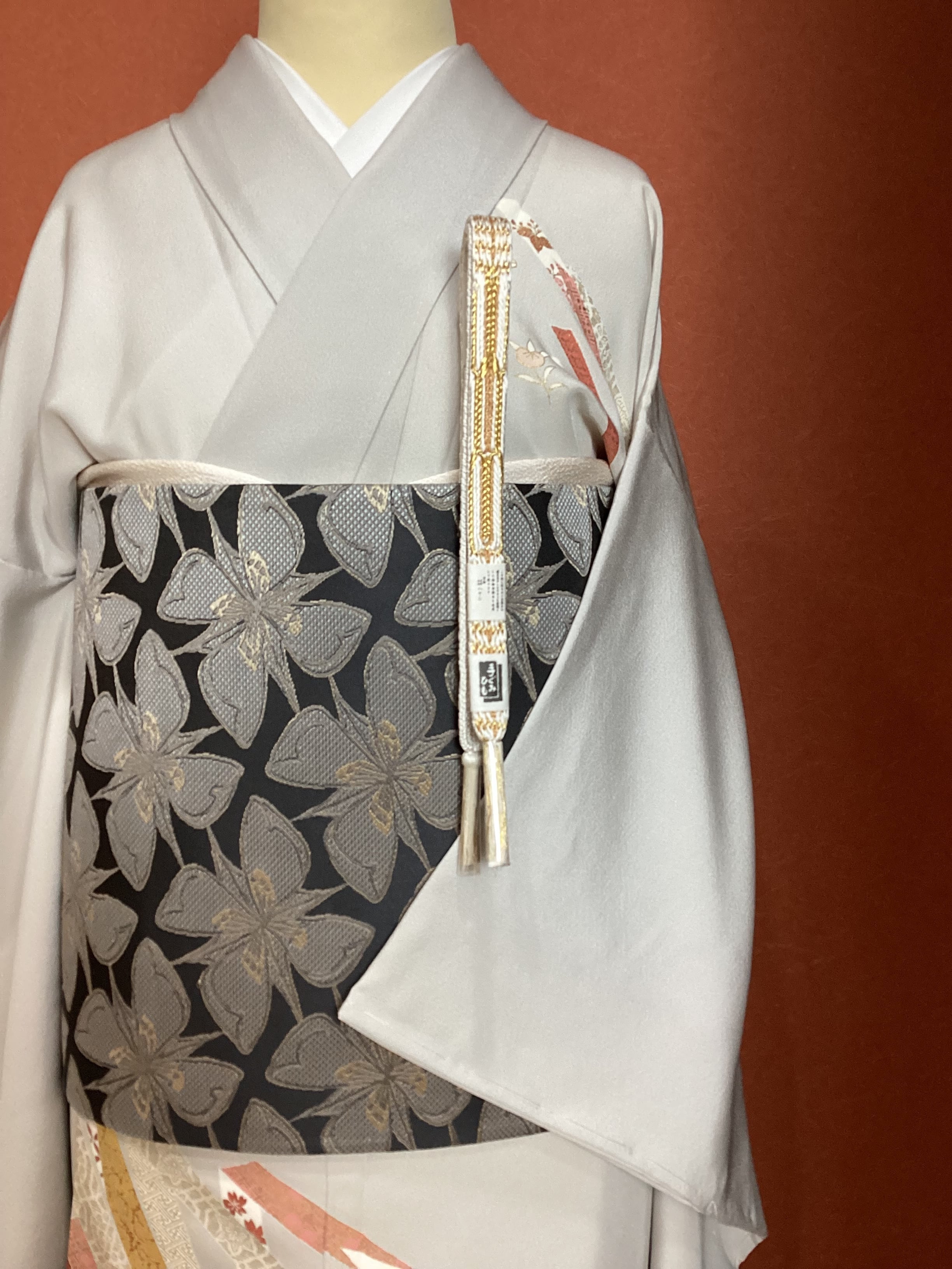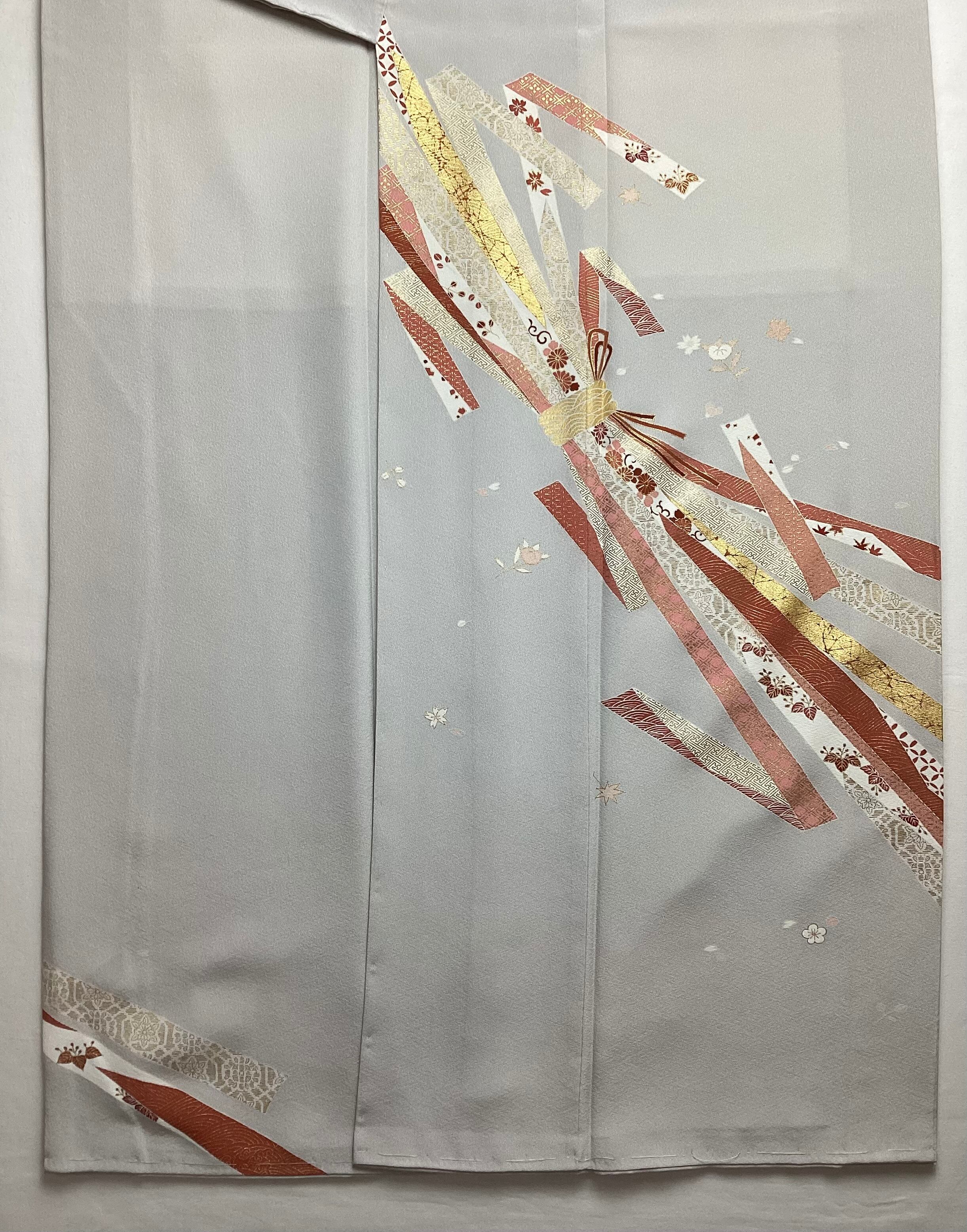 薄いグレー地に束ね熨斗文様の訪問着です。古典柄の正統派、吉祥文様に込められた願いや祝賀の気持ち、そして伝統美を纏う大人のフォーマルきものです。控え目な柄付けなので、大袈裟になり過ぎず、しっとりとシンプルに大切な日を彩ってくれます。