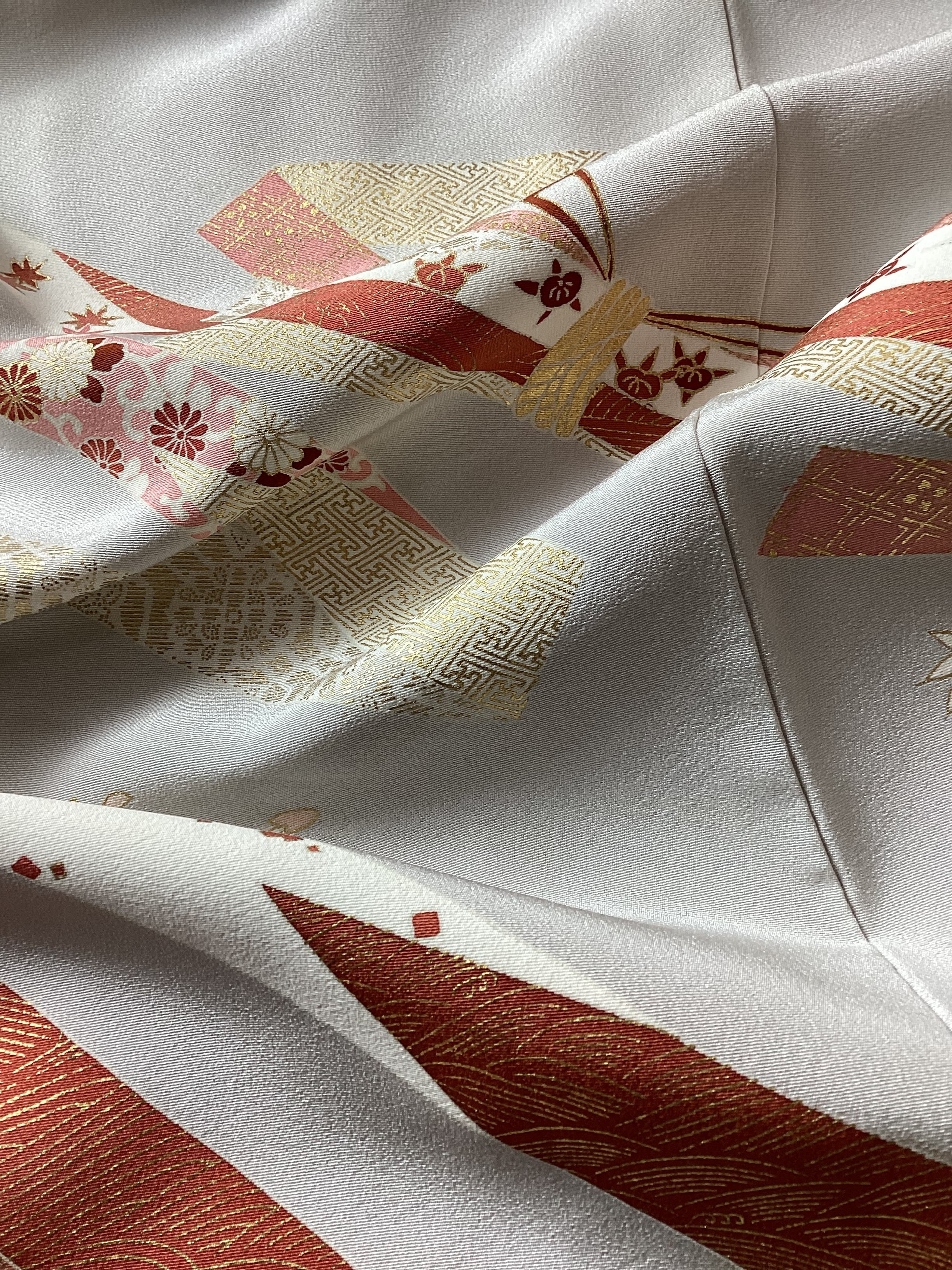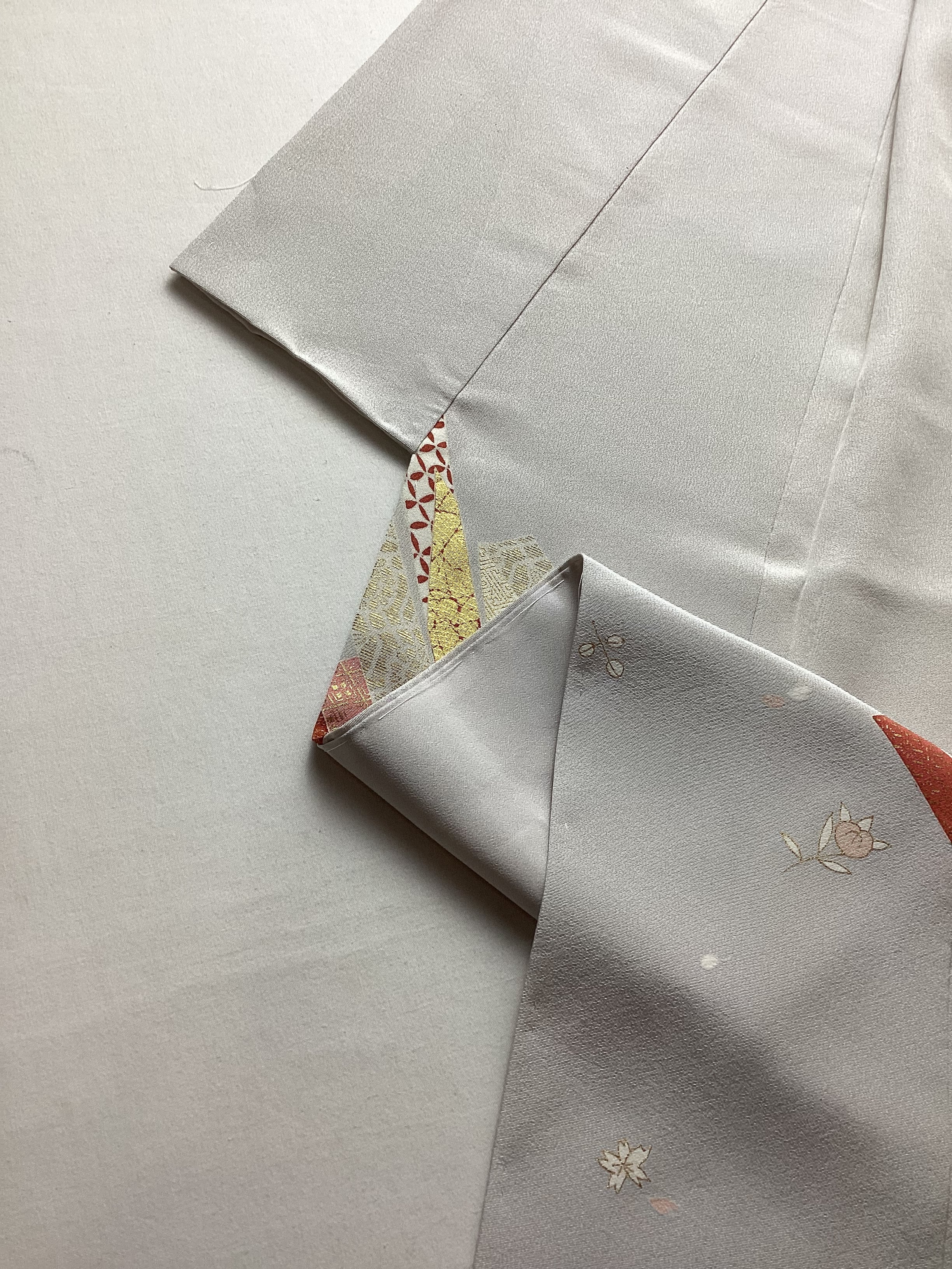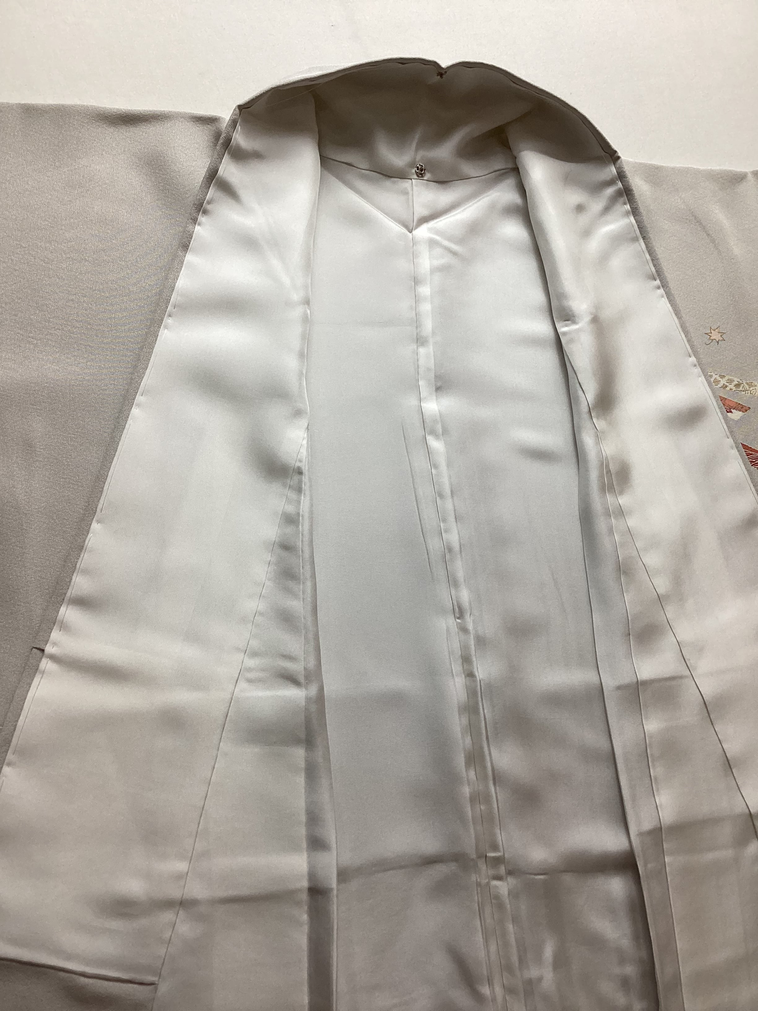 薄いグレー地に束ね熨斗文様の訪問着です。古典柄の正統派、吉祥文様に込められた願いや祝賀の気持ち、そして伝統美を纏う大人のフォーマルきものです。控え目な柄付けなので、大袈裟になり過ぎず、しっとりとシンプルに大切な日を彩ってくれます。