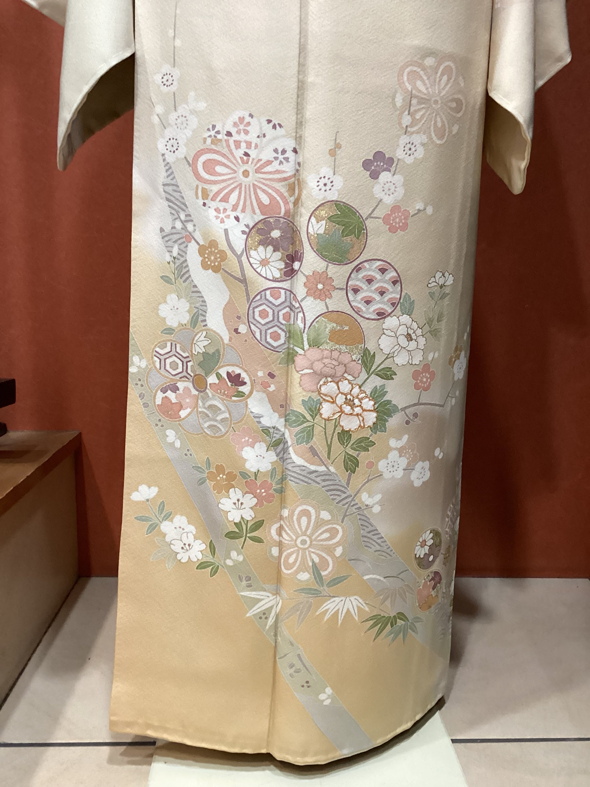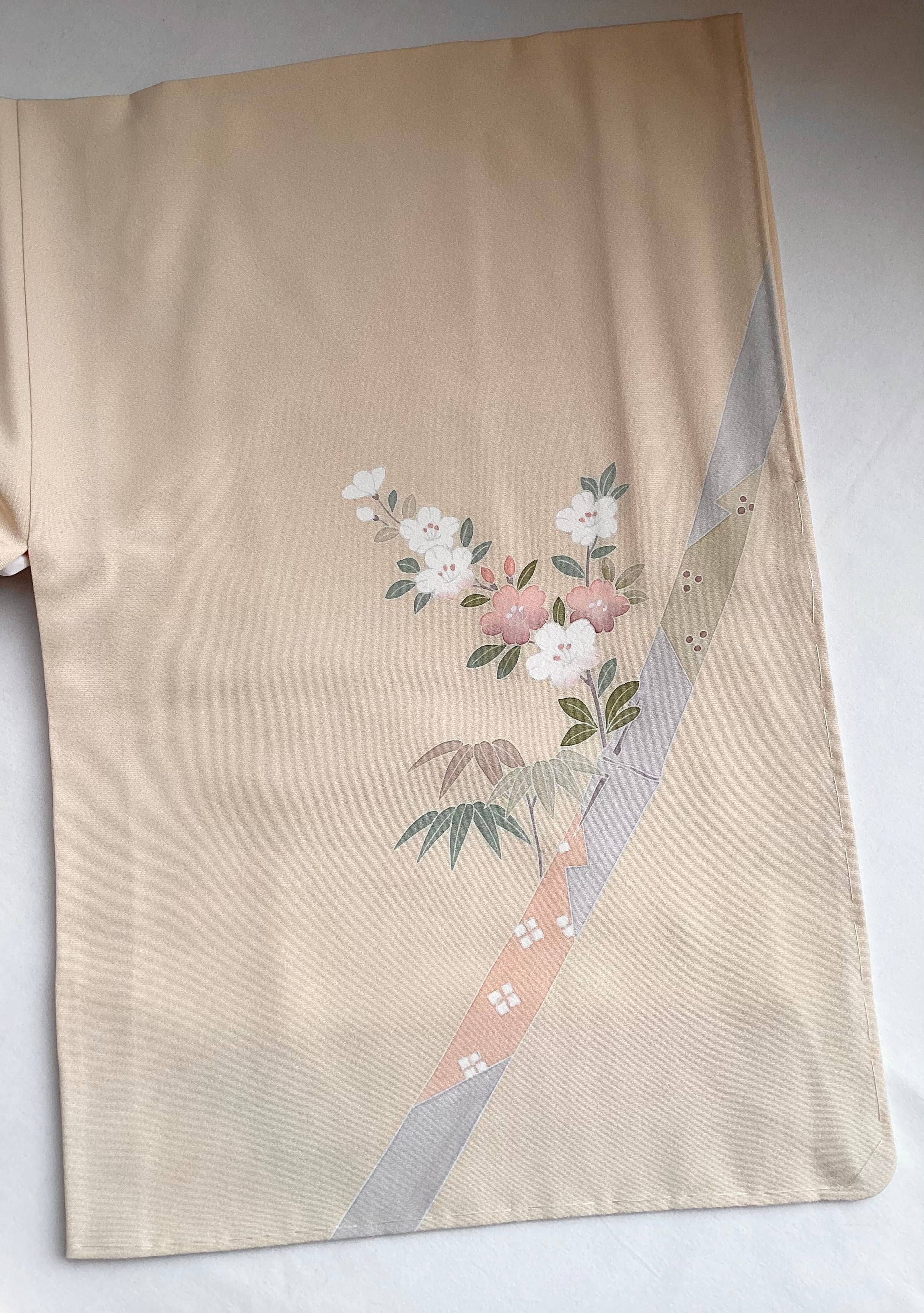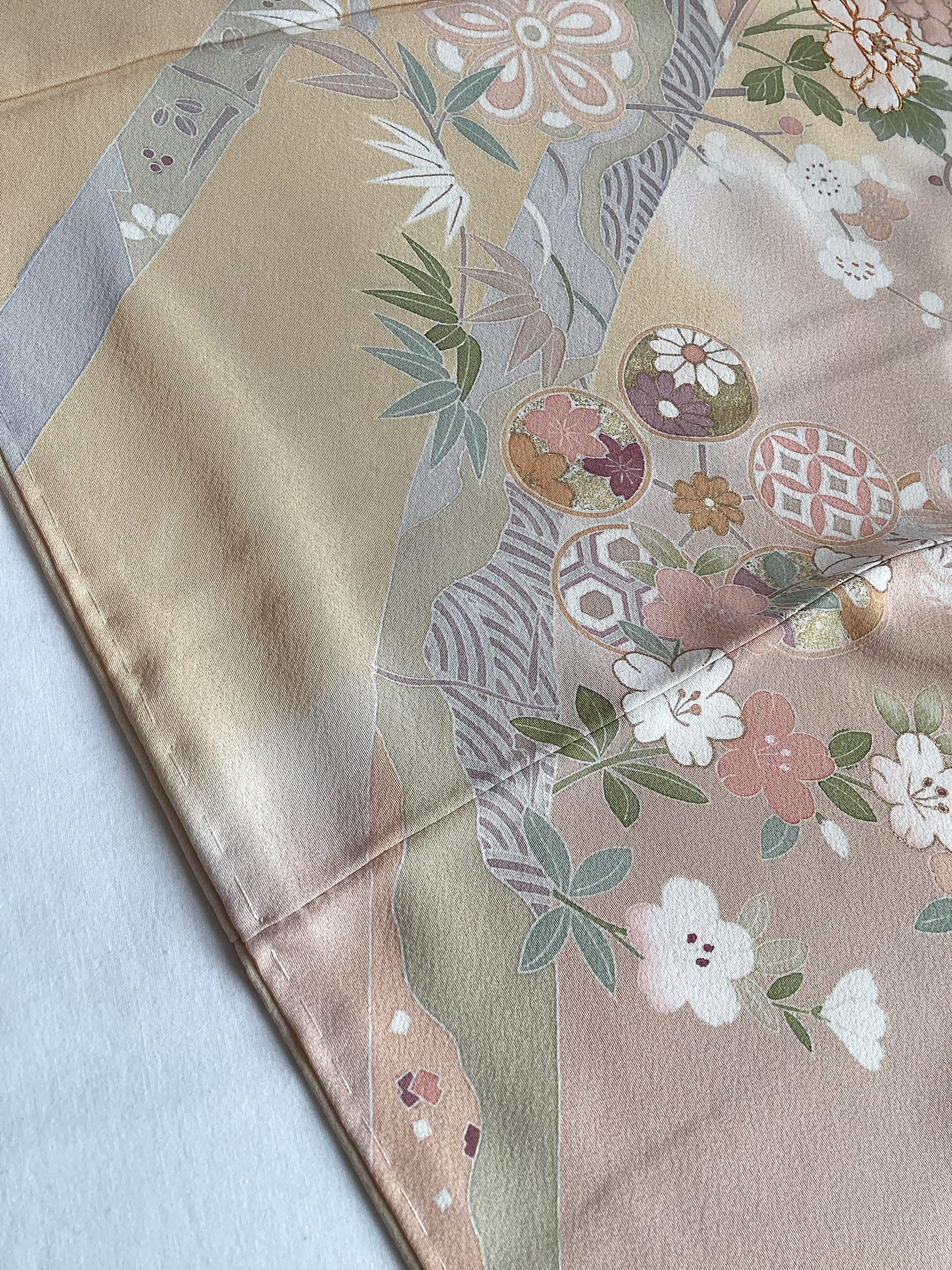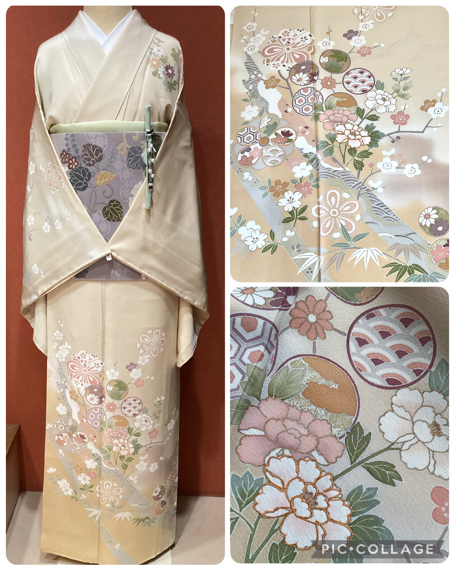 大きく雪輪文様の暈しの入った柔らかなクリーム色地に伸びやかな竹を配置し、梅、牡丹、躑躅、菊などの四季花が描かれています。控えめに配された金駒刺繍に竹や花の文様の中にさりげなく吉祥柄を盛り込んだ意匠が現代的で落ち着いた華やかさを感じます。