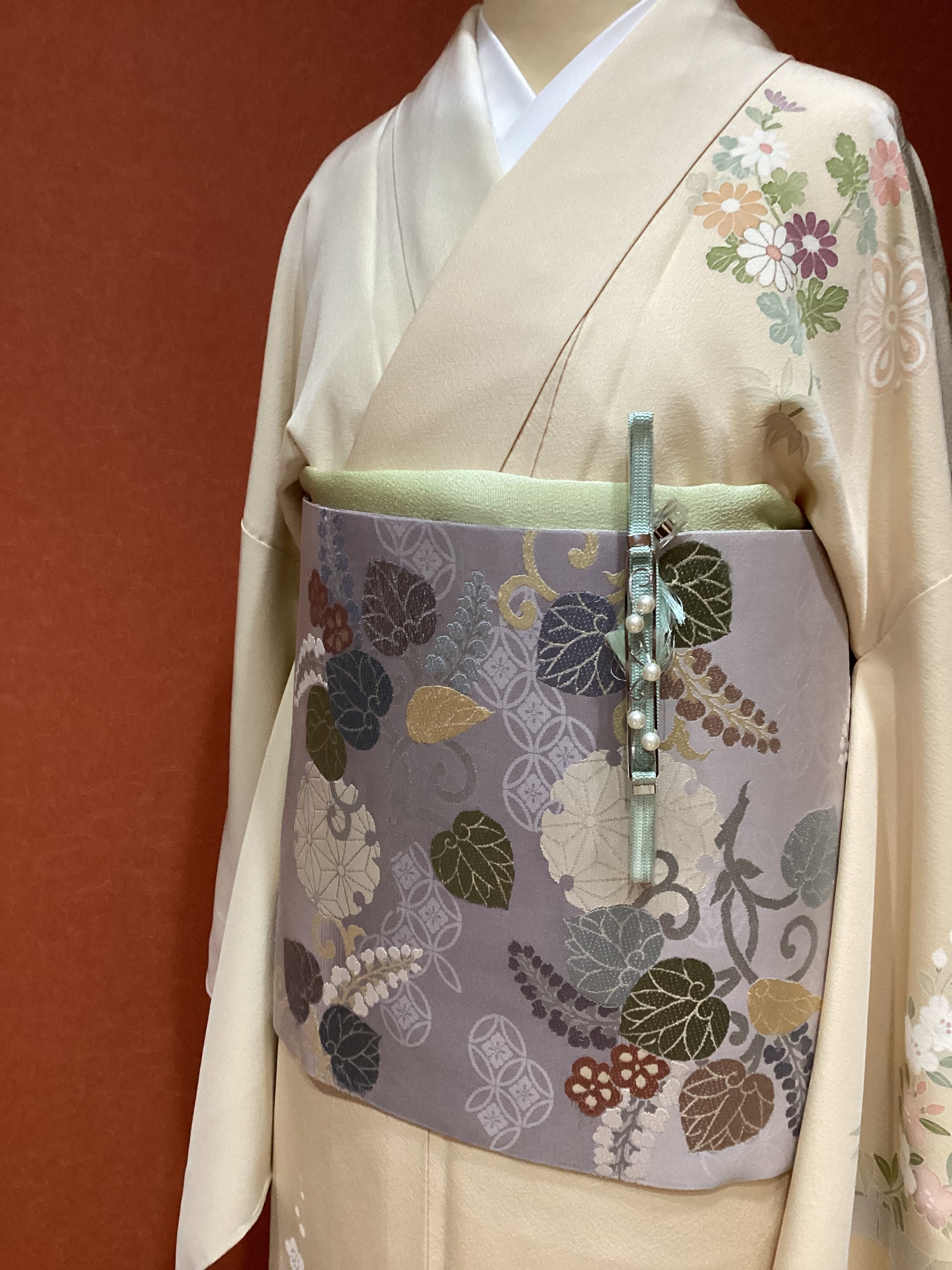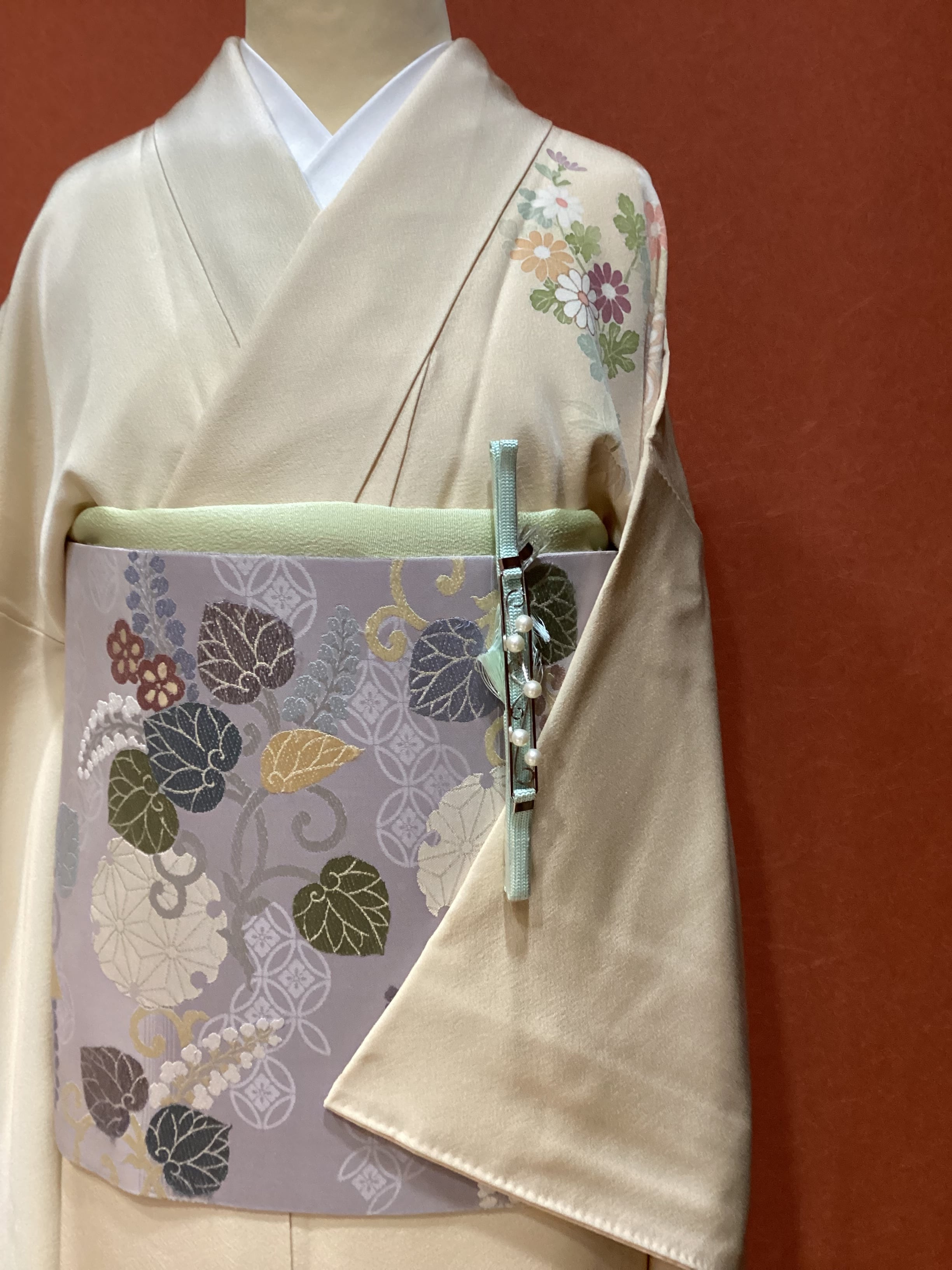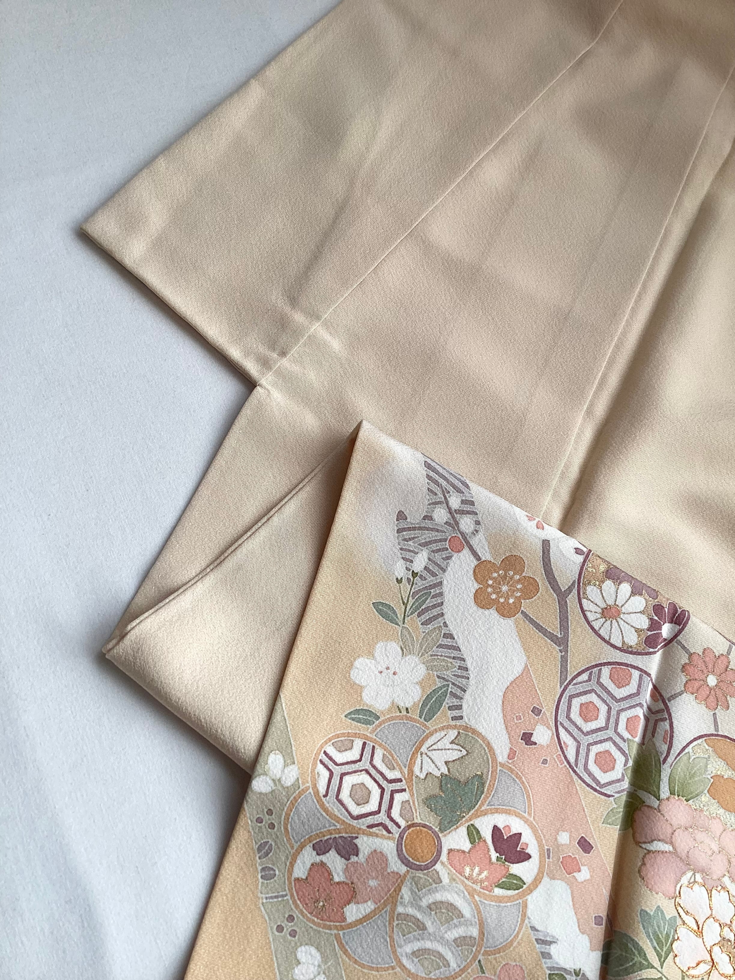 大きく雪輪文様の暈しの入った柔らかなクリーム色地に伸びやかな竹を配置し、梅、牡丹、躑躅、菊などの四季花が描かれています。控えめに配された金駒刺繍に竹や花の文様の中にさりげなく吉祥柄を盛り込んだ意匠が現代的で落ち着いた華やかさを感じます。