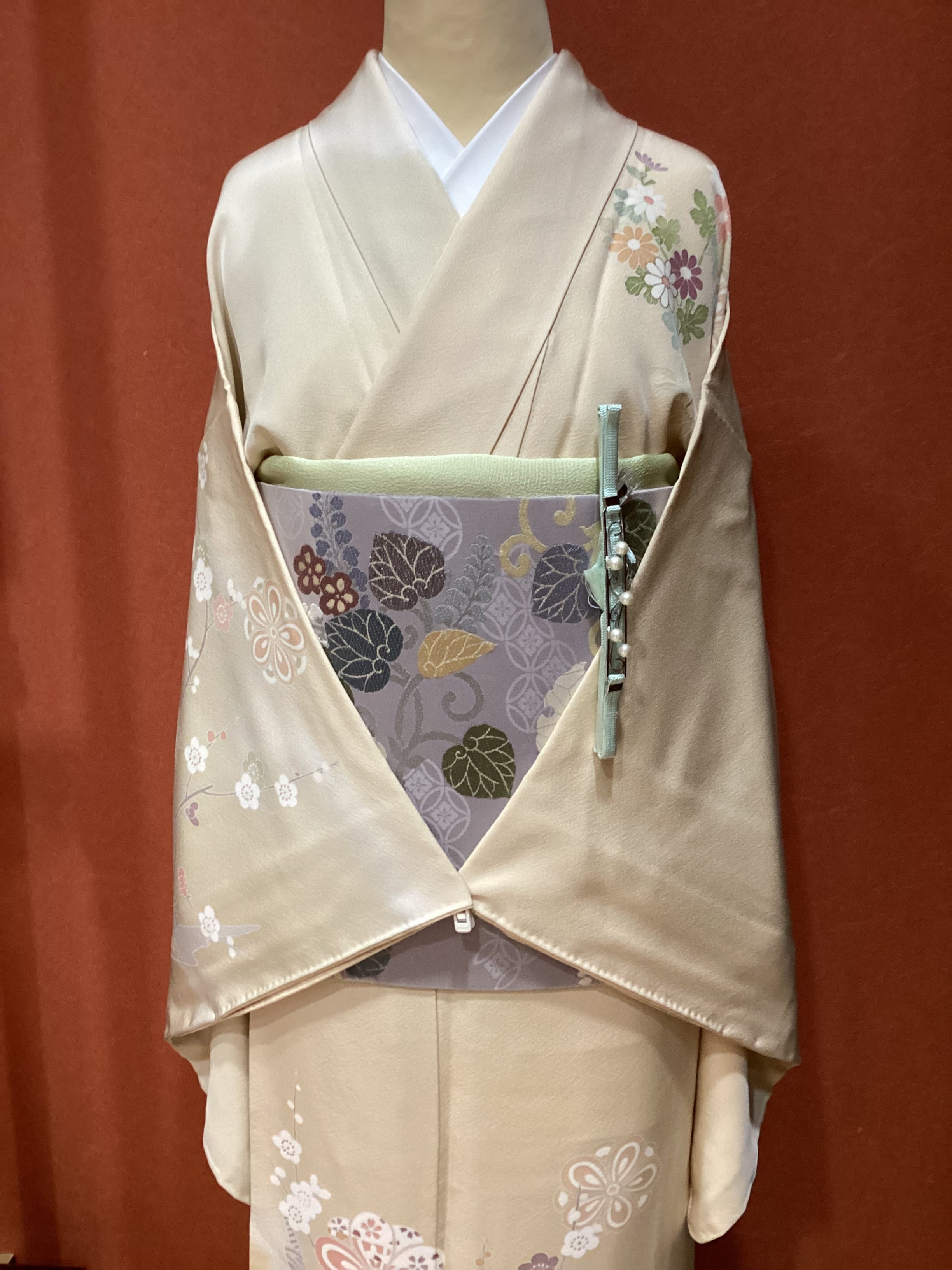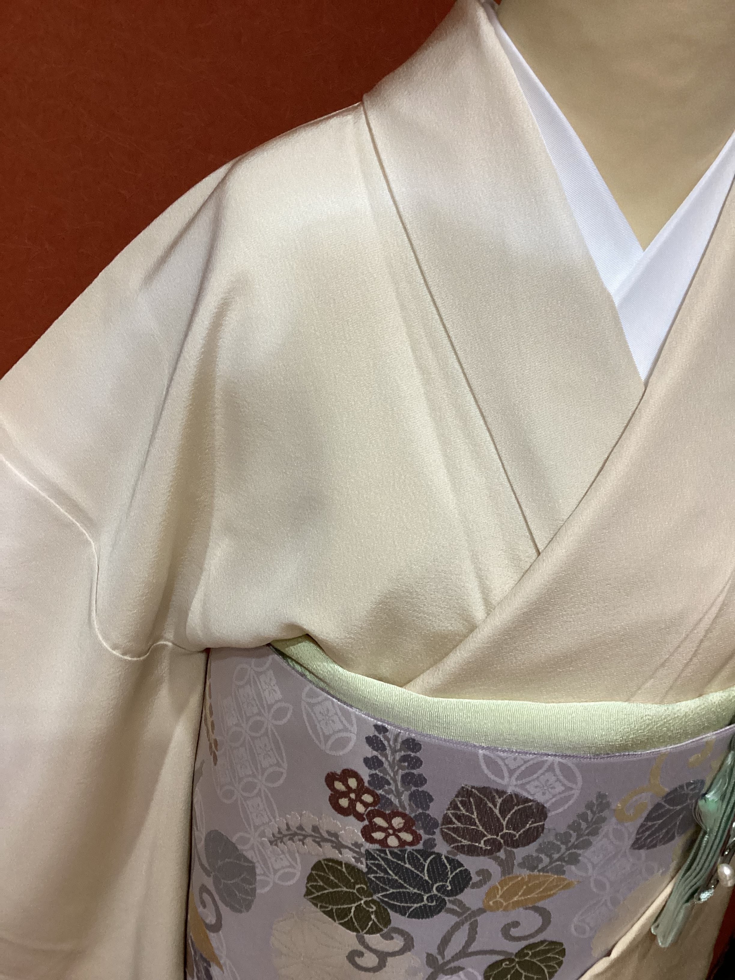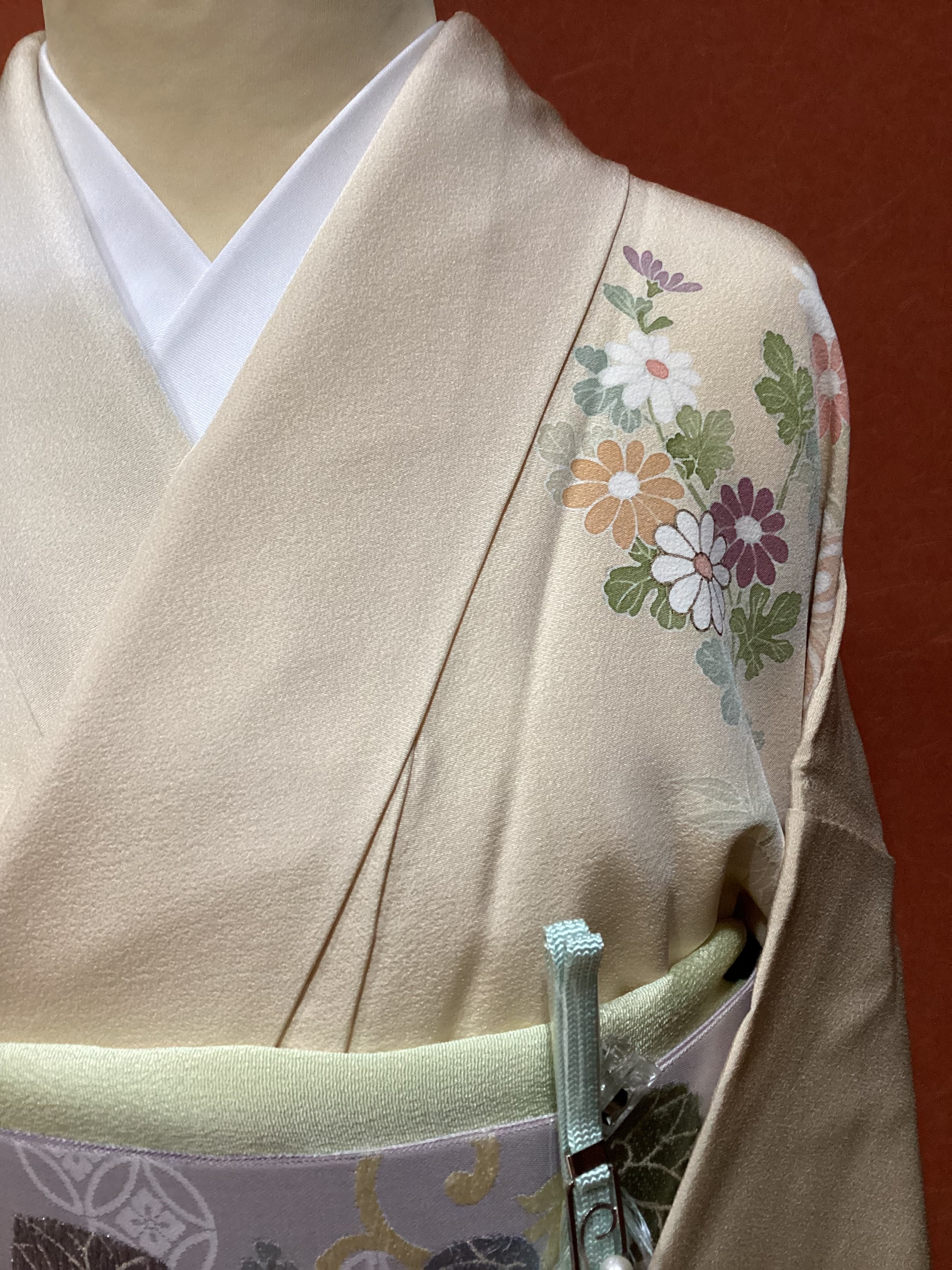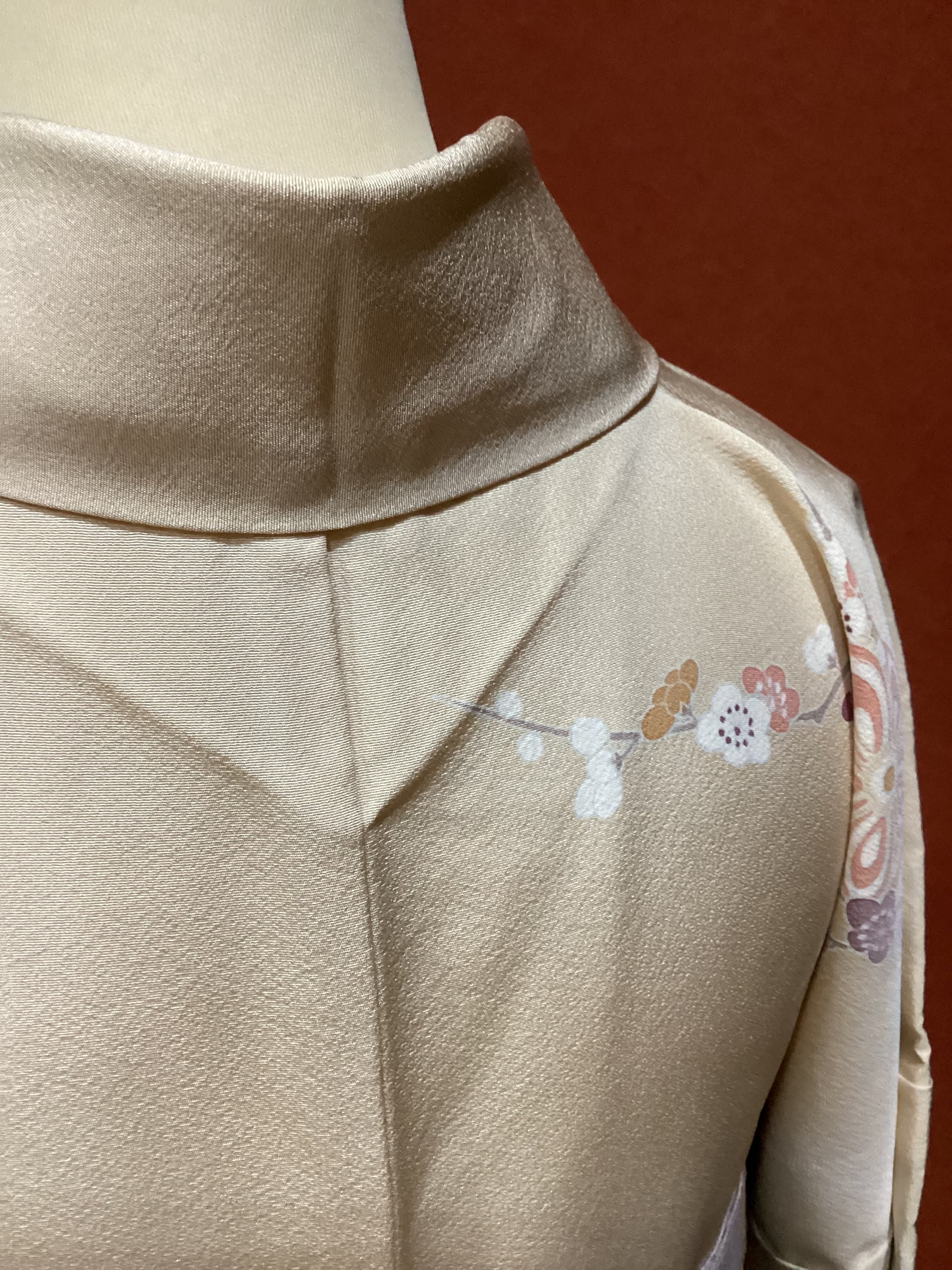 大きく雪輪文様の暈しの入った柔らかなクリーム色地に伸びやかな竹を配置し、梅、牡丹、躑躅、菊などの四季花が描かれています。控えめに配された金駒刺繍に竹や花の文様の中にさりげなく吉祥柄を盛り込んだ意匠が現代的で落ち着いた華やかさを感じます。