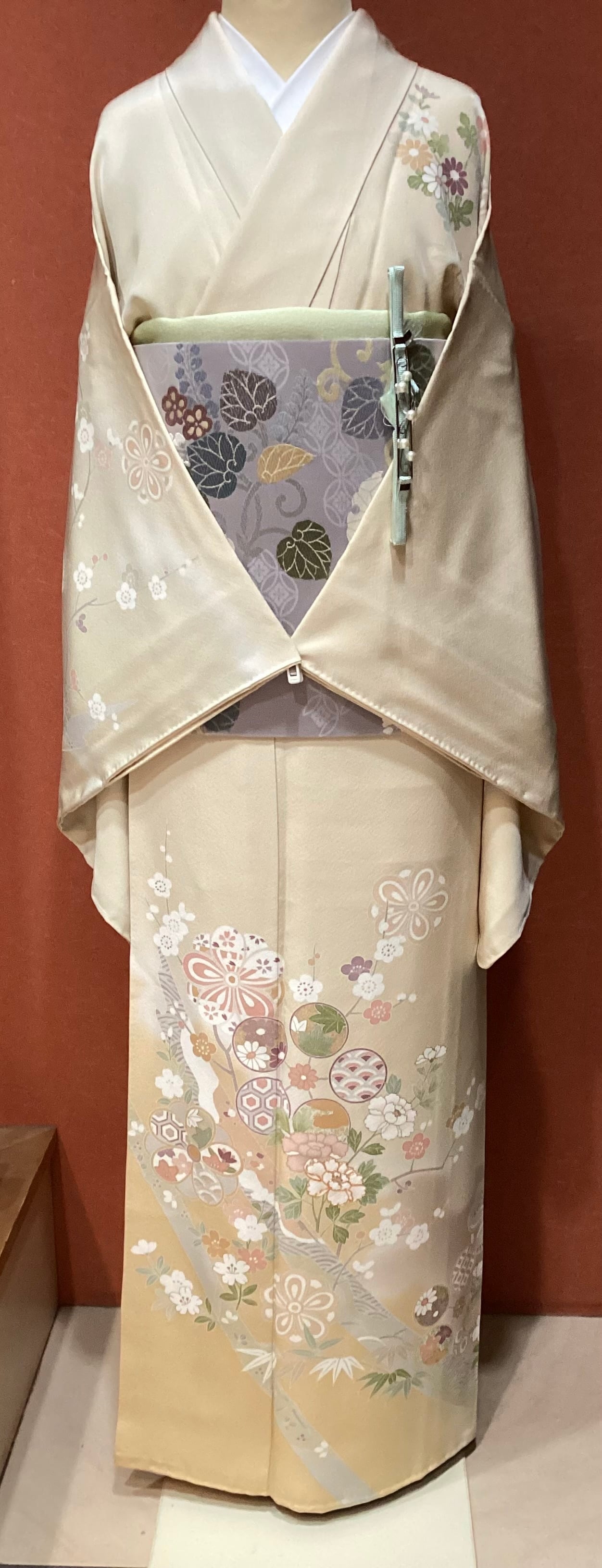クリーム色地雪輪暈しに松竹梅四季花文訪問着(落款有り)251128-1