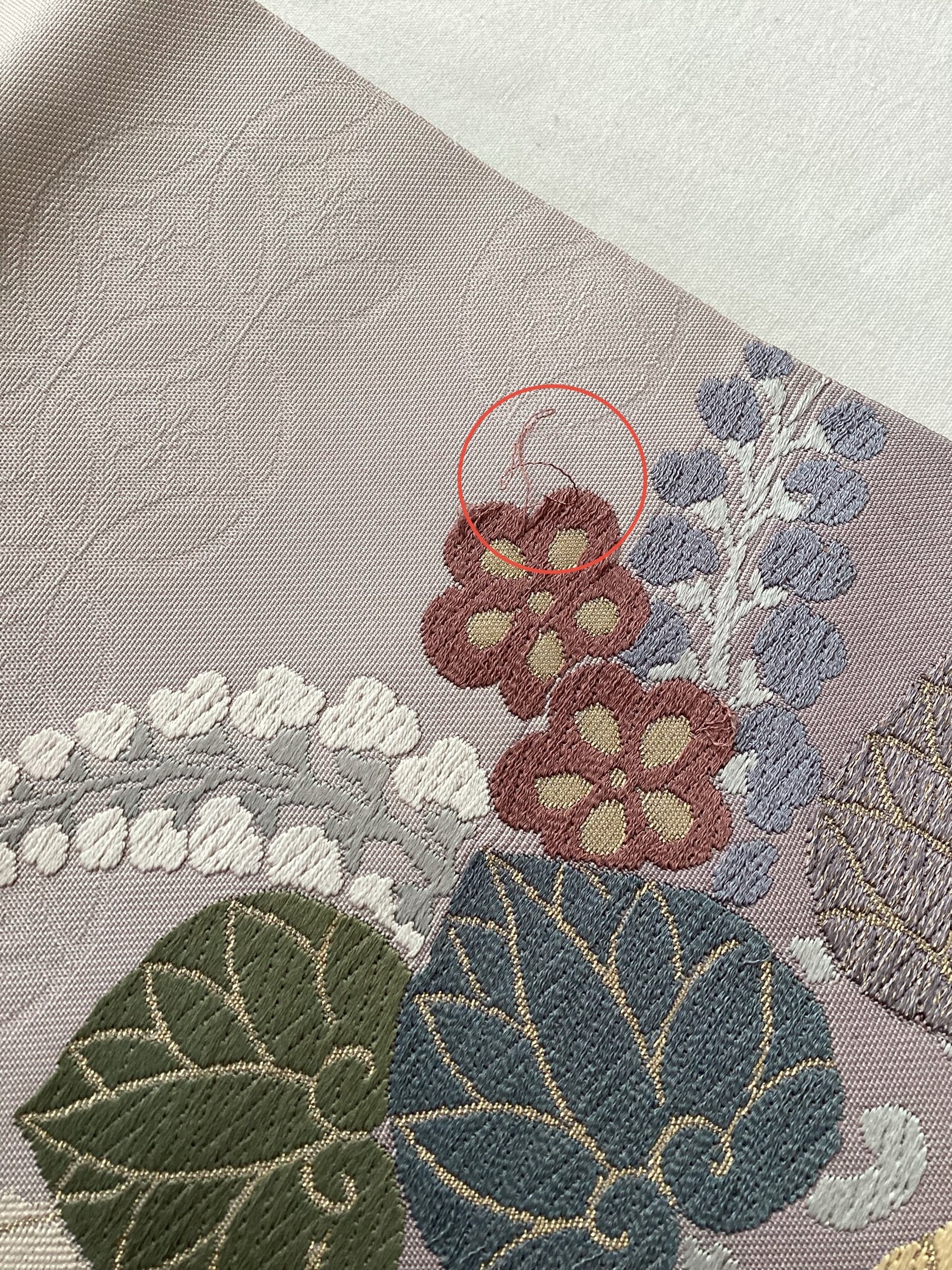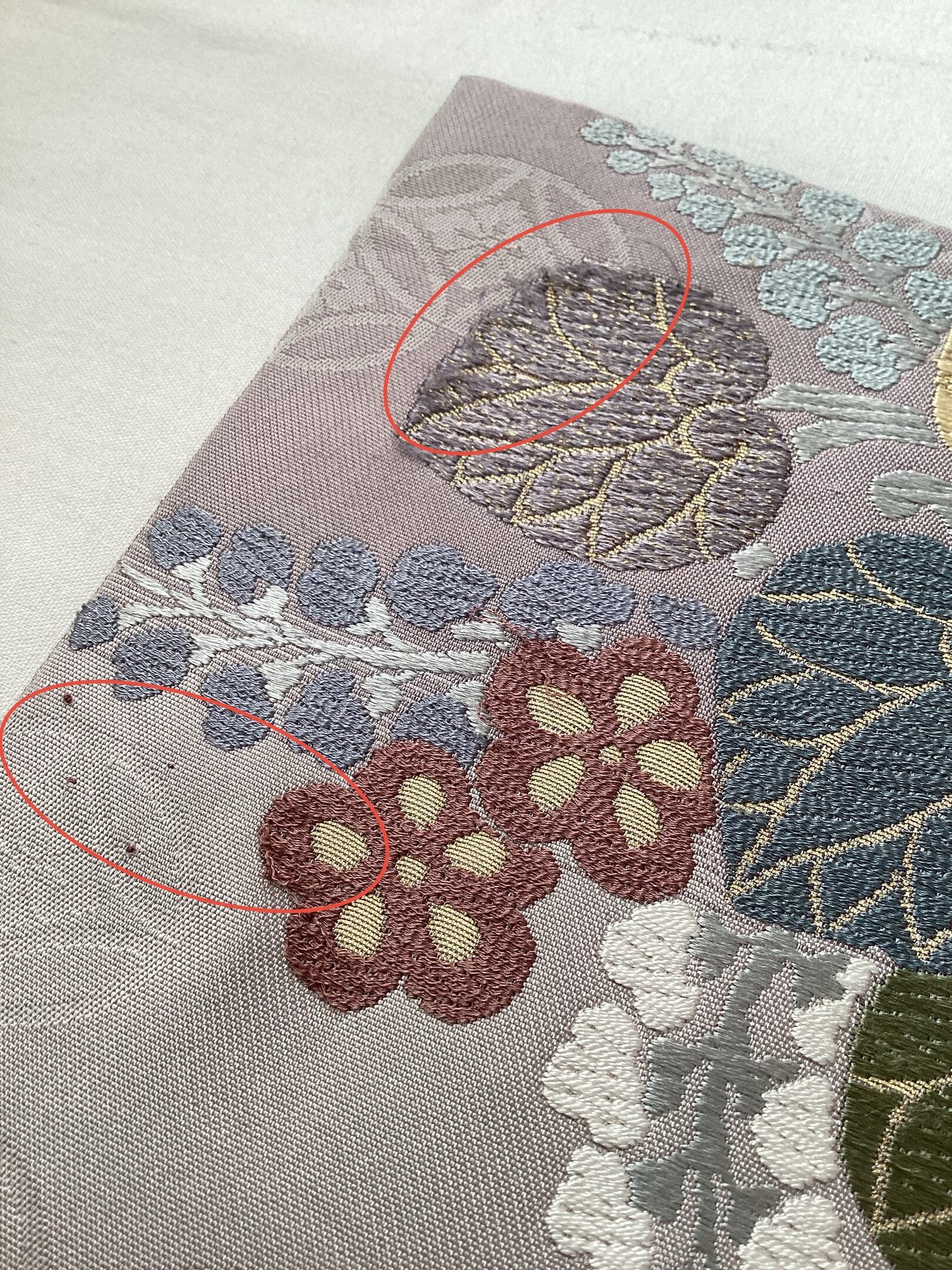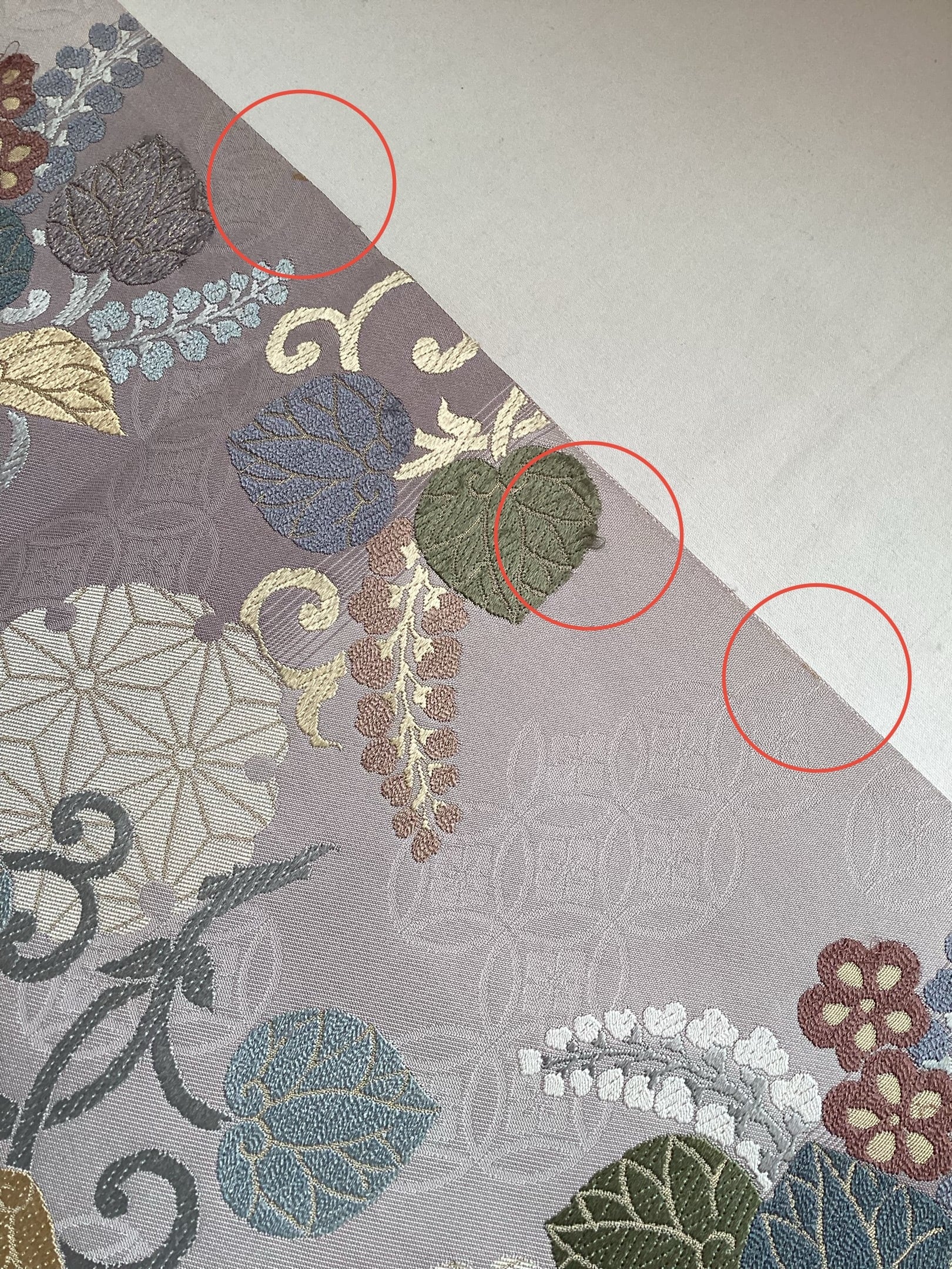 タレから約150〜170㎝あたりの帯端に小さな染みが2箇所と色糸の浮きがございます(画像11)。その他にも画像12〜18にあるように、色糸の浮きや引き攣れ、引っ掛けなどがございます。状態をご理解いただき、気にされる方はご購入をお控え下さい。
