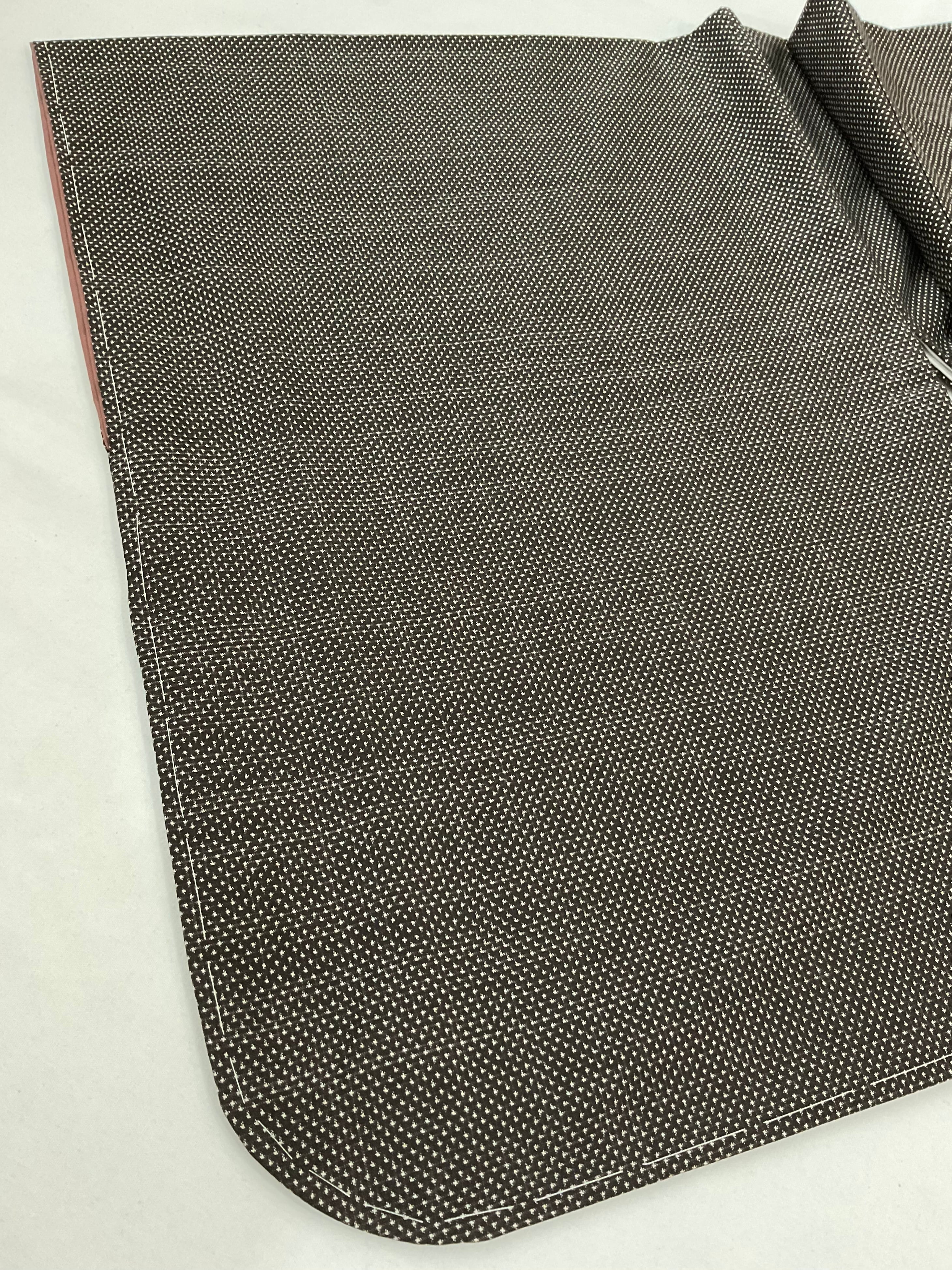 ベースのお色は墨色と茶色で織られており、白の蚊絣文様が並んだ泥染めの大島紬です。大島紬特有のシャリっとして軽い質感です。ダークカラーでベーシックなお柄のおきものに、赤みを帯びた茶色の八掛が効いて温かみをプラスしアクセントとなっております。年齢を問わずに長くお召しいただける定番のお品です。カジュアルなお出掛けにいかがでしょうか。