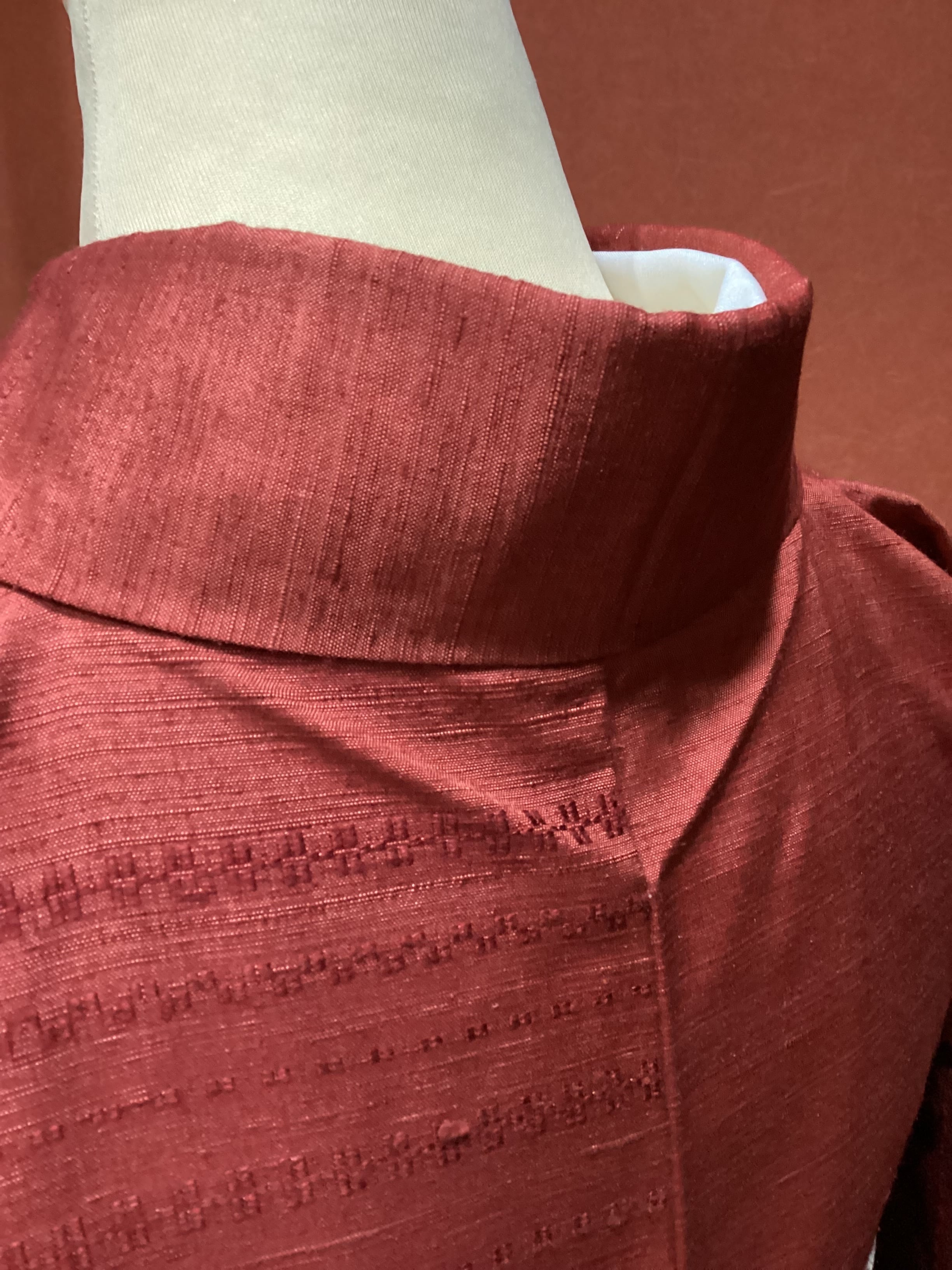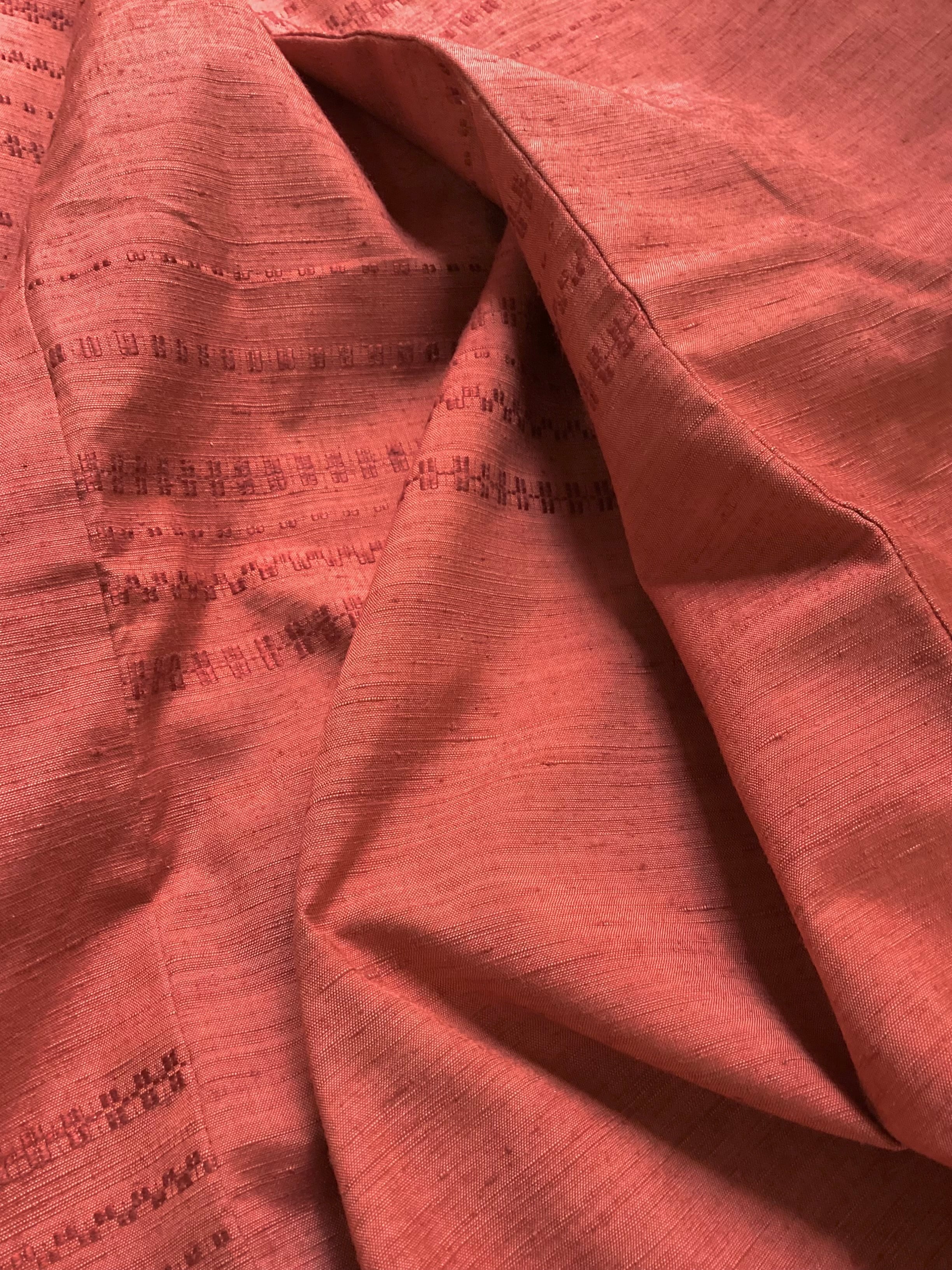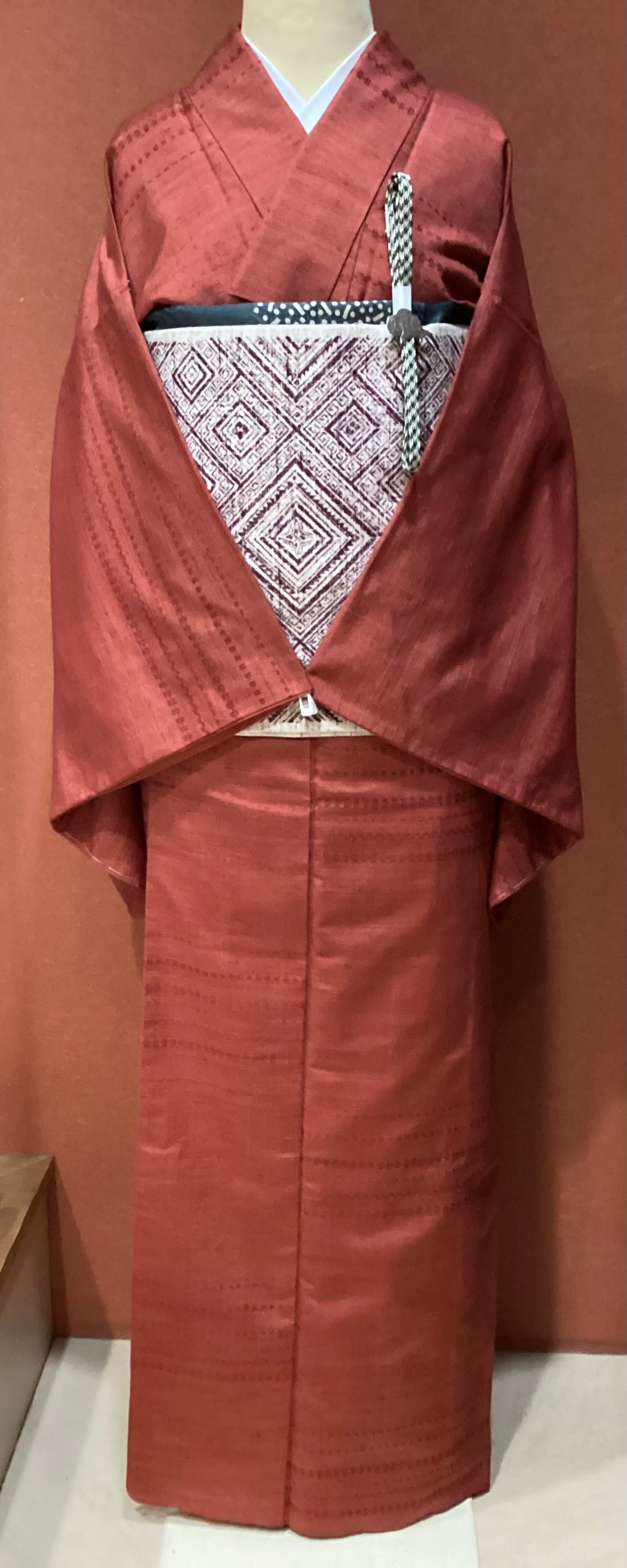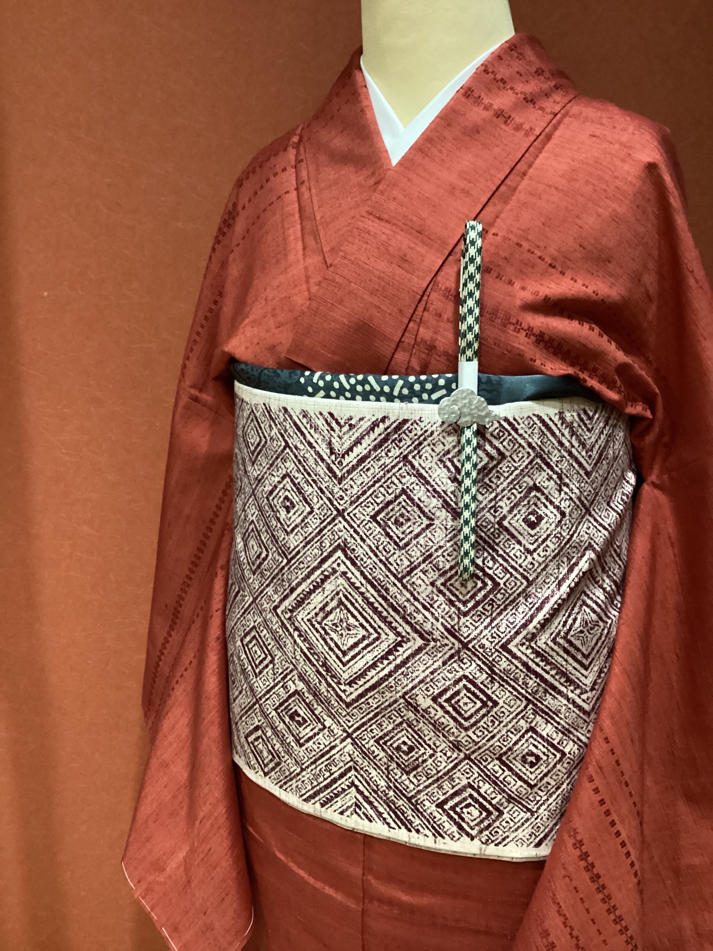 赤みがかった茶色の絶妙な色合いがパッと目を引く真綿系のふかふかとした風合いの紬きものです。花織で横段に織文様が入ってアクセントとなっています。紬糸の素朴な節感と絹糸の艶感が感じられ、単色無地ならではの生地の風合いをダイレクトにお楽しみいただけます。なんと言ってもお色味の個性が際立ち大変洒落味のあるおきものです。