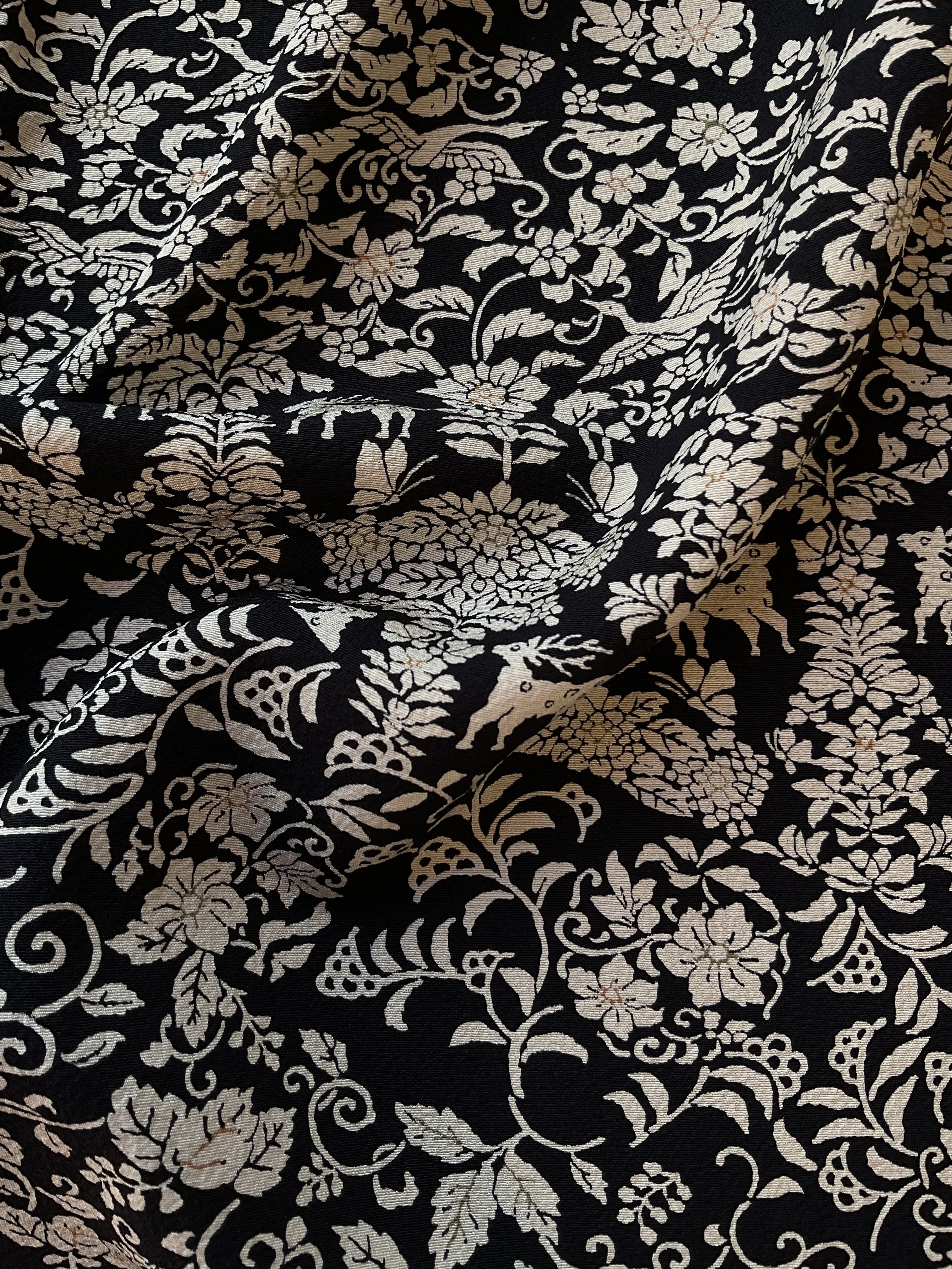 黒地に鹿や鳥、花唐草文がふんだんにあしらわれた縮緬地の小紋です。