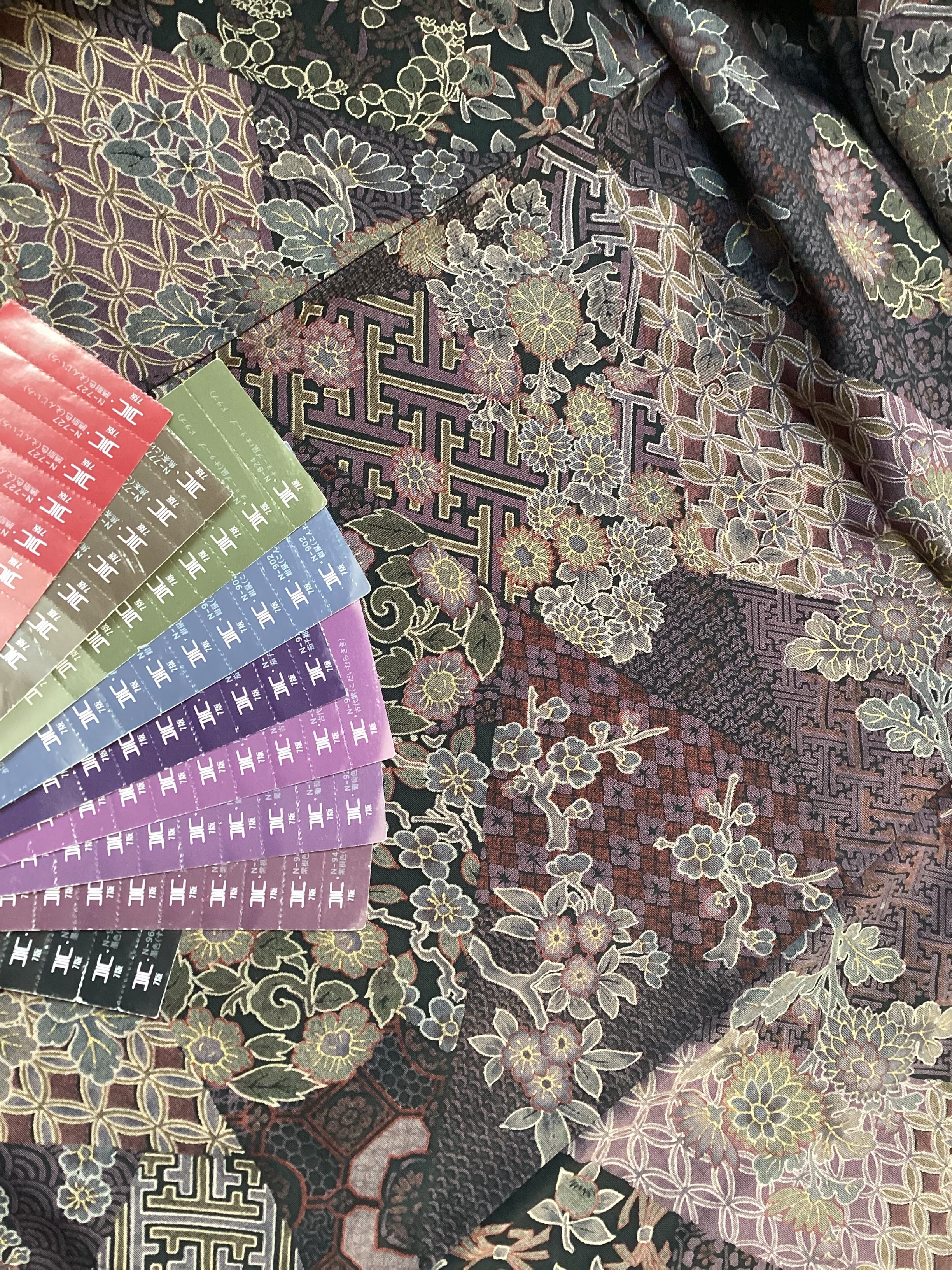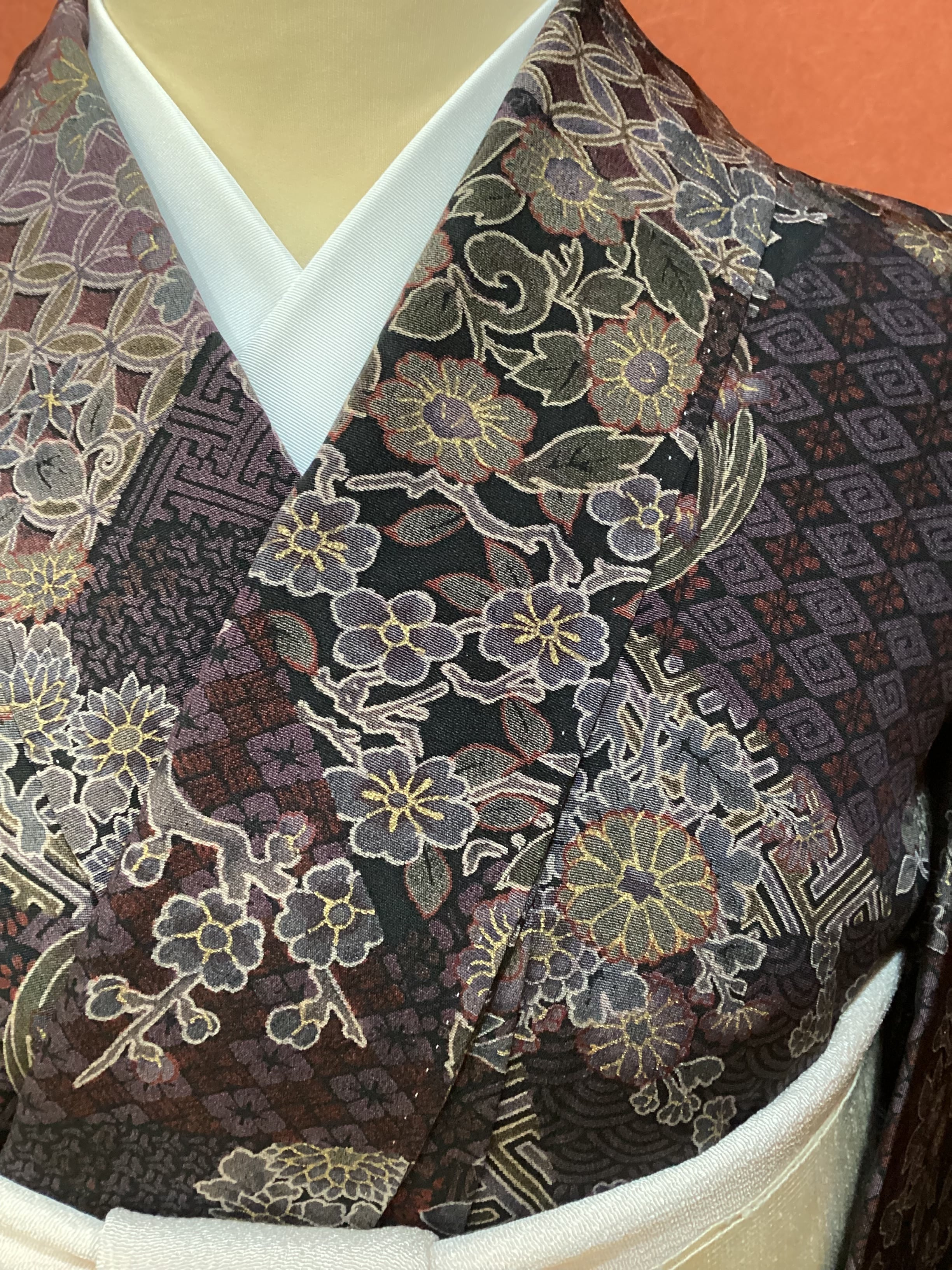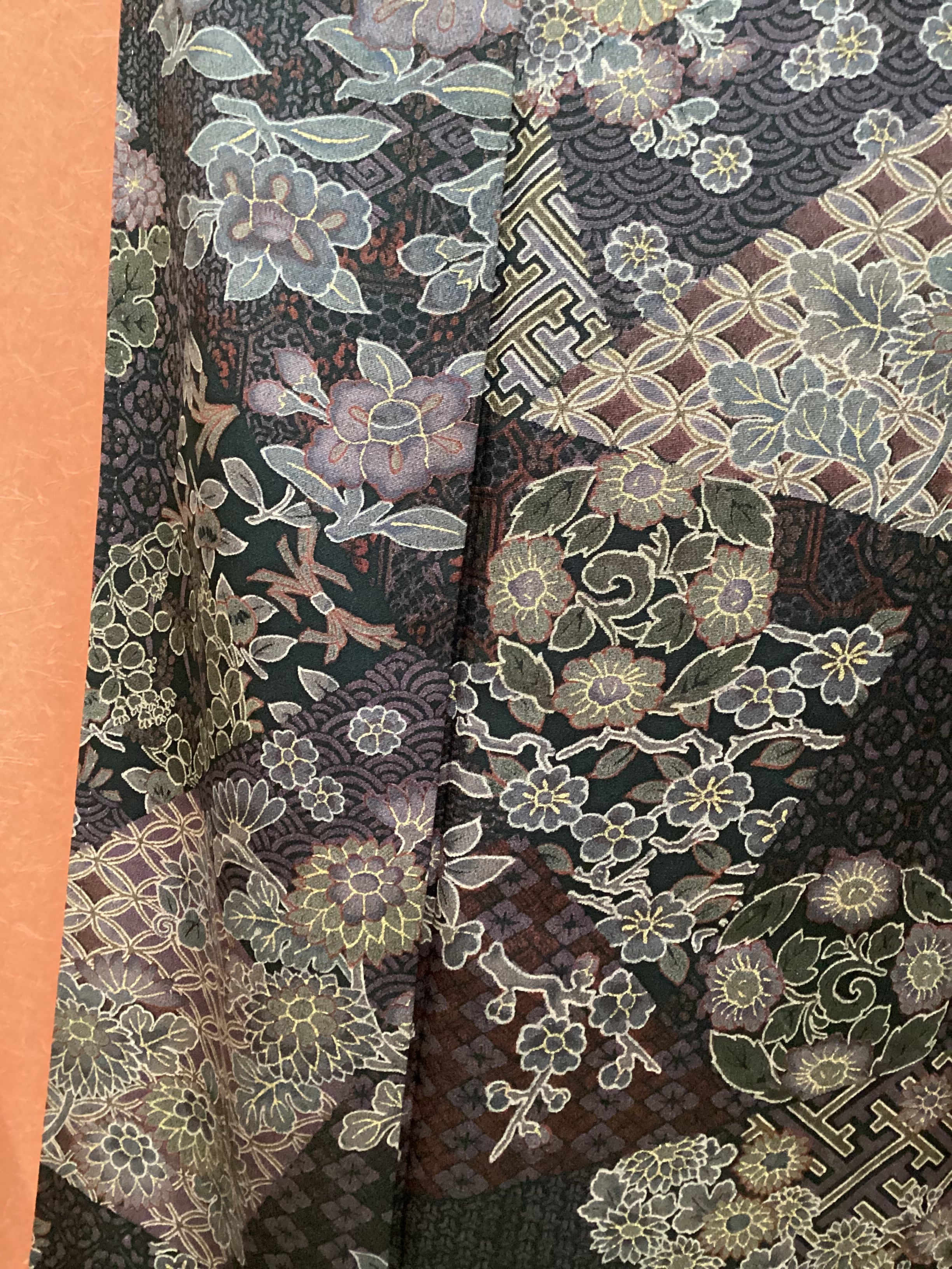 ダークな色合いで細密な吉祥文様が切嵌められ、その上に四季折々の花々が重なり合って描かれた染めの美しい小紋きものです。大変複雑に沢山の文様と花々が取り込まれておりますが、全体的にトーンを抑えており、落ち着いた雰囲気を持っております。お出掛けや和のお稽古用にいかがでしょうか。