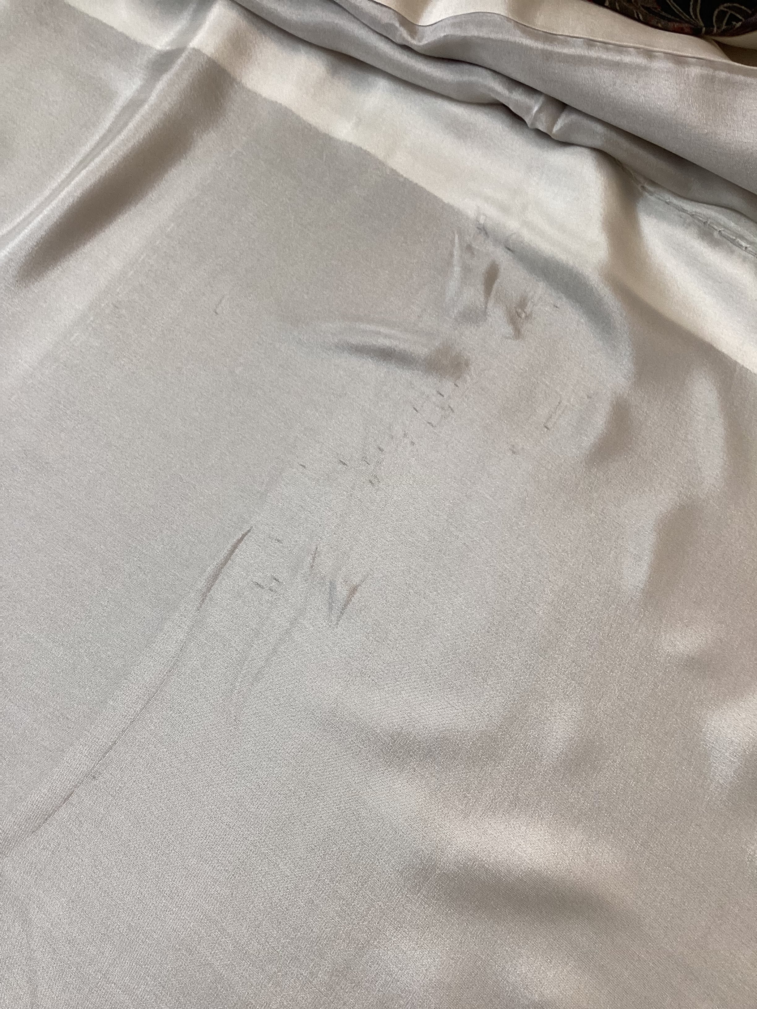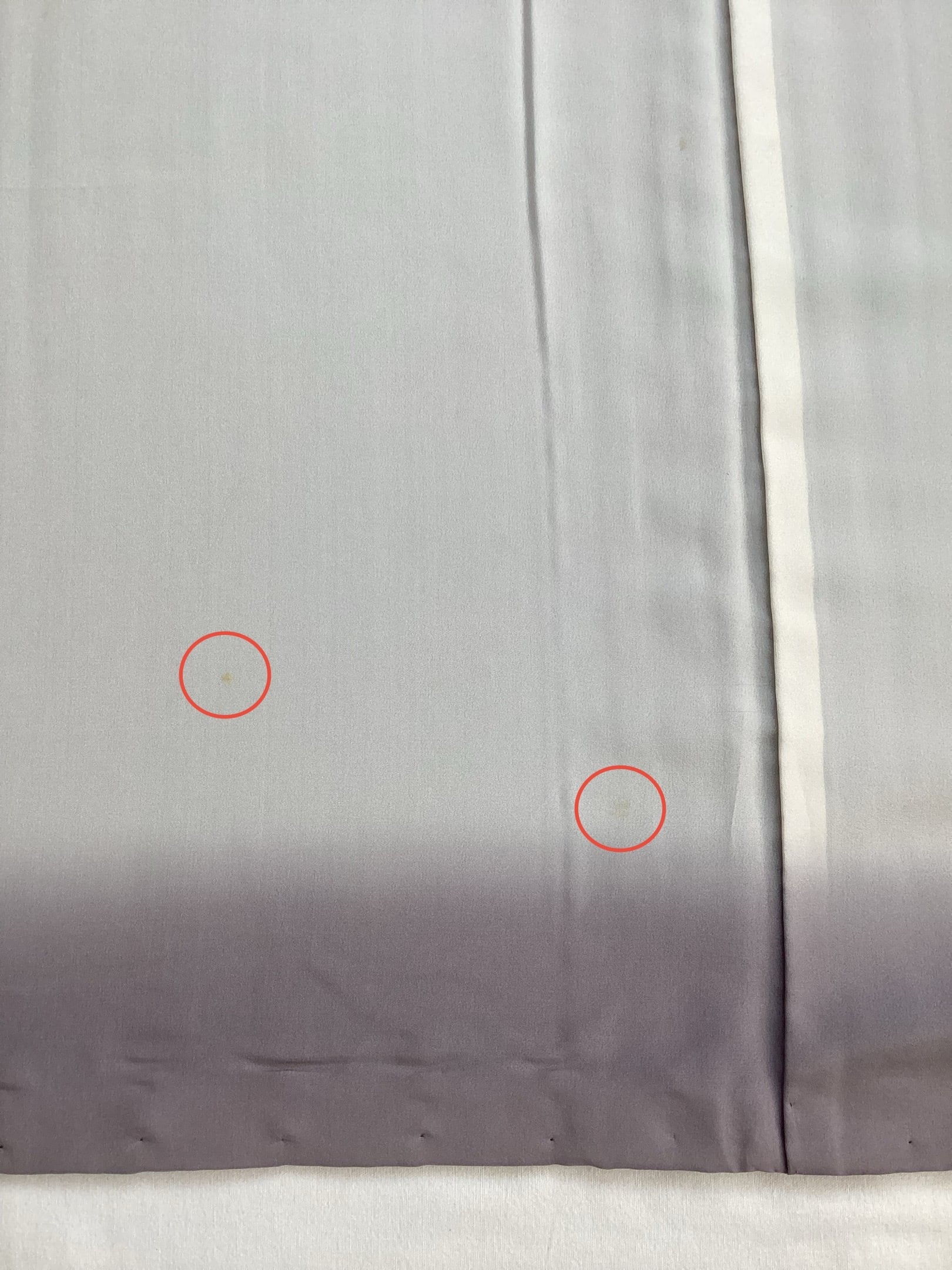 表生地は状態が良いのですが、胴裏と八掛の状態があまり良くありません。胴裏に着用皺や縫い目の開きや染みなどがございます(画像12〜17)。また、八掛全体にポツポツと染みがございます(画像18.19)。着用時には隠れる部分ですが、気にされる方はご購入をお控え下さい。