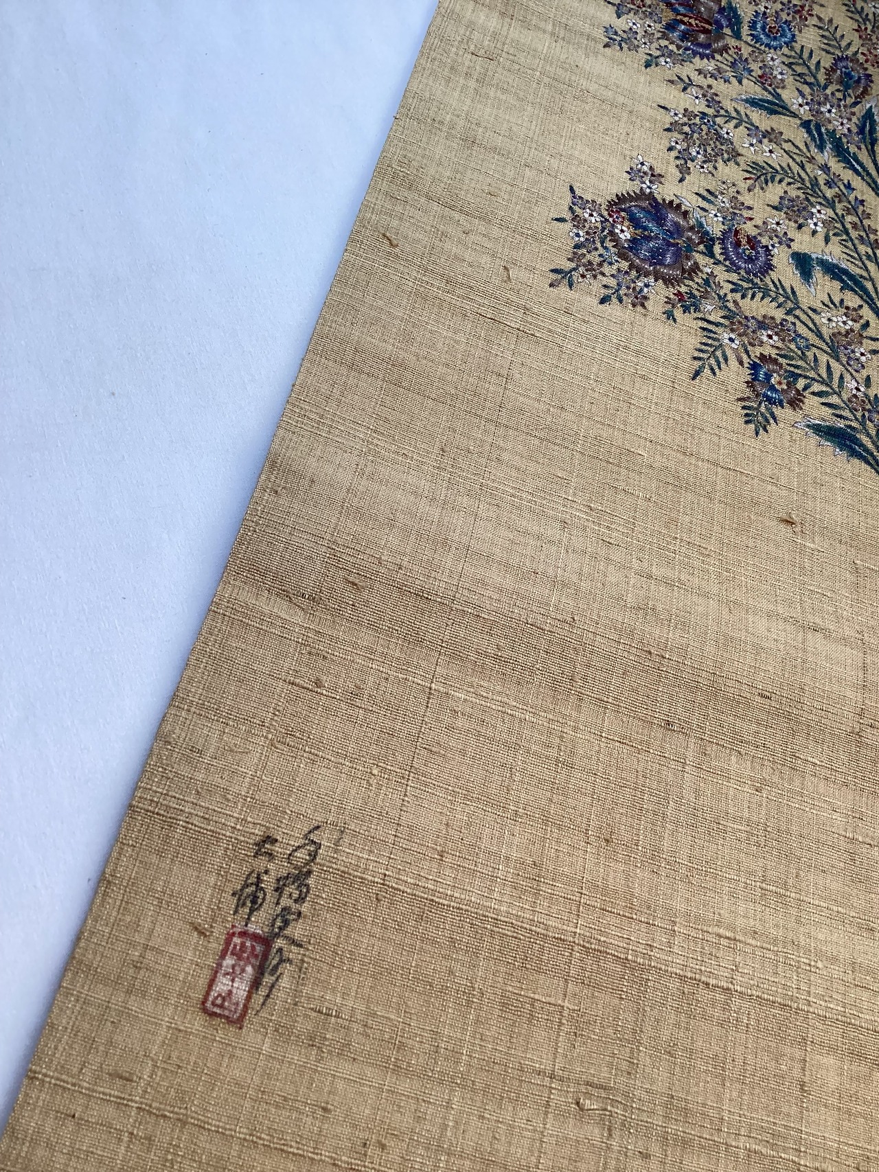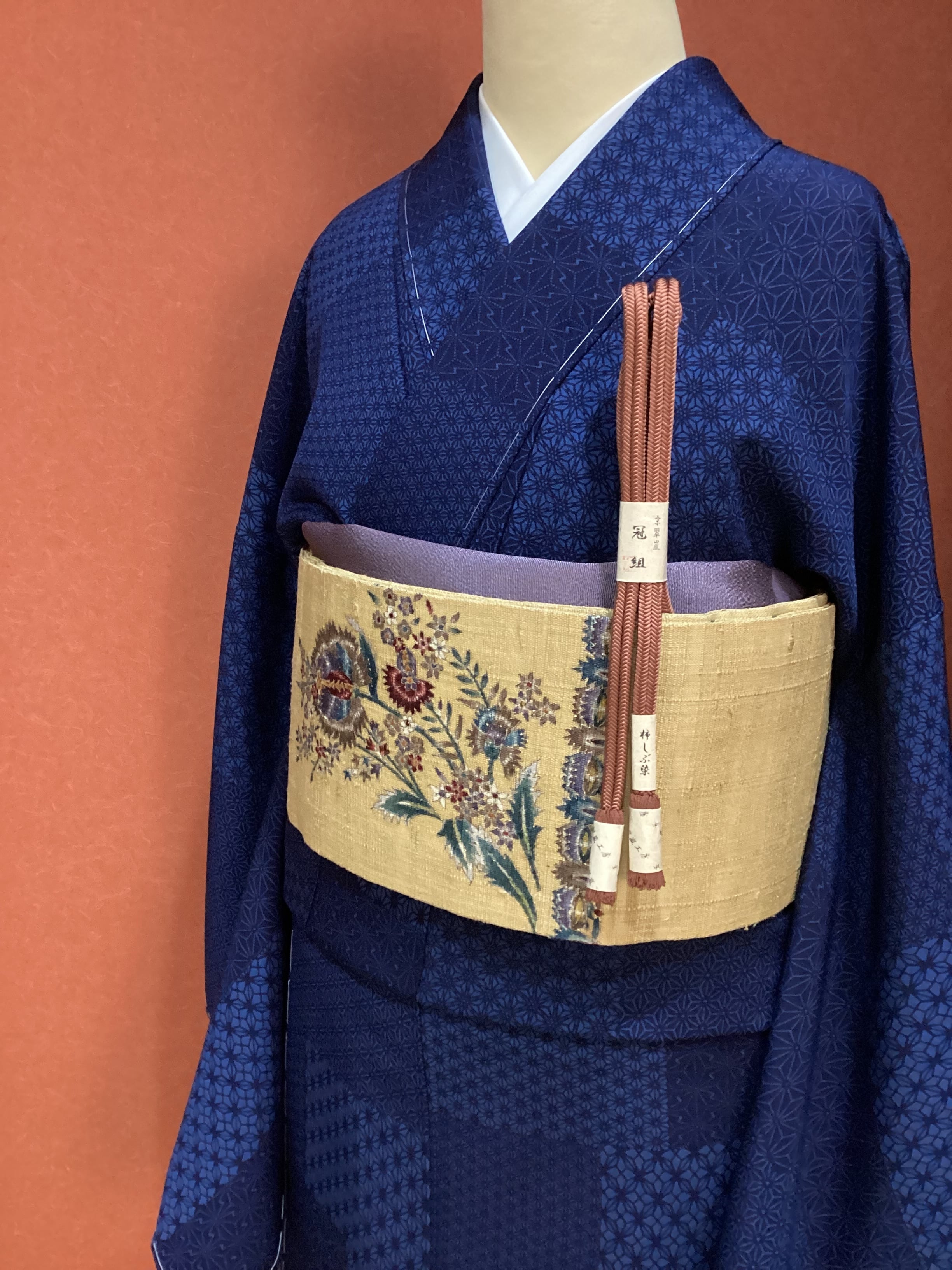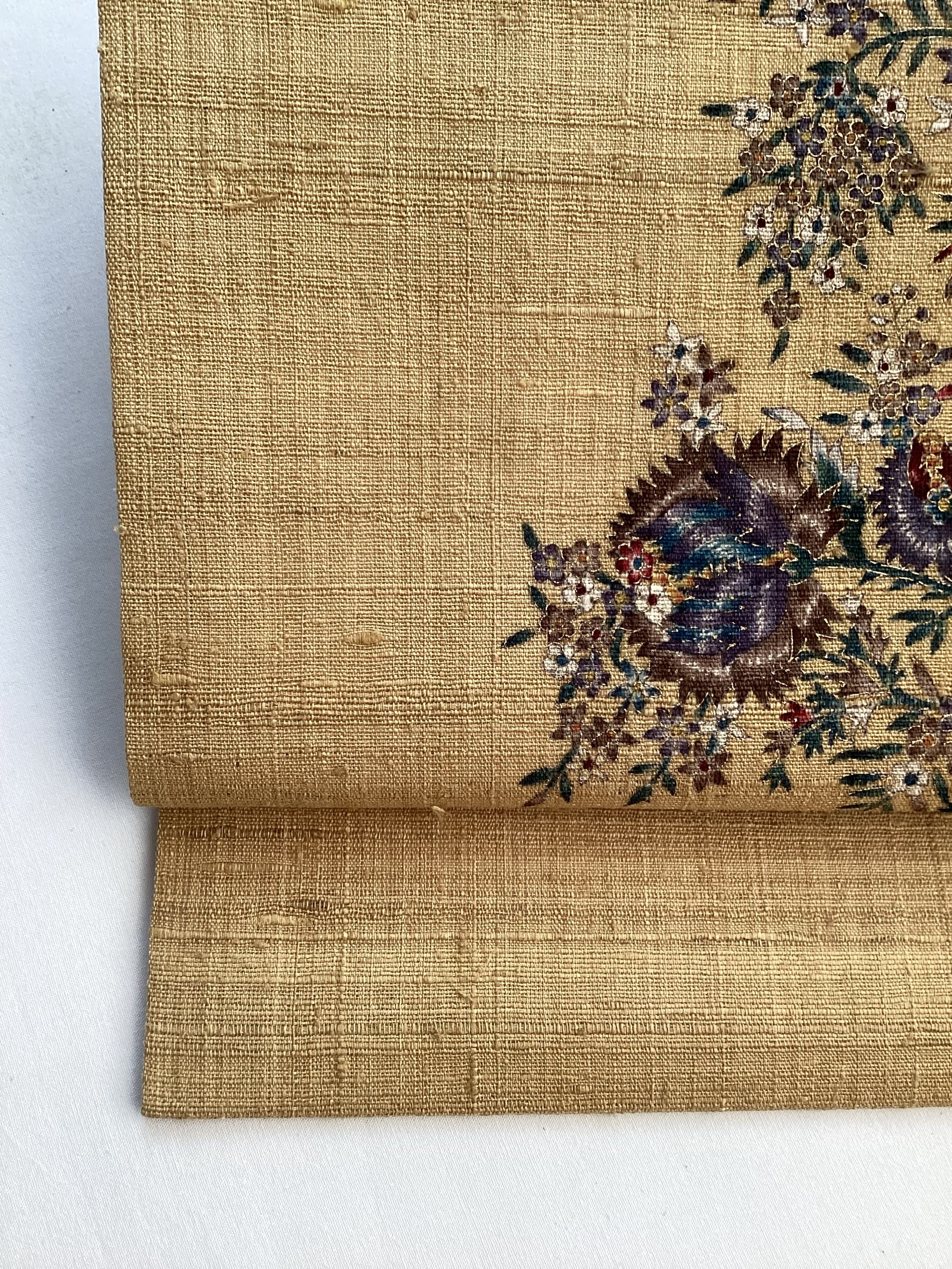 節立った糸が味わい深い灰みを帯びた落ち着いた黄色の紬地にエキゾチックな花更紗文様が描かれたなごや帯です。こちらのお品は代々続く江戸更紗の家に生まれ、その伝統を受け継ぎ、更紗を深く追求し極めた染色作家【大浦紫山】氏の作品です。紫やブルーを効かせた絶妙な色使い、繊細な金のラインの縁取りの美しさ、随所に粋で洗練された大人のスッキリとした雰囲気を漂わせる逸品です。