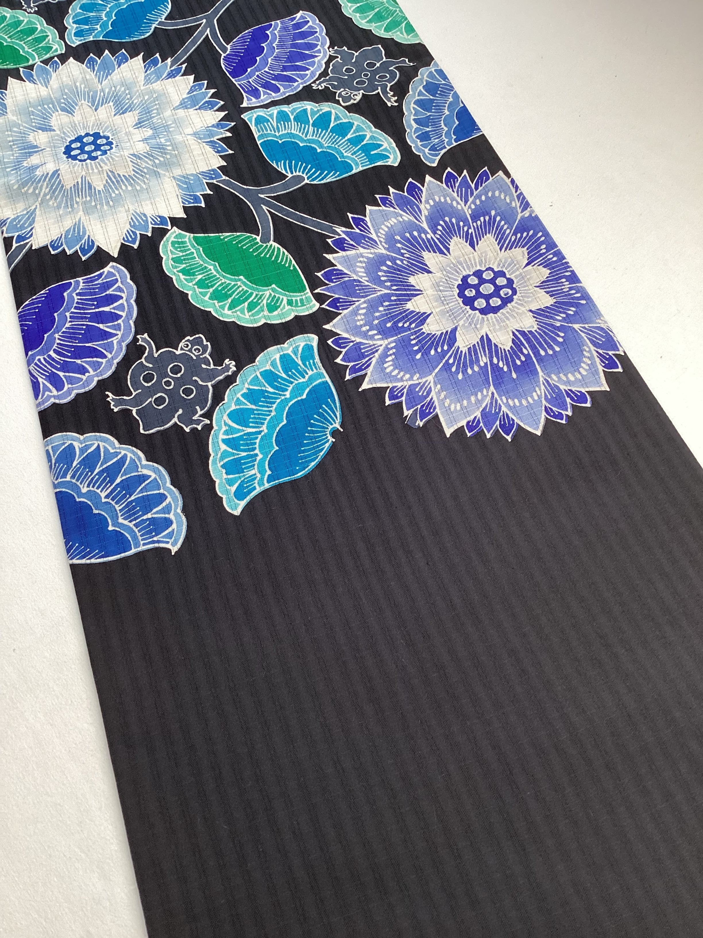 黒地にレモンイエローやターコイズ、ピーコックグリーンなど、ビビットな配色で大輪の花が染められた洒落袋帯です。大島紬の織地から仕立てられており証紙と反端が付いております。モンステラや南国調の草花が織り込まれた裏地にもこだわっております。薄ての軽やかなお品です。現代的な印象の洒落袋帯なので、古いおきものに合わせていただいてもモダンな着姿に引き上げてくれます。