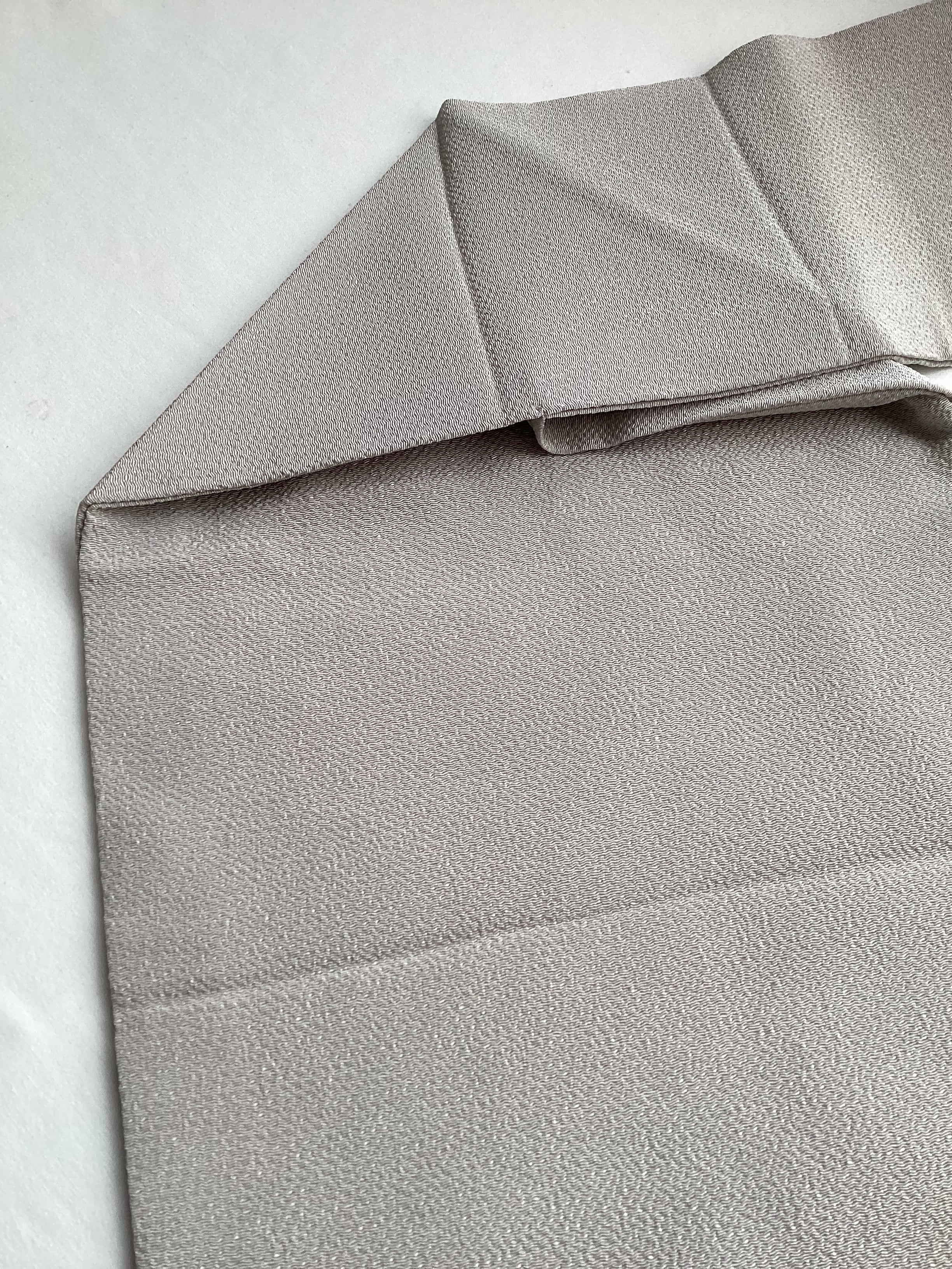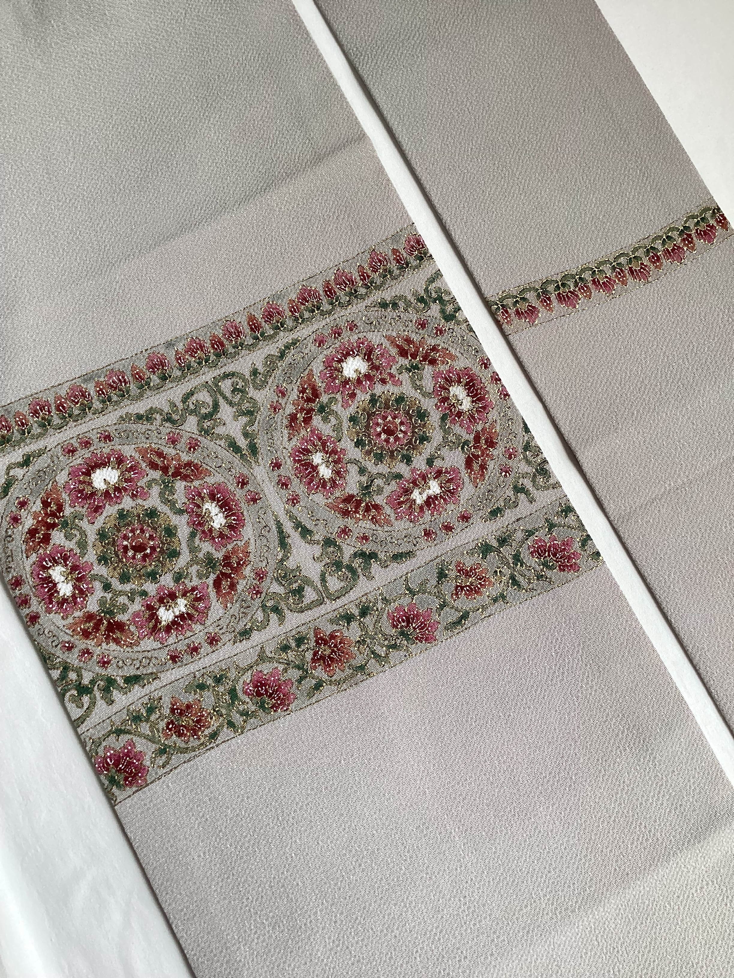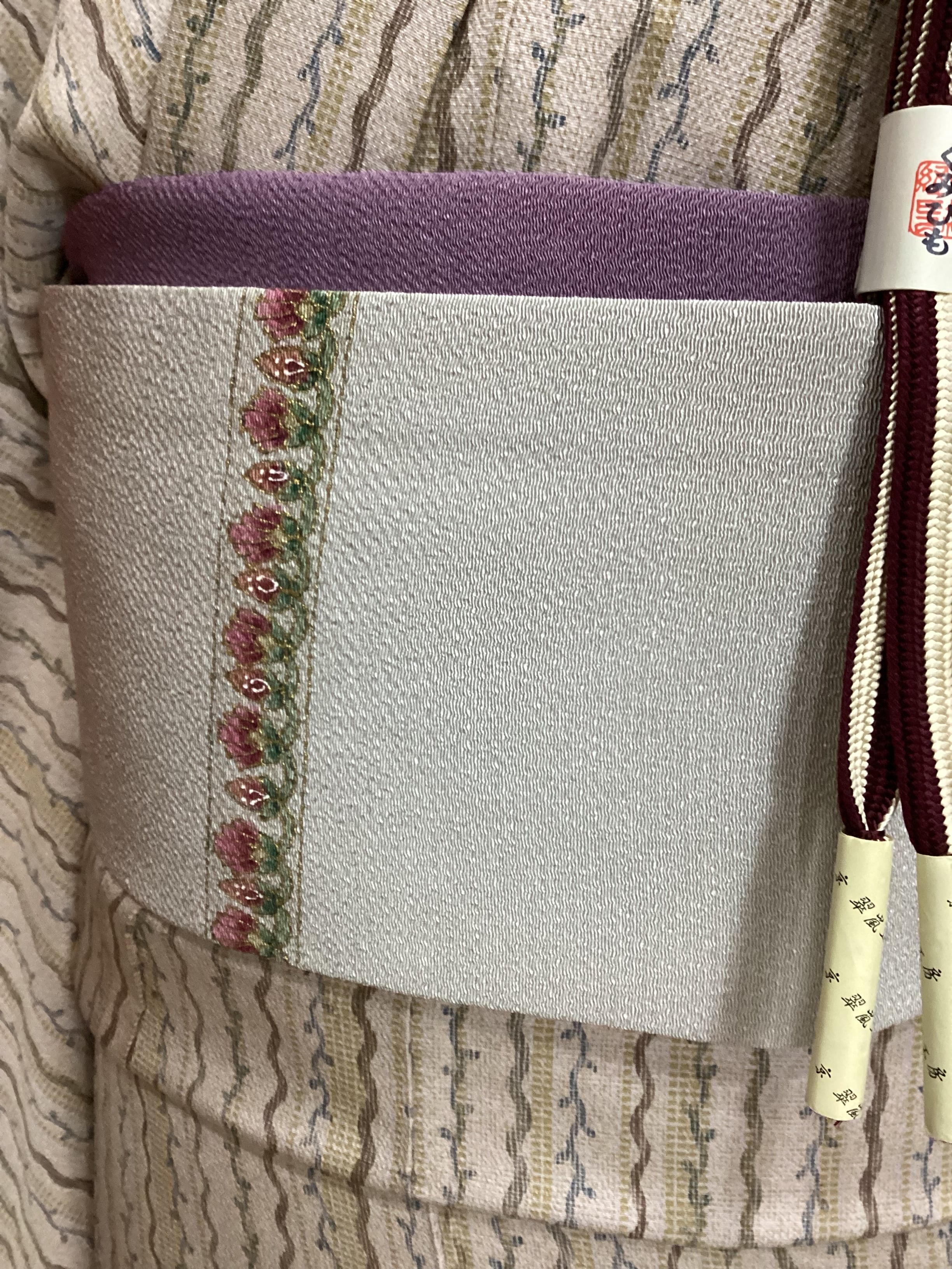 ぼってりとしたシボのある灰色の鬼縮緬地に繊細なラインで宝相華文様が染められた九寸なごや帯です。落ち着いた色合いのピンクとグリーンのグラデーションで唐花が描かれており、細い金の縁取りが煌びやかさを添えています。主張しすぎないあっさりとした前柄と、緻密なオタイコ柄が美しいなごや帯です。