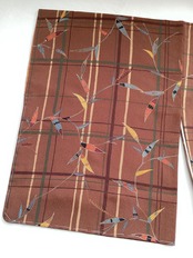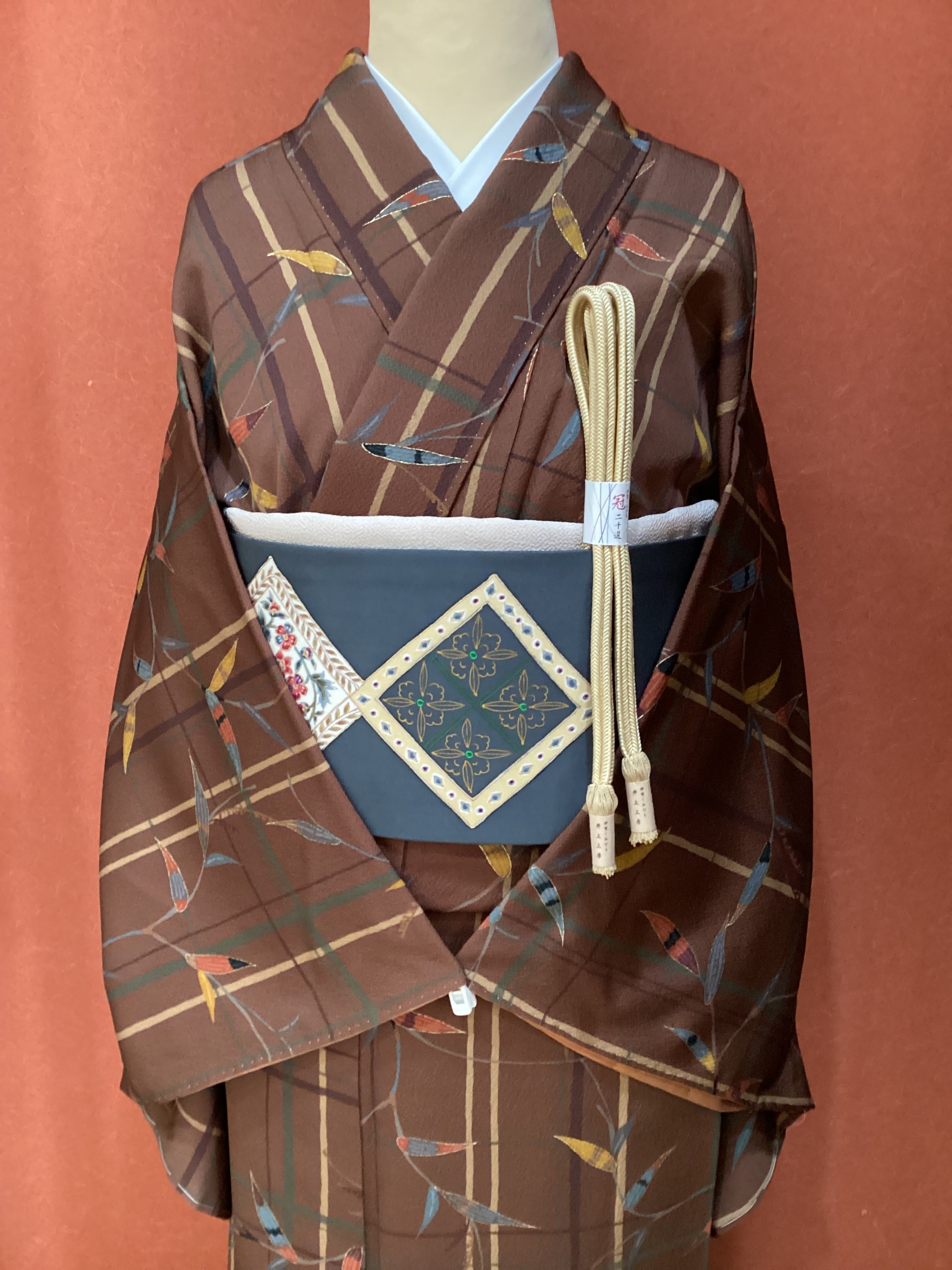 ふっくらとした縮緬地に格子と笹の文様の小紋きものです。赤紫みがかった茶色のベース地に多色使いで格子の上に重なるように伸びやかな笹の枝が染められております。気軽なお出掛けや和のお稽古事、普段着にいかがでしょうか。