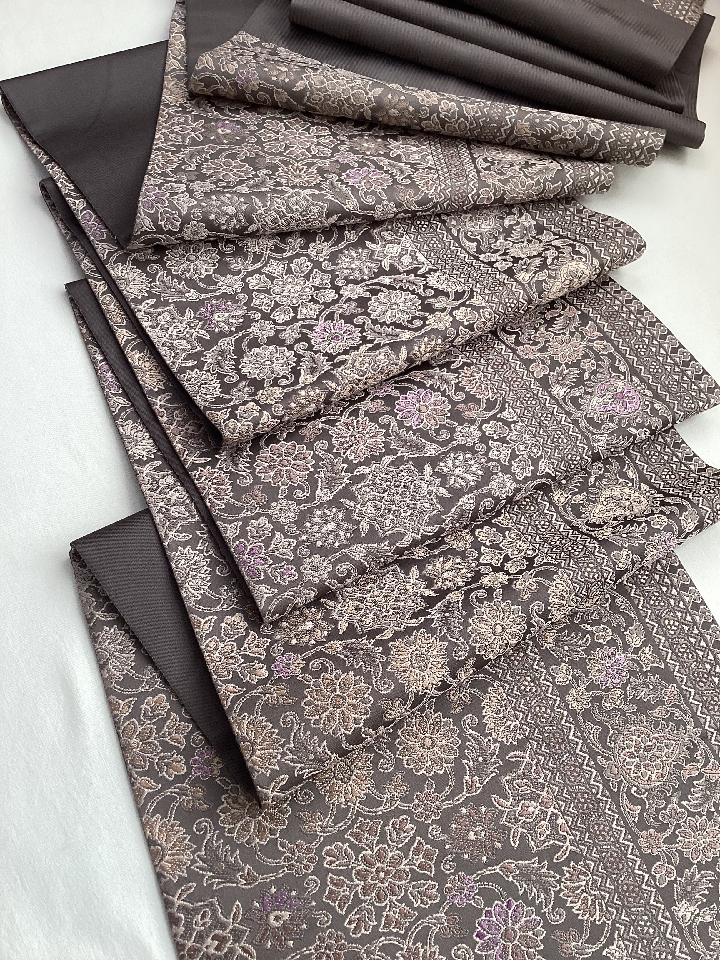 「帝王紫」「ロイヤルパープル」とも呼ばれる貝紫染めの紫色がポイントとなった京都西陣の機元【箔屋清兵衛・陰山織物】の袋帯です。【箔屋清兵衛】の帯は、柔らかくしなやかな地風で締めやすく軽くて扱い安いので、大変人気のあるお品です。細かな連続文様なので、柄出しを気にせずに結べ、季節を問わずに幅広いシーンにお締めいただけます。