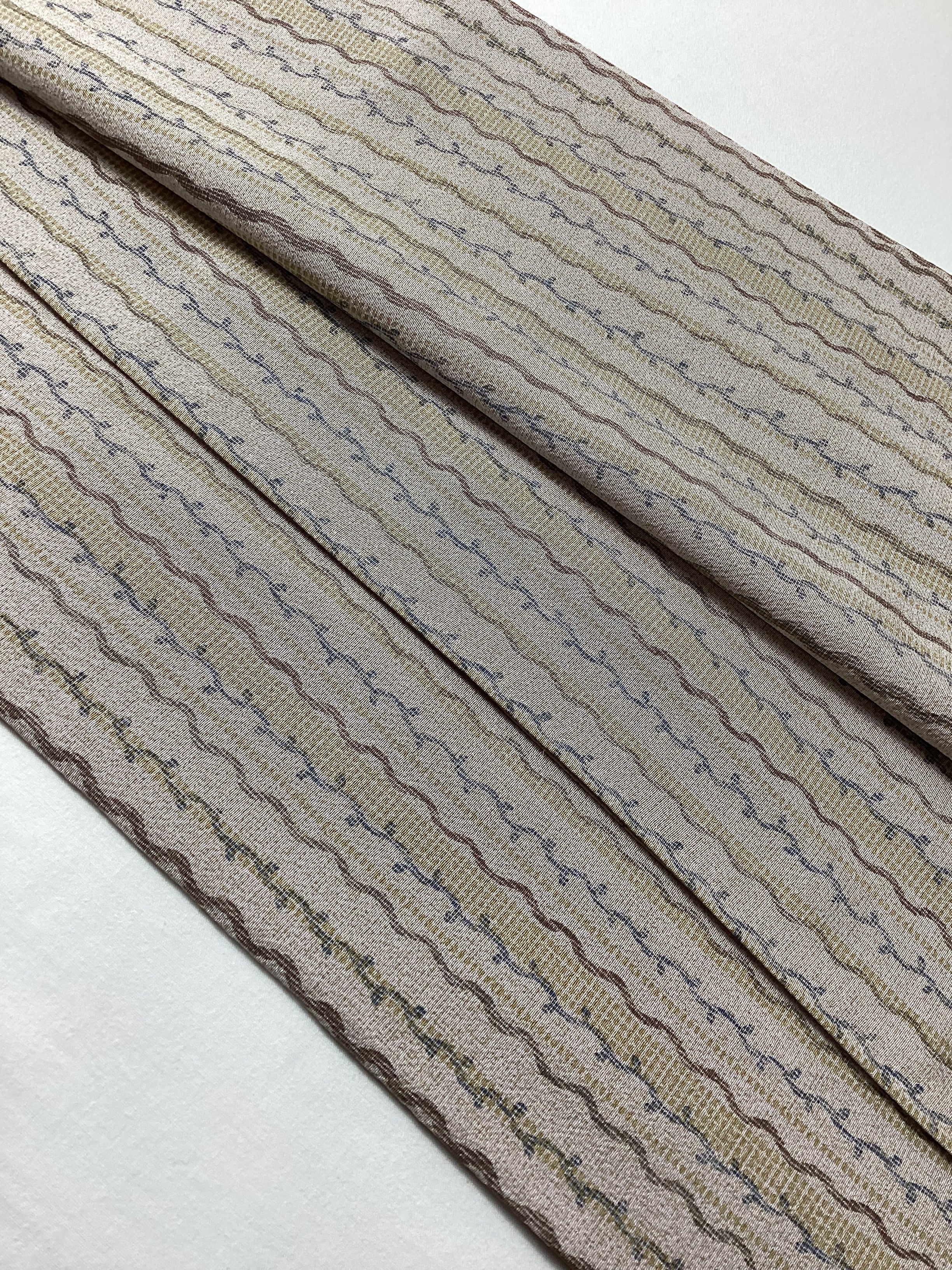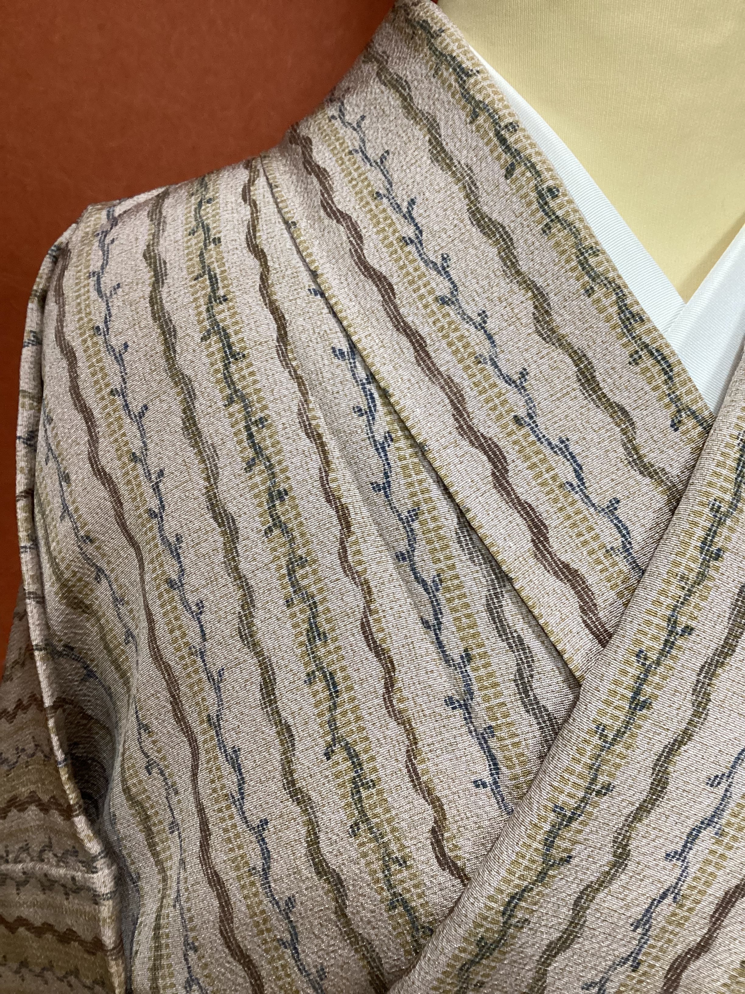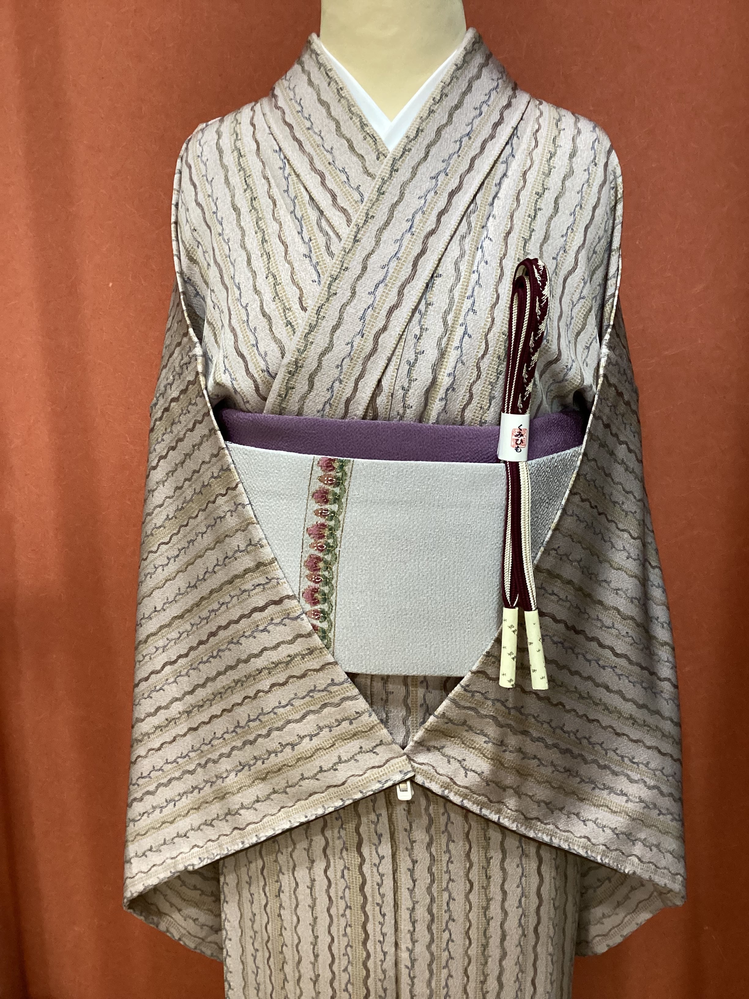 さらりとした手触りの絹地に縦縞文様の小紋きものです。灰みがかった落ち着いた桜色のベース地の上によろけ縞や、蔓草のラインが染められております。濃いカーキ色の暈し八掛がピリッと効いて、楽しいお柄の大人の落ち着いた小紋となっております。shopingや映画鑑賞などの気軽なお出掛けや和のお稽古事、普段着にいかがでしょうか。