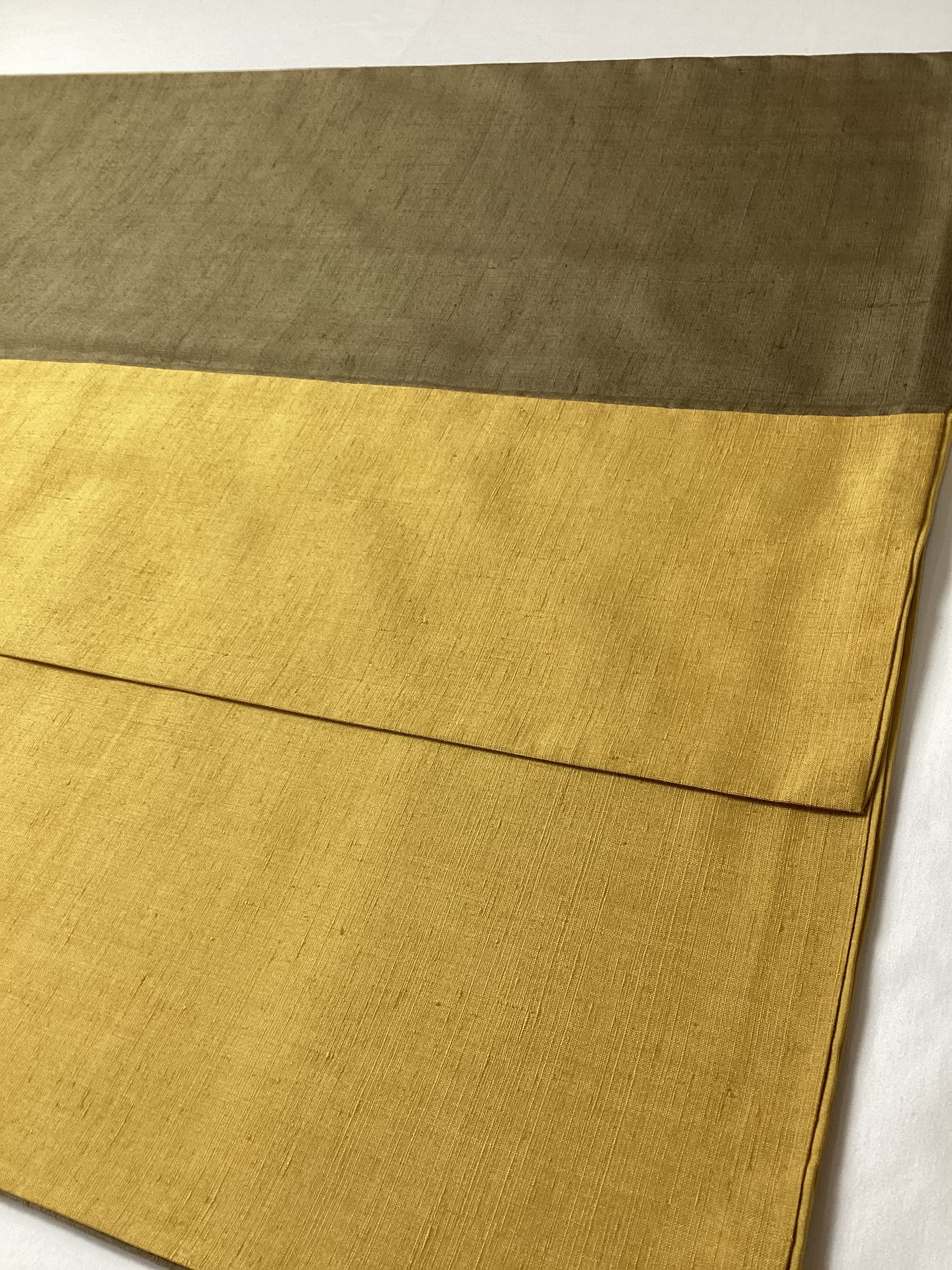 マスタードとカーキの2色のツートンカラーがパッと目を引くモダンな洒落味のある小紋きものです。肩山や衿の背中心で色が切り替わっていたり、縫い目をまたいで色が繋がっていたり、仕立て上りを想像して染められた技と、どの配色を効果的に見せるのかを考慮した仕立ての技の光るこだわりのお品です。こちらの紬地には艶や光沢感があり、上質な雰囲気を醸し出しております。人とは違ったオリジナリティをお楽しみ下さい。