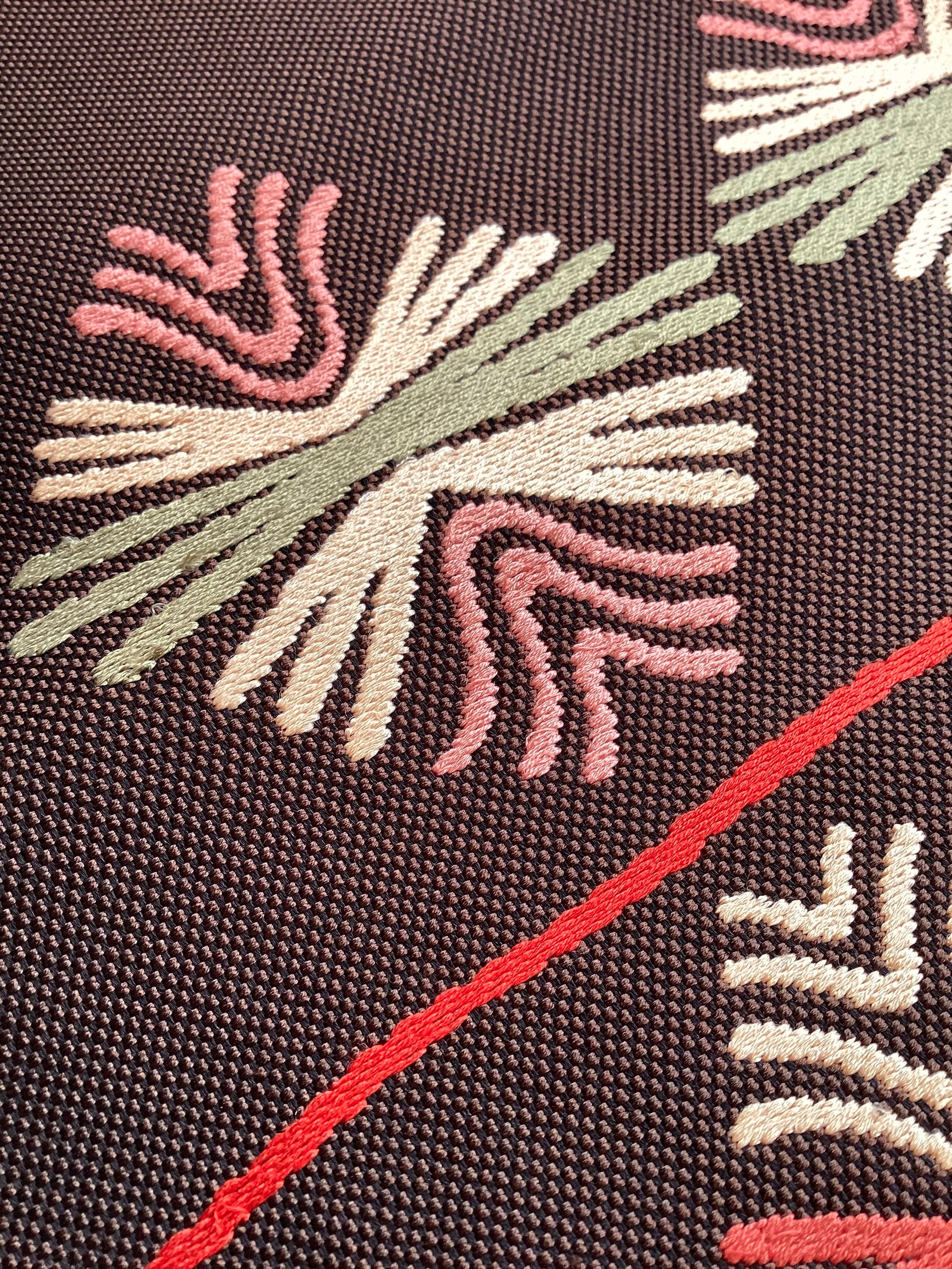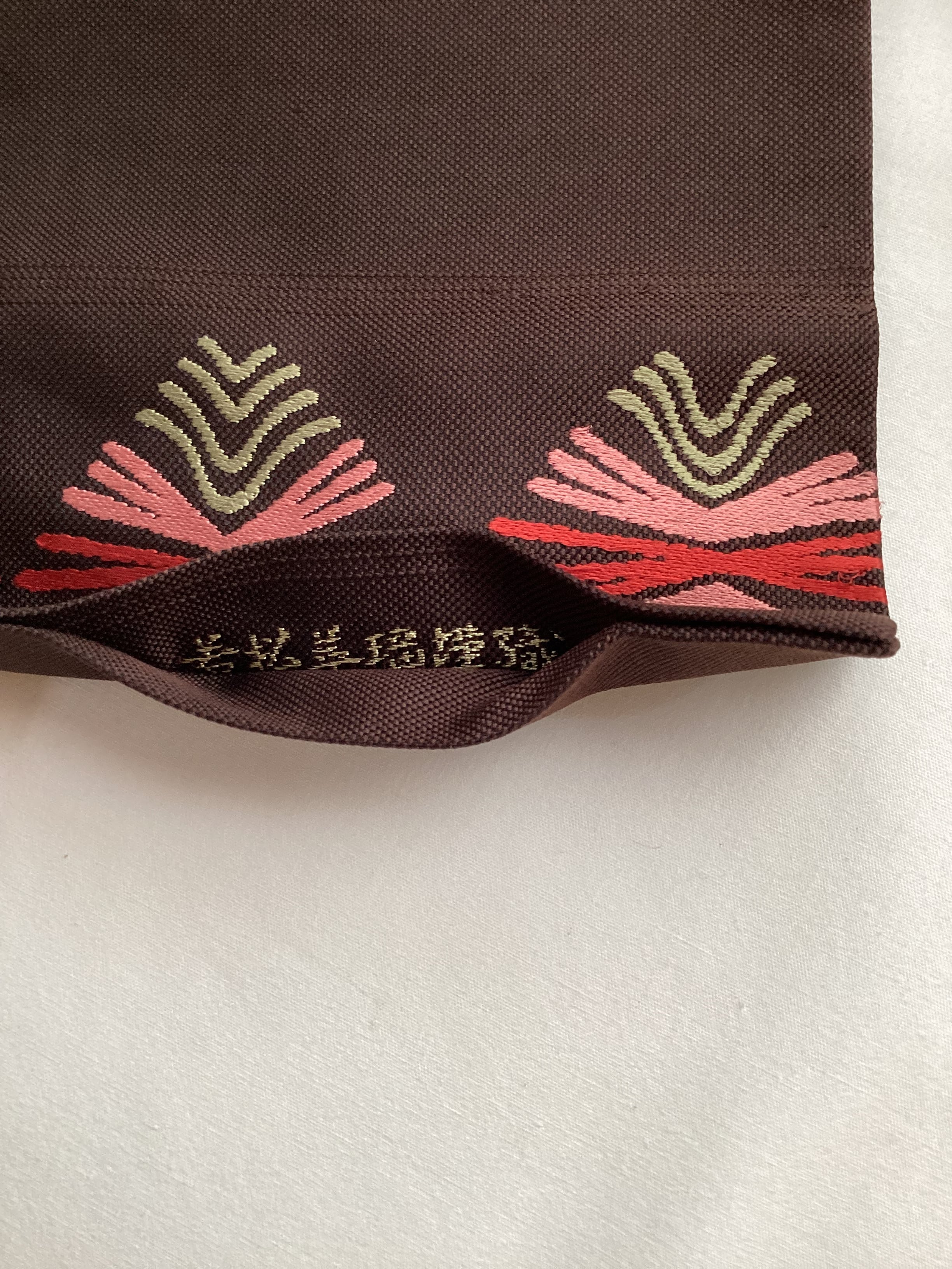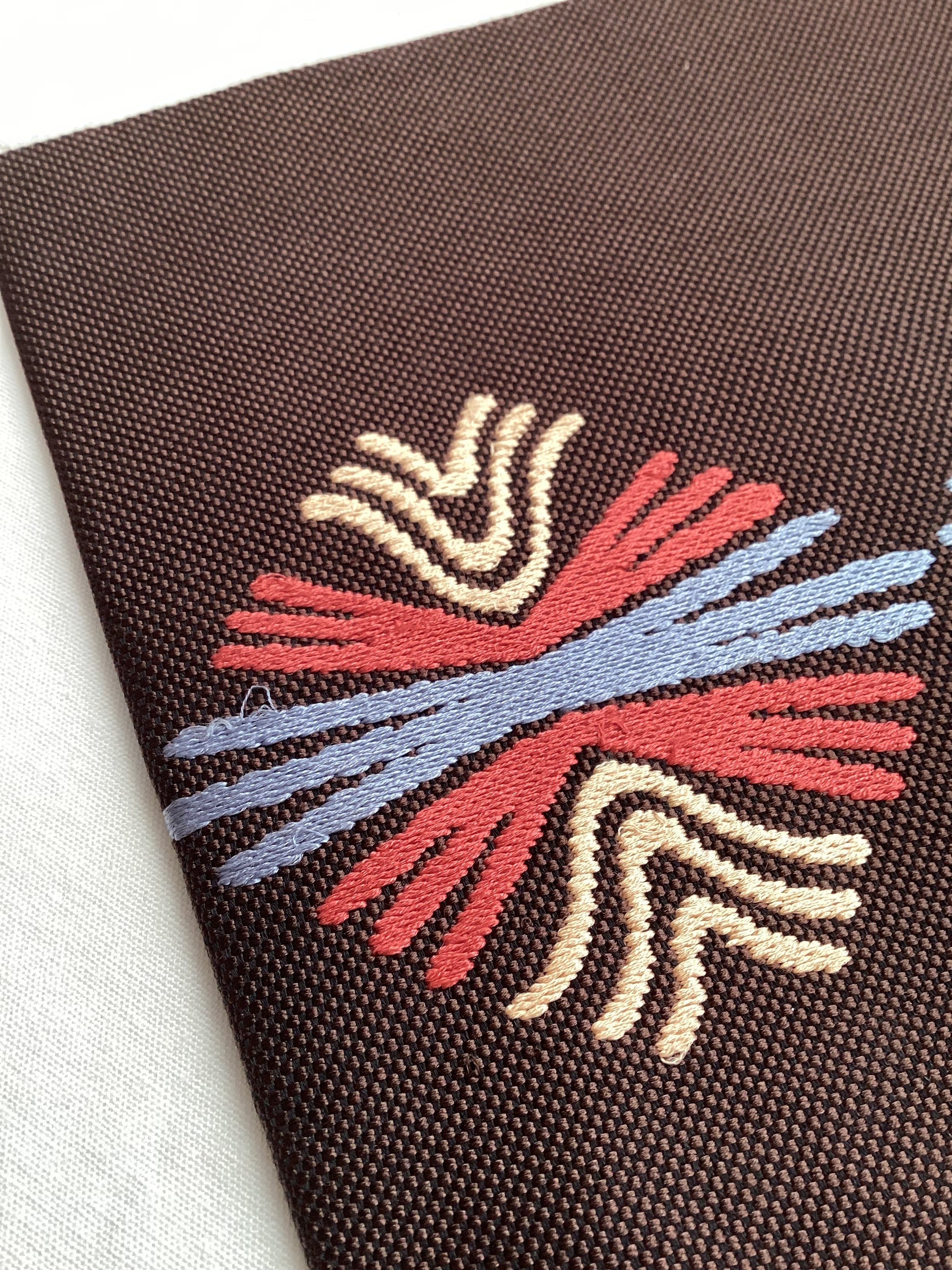 焦茶色のキャンバス地のような織地の上に松葉文様がスウェーデン刺繍で施された九寸なごや帯です。西陣織の名匠【若松華瑶】のこちらの帯は、和のモチーフである松葉文様をカラフルなスウェーデン刺繍で表現した洒落味のある逸品です。