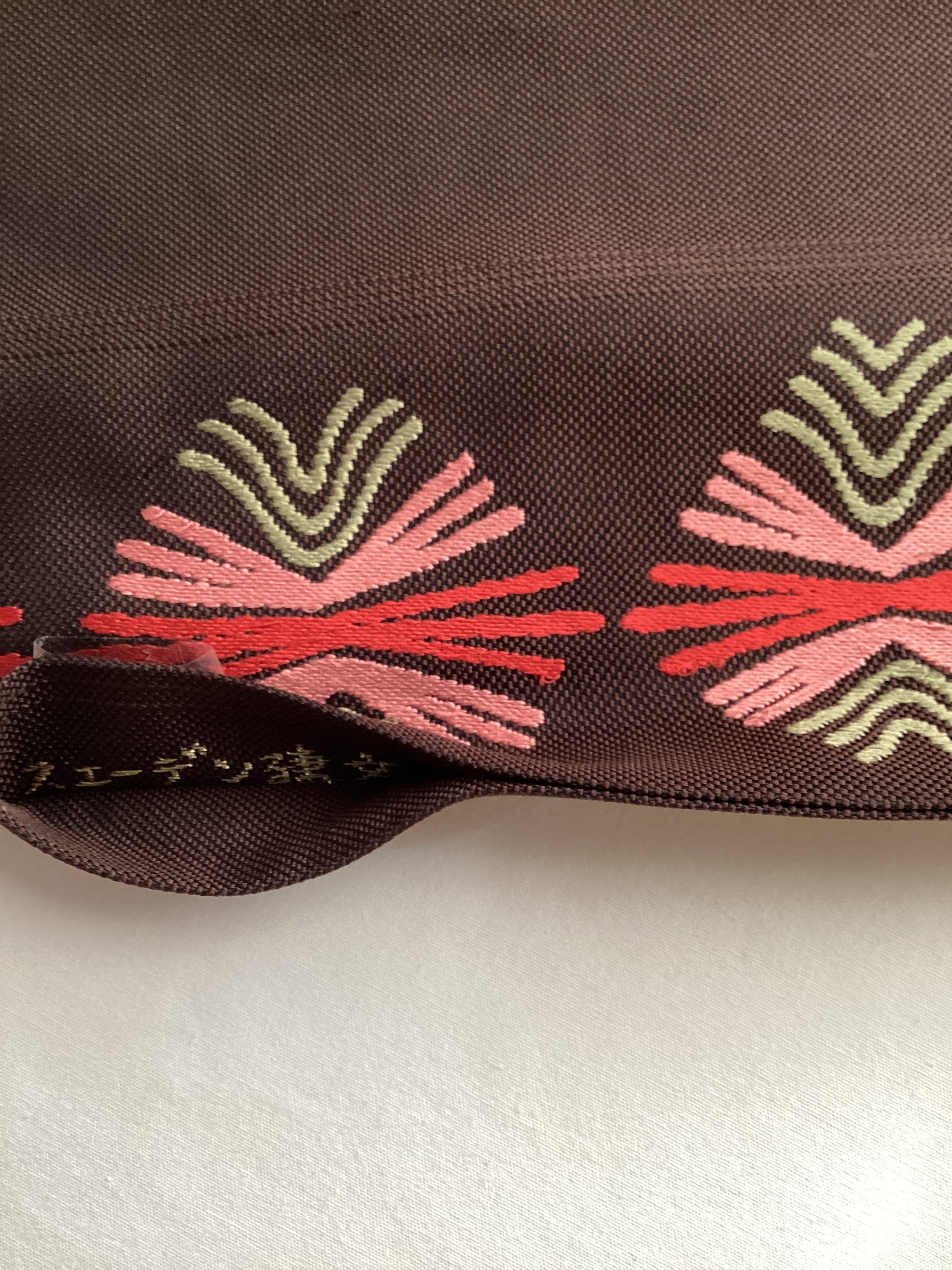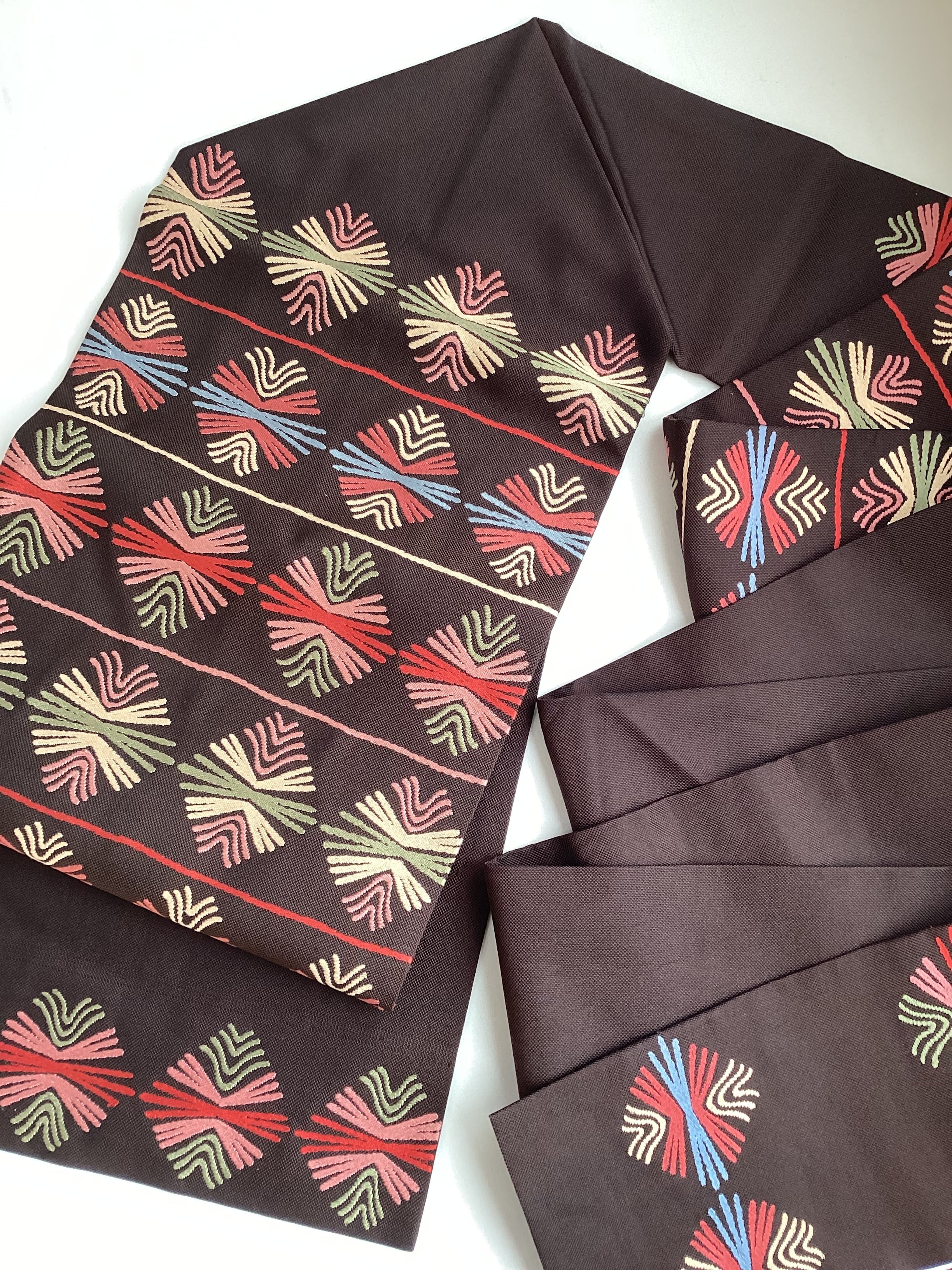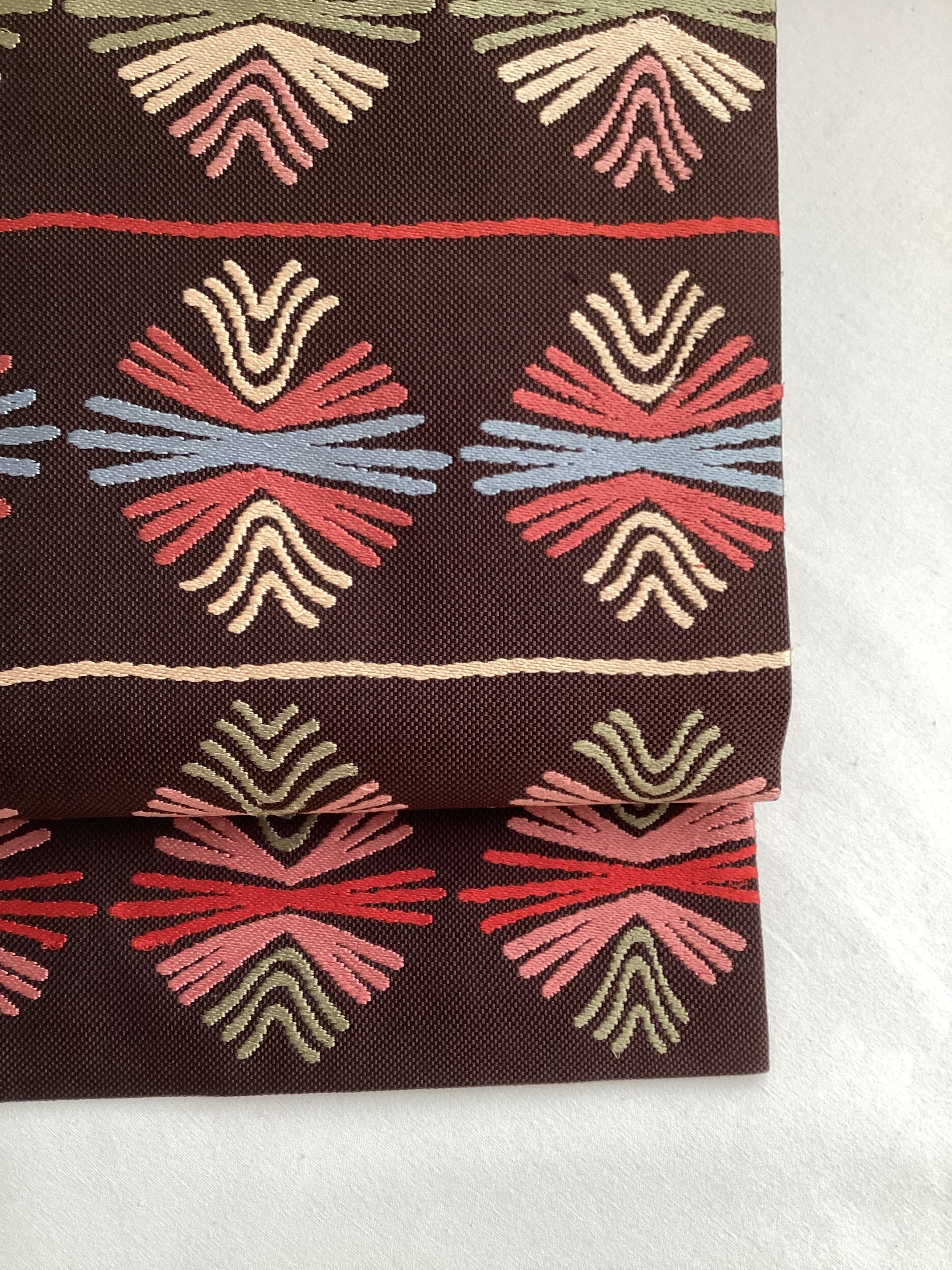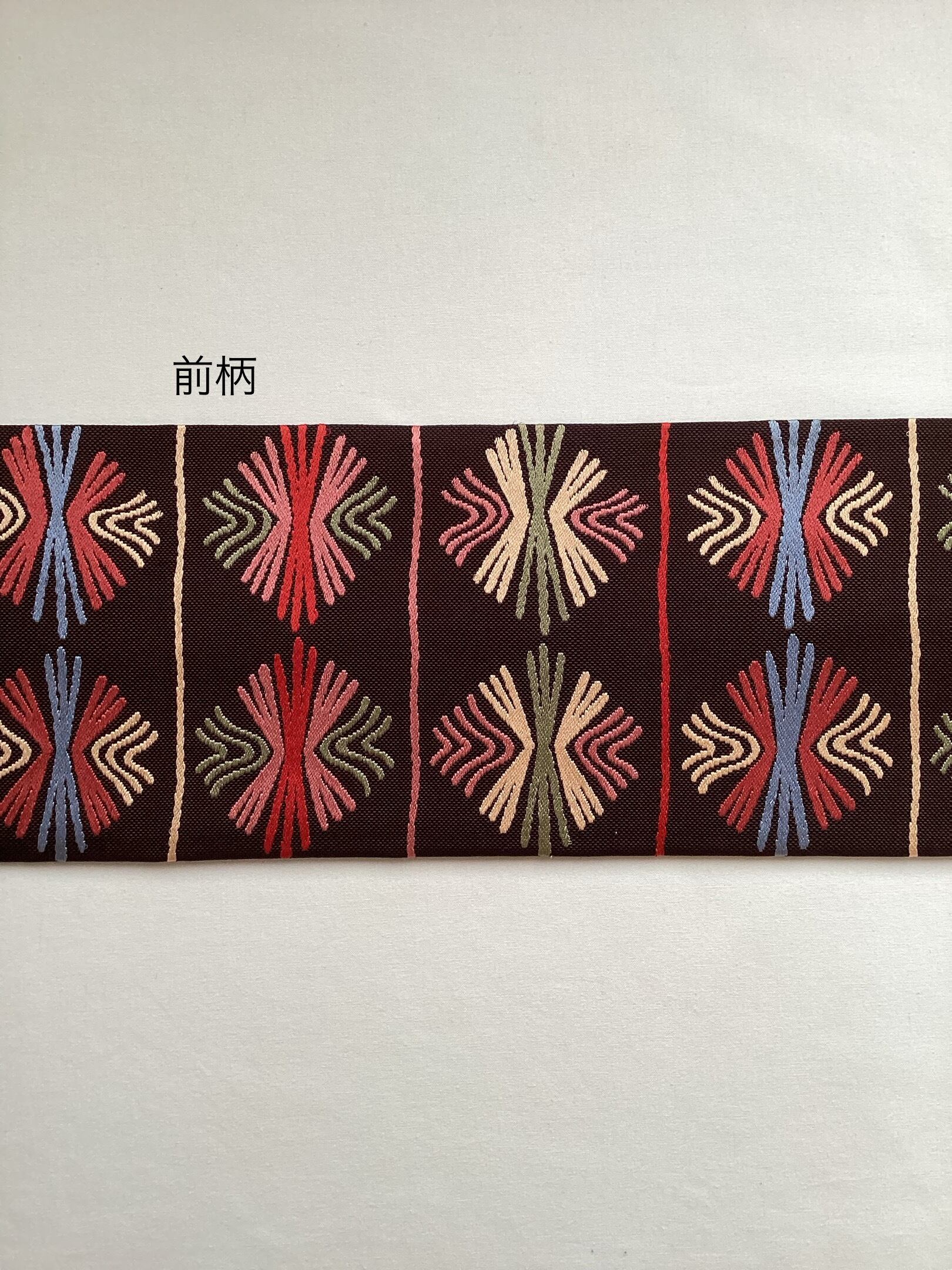 焦茶色地スウェーデン刺繍横段松葉文【若松華瑤】なごや帯 251215-7