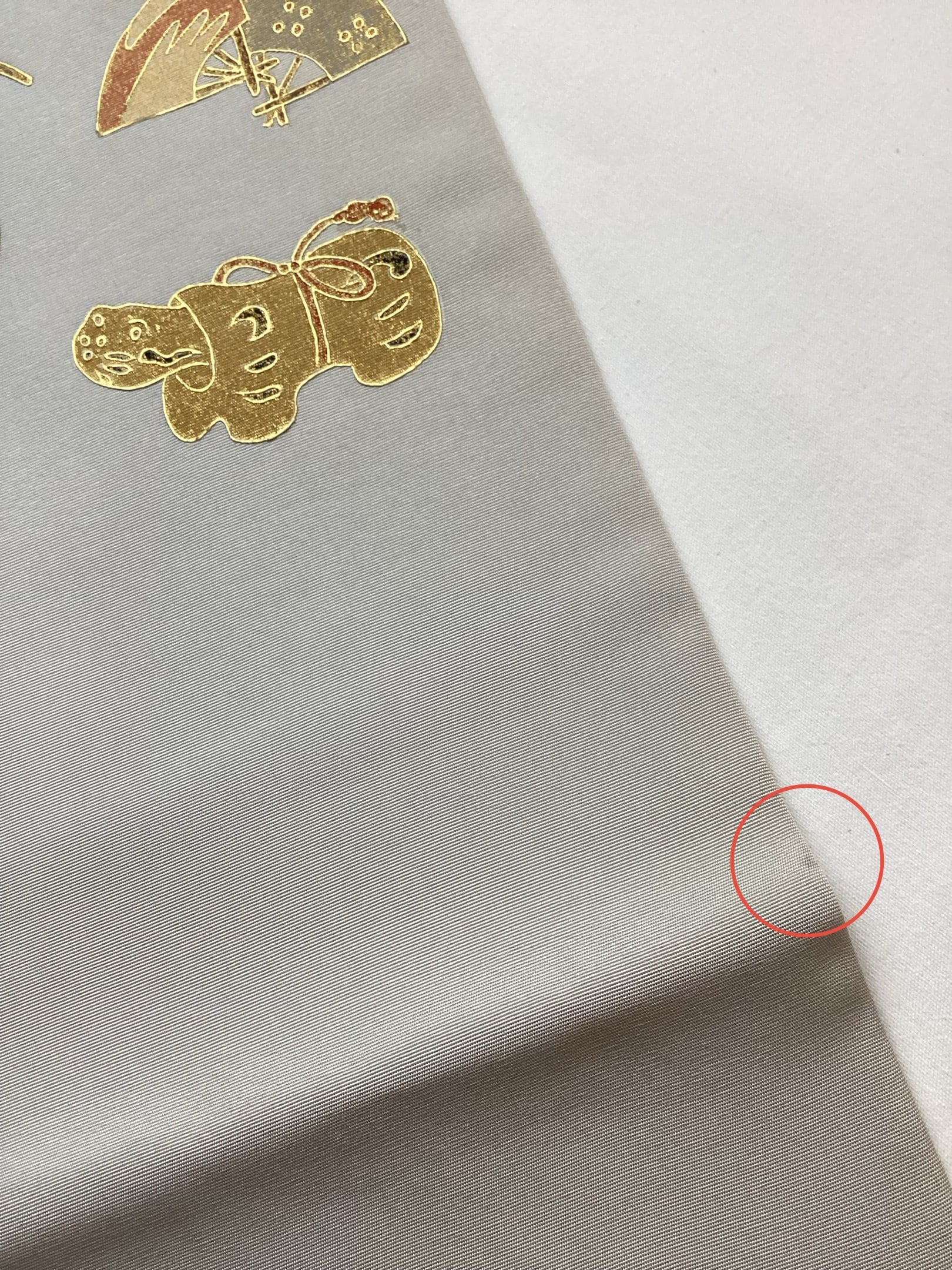 若干のヤケ、経年感がございますが、まだまだご着用いただきたい素敵な帯です。タレ先から約45㎝あたりに小さなシミがございます(画像16)。状態をご理解いただき、気にされる方はご購入をお控え下さい。