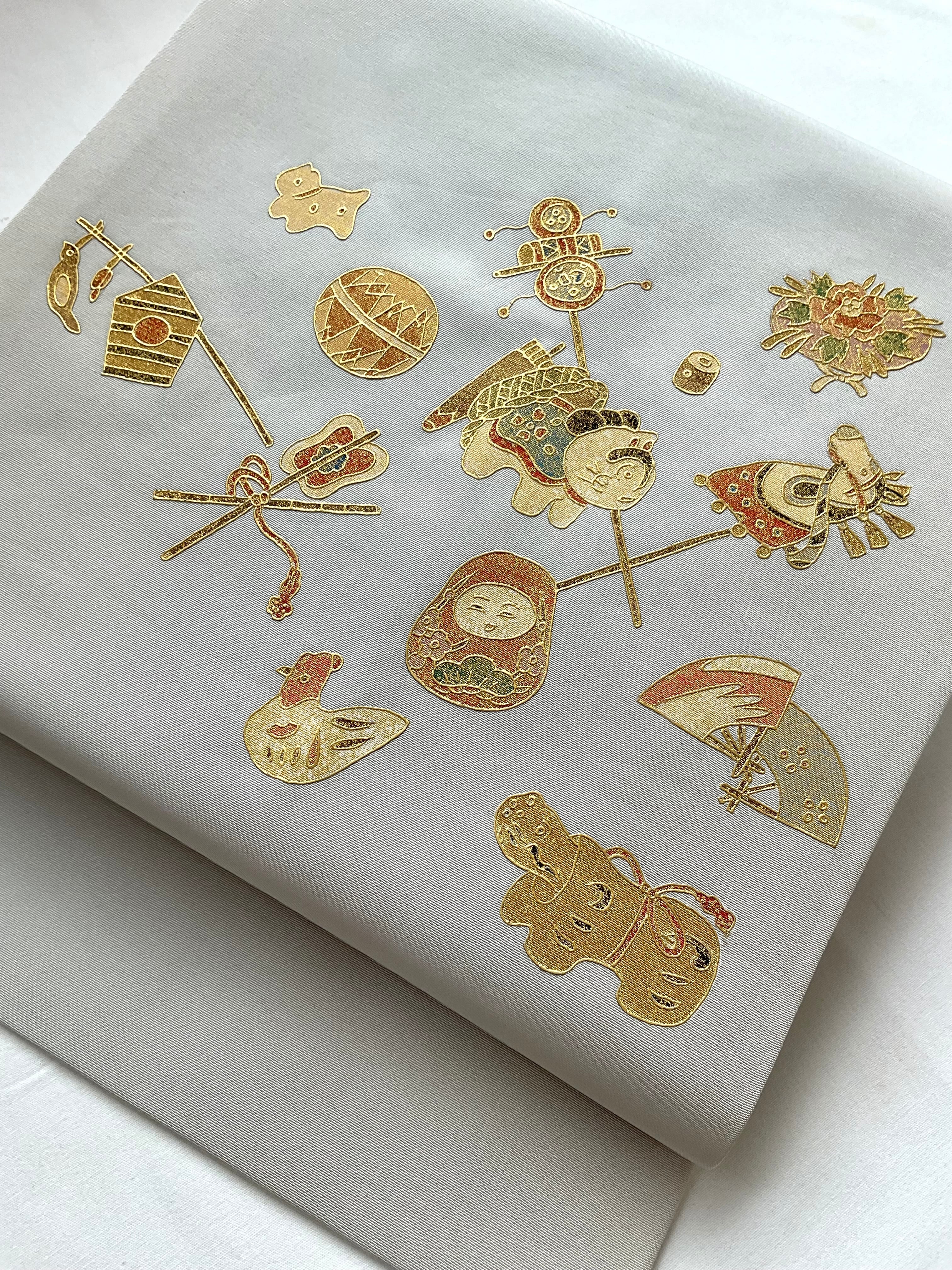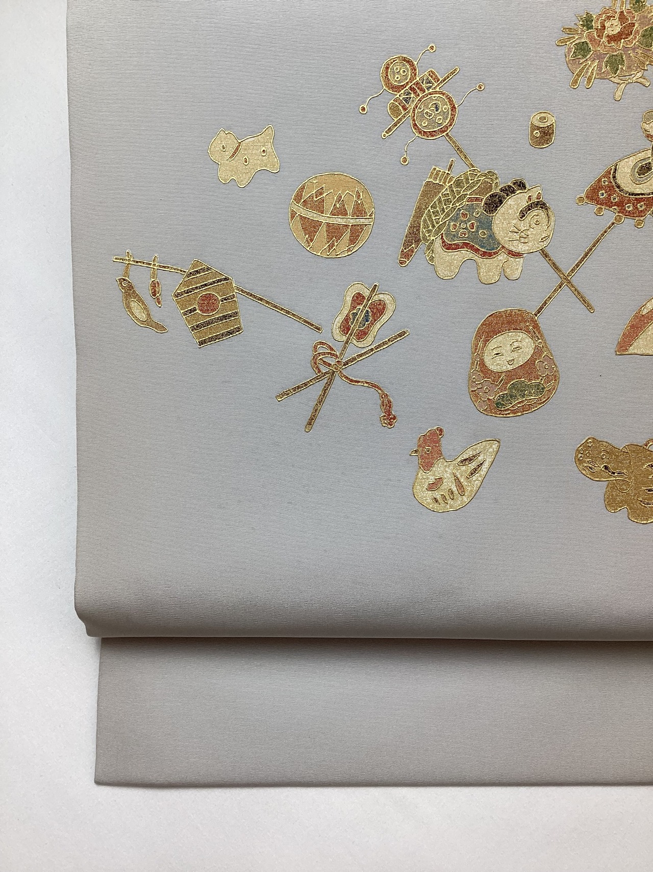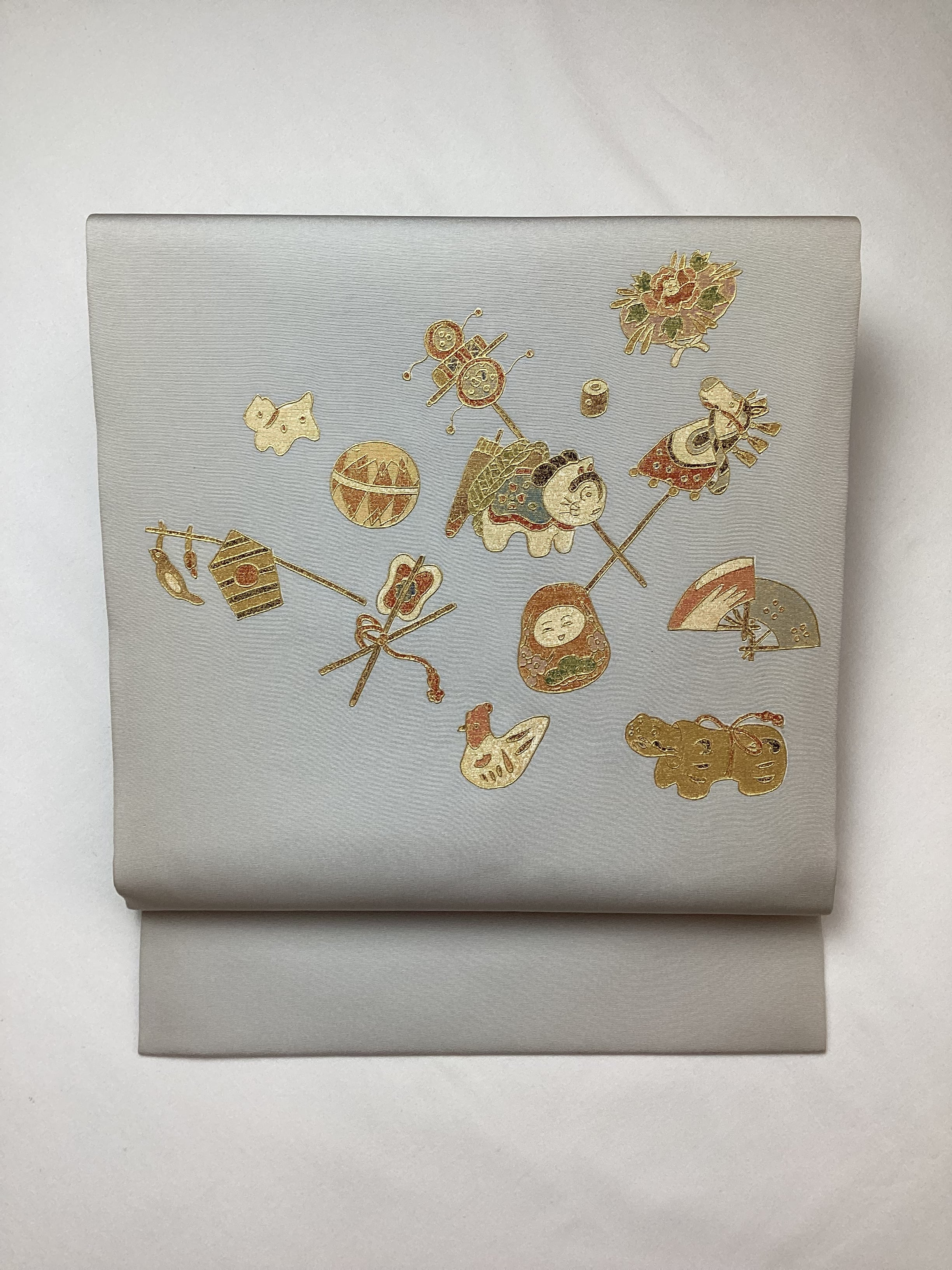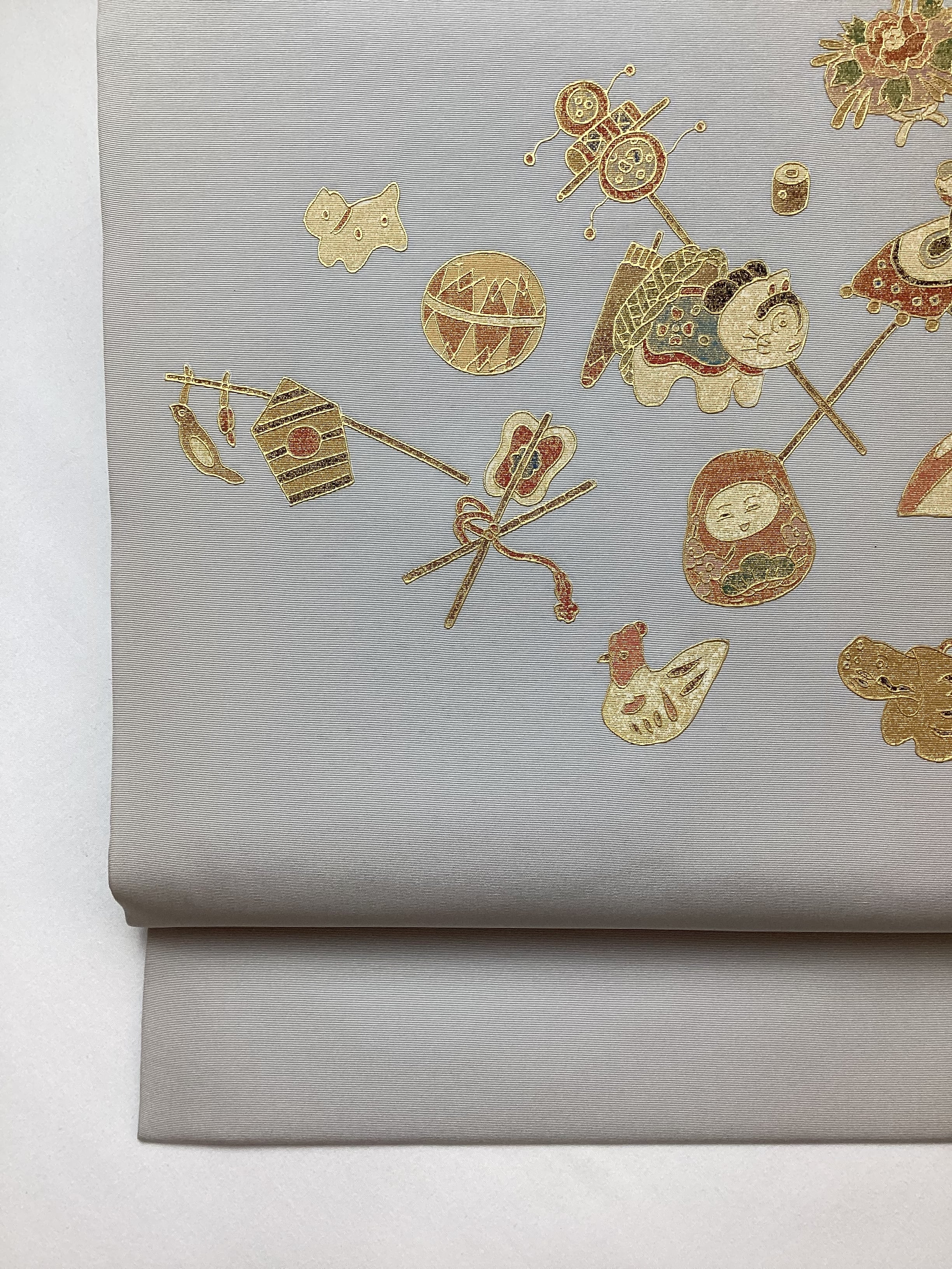灰水色の塩瀬地にでんでん太鼓や張子犬、鞠、軍配、扇‥‥などなどのおめでたい玩具が並んだなごや帯です。スッキリとしたお色目のベース地に金彩の縁取りが映えて、お祝いに華やかさも添えております。お正月やお祝いのお席や、お子様のお喜びのお席にお締めいただき、装いに祝う気持ちも纏ってみてはいかがでしょうか。