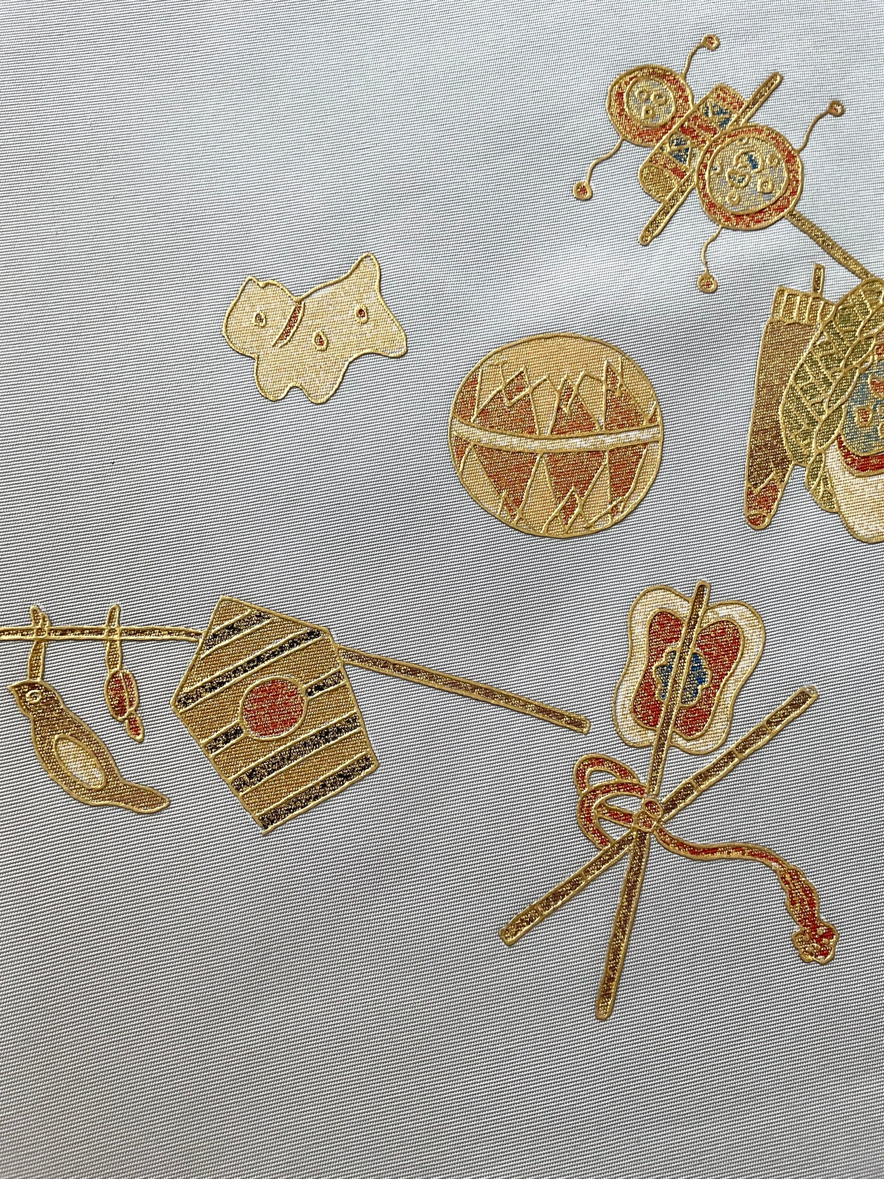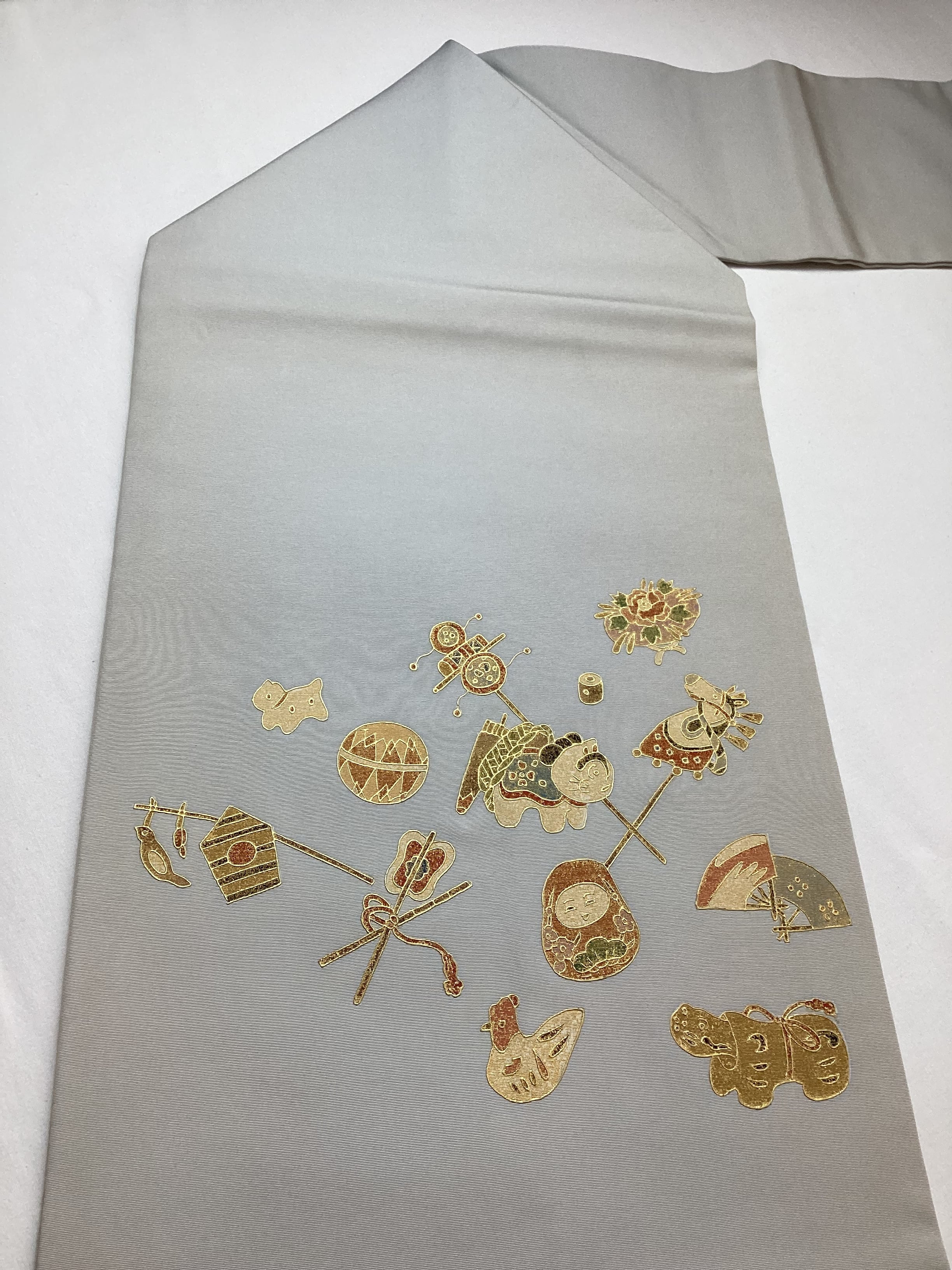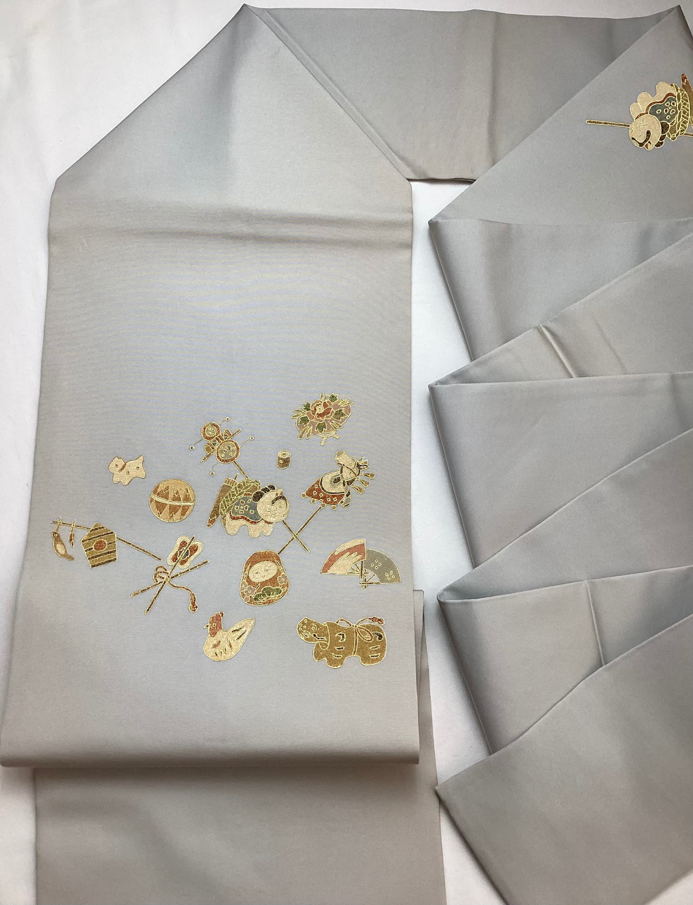 灰水色の塩瀬地にでんでん太鼓や張子犬、鞠、軍配、扇‥‥などなどのおめでたい玩具が並んだなごや帯です。スッキリとしたお色目のベース地に金彩の縁取りが映えて、お祝いに華やかさも添えております。お正月やお祝いのお席や、お子様のお喜びのお席にお締めいただき、装いに祝う気持ちも纏ってみてはいかがでしょうか。