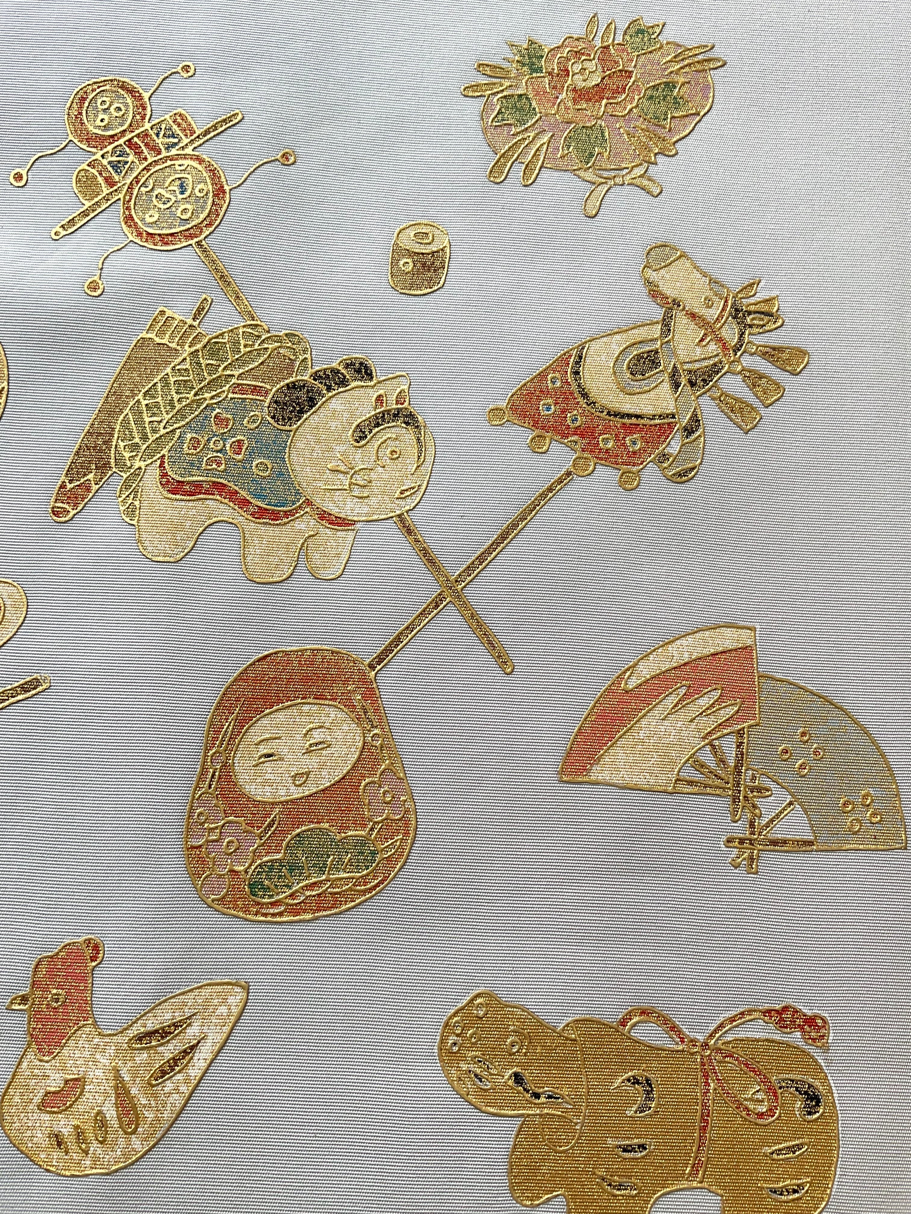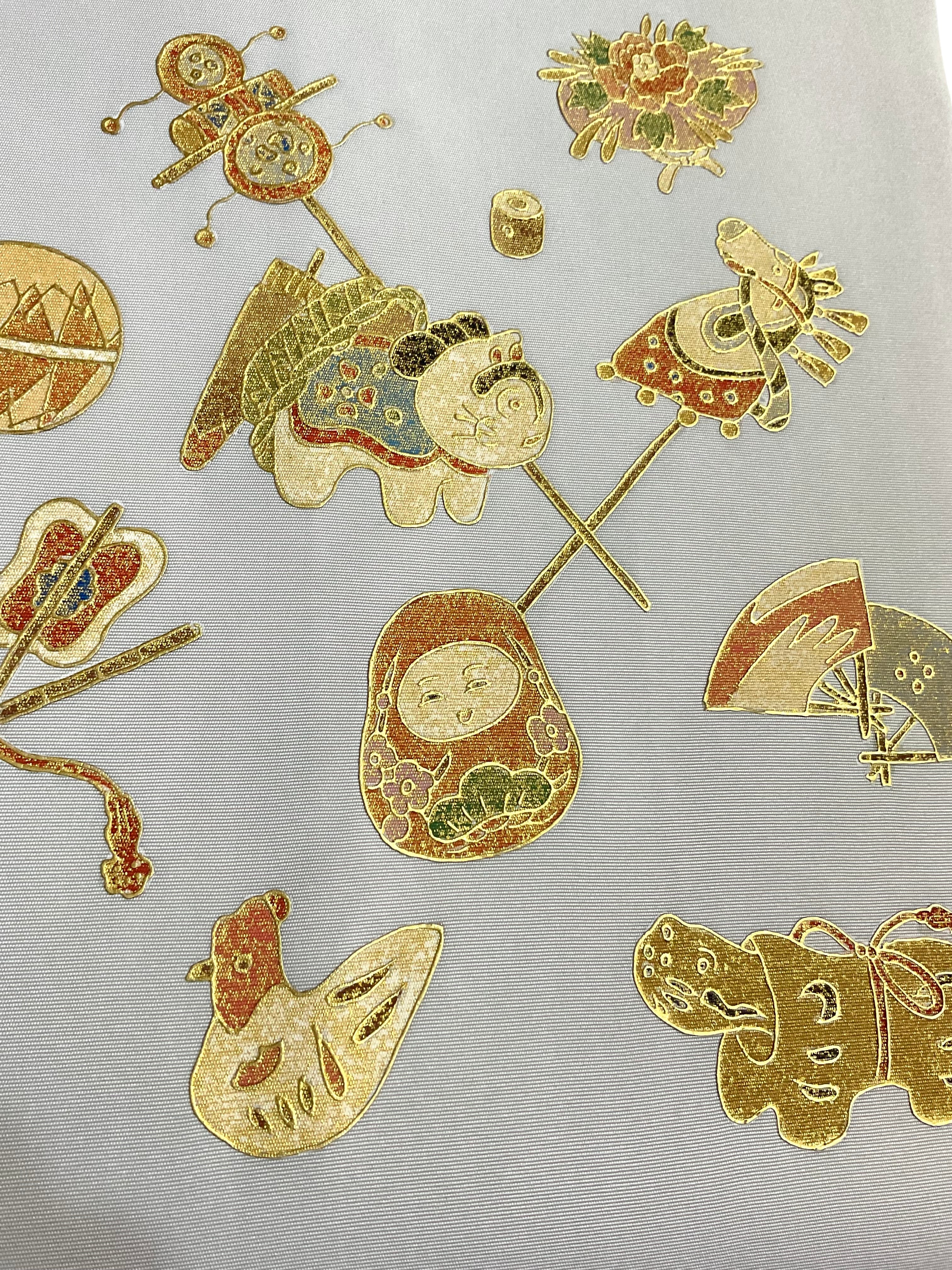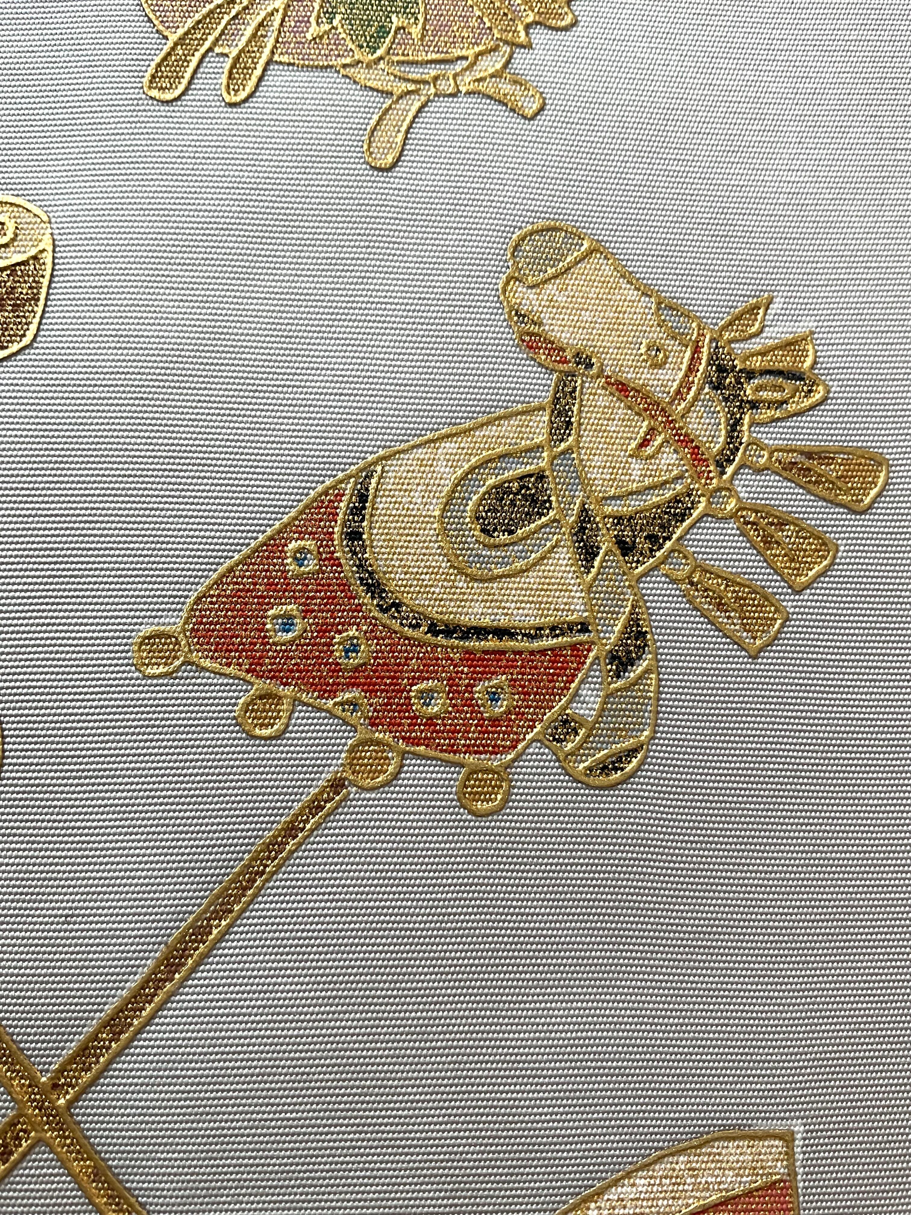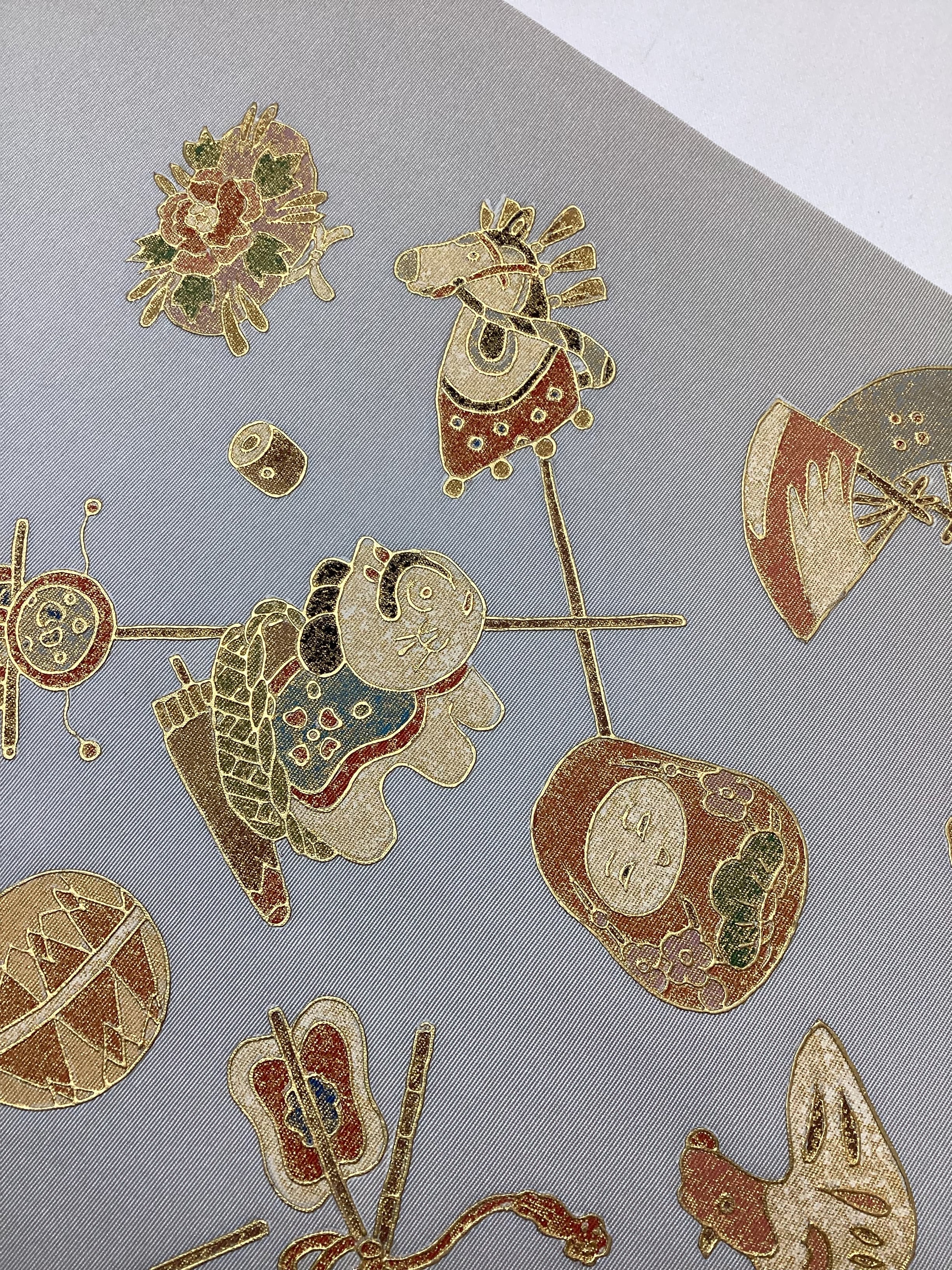 灰水色の塩瀬地にでんでん太鼓や張子犬、鞠、軍配、扇‥‥などなどのおめでたい玩具が並んだなごや帯です。スッキリとしたお色目のベース地に金彩の縁取りが映えて、お祝いに華やかさも添えております。お正月やお祝いのお席や、お子様のお喜びのお席にお締めいただき、装いに祝う気持ちも纏ってみてはいかがでしょうか。
