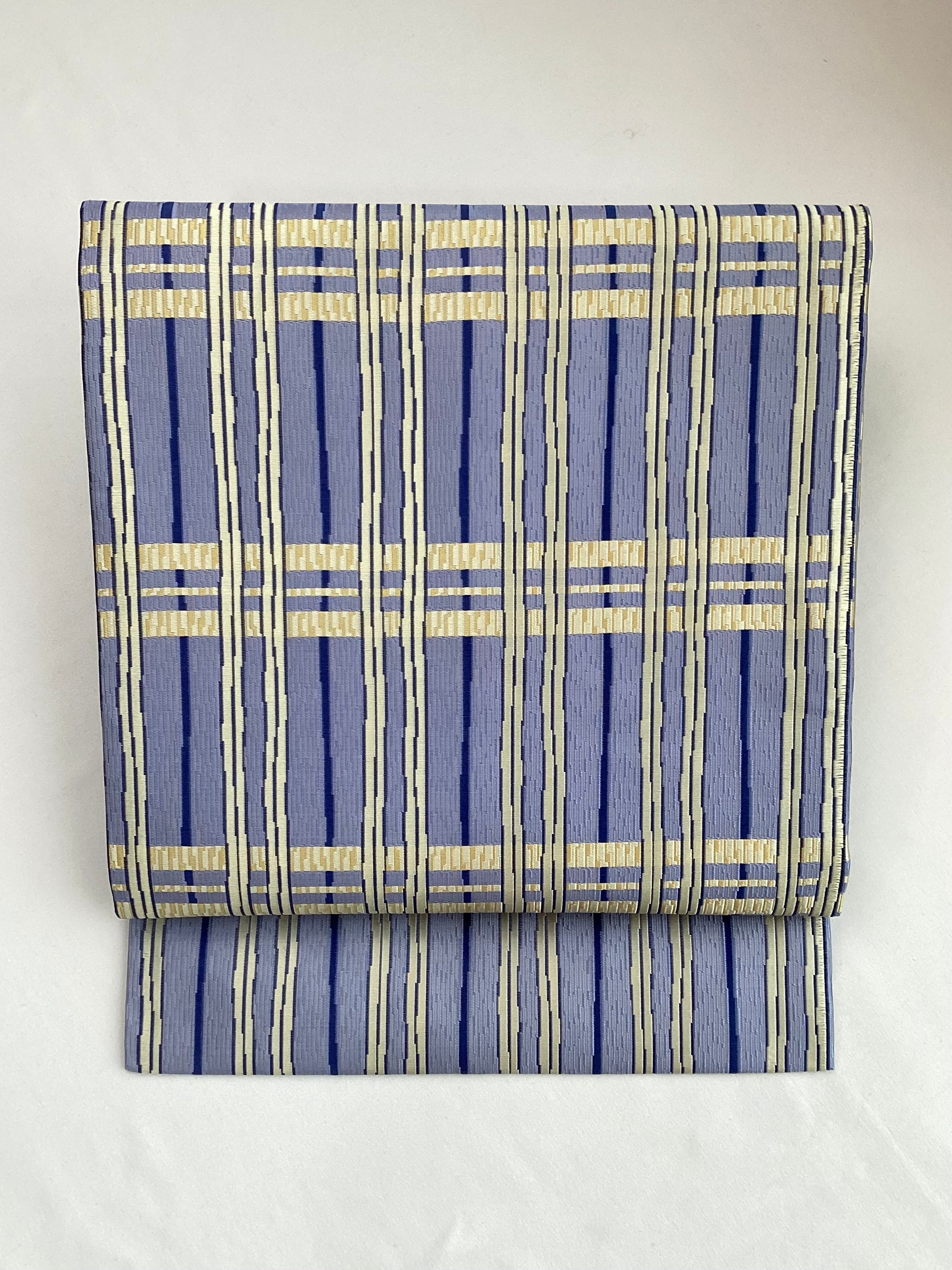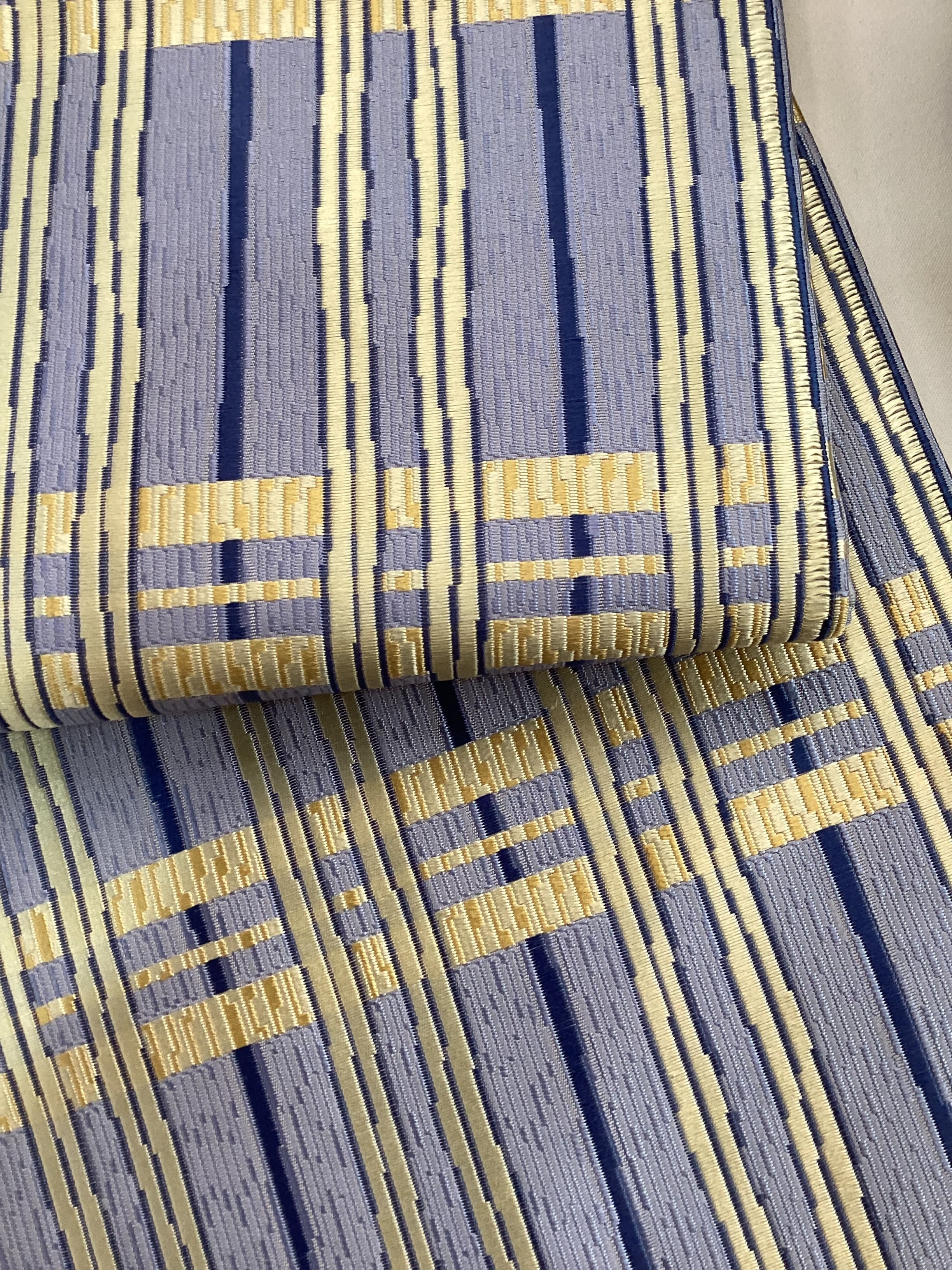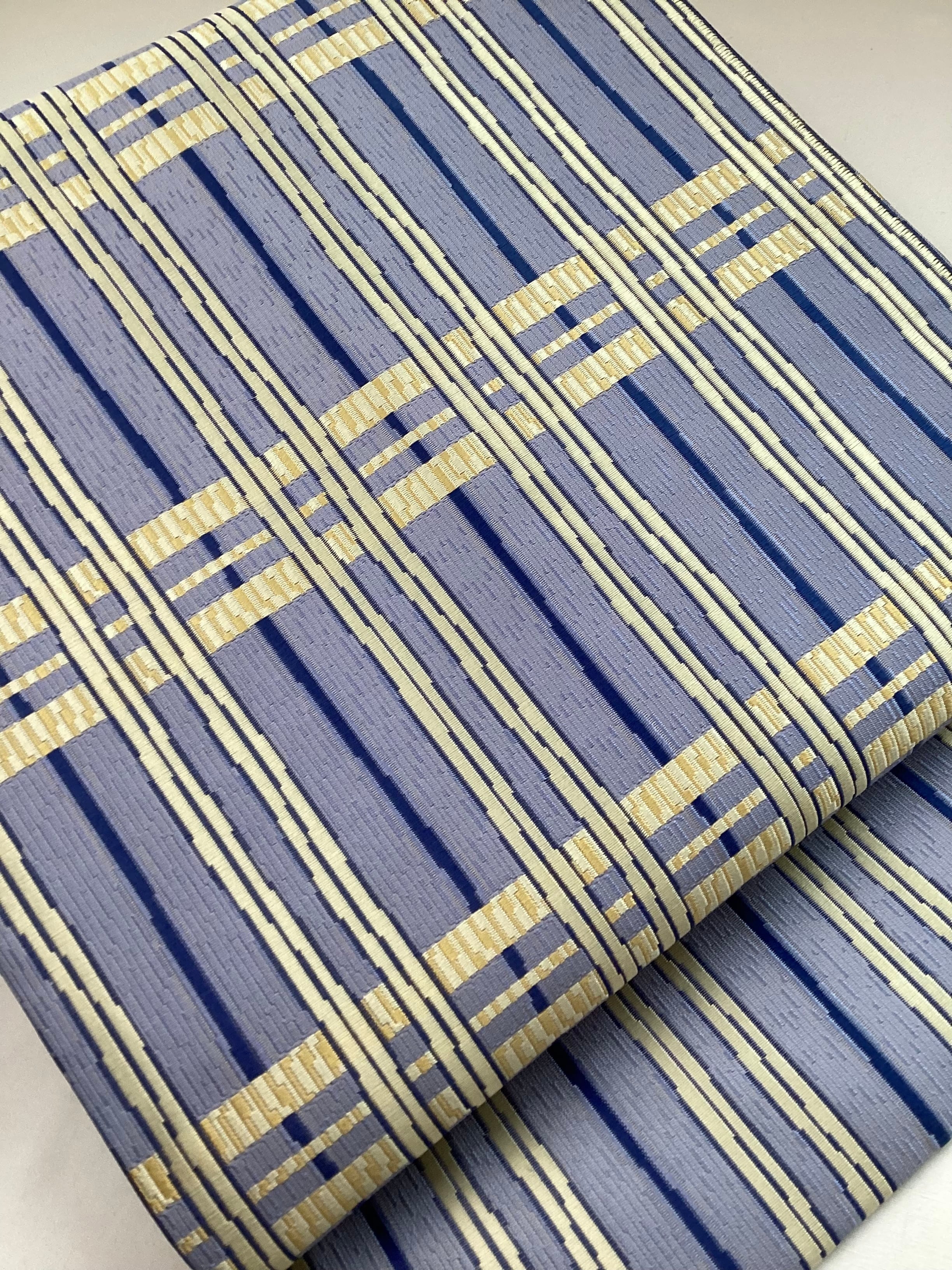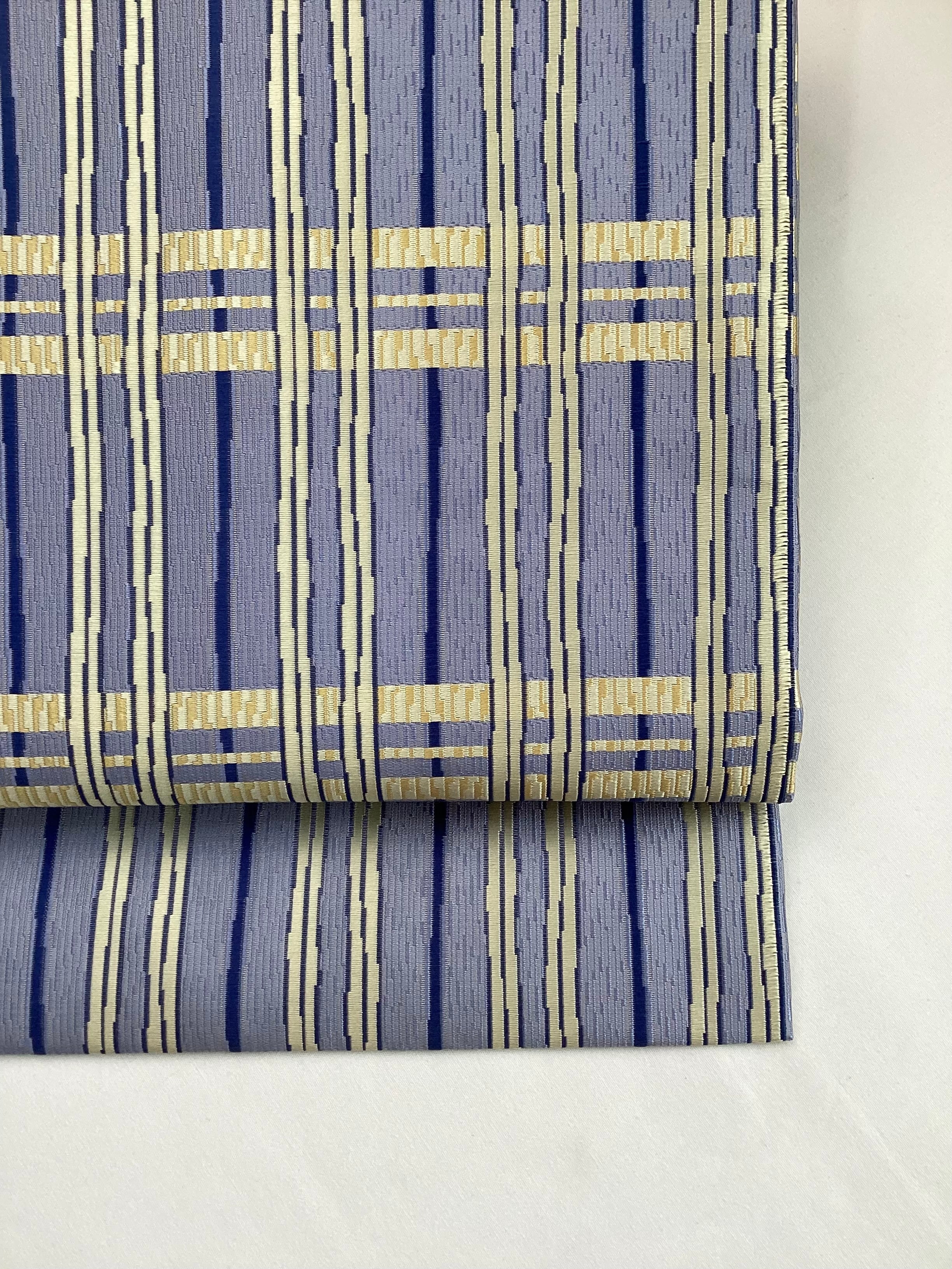 ぽこぽこと立体感のある織地で絹糸の光沢感が引き立ち、美しい艶のあるなごや帯です。青藤色に薄黄色のラインが爽やかなこちらの帯は、西陣の中でも抜群のセンスに定評のある【山田織物】の九寸帯です。織の技と柄文様の色合いがマッチして、馴染みのある間道文様に現代的な雰囲気を持たせています。張りのあるしっかりとした地風とお仕立てなので、オタイコが美しく決まります。
