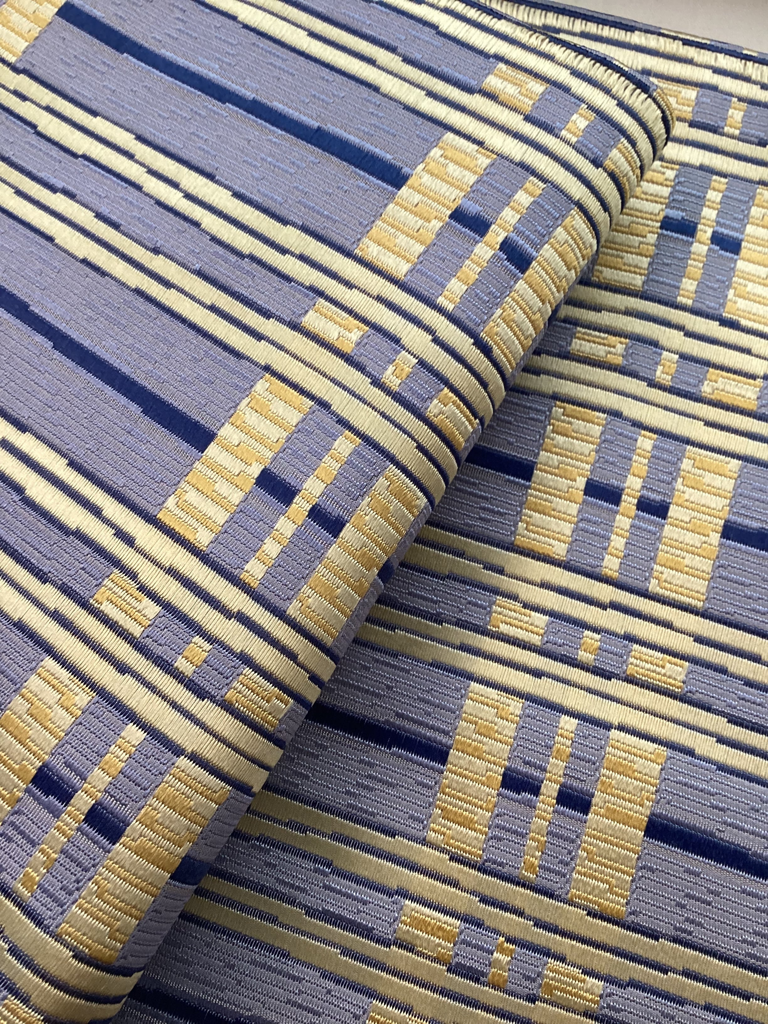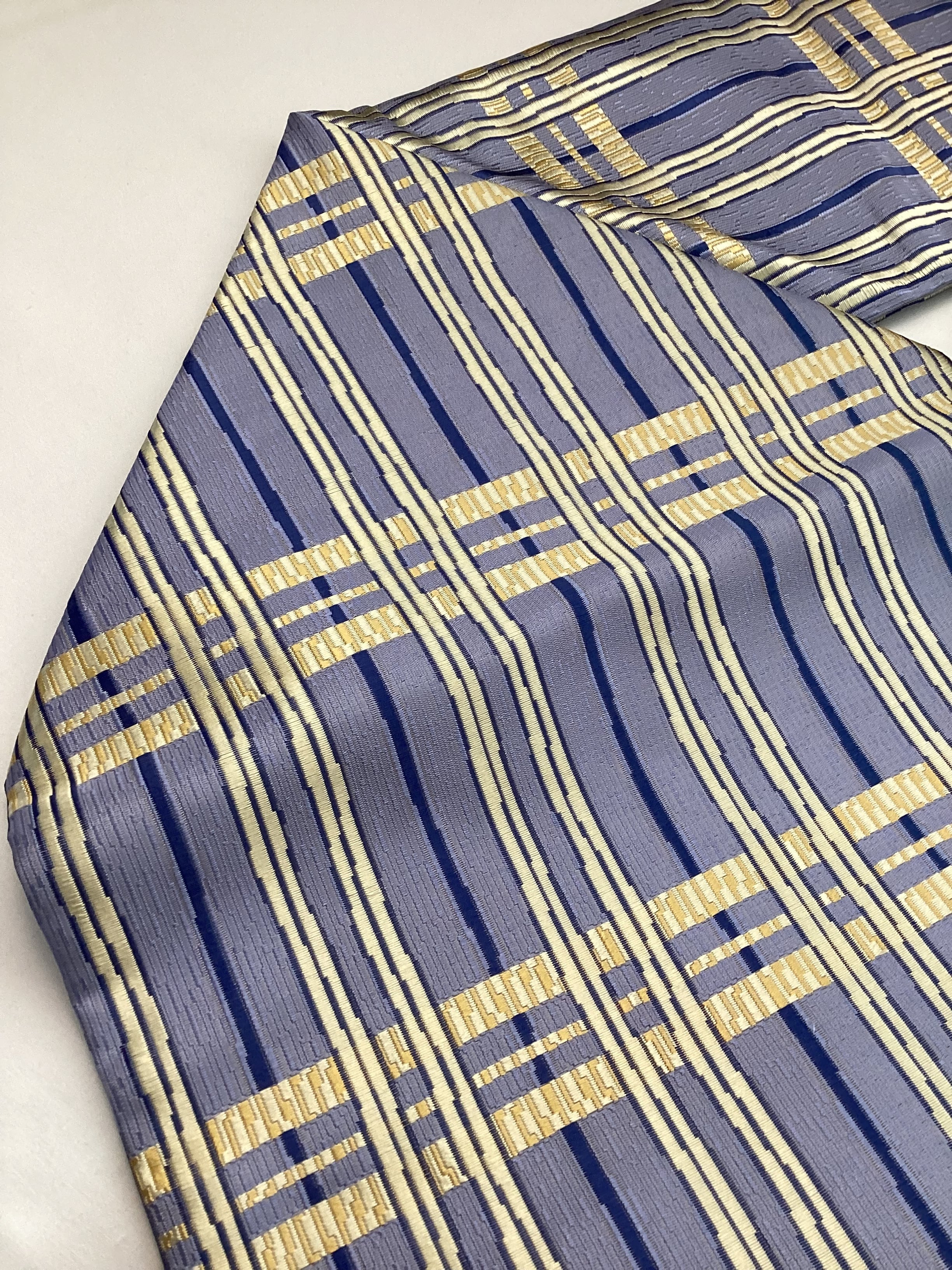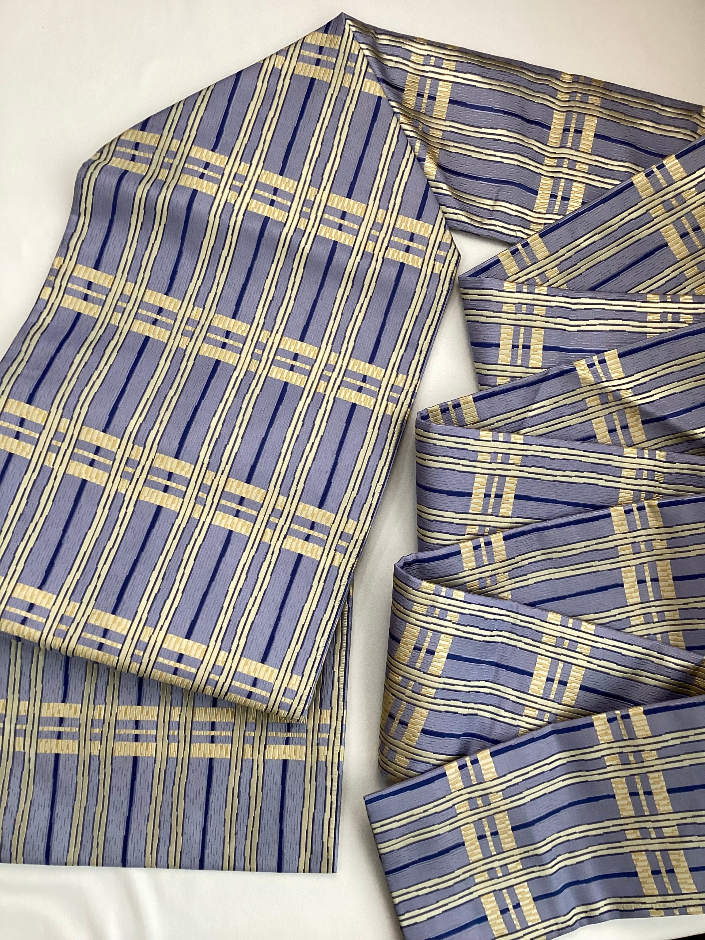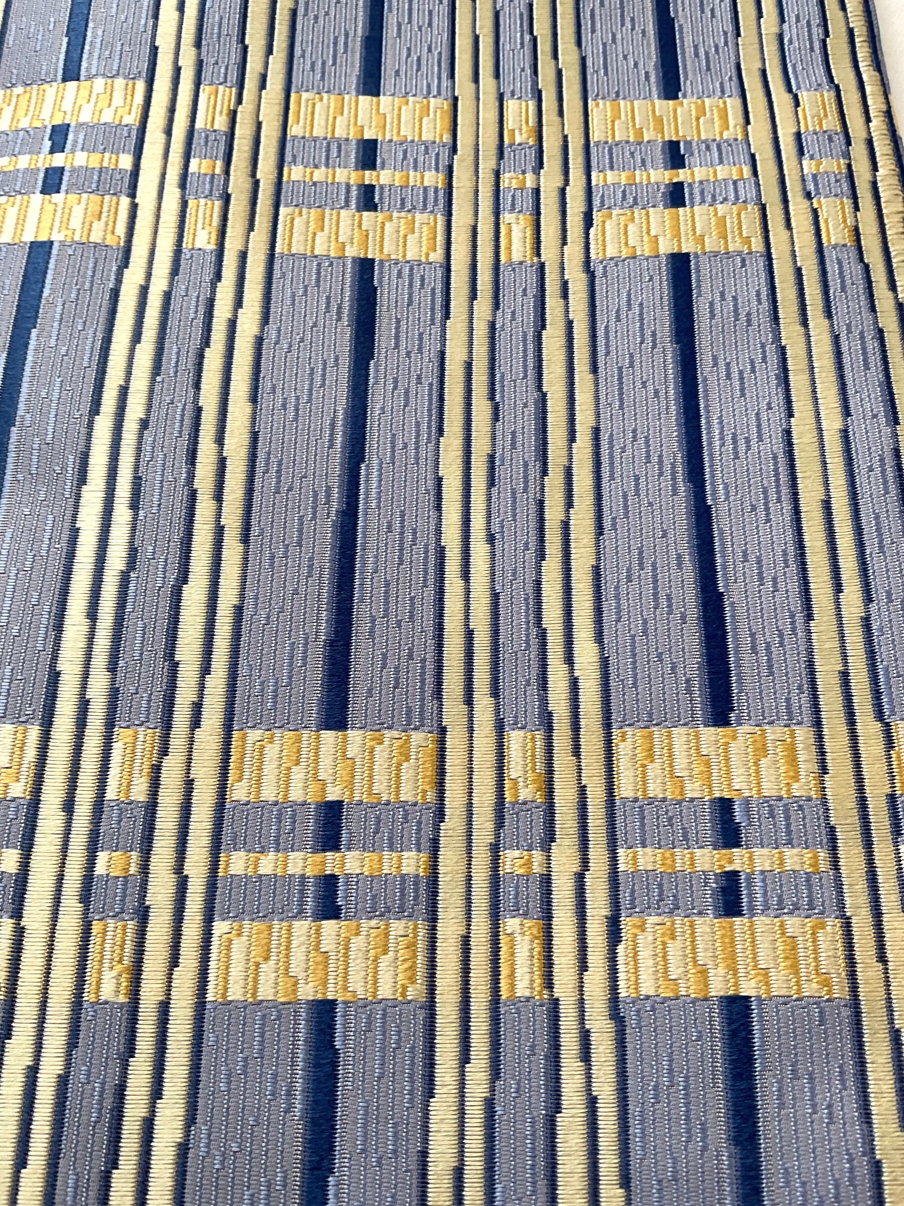 ぽこぽこと立体感のある織地で絹糸の光沢感が引き立ち、美しい艶のあるなごや帯です。青藤色に薄黄色のラインが爽やかなこちらの帯は、西陣の中でも抜群のセンスに定評のある【山田織物】の九寸帯です。織の技と柄文様の色合いがマッチして、馴染みのある間道文様に現代的な雰囲気を持たせています。張りのあるしっかりとした地風とお仕立てなので、オタイコが美しく決まります。