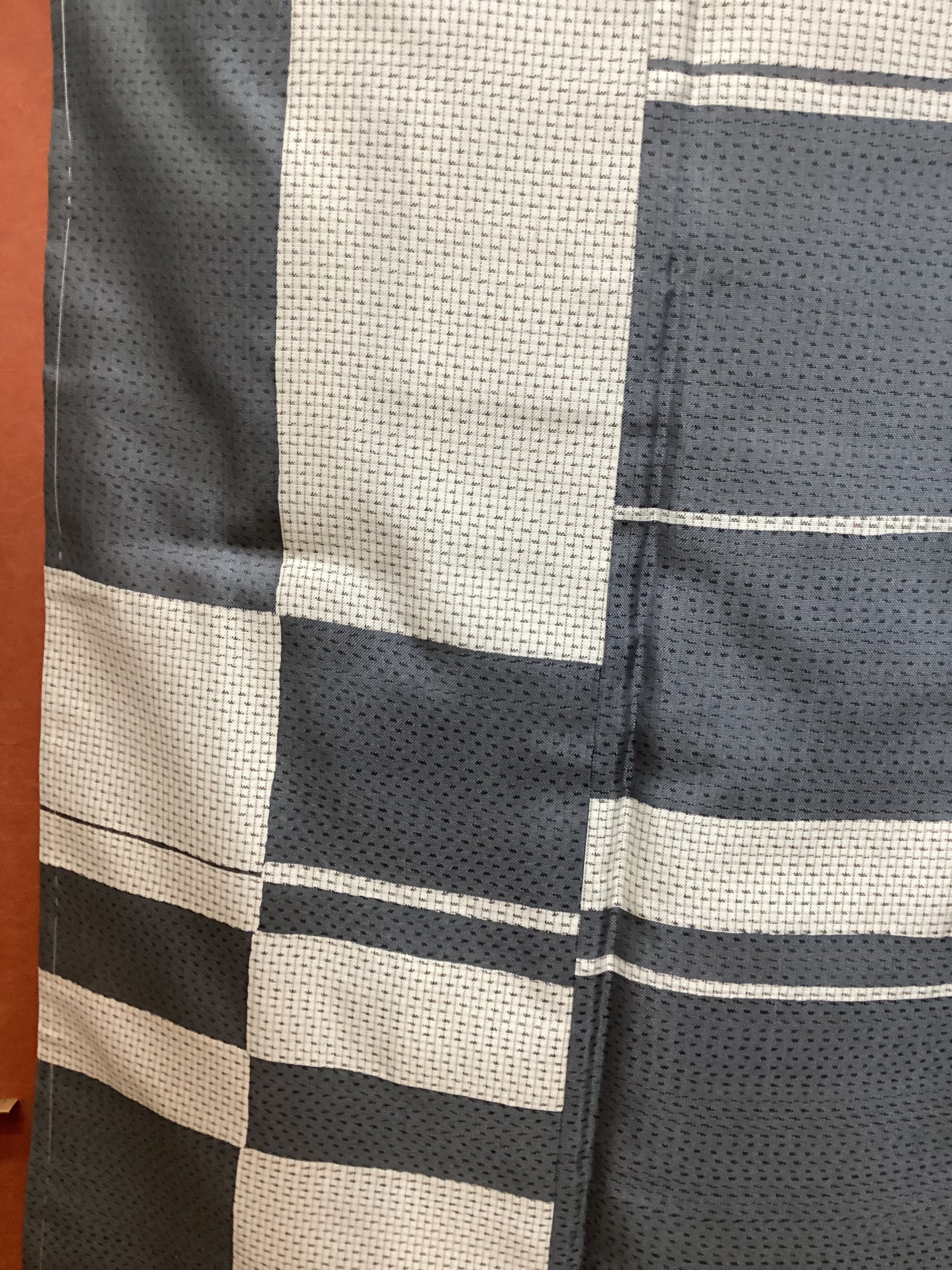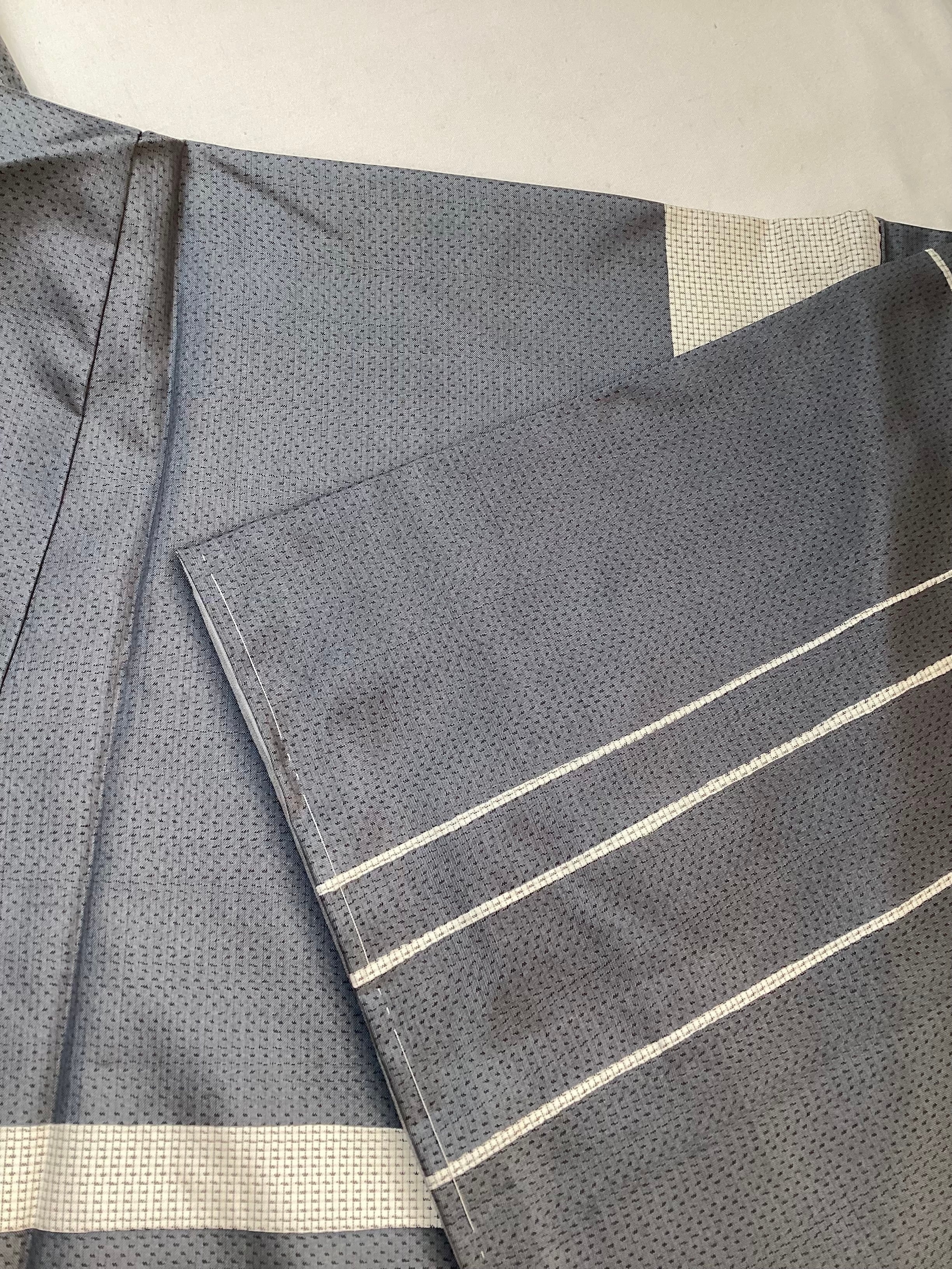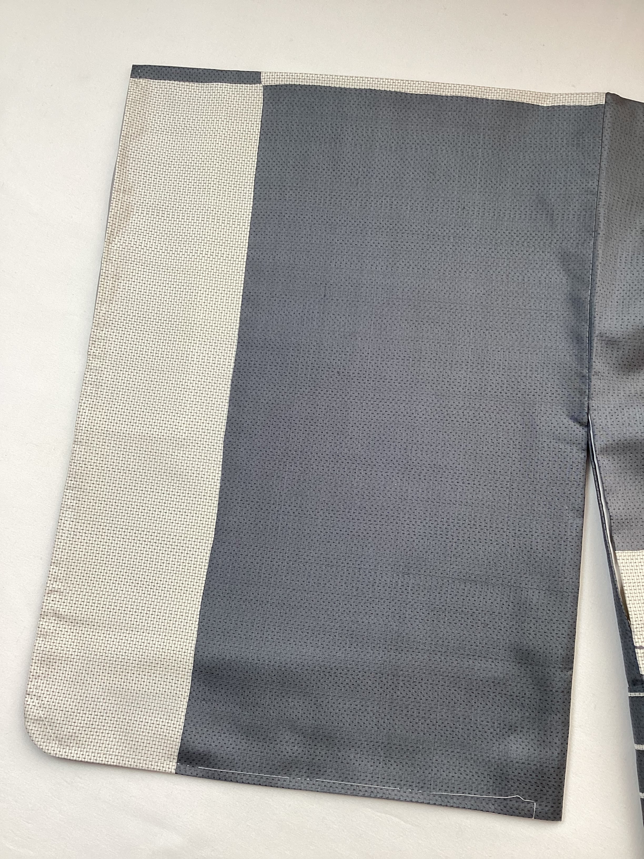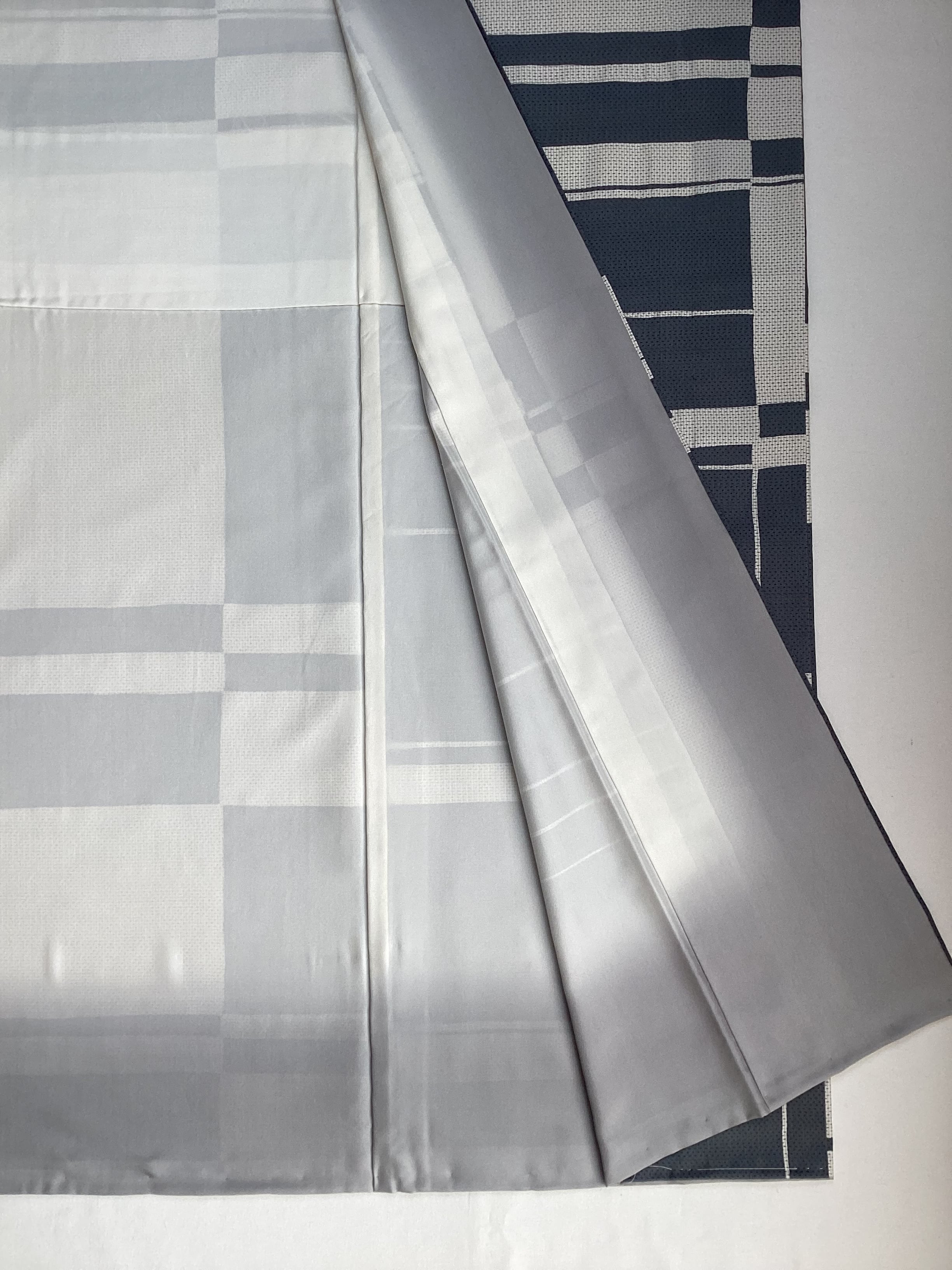 つるりとした肌触りで艶があり軽やかな紬きものです。白地に蚊絣文様に織られた紬地の上に、濃いグレーの染料で、ランダムで変化のある大格子文様が染めてあります。モノトーン調のベーシックなお色目と、変化のあるブロック文様がスッキリとした洒落味のあるお品です。