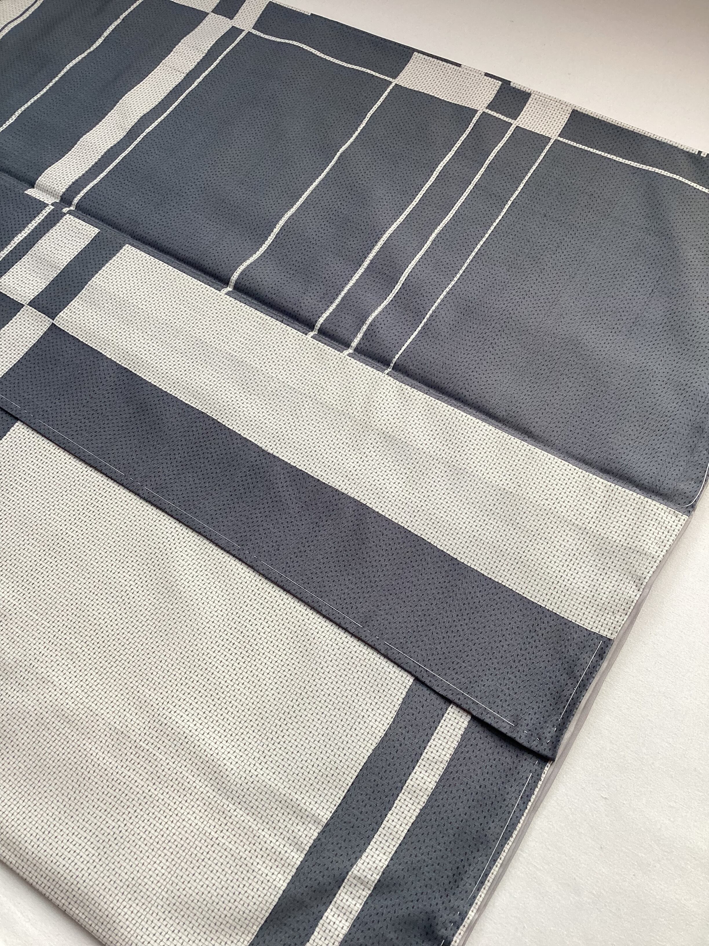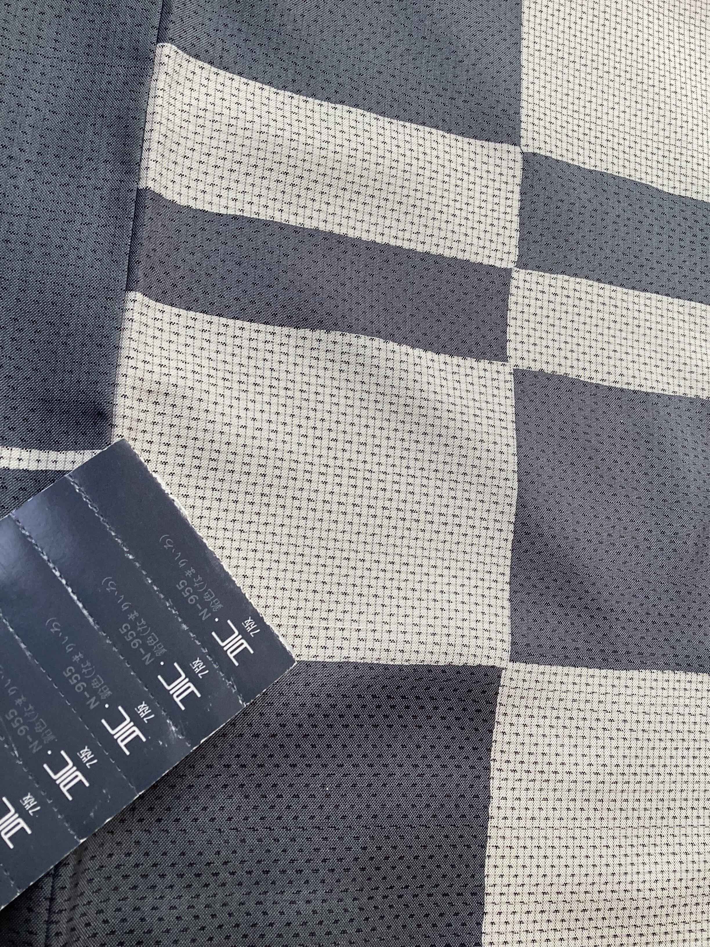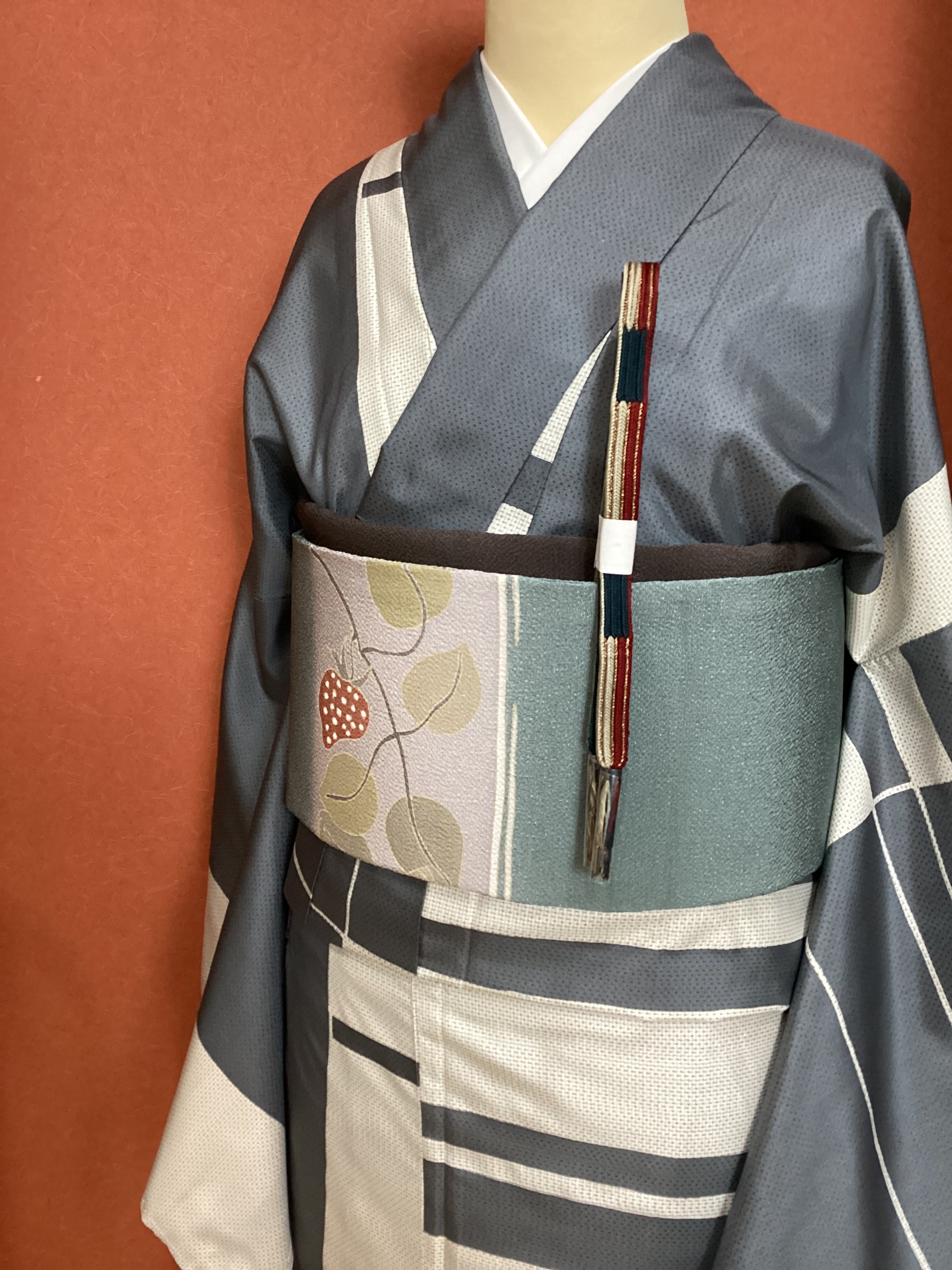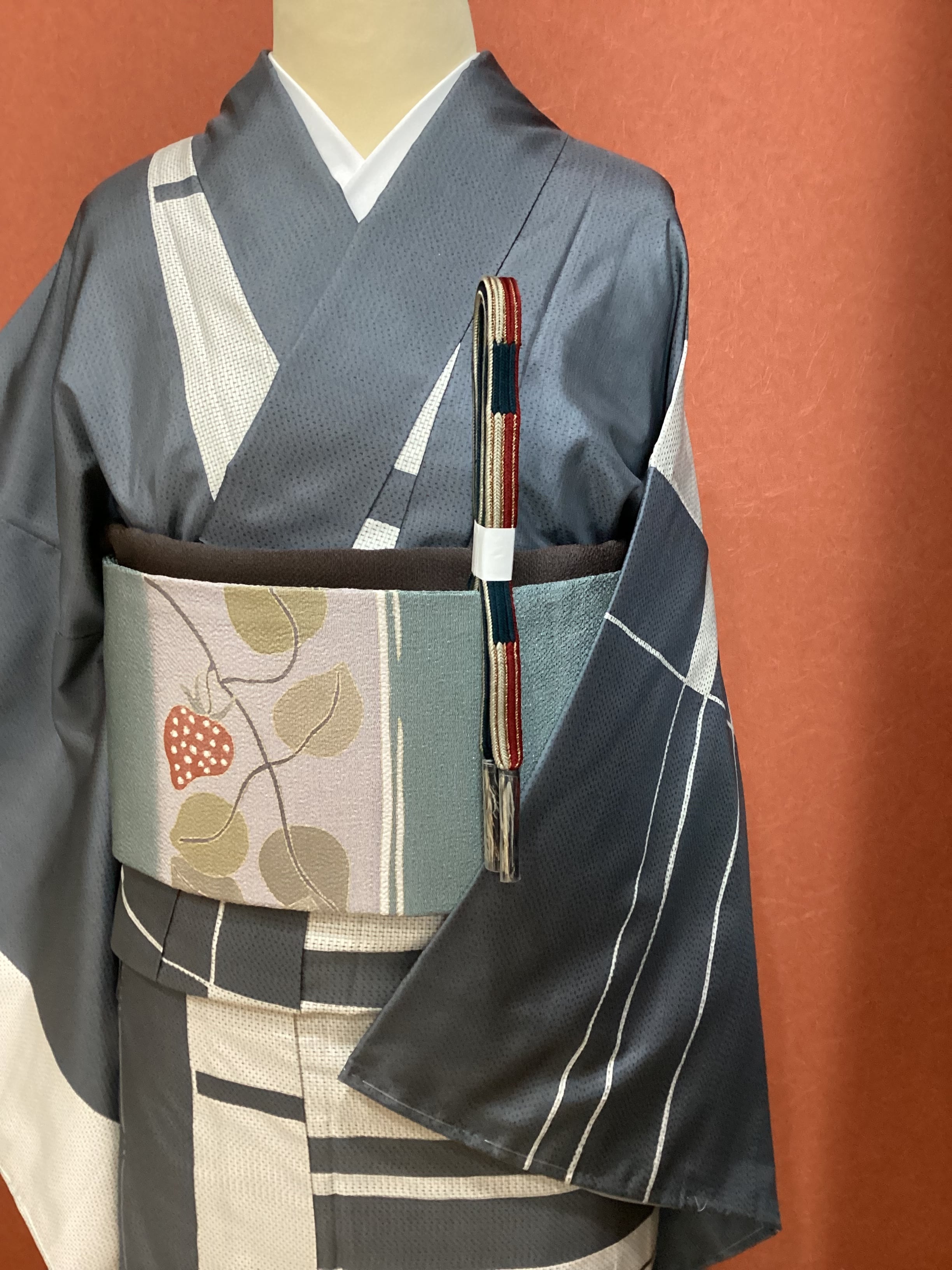 つるりとした肌触りで艶があり軽やかな紬きものです。白地に蚊絣文様に織られた紬地の上に、濃いグレーの染料で、ランダムで変化のある大格子文様が染めてあります。モノトーン調のベーシックなお色目と、変化のあるブロック文様がスッキリとした洒落味のあるお品です。